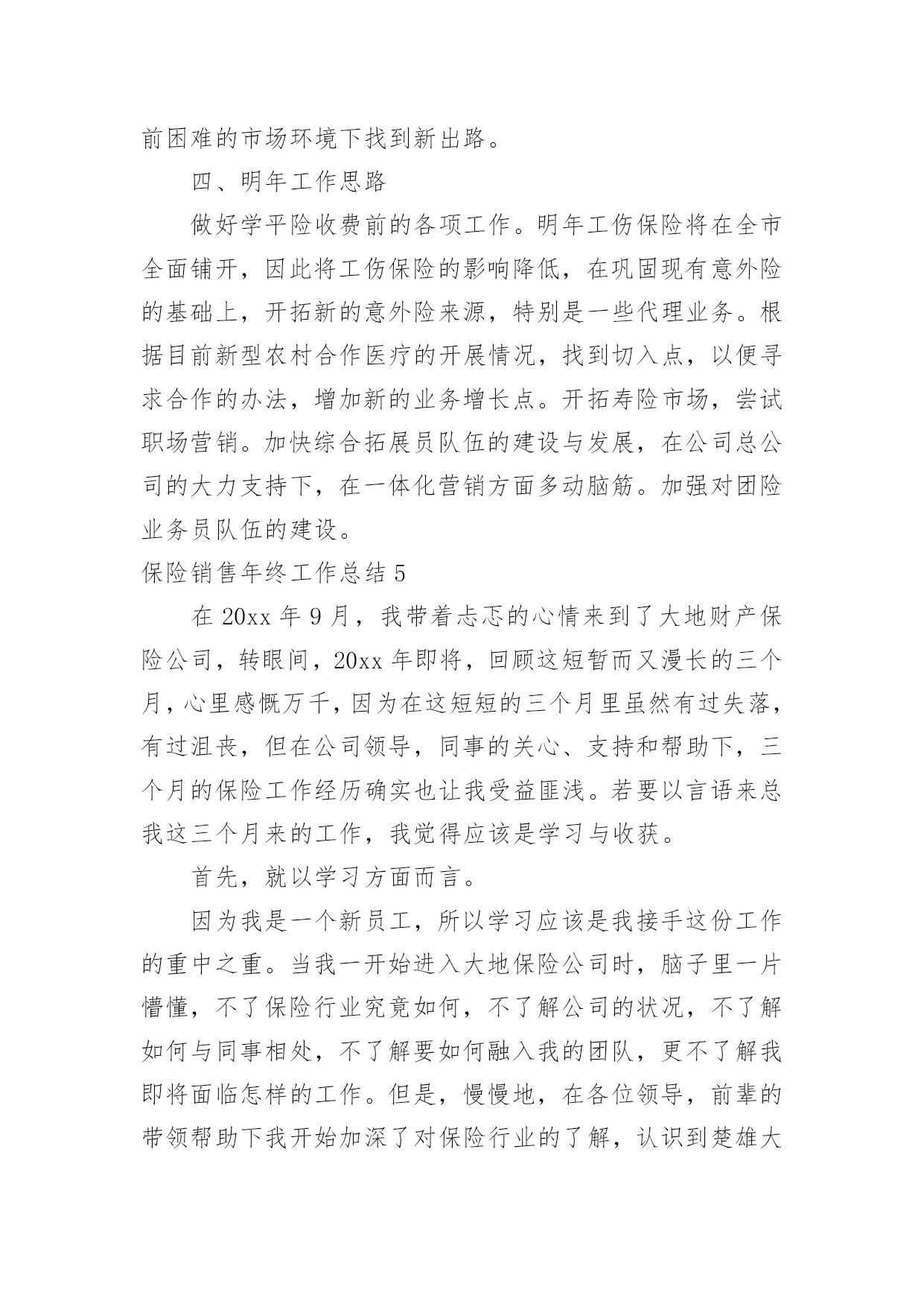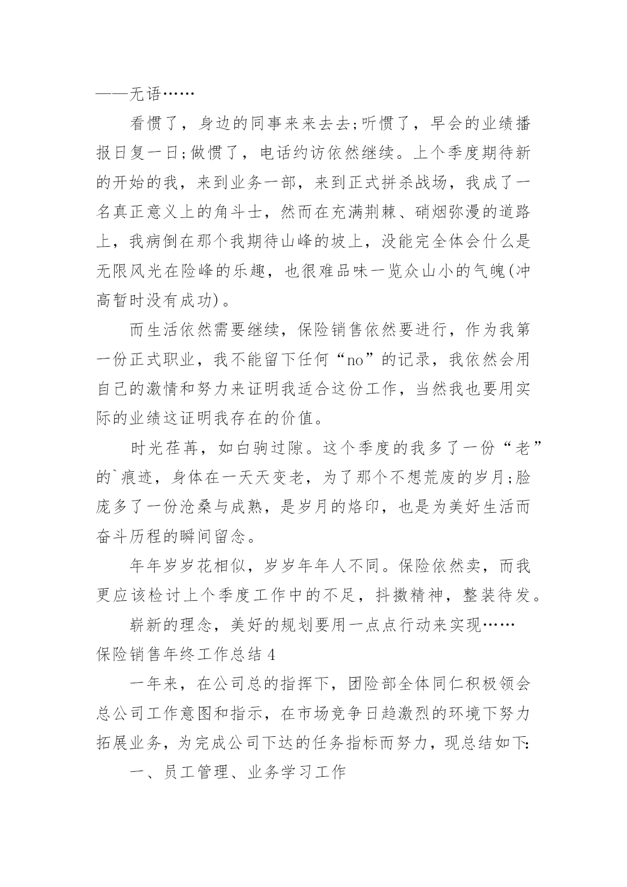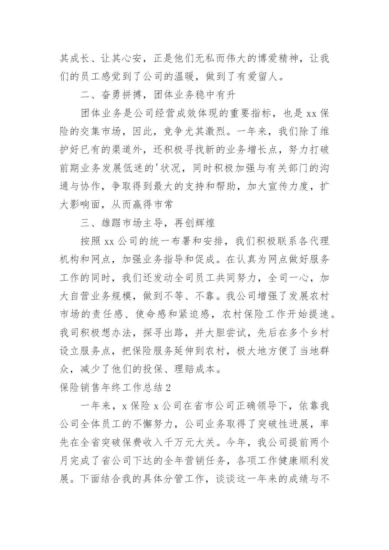 保险销售年终工作总结保险销售年终工作总结总结是事后对某一阶段的学习、工作或其完成情况加以回顾和分析的一种书面材料,通过它可以全面地、系统地了解以往的学习和工作情况,不妨坐下来好好写写总结吧。我们该怎么去写总结呢?下面是小编为大家整理的保险销售年终工作总结,仅供参考,欢迎大家阅读。保险销售年终工作总结1今年通过全体员工的奋力拼搏,开拓创新,勇于进取,公司业务取得了长足发展,业务规模创造了历史同期最高纪录。回顾一年的工作,既有成功的经验,也暴露了一些不足,为了总结经验,改进不足,现将全年工作总结如下。一、团结一心,个人业务取得突破性发展个人业务是我们的核心业务,是公司持续经营、稳健发展的基础。根据xx公司各个时期的企划方案,我公司还根据自身实际情况制订了相应的激励措施,利用多种销售模式,全体员工斗志昂扬、挥洒汗水,经过辛勤的耕耘,终于取得了丰硕的成果。公司一开始就加大了队伍建设力度,把展业和增员结合起来,通过增员来推动业务发展,通过业务发展带来的实惠来带动增员。我们各级主管也付出了大量辛勤的劳动,他们无时无刻不在关注着自己的属员,帮其解困、助其成长、让其心安,正是他们无私而伟大的博爱精神,让我们的员工感觉到了公司的温暖,做到了有爱留人。二、奋勇拼搏,团体业务稳中有升团体业务是公司经营成效体现的重要指标,也是xx保险的交集市场,因此,竞争尤其激烈。一年来,我们除了维护好已有的渠道外,还积极寻找新的业务增长点,努力打破前期业务发展低迷的'状况,同时积极加强与有关部门的沟通与协作,争取得到最大的支持和帮助,加大宣传力度,扩大影响面,从而赢得市常三、雄踞市场主导,再创辉煌按照xx公司的统一布署和安排,我们积极联系各代理机构和网点,加强业务指导和促成。在认真为网点做好服务工作的同时,我们还发动全司员工共同努力,全司一心,加大自营业务规模,做到不等、不靠。我公司增强了发展农村市场的责任感、使命感和紧迫感,农村保险工作开始提速。我司积极想办法,探寻出路,并大胆尝试,先后在多个乡村设立服务点,把保险服务延伸到农村,极大地方便了当地群众,减少了他们的投保、理赔成本。保险销售年终工作总结2一年来,x保险x公司在省市公司正确领导下,依靠我公司全体员工的不懈努力,公司业务取得了突破性进展,率先在全省突破保费收入千万元大关。今年,我公司提前两个月完成了省公司下达的全年营销任务,各项工作健康顺利发展。下面结合我的具体分管工作,谈谈这一年来的成绩与不足。一、工作思想积极贯彻省市公司关于公司发展的一系列重要指示,与时俱进,勤奋工作,务实求效,勇争一流,带领各部员工紧紧围绕“立足改革、加快发展、真诚服务、提高效益”这一中心,进一步转变观念、改革创新,面对竞争日趋激烈的临沂保险市场,强化核心竞争力,开展多元化经营,经过努力和拼搏,公司保持了较好的发展态势,为x保险公司的持续发展,做出了应有的贡献。全方面加强学习,努力提高自身业务素质水平和管理水平。作为一名领导干部,肩负着上级领导和全体员工赋予的重要职责与使命,公司的经营方针政策需要我去贯彻实施。因此,我十分注重保险理论的学习和管理能力的培养。注意用科学的方法指导自己的工作,规范自己的言行,树立强烈的责任感和事业心,不断提高自己的业务能力和管理能力。不断提高公司业务人员队伍的整体素质水平。一年来,我一直把培养展业人员的业务素质作为团队建设的一项重要内容来抓,并和经理室一起实施有针对性的培训计划,加强领导班子和员工队伍建设。二、业务管理“没有规矩不成方圆”。要想使一个公司稳步发展,必须制定规范加强管理。管理是一种投入,这种投入必定会产生效益。我分管的是业务工作,更需要向管理要效益。只有不断完善各种管理制度和方法,并真正贯彻到行动中去,才能出成绩、见效益。业务管理中我主要做了以下工作:1、根据市公司下达给我们的全年销售任务,制定各个部室的周、月、季度、年销售计划。制定计划时本着实事求是、根据各个险种特点、客户特点,部室情况确定每个部室合理的、可实现的目标。在目标确定之后,我本着“事事落实,事事督导”的方针,通过加强过程的管理和监控,来确保各部室目标计划的顺利完成。2、作为分管业务的经理我十分注重各个展业部室的团队建设。一直注重部室经理和部室成员的思想和业务素质教育。一年来,我多次组织形势动员会、业务研讨会,开展业务培训活动,组织大家学知识、找经验,提高职工全面素质。培训重点放在学习保险理论、展业技巧的知识上,并且强调对团队精神的培育。学习促进了各个团队自身素质的不断提高,为公司的持续、稳定发展打下扎实的基础3、帮助经理室全面推进薪酬制度创新,不断夯实公司基础管理工作。建立与岗位和绩效挂钩的薪酬制度改革。今年,我紧紧围绕职位明确化、薪酬社会化、奖金绩效化和福利多样化“四化”目标,全面推进企业薪酬体制改革。初步建立了一个