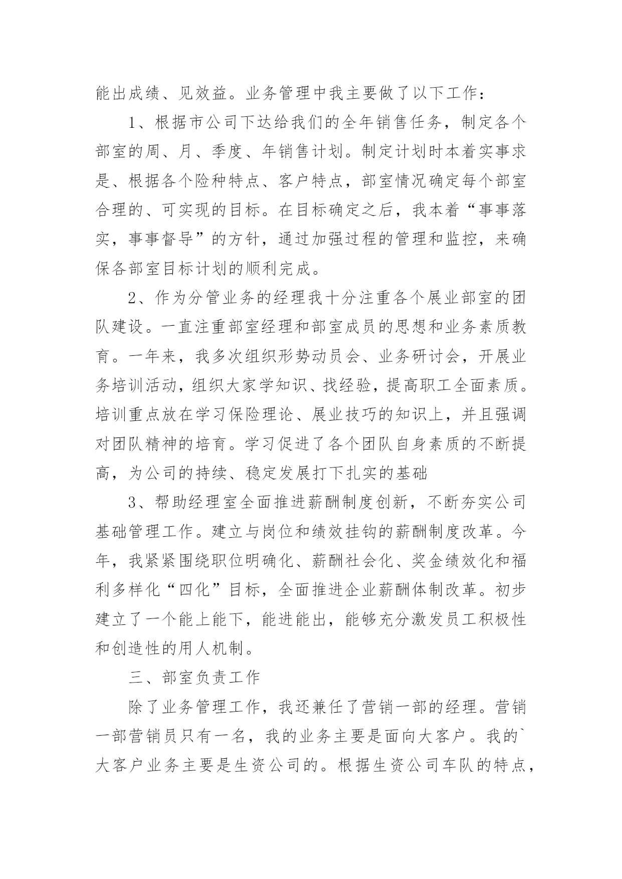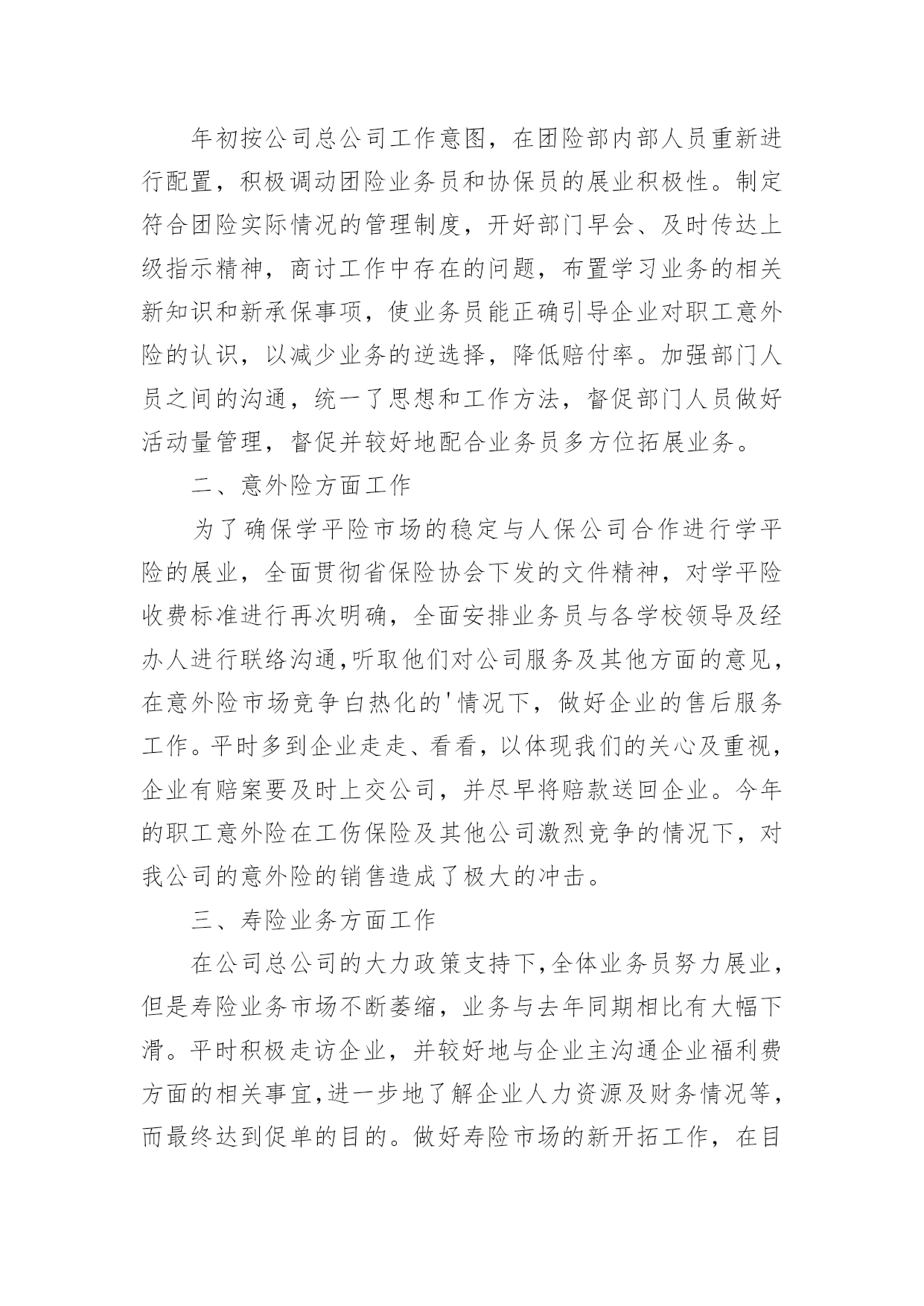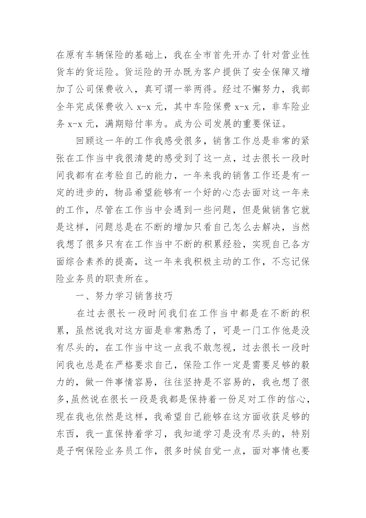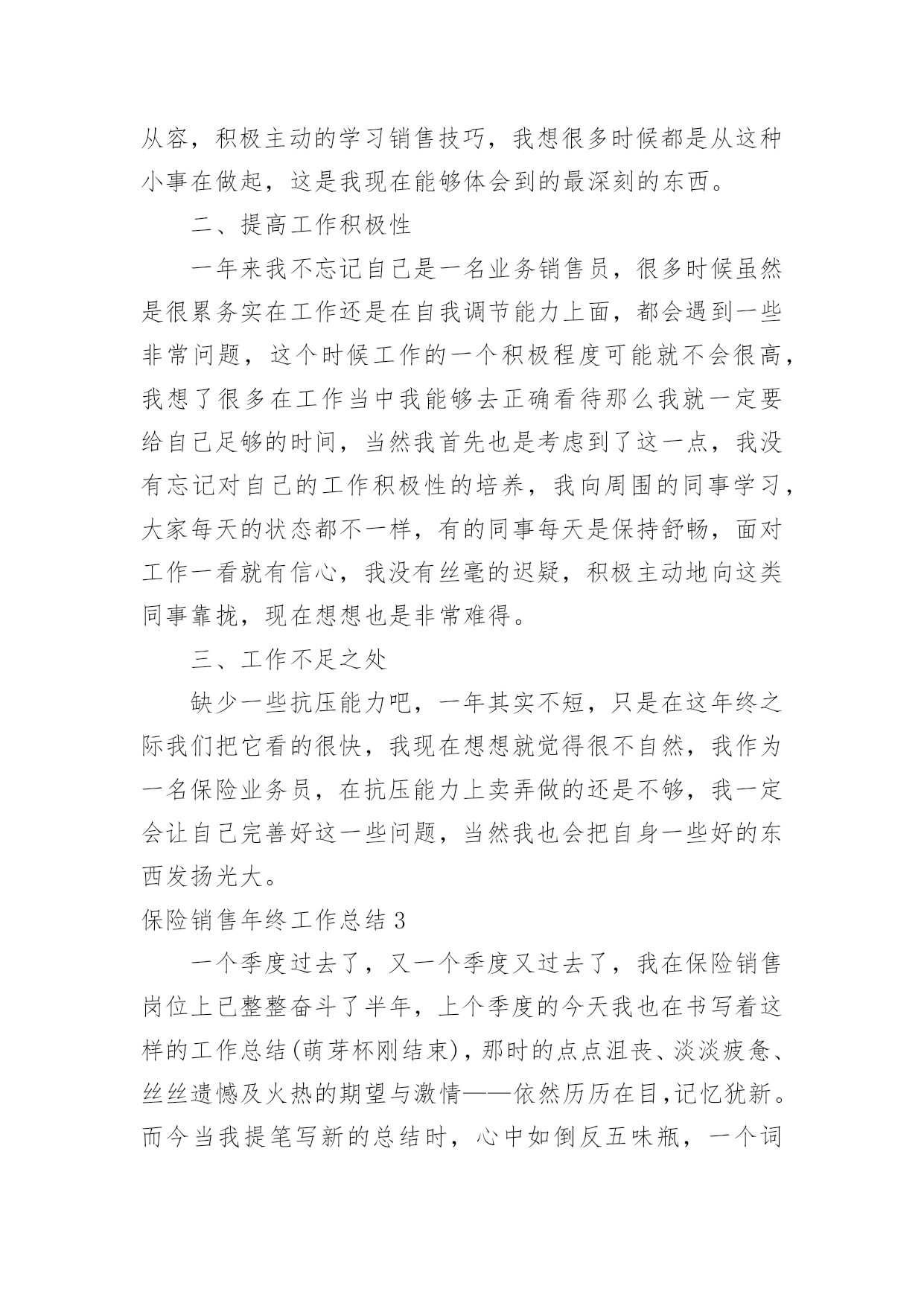 保险销售年终工作总结保险销售年终工作总结总结是事后对某一阶段的学习、工作或其完成情况加以回顾和分析的一种书面材料,通过它可以全面地、系统地了解以往的学习和工作情况,不妨坐下来好好写写总结吧。我们该怎么去写总结呢?下面是小编为大家整理的保险销售年终工作总结,仅供参考,欢迎大家阅读。保险销售年终工作总结1今年通过全体员工的奋力拼搏,开拓创新,勇于进取,公司业务取得了长足发展,业务规模创造了历史同期最高纪录。回顾一年的工作,既有成功的经验,也暴露了一些不足,为了总结经验,改进不足,现将全年工作总结如下。一、团结一心,个人业务取得突破性发展个人业务是我们的核心业务,是公司持续经营、稳健发展的基础。根据xx公司各个时期的企划方案,我公司还根据自身实际情况制订了相应的激励措施,利用多种销售模式,全体员工斗志昂扬、挥洒汗水,经过辛勤的耕耘,终于取得了丰硕的成果。公司一开始就加大了队伍建设力度,把展业和增员结合起来,通过增员来推动业务发展,通过业务发展带来的实惠来带动增员。我们各级主管也付出了大量辛勤的劳动,他们无时无刻不在关注着自己的属员,帮其解困、助其成长、让其心安,正是他们无私而伟大的博爱精神,让我们的员工感觉到了公司的温暖,做到了有爱留人。二、奋勇拼搏,团体业务稳中有升团体业务是公司经营成效体现的重要指标,也是xx保险的交集市场,因此,竞争尤其激烈。一年来,我们除了维护好已有的渠道外,还积极寻找新的业务增长点,努力打破前期业务发展低迷的'状况,同时积极加强与有关部门的沟通与协作,争取得到最大的支持和帮助,加大宣传力度,扩大影响面,从而赢得市常三、雄踞市场主导,再创辉煌按照xx公司的统一布署和安排,我们积极联系各代理机构和网点,加强业务指导和促成。在认真为网点做好服务工作的同时,我们还发动全司员工共同努力,全司一心,加大自营业务规模,做到不等、不靠。我公司增强了发展农村市场的责任感、使命感和紧迫感,农村保险工作开始提速。我司积极想办法,探寻出路,并大胆尝试,先后在多个乡村设立服务点,把保险服务延伸到农村,极大地方便了当地群众,减少了他们的投保、理赔成本。保险销售年终工作总结2一年来,x保险x公司在省市公司正确领导下,依靠我公司全体员工的不懈努力,公司业务取得了突破性进展,率先在全省突破保费收入千万元大关。今年,我公司提前两个月完成了省公司下达的全年营销任务,各项工作健康顺利发展。下面结合我的具体分管工作,谈谈这一年来的成绩与不足。一、工作思想积极贯彻省市公司关于公司发展的一系列重要指示,与时俱进,勤奋工作,务实求效,勇争一流,带领各部员工紧紧围绕“立足改革、加快发展、真诚服务、提高效益”这一中心,进一步转变观念、改革创新,面对竞争日趋激烈的临沂保险市场,强化核心竞争力,开展多元化经营,经过努力和拼搏,公司保持了较好的发展态势,为x保险公司的持续发展,做出了应有的贡献。全方面加强学习,努力提高自身业务素质水平和管理水平。作为一名领导干部,肩负着上级领导和全体员工赋予的重要职责与使命,公司的经营方针政策需要我去贯彻实施。因此,我十分注重保险理论的学习和管理能力的培养。注意用科学的方法指导自己的工作,规范自己的言行,树立强烈的责任感和事业心,不断提高自己的业务能力和管理能力。不断提高公司业务人员队伍的整体素质水平。一年来,我一直把培养展业人员的业务素质作为团队建设的一项重要内容来抓,并和经理室一起实施有针对性的培训计划,加强领导班子和员工队伍建设。二、业务管理“没有规矩不成方圆”。要想使一个公司稳步发展,必须制定规范加强管理。管理是一种投入,这种投入必定会产生效益。我分管的是业务工作,更需要向管理要效益。只有不断完善各种管理制度和方法,并真正贯彻到行动中去,才能出成绩、见效益。业务管理中我主要做了以下工作:1、根据市公司下达给我们的全年销售任务,制定各个部室的周、月、季度、年销售计划。制定计划时本着实事求是、根据各个险种特点、客户特点,部室情况确定每个部室合理的、可实现的目标。在目标确定之后,我本着“事事落实,事事督导”的方针,通过加强过程的管理和监控,来确保各部室目标计划的顺利完成。2、作为分管业务的经理我十分注重各个展业部室的团队建设。一直注重部室经理和部室成员的思想和业务素质教育。一年来,我多次组织形势动员会、业务研讨会,开展业务培训活动,组织大家学知识、找经验,提高职工全面素质。培训重点放在学习保险理论、展业技巧的知识上,并且强调对团队精神的培育。学习促进了各个团队自身素质的不断提高,为公司的持续、稳定发展打下扎实的基础3、帮助经理室全面推进薪酬制度创新,不断夯实公司基础管理工作。建立与岗位和绩效挂钩的薪酬制度改革。今年,我紧紧围绕职位明确化、薪酬社会化、奖金绩效化和福利多样化“四化”目标,全面推进企业薪酬体制改革。初步建立了一个