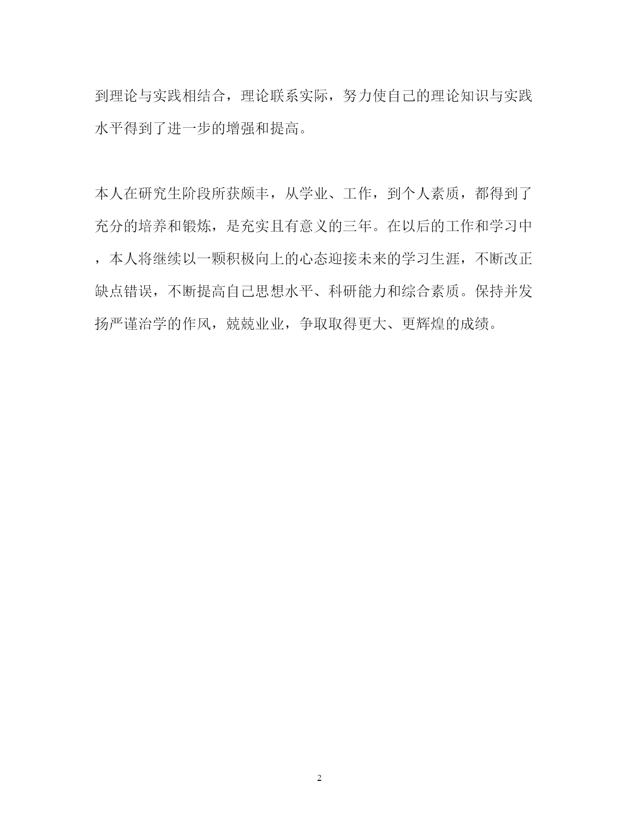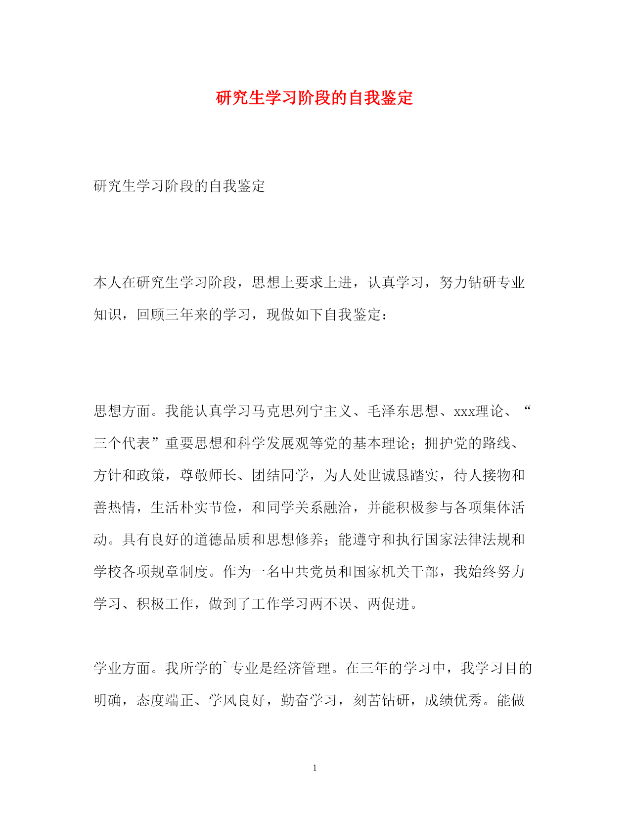 此资料由网络收集而来,如有侵权请告知上传者立即删除。资料共分享,我们负责传递知识。PAGEPAGE2研究生学习阶段的自我鉴定研究生学习阶段的自我鉴定本人在研究生学习阶段,思想上要求上进,认真学习,努力钻研专业知识,回顾三年来的学习,现做如下自我鉴定:思想方面。我能认真学习马克思列宁主义、毛泽东思想、xxx理论、“三个代表”重要思想和科学发展观等党的基本理论;拥护党的路线、方针和政策,尊敬师长、团结同学,为人处世诚恳踏实,待人接物和善热情,生活朴实节俭,和同学关系融洽,并能积极参与各项集体活动。具有良好的道德品质和思想修养;能遵守和执行国家法律法规和学校各项规章制度。作为一名中共党员和国家机关干部,我始终努力学习、积极工作,做到了工作学习两不误、两促进。学业方面。我所学的`专业是经济管理。在三年的学习中,我学习目的明确,态度端正、学风良好,勤奋学习,刻苦钻研,成绩优秀。能做到理论与实践相结合,理论联系实际,努力使自己的理论知识与实践水平得到了进一步的增强和提高。本人在研究生阶段所获颇丰,从学业、工作,到个人素质,都得到了充分的培养和锻炼,是充实且有意义的三年。在以后的工作和学习中,本人将继续以一颗积极向上的心态迎接未来的学习生涯,不断改正缺点错误,不断提高自己思想水平、科研能力和综合素质。保持并发扬严谨治学的作风,兢兢业业,争取取得更大、更辉煌的成绩。