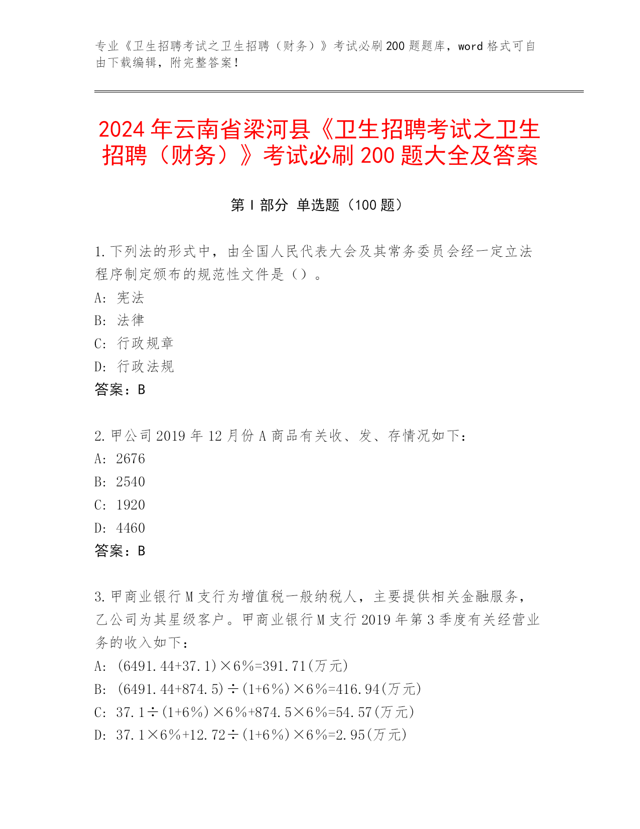 2024年云南省梁河县《卫生招聘考试之卫生招聘(财务)》考试必刷200题大全及答案