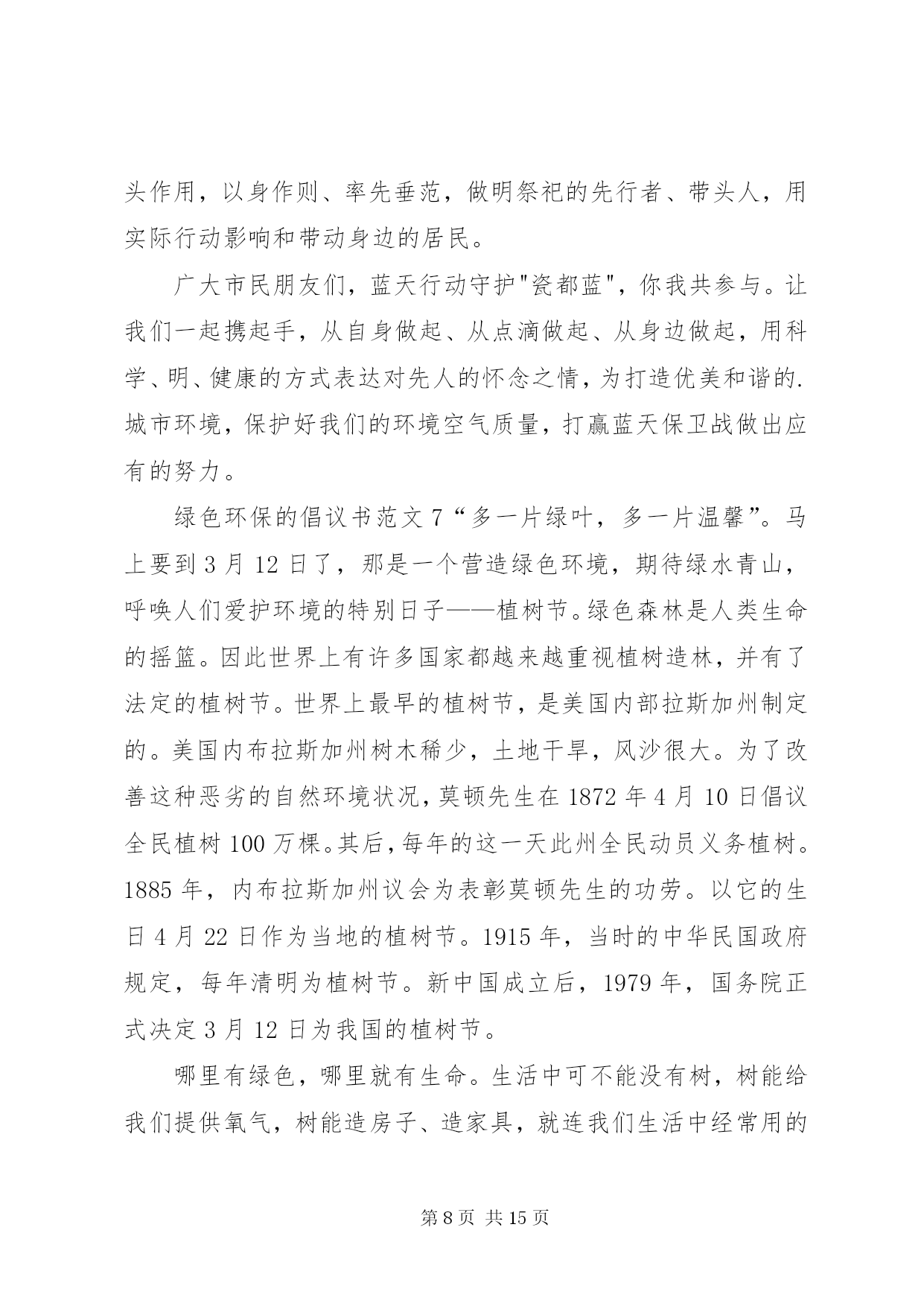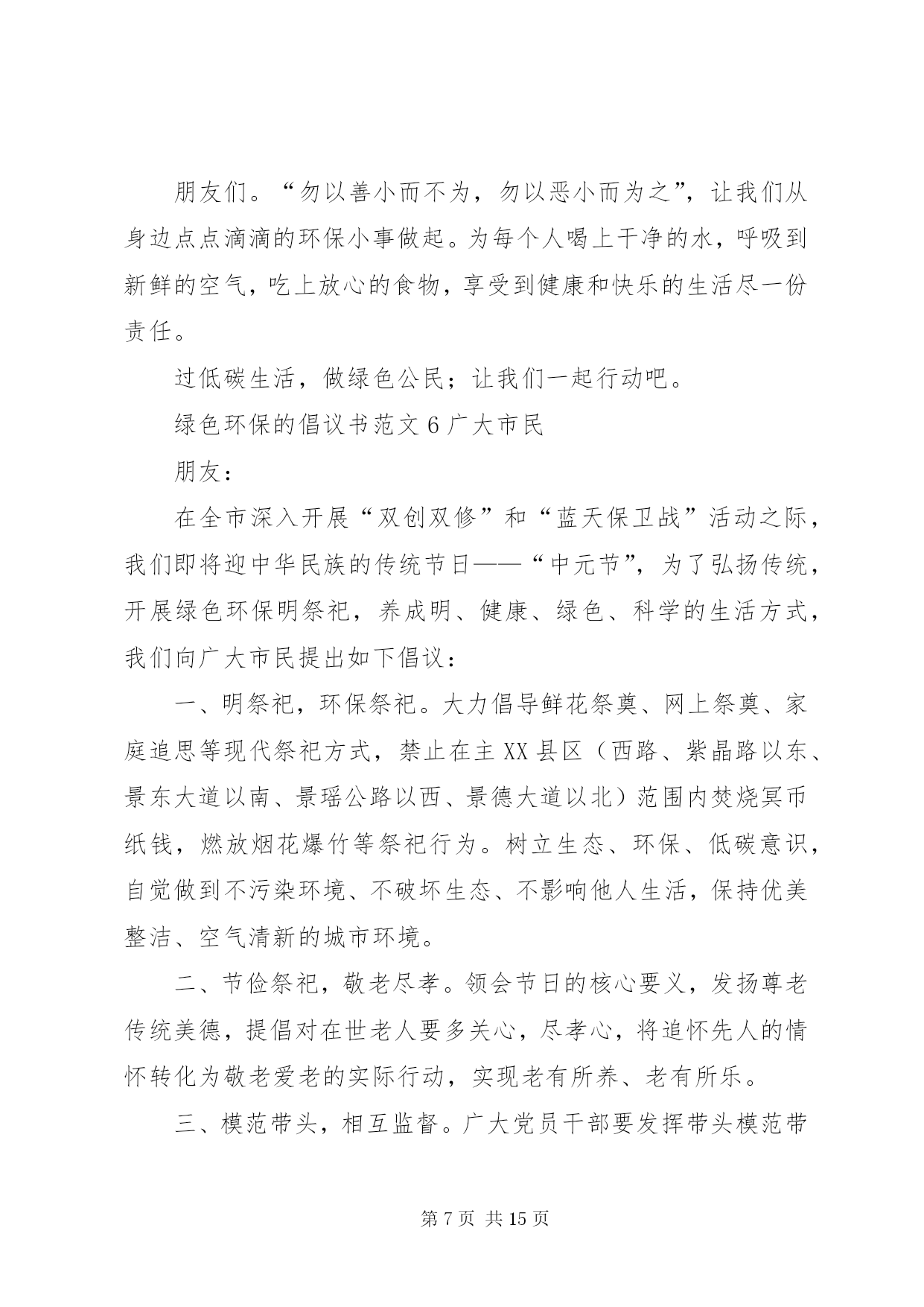 第PAGE\*Arabic\*MERGEFORMAT15页共NUMPAGES\*MERGEFORMAT15页绿色环保的倡议书绿色环保的倡议书范文1需要清醒的人类:地球只有一个,如果地球毁灭人类就别无去处。所以我们应该珍惜地球上的各种资源。比如矿产资源。矿产资源不你是上帝的恩赐,而是经过几百万年、甚至几亿万年的地质变化才形成的。如果不加节制地开采,必将加速地球上的矿产资源的枯竭,所以我们应该合理开采矿产资源。还有水资源,虽然我们农村看不出会缺乏水资源。但是全球有好多人连水都喝不上,因为气候干旱。有的人说:“就几个人浪费水不算什么的。”如果是全世界的人都怎么说,不就浪费了几亿滴水了吗。如果地球上没有了水,那人类就和一切生物都将灭亡。所以我们要珍惜水资源我们可以把淘米和洗菜的水用来浇花或者浇树,还可以洗衣服的水拖地。我们也非常缺乏森林资源。现在我们周围还有许多乱砍伐树木的行为破坏环境的人也很多。虽然上山砍柴没有错但是我们可以捡一些枯萎的树枝、树干回家生火。砍一棵树只需要几分钟,但是长成一棵大树需要几十年甚至几百年的时间当我们把树砍完了可以在种一棵小树苗下去,以保证森林资源的可持续性。我们生活中还有许许多多的资源都需要节约,并不是说只有几种资源才需要节约,其他的也需要节约。比如说电、粮食等等。人类朋友们。地球只有一个,请珍惜、爱护我们这个可爱、伟大而容易破碎地球吧。相信我们这个地球将会变得越来越美好。绿色环保的倡议书范文2居委会的叔叔阿姨们:您们好。您们都知道,我们的社区中现在几乎见不到一点绿色,全是灰色的。原来的一片有花有草有树有虫的五颜六色的草地,也彻底成为了枯黄的黄土地。社区中的绿色在一天天的减少。社区中的绿色减少是因为最近小区中在修天然气管道,把整个小区的地面全翻了个底朝天,那些本来就不多的绿色就在这一翻中被埋藏了。我的倡议是:1、为了美化小区,应该在小区中栽培些花,这些花既可以美化小区又可以净化空气。2、小区中每天车来车往,空气中弥漫着尾气和各种不好的气体,噪音也很到,这需要的就是植物来吸收不好的气体,为了减少噪音,让居民远离喧嚣,也要植树。3、希望您们带领居民一起为小区创造绿色,让我们也来帮忙。绿色环保的倡议书范文3亲爱的同学们:优美和谐的自然环境,必然为我们带来身心的愉悦和无限的乐趣。明月松间照,清泉石上流,让我们感受清幽;大漠孤烟直,长河落日圆,让我们触摸壮丽;流连戏蝶时时舞,自在娇莺恰恰啼,让我们聆听喧闹;春水碧如天,画船听雨眠,让我们亲近悠闲;碧海蓝天,看海鸥飞翔;冰封雪飘,听松涛轰鸣;莺飞草长,闻鸟语、嗅花香。世界文学大师雨果说:大自然既是善良的慈母,同时也是冷酷的屠夫。近年来,由于人类滥伐林木,滥建厂房,各种环境问题接踵而至:森林退化,沙尘暴扬,水土流失,洪水肆虐,火灾频发,噪音刺耳,臭气熏天,酸雨赤潮,臭氧空洞……空中烟囱林立,浓烟滚滚,河中死鱼漂荡,污水滔滔;地上垃圾遍布,废渣成堆……人为地破坏环境,无异于自掘坟墓,早在1996年联合国环境署就曾发出警告:南极臭氧空洞正逐步增大,地面紫外线辐射增强,皮肤癌发病率上升;1.2亿人口生活在混浊的空气里;12亿人口生活缺水;12%的哺乳动物和11%的鸟类濒临灭绝;每年地表土壤流失200亿吨;森林以每年450万公顷的速度消失。惊人的数字,令人毛骨悚然,这其实已向我们发出了严正的警告:如果只顾盲目地吮吸自然的乳汁,而不立即行动起来,投入保护环境、拯救家园的战斗,最终毁灭的将是我们人类。敬爱的老师,亲爱的同学们,环境保护是一项长期而又艰巨的任务,让我们共同努力保护好我们的环境家园吧。让我们生命的每一天都是环境日。绿色环保的倡议书范文4各位老师,各位学生:你们好。地球,这位人类的母亲,这个生命的摇篮,是那样的美丽壮观,和蔼可亲。但是,由于我们的滥砍滥伐,由于我们随意毁坏自然环境——地球那头美丽的秀发变的稀稀疏疏;地球那饱满的身躯变的骨瘦如柴;地球那容光焕发的面孔变的皱皱巴巴。一条条“皱纹”刻在了“母亲”的脸上。为了让地球母亲展开那久违的笑容,我们应该注意我们身边的一些小毛病,一些大问题。一些工厂为了自身的利益,大量的毁坏自然资源,并把污水,脏水顺着管道一齐流向了那清澈见底的小溪,碧波荡漾的河水,它们一下子变的混浊不堪,一条条小溪变成了一条条臭水沟。不知大家是否观察过马路上的那些川流不息的汽车尾部,那尾部喷出的一团团黑色烟雾,好似一条条张牙舞爪的黑龙,毁坏着人们的身心,城市的环境。对此,我还想向大家发出忠告,希望大家一起来保护地球:1、不要浪费纸张,因为纸张来之不意。2、不要乱丢乱扔,影响市容市貌。3、出门时不要忘记关灯,以免浪费一度电。4、洗完手请立即关水龙头,以免浪费一滴水。5、不要在公共场所吸烟,既对自身不好,还污染空气。6、养宠物的市民请不