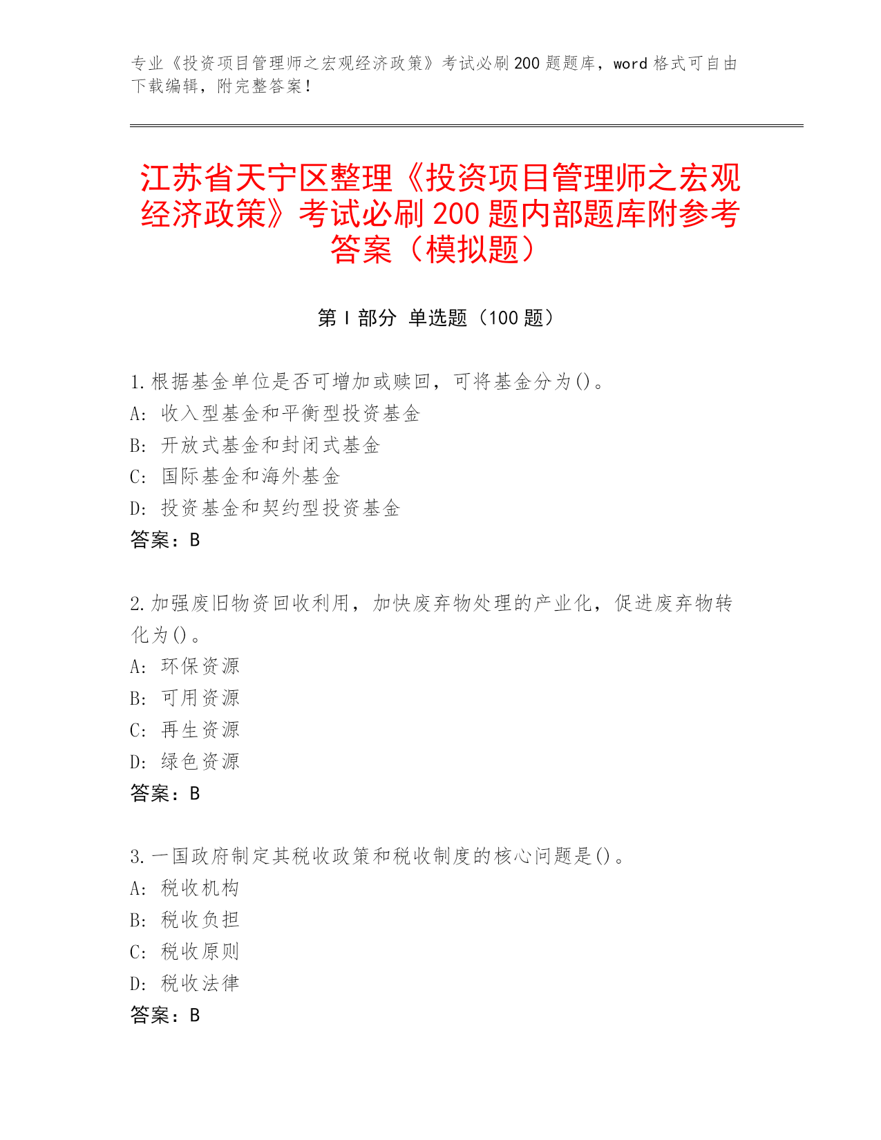 江苏省天宁区整理《投资项目管理师之宏观经济政策》考试必刷200题内部题库附参考答案(模拟题)