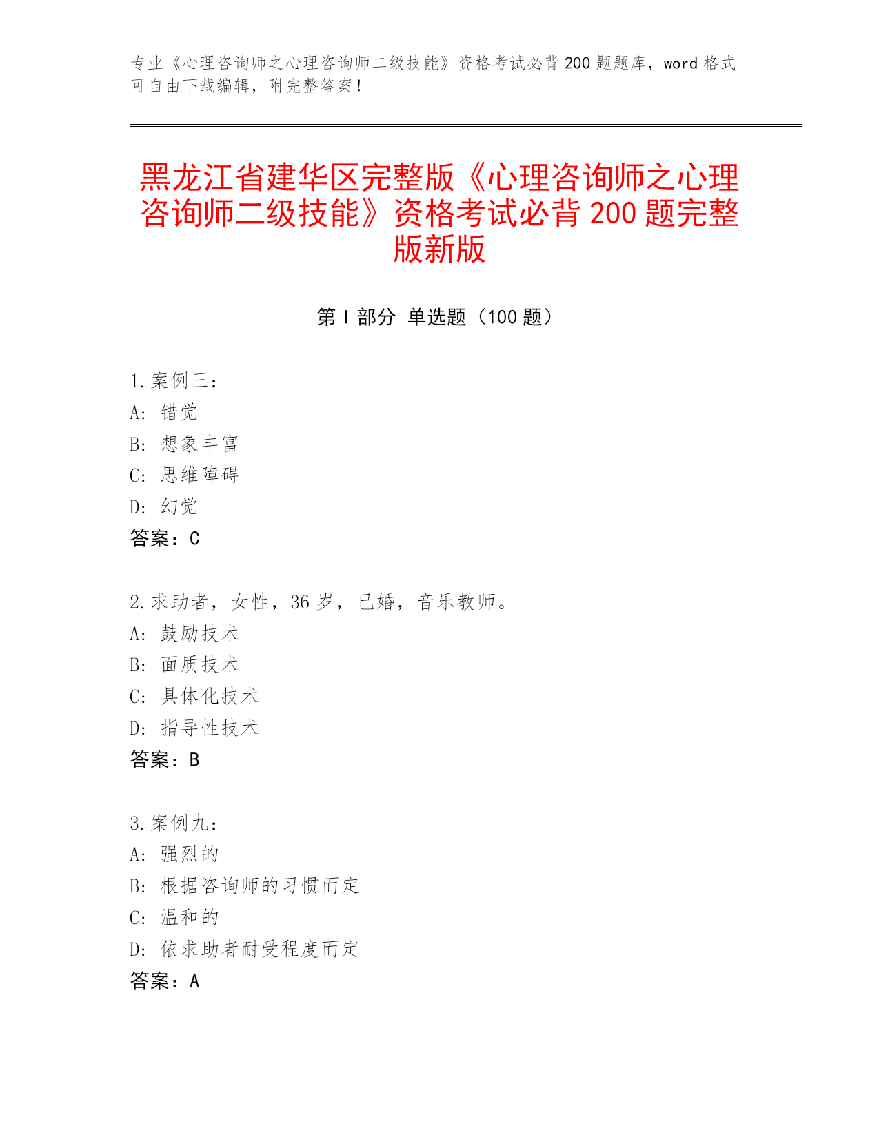完整版黑龙江省建华区《心理咨询师之心理咨询师二级技能》资格考试必刷200题大全及答案(必刷)