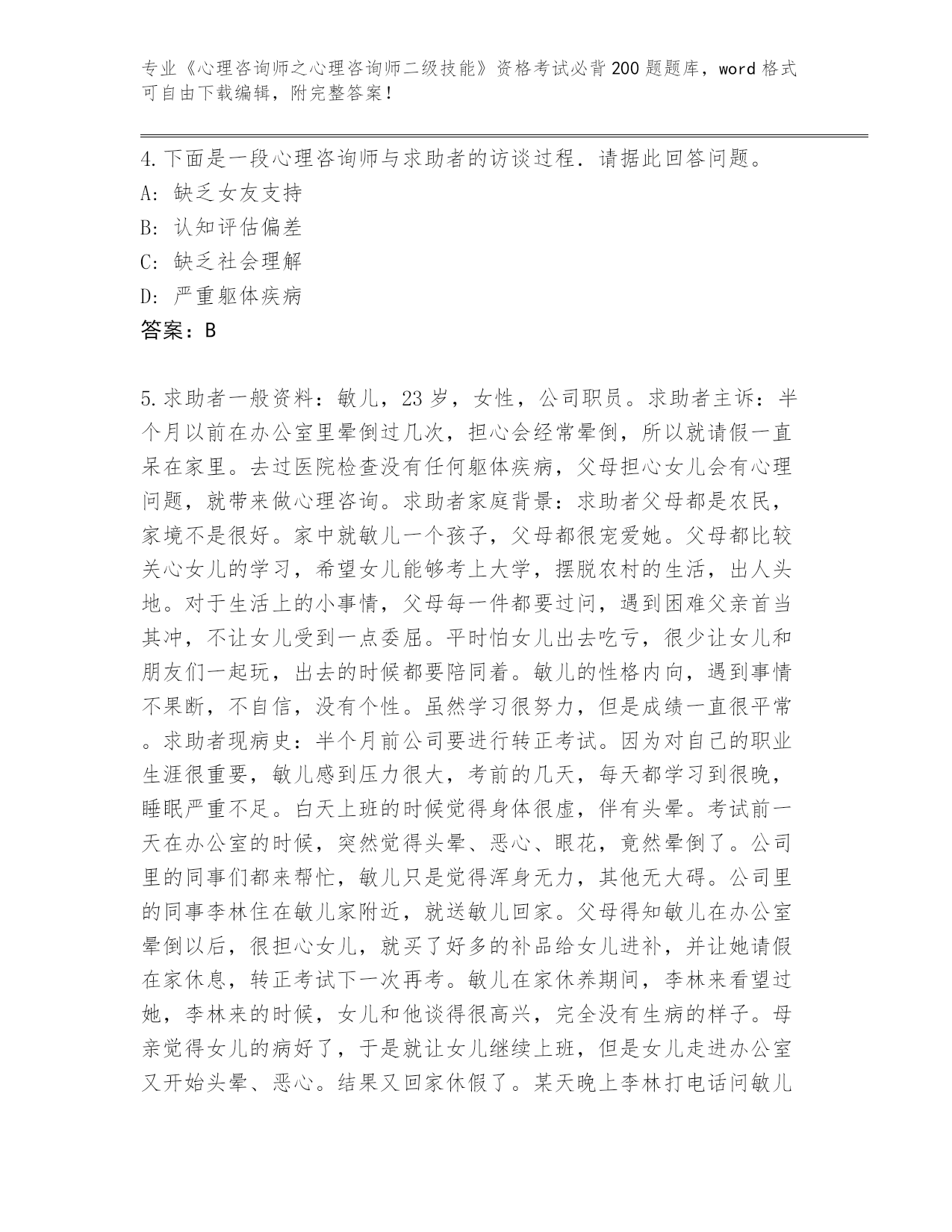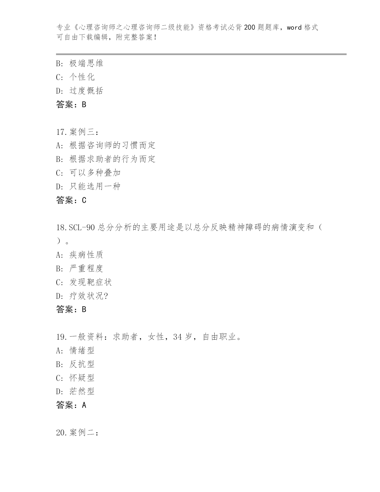 黑龙江省建华区完整版《心理咨询师之心理咨询师二级技能》资格考试必背200题完整版新版