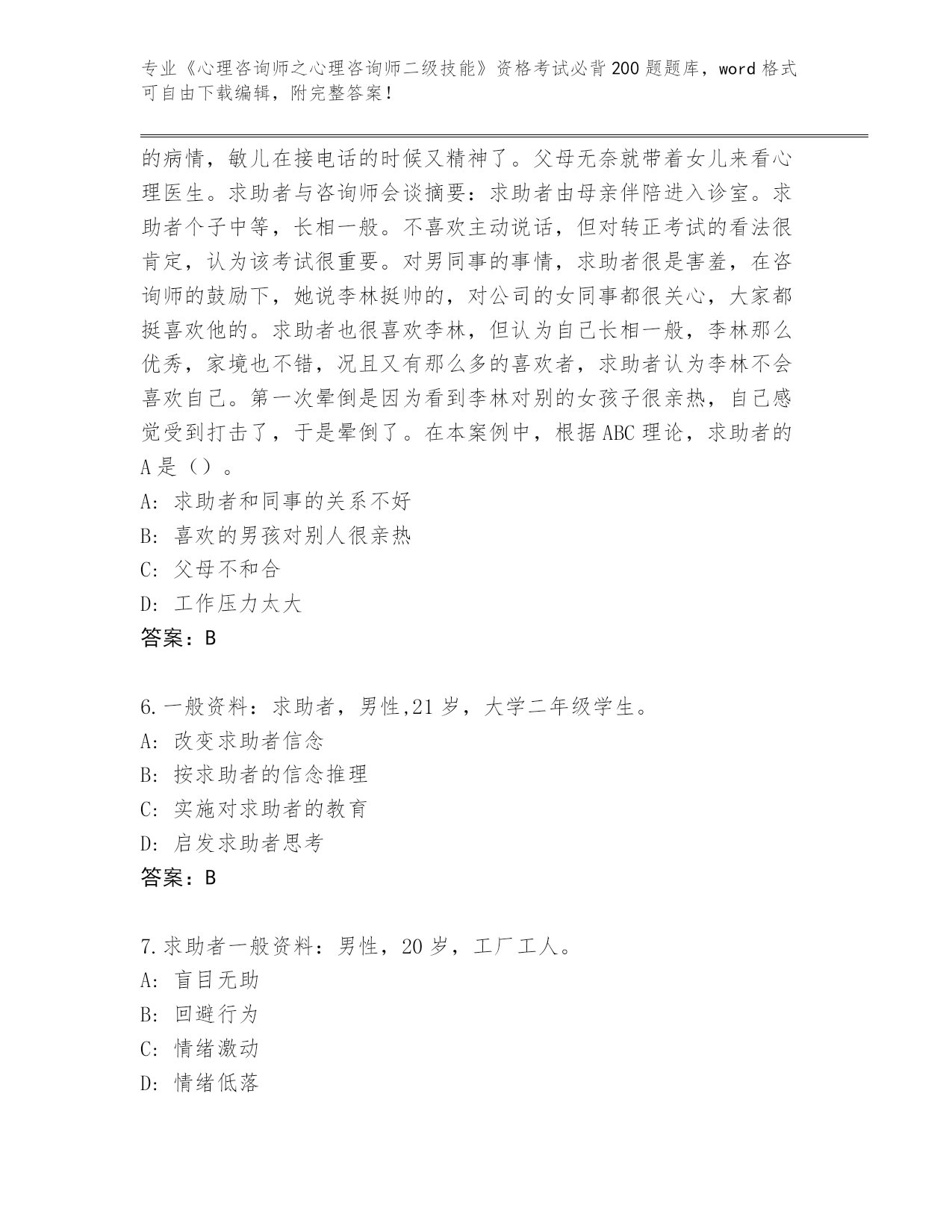 完整版江西省青云谱区《心理咨询师之心理咨询师二级技能》资格考试必背200题新版