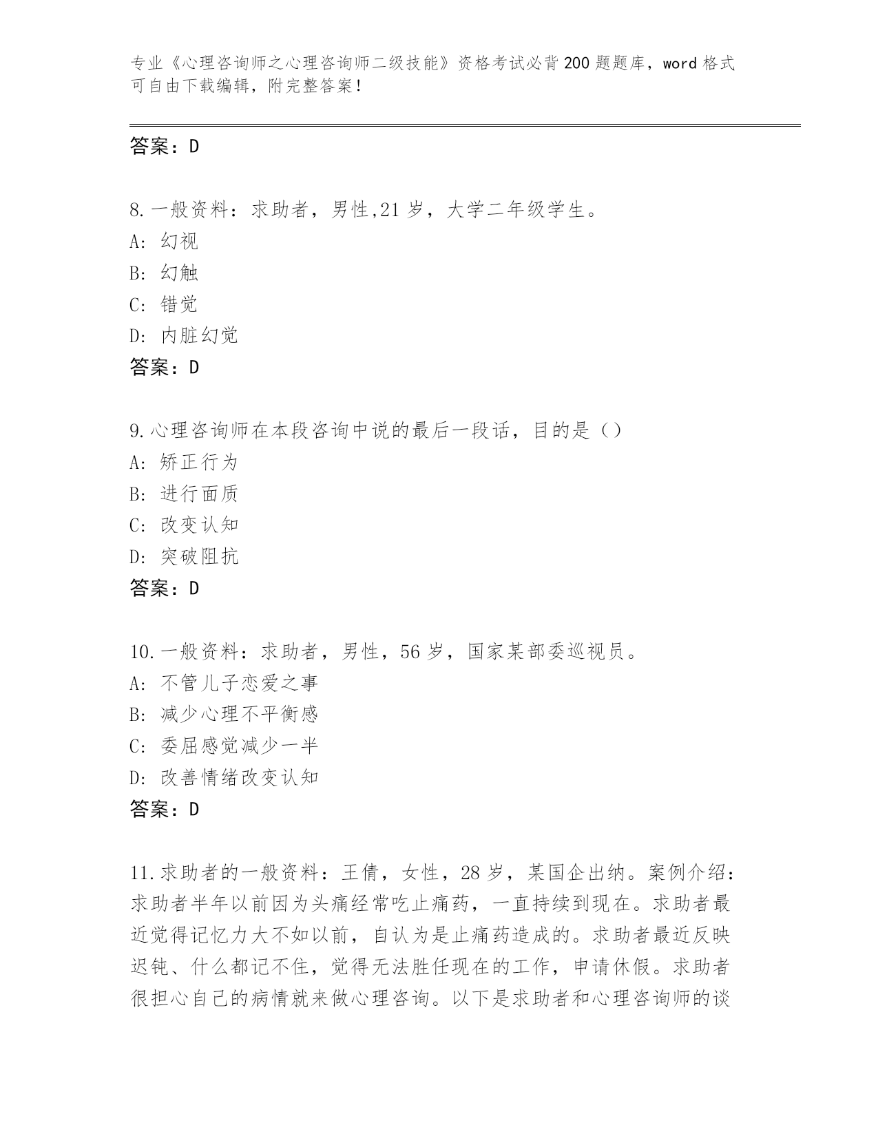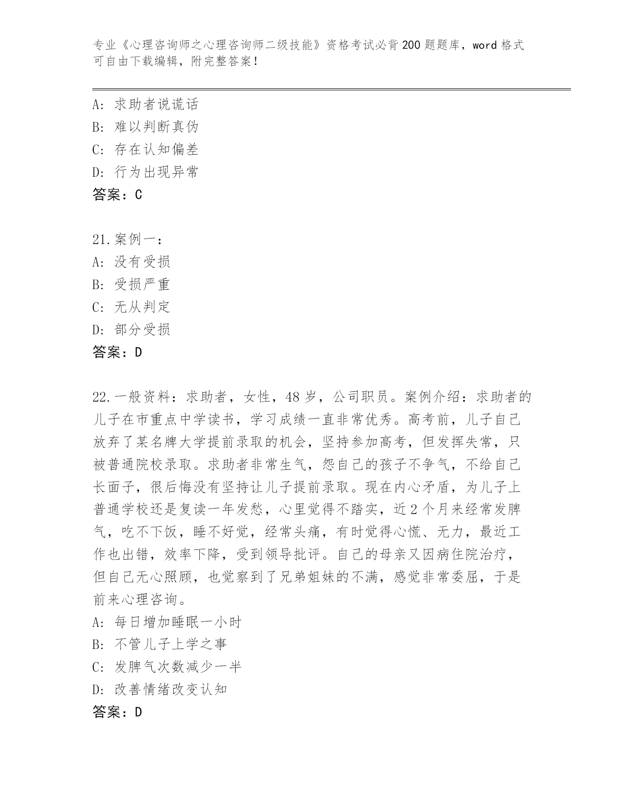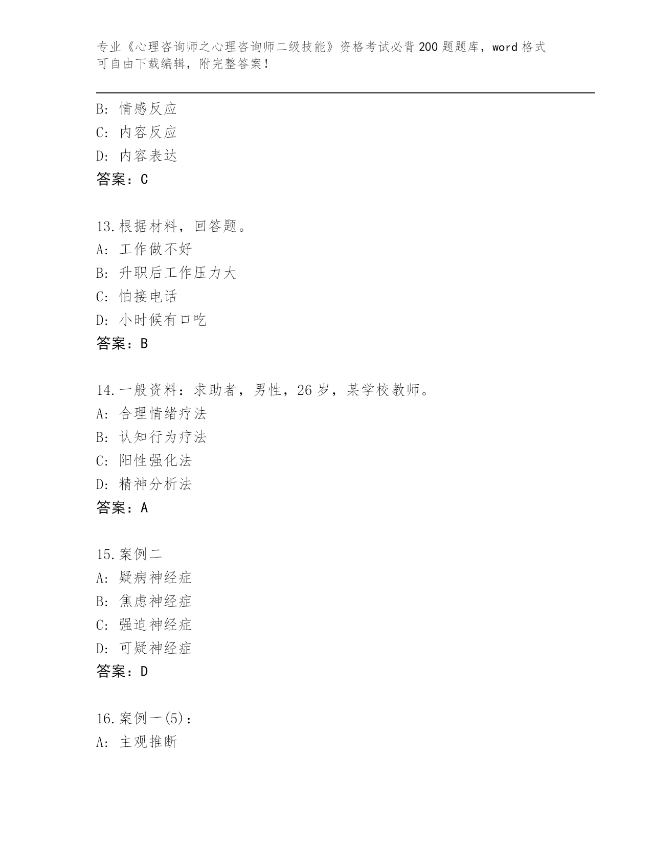 历年湖北省崇阳县《心理咨询师之心理咨询师二级技能》资格考试必背200题完整版新版