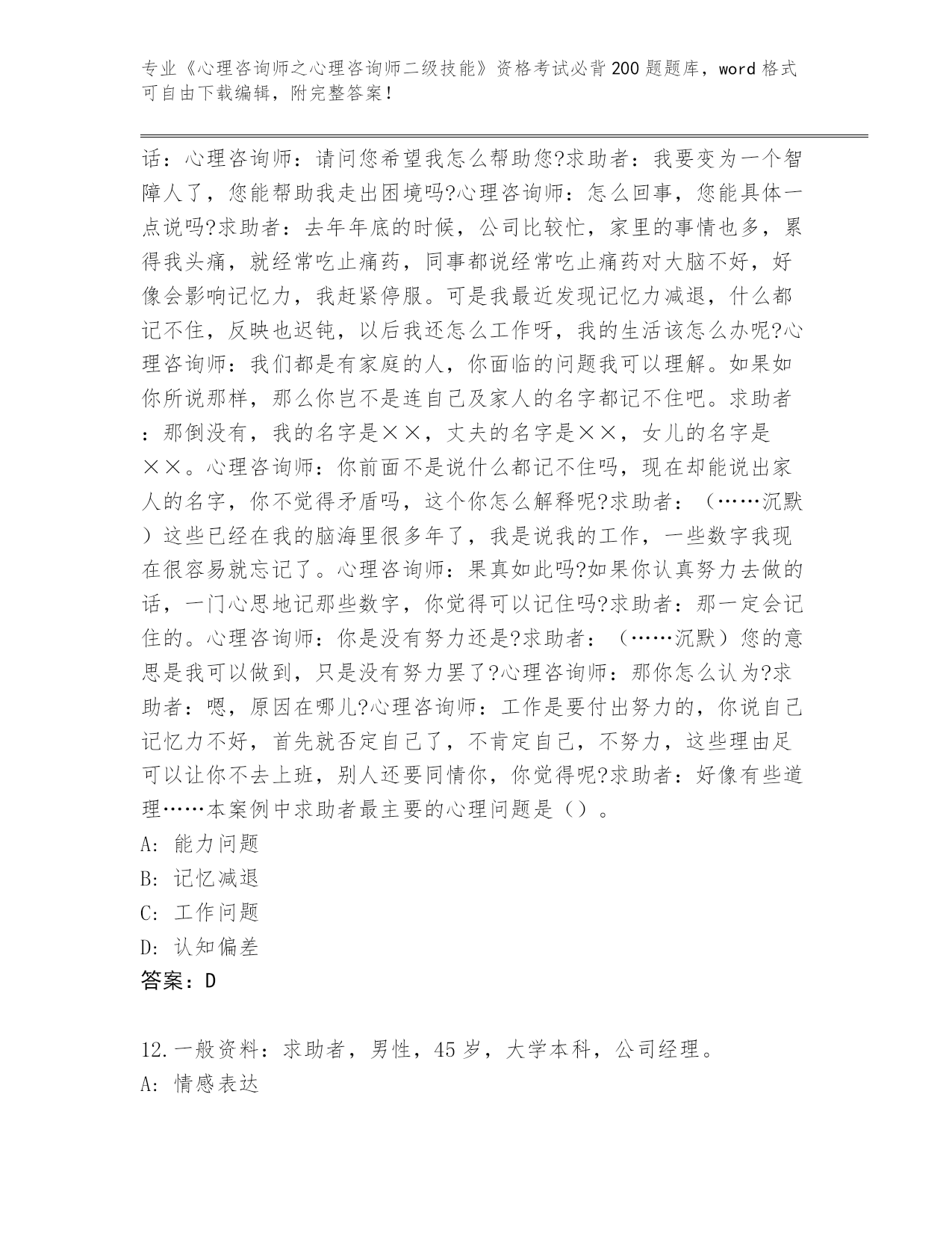 2024年山西省永和县《心理咨询师之心理咨询师二级技能》资格考试必背200题完整版新版