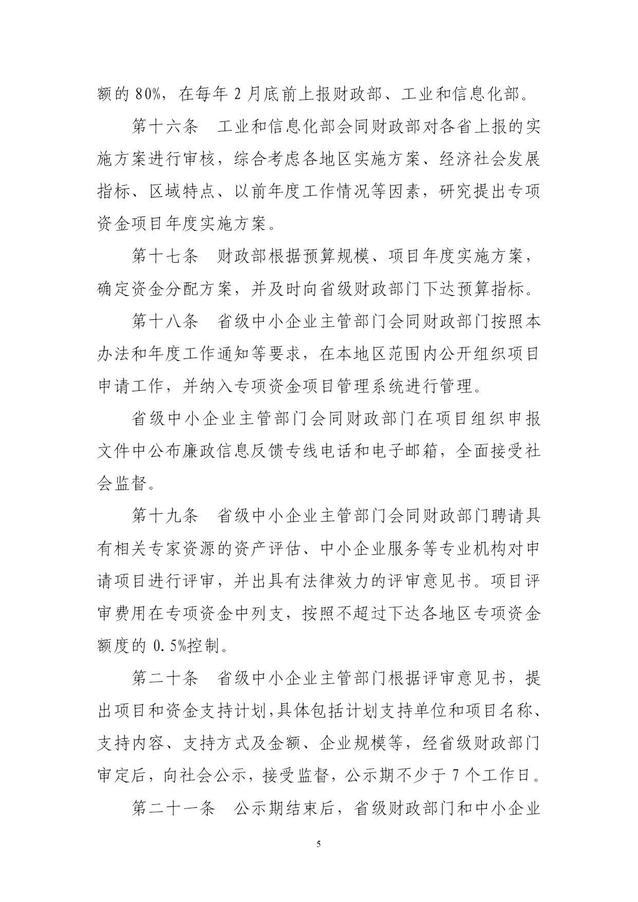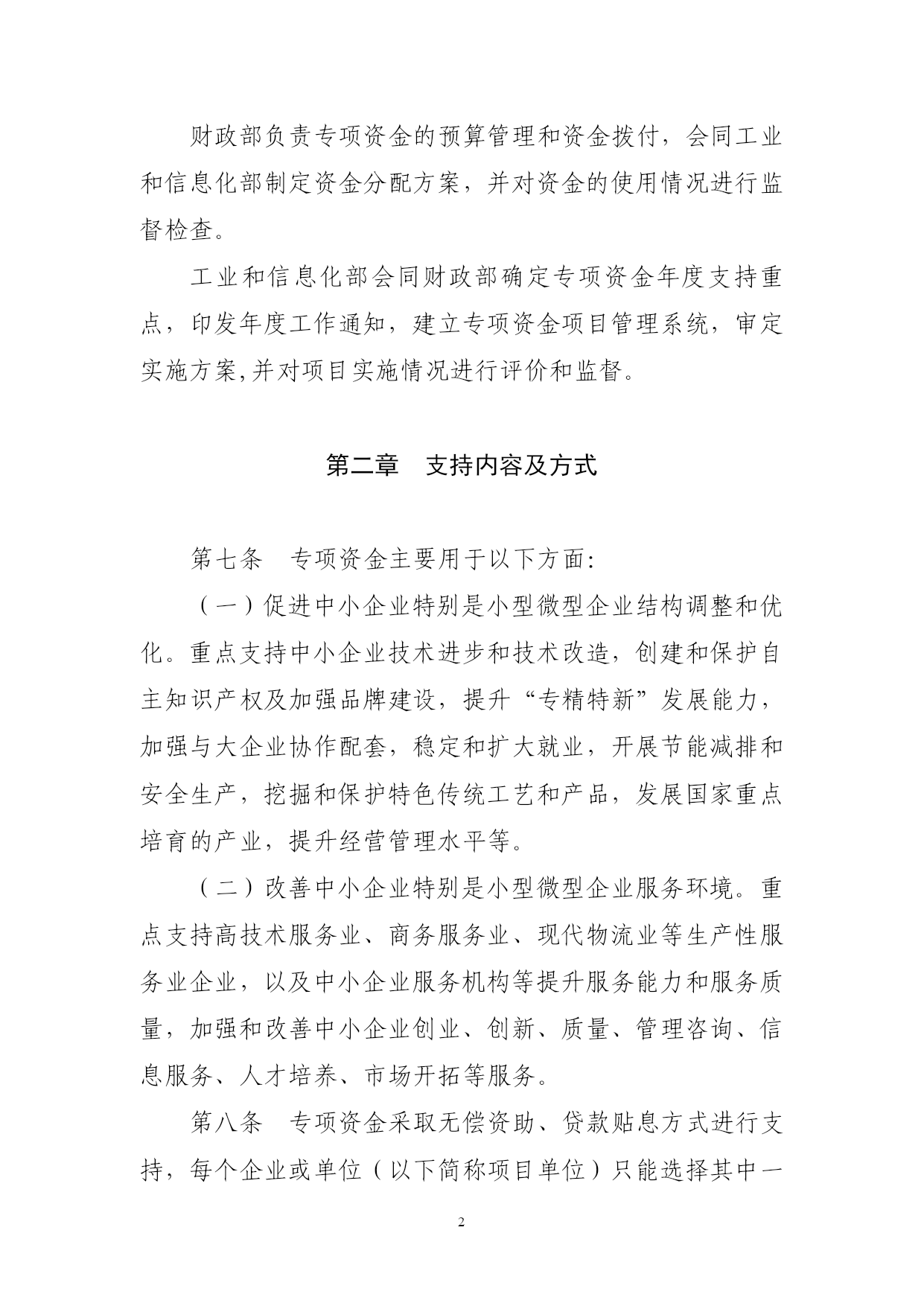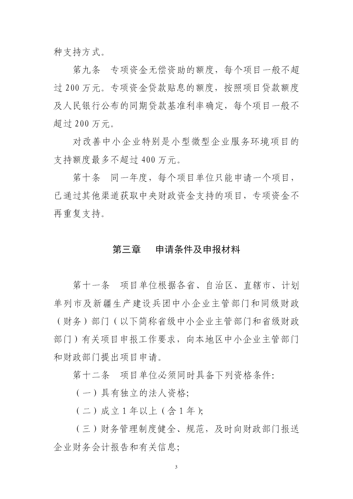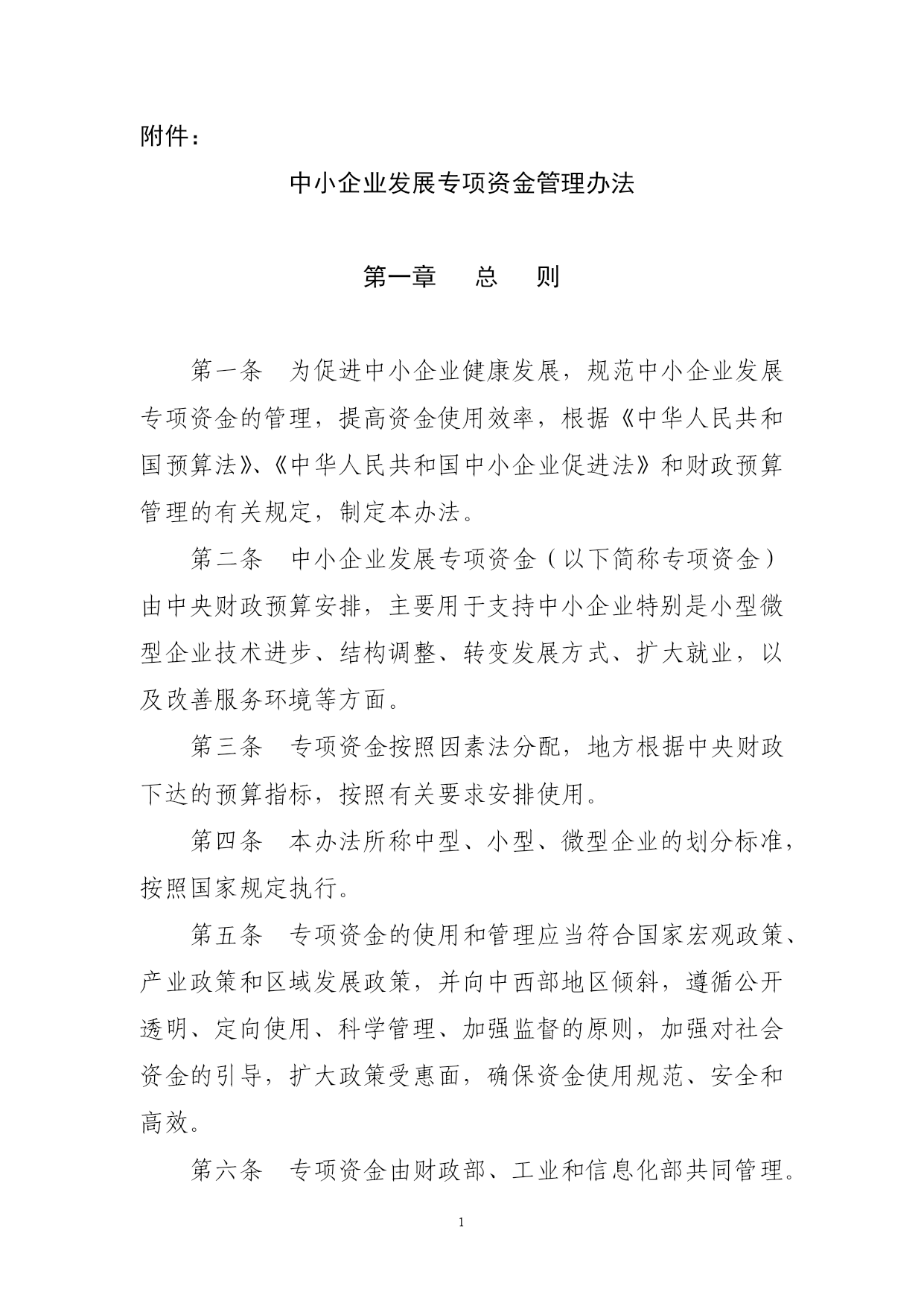 附件:中小企业发展专项资金管理办法第一章总则第一条为促进中小企业健康发展,规范中小企业发展专项资金的管理,提高资金使用效率,根据《中华人民共和国预算法》、《中华人民共和国中小企业促进法》和财政预算管理的有关规定,制定本办法。第二条中小企业发展专项资金(以下简称专项资金)由中央财政预算安排,主要用于支持中小企业特别是小型微型企业技术进步、结构调整、转变发展方式、扩大就业,以及改善服务环境等方面。第三条专项资金按照因素法分配,地方根据中央财政下达的预算指标,按照有关要求安排使用。第四条本办法所称中型、小型、微型企业的划分标准,按照国家规定执行。第五条专项资金的使用和管理应当符合国家宏观政策、产业政策和区域发展政策,并向中西部地区倾斜,遵循公开透明、定向使用、科学管理、加强监督的原则,加强对社会资金的引导,扩大政策受惠面,确保资金使用规范、安全和高效。第六条专项资金由财政部、工业和信息化部共同管理。财政部负责专项资金的预算管理和资金拨付,会同工业和信息化部制定资金分配方案,并对资金的使用情况进行监督检查。工业和信息化部会同财政部确定专项资金年度支持重点,印发年度工作通知,建立专项资金项目管理系统,审定实施方案,并对项目实施情况进行评价和监督。第二章支持内容及方式第七条专项资金主要用于以下方面:(一)促进中小企业特别是小型微型企业结构调整和优化。重点支持中小企业技术进步和技术改造,创建和保护自主知识产权及加强品牌建设,提升“专精特新”发展能力,加强与大企业协作配套,稳定和扩大就业,开展节能减排和安全生产,挖掘和保护特色传统工艺和产品,发展国家重点培育的产业,提升经营管理水平等。(二)改善中小企业特别是小型微型企业服务环境。重点支持高技术服务业、商务服务业、现代物流业等生产性服务业企业,以及中小企业服务机构等提升服务能力和服务质量,加强和改善中小企业创业、创新、质量、管理咨询、信息服务、人才培养、市场开拓等服务。第八条专项资金采取无偿资助、贷款贴息方式进行支持,每个企业或单位(以下简称项目单位)只能选择其中一种支持方式。第九条专项资金无偿资助的额度,每个项目一般不超过200万元。专项资金贷款贴息的额度,按照项目贷款额度及人民银行公布的同期贷款基准利率确定,每个项目一般不超过200万元。对改善中小企业特别是小型微型企业服务环境项目的支持额度最多不超过400万元。第十条同一年度,每个项目单位只能申请一个项目,已通过其他渠道获取中央财政资金支持的项目,专项资金不再重复支持。第三章申请条件及申报材料第十一条项目单位根据各省、自治区、直辖市、计划单列市及新疆生产建设兵团中小企业主管部门和同级财政(财务)部门(以下简称省级中小企业主管部门和省级财政部门)有关项目申报工作要求,向本地区中小企业主管部门和财政部门提出项目申请。第十二条项目单位必须同时具备下列资格条件:(一)具有独立的法人资格;(二)成立1年以上(含1年);(三)财务管理制度健全、规范,及时向财政部门报送企业财务会计报告和有关信息;(四)生产经营或业务开展情况良好;(五)会计信用、纳税信用和银行信用良好;(六)申报项目符合专项资金年度支持重点;(七)近3年没有因财政、财务及其他违法、违规行为受到县级以上财政部门及相关监管部门的处理处罚。(八)应当具备的其他条件。第十三条项目单位应同时提供下列资料:(一)营业执照副本及章程(复印件);(二)经会计师事务所审计的年度会计报表和审计报告(复印件);(三)项目可行性研究报告或项目申请说明;(四)项目单位对申报资料真实性负责的声明;(五)其他需提供的资料。第十四条项目单位应按要求将项目信息及时录入专项资金项目管理系统。第四章组织申报、审核及资金拨付第十五条省级财政部门和中小企业主管部门按照本办法及年度工作通知,结合本地区国民经济发展总体规划、产业发展规划以及小型微型企业数量等,研究提出本地区年度实施方案,包括支持重点、支持计划、资金需求等,其中用于小型微型企业和改善服务环境的资金规模不得少于申请额的80%,在每年2月底前上报财政部、工业和信息化部。第十六条工业和信息化部会同财政部对各省上报的实施方案进行审核,综合考虑各地区实施方案、经济社会发展指标、区域特点、以前年度工作情况等因素,研究提出专项资金项目年度实施方案。第十七条财政部根据预算规模、项目年度实施方案,确定资金分配方案,并及时向省级财政部门下达预算指标。第十八条省级中小企业主管部门会同财政部门按照本办法和年度工作通知等要求,在本地区范围内公开组织项目申请工作,并纳入专项资金项目管理系统进行管理。省级中小企业主管部门会同财政部门在项目组织申报文件中公布廉政信息反馈专线电话和电子邮箱,全面接