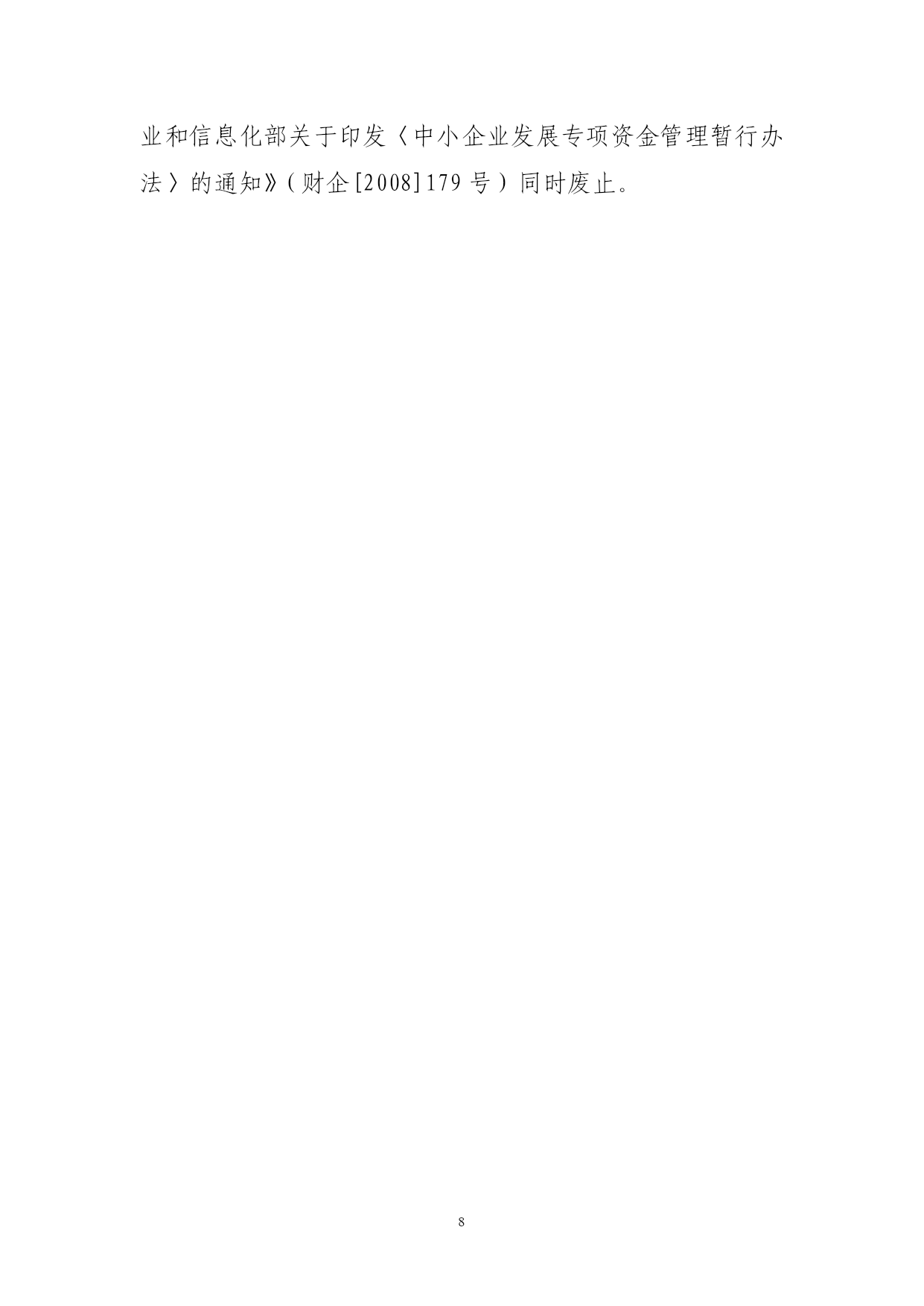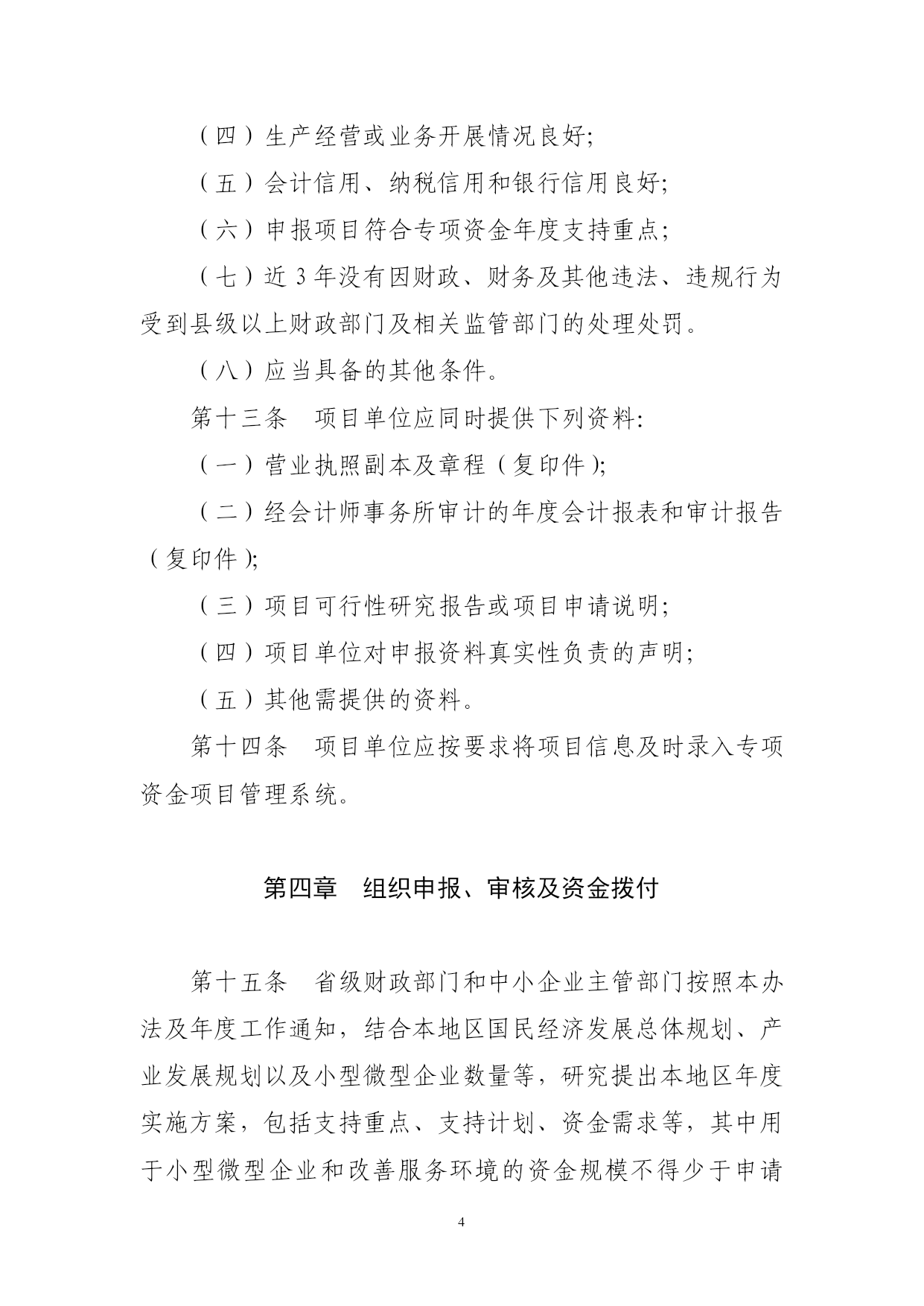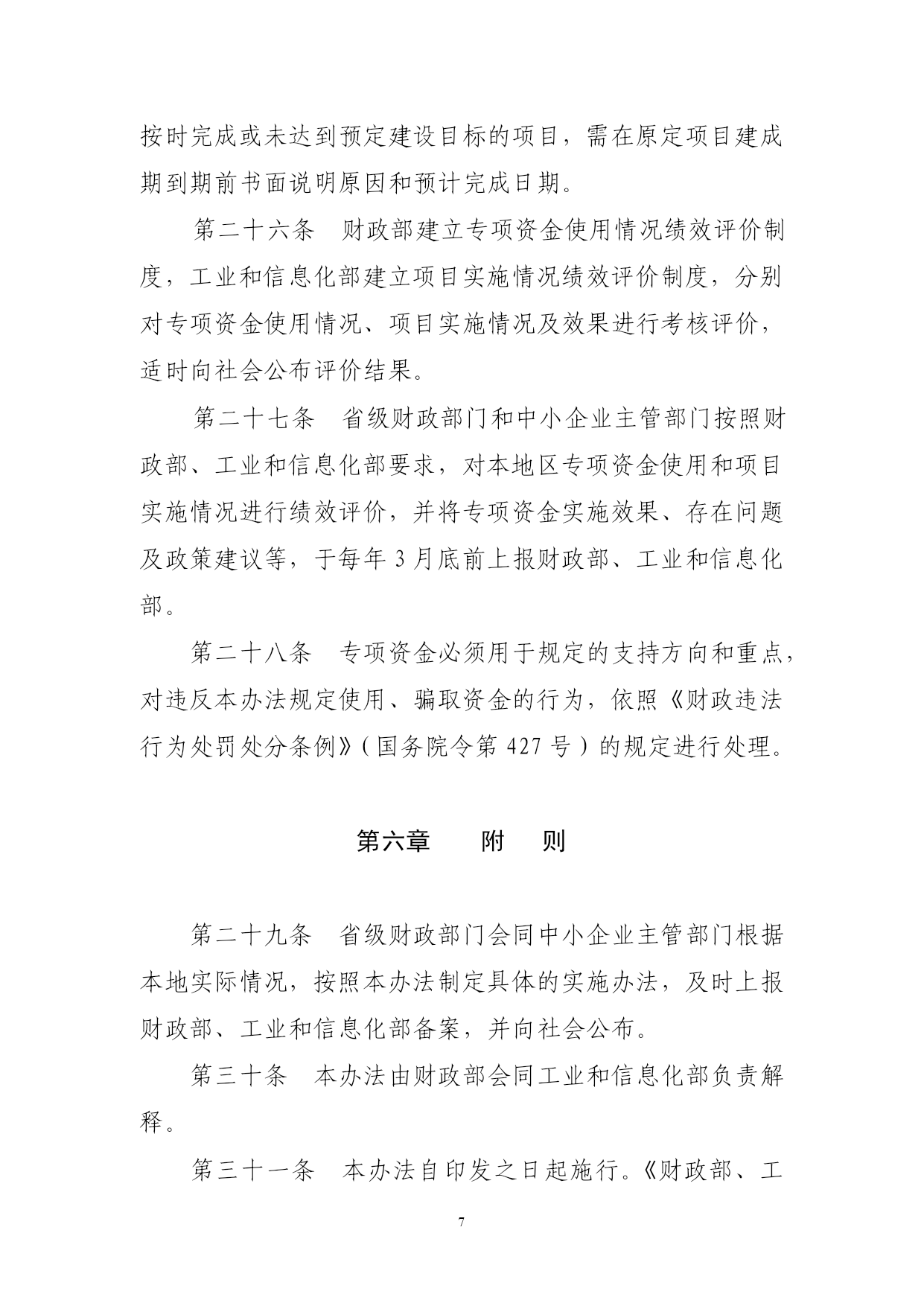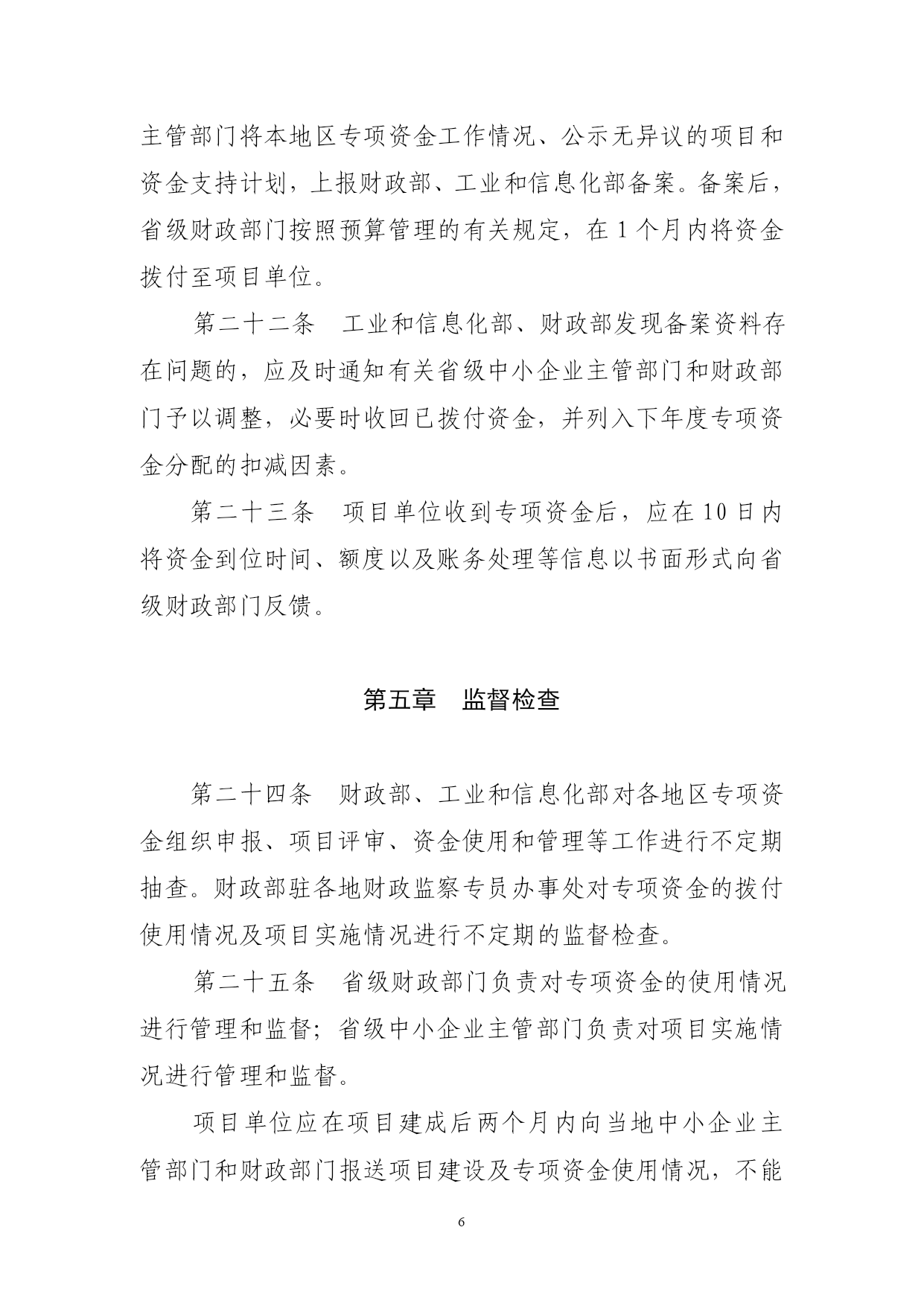 附件:中小企业发展专项资金管理办法第一章总则第一条为促进中小企业健康发展,规范中小企业发展专项资金的管理,提高资金使用效率,根据《中华人民共和国预算法》、《中华人民共和国中小企业促进法》和财政预算管理的有关规定,制定本办法。第二条中小企业发展专项资金(以下简称专项资金)由中央财政预算安排,主要用于支持中小企业特别是小型微型企业技术进步、结构调整、转变发展方式、扩大就业,以及改善服务环境等方面。第三条专项资金按照因素法分配,地方根据中央财政下达的预算指标,按照有关要求安排使用。第四条本办法所称中型、小型、微型企业的划分标准,按照国家规定执行。第五条专项资金的使用和管理应当符合国家宏观政策、产业政策和区域发展政策,并向中西部地区倾斜,遵循公开透明、定向使用、科学管理、加强监督的原则,加强对社会资金的引导,扩大政策受惠面,确保资金使用规范、安全和高效。第六条专项资金由财政部、工业和信息化部共同管理。财政部负责专项资金的预算管理和资金拨付,会同工业和信息化部制定资金分配方案,并对资金的使用情况进行监督检查。工业和信息化部会同财政部确定专项资金年度支持重点,印发年度工作通知,建立专项资金项目管理系统,审定实施方案,并对项目实施情况进行评价和监督。第二章支持内容及方式第七条专项资金主要用于以下方面:(一)促进中小企业特别是小型微型企业结构调整和优化。重点支持中小企业技术进步和技术改造,创建和保护自主知识产权及加强品牌建设,提升“专精特新”发展能力,加强与大企业协作配套,稳定和扩大就业,开展节能减排和安全生产,挖掘和保护特色传统工艺和产品,发展国家重点培育的产业,提升经营管理水平等。(二)改善中小企业特别是小型微型企业服务环境。重点支持高技术服务业、商务服务业、现代物流业等生产性服务业企业,以及中小企业服务机构等提升服务能力和服务质量,加强和改善中小企业创业、创新、质量、管理咨询、信息服务、人才培养、市场开拓等服务。第八条专项资金采取无偿资助、贷款贴息方式进行支持,每个企业或单位(以下简称项目单位)只能选择其中一种支持方式。第九条专项资金无偿资助的额度,每个项目一般不超过200万元。专项资金贷款贴息的额度,按照项目贷款额度及人民银行公布的同期贷款基准利率确定,每个项目一般不超过200万元。对改善中小企业特别是小型微型企业服务环境项目的支持额度最多不超过400万元。第十条同一年度,每个项目单位只能申请一个项目,已通过其他渠道获取中央财政资金支持的项目,专项资金不再重复支持。第三章申请条件及申报材料第十一条项目单位根据各省、自治区、直辖市、计划单列市及新疆生产建设兵团中小企业主管部门和同级财政(财务)部门(以下简称省级中小企业主管部门和省级财政部门)有关项目申报工作要求,向本地区中小企业主管部门和财政部门提出项目申请。第十二条项目单位必须同时具备下列资格条件:(一)具有独立的法人资格;(二)成立1年以上(含1年);(三)财务管理制度健全、规范,及时向财政部门报送企业财务会计报告和有关信息;(四)生产经营或业务开展情况良好;(五)会计信用、纳税信用和银行信用良好;(六)申报项目符合专项资金年度支持重点;(七)近3年没有因财政、财务及其他违法、违规行为受到县级以上财政部门及相关监管部门的处理处罚。(八)应当具备的其他条件。第十三条项目单位应同时提供下列资料:(一)营业执照副本及章程(复印件);(二)经会计师事务所审计的年度会计报表和审计报告(复印件);(三)项目可行性研究报告或项目申请说明;(四)项目单位对申报资料真实性负责的声明;(五)其他需提供的资料。第十四条项目单位应按要求将项目信息及时录入专项资金项目管理系统。第四章组织申报、审核及资金拨付第十五条省级财政部门和中小企业主管部门按照本办法及年度工作通知,结合本地区国民经济发展总体规划、产业发展规划以及小型微型企业数量等,研究提出本地区年度实施方案,包括支持重点、支持计划、资金需求等,其中用于小型微型企业和改善服务环境的资金规模不得少于申请额的80%,在每年2月底前上报财政部、工业和信息化部。第十六条工业和信息化部会同财政部对各省上报的实施方案进行审核,综合考虑各地区实施方案、经济社会发展指标、区域特点、以前年度工作情况等因素,研究提出专项资金项目年度实施方案。第十七条财政部根据预算规模、项目年度实施方案,确定资金分配方案,并及时向省级财政部门下达预算指标。第十八条省级中小企业主管部门会同财政部门按照本办法和年度工作通知等要求,在本地区范围内公开组织项目申请工作,并纳入专项资金项目管理系统进行管理。省级中小企业主管部门会同财政部门在项目组织申报文件中公布廉政信息反馈专线电话和电子邮箱,全面接