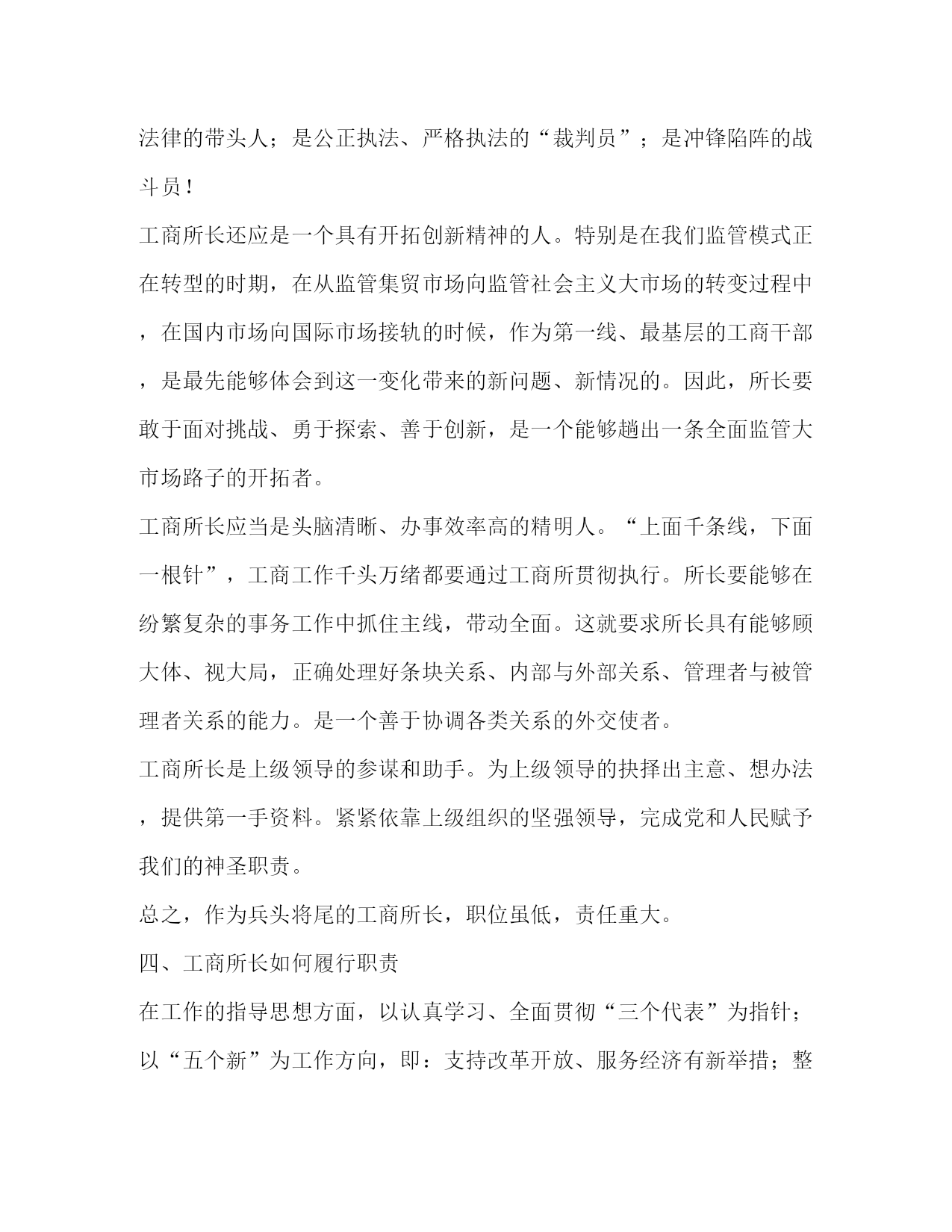 PAGE此资料由网络收集而来,如有侵权请告知上传者立即删除。资料共分享,我们负责传递知识。竞争工商所长演讲稿竞争工商所长演讲稿假如我当工商所长(竞争上岗演讲稿)各位领导、评委、同志们:首先,感谢组织为我提供了竞争所长的机会,这也是我一次难得的学习和锻炼的机会。我愿接受组织和同志们的挑选。我竞争的岗位是XX工商所所长。一、简历(略)二、我竞争所长的优势条件(略。各人情况不同,建议从自己的文化结构和经历方面写。忌从性格方面写)三、对工商所长岗位职责的理解工商所是工商行政管理机关实践“三个代表”的窗口。所长就是这个窗口的排头兵。在履行维护市场经济秩序、保护经营者、消费者合法权益的职责时,应将“三个代表”作为安排、部署一切工作的指针;作为衡量人民群众是否满意的标准;作为检验一切工作成败的准则。因此,所长应是学习“三个代表”的模范、实践“三个代表”的先锋。工商所是工商行政管理机关行政执法的前沿阵地。所长就是前线指挥员。所长应有出色的组织、指挥能力,能够团结、带领全所干部形成一个坚强的战斗堡垒。在整顿和规范市场经济秩序、与形形色色的违法分子较量的斗争中,身先士卒、一身正气、敢于斗争、善于执法。所长不是侠客、不是武士,而是用理论和法律武装起来的战士。列宁说过:没有理论武装的军队,是一支愚蠢的军队。因此,所长应是刻苦学习理论和法律的带头人;是公正执法、严格执法的“裁判员”;是冲锋陷阵的战斗员!工商所长还应是一个具有开拓创新精神的人。特别是在我们监管模式正在转型的时期,在从监管集贸市场向监管社会主义大市场的转变过程中,在国内市场向国际市场接轨的时候,作为第一线、最基层的工商干部,是最先能够体会到这一变化带来的新问题、新情况的。因此,所长要敢于面对挑战、勇于探索、善于创新,是一个能够趟出一条全面监管大市场路子的开拓者。工商所长应当是头脑清晰、办事效率高的精明人。“上面千条线,下面一根针”,工商工作千头万绪都要通过工商所贯彻执行。所长要能够在纷繁复杂的事务工作中抓住主线,带动全面。这就要求所长具有能够顾大体、视大局,正确处理好条块关系、内部与外部关系、管理者与被管理者关系的能力。是一个善于协调各类关系的外交使者。工商所长是上级领导的参谋和助手。为上级领导的抉择出主意、想办法,提供第一手资料。紧紧依靠上级组织的坚强领导,完成党和人民赋予我们的神圣职责。总之,作为兵头将尾的工商所长,职位虽低,责任重大。四、工商所长如何履行职责在工作的指导思想方面,以认真学习、全面贯彻“三个代表”为指针;以“五个新”为工作方向,即:支持改革开放、服务经济有新举措;整顿和规范市场经济秩序有新成效;改革监管制度、创新监管方式有新进展;抓基础、抓规范、加强内部管理有新突破;全所干部队伍素质和精神面貌有新变化。在具体工作安排方面,重点落实长效监管措施:(一)、建立、优化监管平台。用三步走的方法,不断完善“经济户口”。第一步,在经济条件、人员技能还不成熟的情况下,用人工超作的方法,全面建立起辖区内各类经营户的“经济户口”。摸清家底,明确管理对象;第二步,使用微机进行管理,科学管理、提高管理效率;第三步,在全市红盾网开通、联网后,实行动态化、全方位的管理。(二)、推行“市场巡查制”。及时发现、纠正各类违章违法行为。特别是对辖区内的重点地区、重点行业、重点商品进行重点巡查。加大查处制售假冒伪劣商品不法行为的力度,确保辖区内有一个良好的、正常的市场交易秩序。