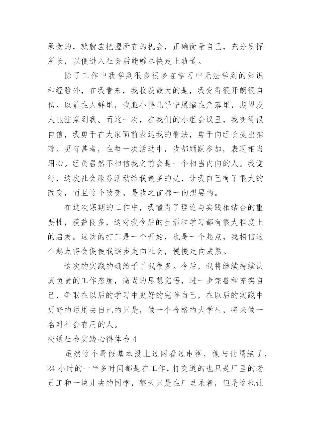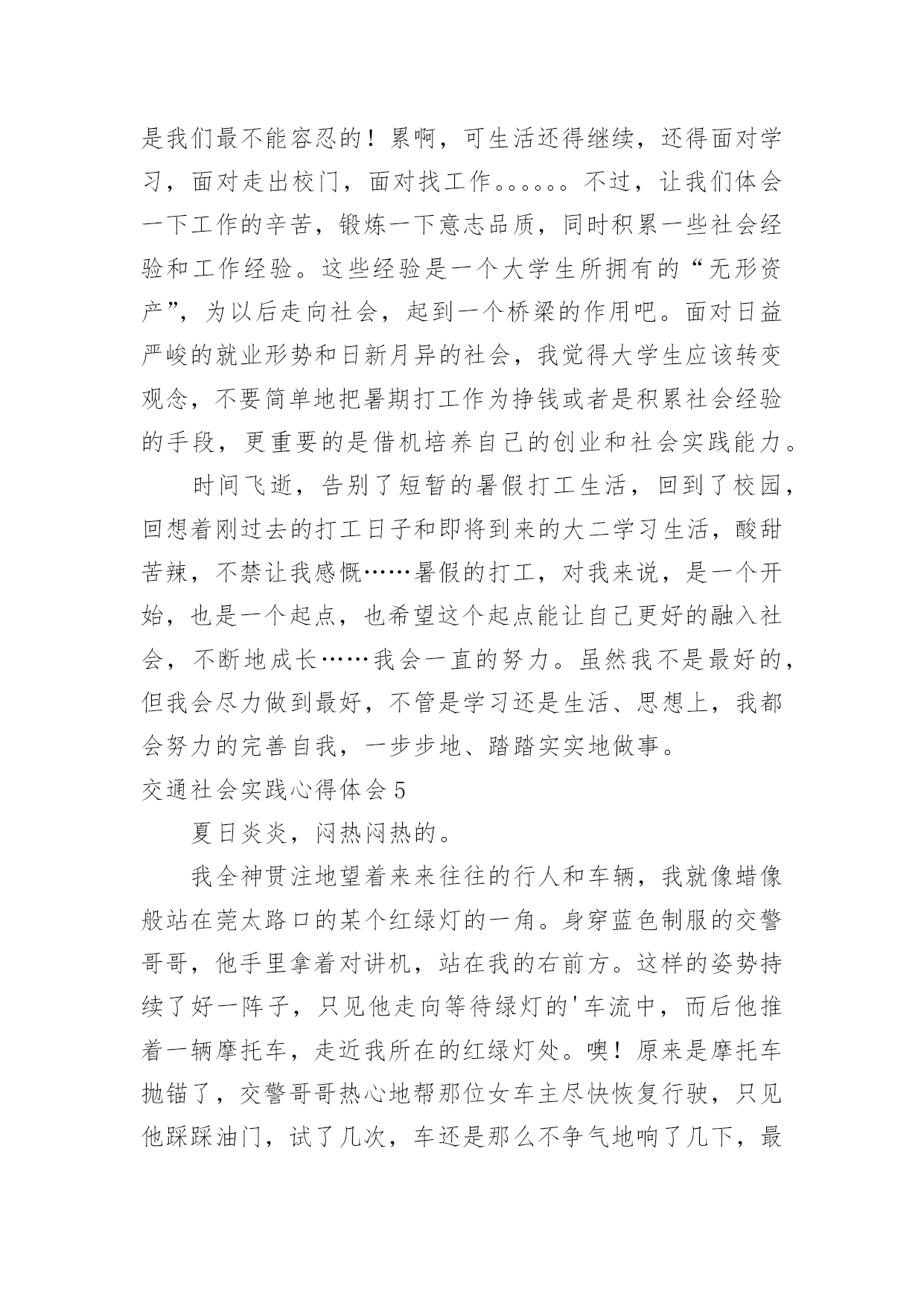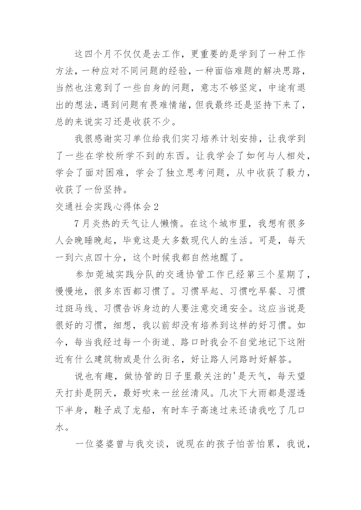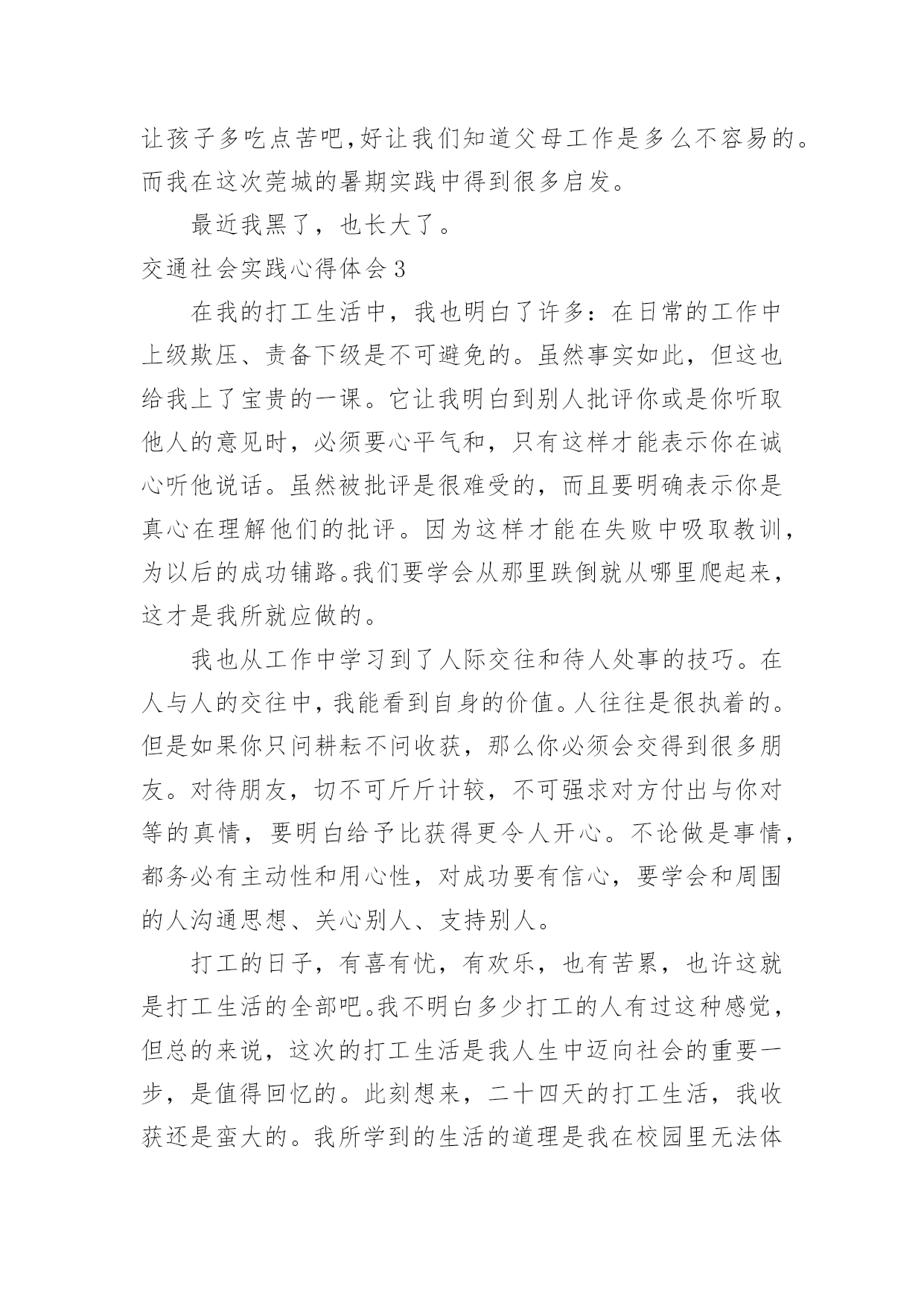 交通社会实践心得体会交通社会实践心得体会有了一些收获以后,应该马上记录下来,写一篇心得体会,这样可以记录我们的思想活动。那么心得体会怎么写才恰当呢?以下是小编精心整理的交通社会实践心得体会,欢迎大家借鉴与参考,希望对大家有所帮助。交通社会实践心得体会1实习是每一个大学毕业生必须拥有的一段经历,它使我们在实践中了解社会、在实践中巩固知识;实习又是对每一位大学毕业生专业知识的一种检验,它让我们学到了很多在课堂上根本就学不到的知识,既开阔了视野,又增长了见识,为我们以后进一步走向社会打下坚实的基础,也是我们走向工作岗位的.第一步。刚开始对于从未接触的岗位,我感到是那么的陌生和惧怕,因为我不想做不好,但是我相信只要有信心,就一定能做好。我被分到自动化事业部研究所工作,最开始跟着师傅学习组态王软件的开发及其应用,发现真正步入一个企业接触到的知识要比学校里深入的多了,所以很多地方需要向师傅请教,经过师傅的耐心培养,每天看软件开发的视频教程,自己可以对组态王软件进行简单的编程。根据师傅给我安排的实习计划,有了亲自去现场观察实践的机会。这四个月不仅仅是去工作,更重要的是学到了一种工作方法,一种应对不同问题的经验,一种面临难题的解决思路,当然也注意到了一些自身的问题,意志不够坚定,中途有退出的想法,遇到问题有畏难情绪,但我最终还是坚持下来了,总的来说实习还是收获不少。我很感谢实习单位给我们实习培养计划安排,让我学到了一些在学校所学不到的东西。让我学会了如何与人相处,学会了面对困难,学会了独立思考问题,从中收获了毅力,收获了一份坚持。交通社会实践心得体会27月炎热的天气让人懒惰。在这个城市里,我想有很多人会晚睡晚起,毕竟这是大多数现代人的生活。可是,每天一到六点四十分,这个时候我都自然地醒了。参加莞城实践分队的交通协管工作已经第三个星期了,慢慢地,很多东西都习惯了。习惯早起、习惯吃早餐、习惯过斑马线、习惯告诉身边的人要注意交通安全。这应当说是很好的习惯,细想,我以前却没有培养到这样的好习惯。如今,每当我经过每一个街道、路口时我会不自觉地记下这附近有什么建筑物或是什么街名,好让路人问路时好解答。说也有趣,做协管的日子里最关注的'是天气,每天望天打卦是阴天,最好吹来一丝丝清风。几次下大雨都是湿透下半身,鞋子成了龙船,有时车子高速过来还请我吃了几口水。一位婆婆曾与我交谈,说现在的孩子怕苦怕累,我说,让孩子多吃点苦吧,好让我们知道父母工作是多么不容易的。而我在这次莞城的暑期实践中得到很多启发。最近我黑了,也长大了。交通社会实践心得体会3在我的打工生活中,我也明白了许多:在日常的工作中上级欺压、责备下级是不可避免的。虽然事实如此,但这也给我上了宝贵的一课。它让我明白到别人批评你或是你听取他人的意见时,必须要心平气和,只有这样才能表示你在诚心听他说话。虽然被批评是很难受的,而且要明确表示你是真心在理解他们的批评。因为这样才能在失败中吸取教训,为以后的成功铺路。我们要学会从那里跌倒就从哪里爬起来,这才是我所就应做的。我也从工作中学习到了人际交往和待人处事的技巧。在人与人的交往中,我能看到自身的价值。人往往是很执着的。但是如果你只问耕耘不问收获,那么你必须会交得到很多朋友。对待朋友,切不可斤斤计较,不可强求对方付出与你对等的真情,要明白给予比获得更令人开心。不论做是事情,都务必有主动性和用心性,对成功要有信心,要学会和周围的人沟通思想、关心别人、支持别人。打工的日子,有喜有忧,有欢乐,也有苦累,也许这就是打工生活的全部吧。我不明白多少打工的人有过这种感觉,但总的来说,这次的打工生活是我人生中迈向社会的重要一步,是值得回忆的。此刻想来,二十四天的打工生活,我收获还是蛮大的。我所学到的生活的道理是我在校园里无法体会的,这也算是我的一分财富吧。现今,在人才市场上大学生已不是什么“抢手货”,而在每个用人单位的招聘条件中,几乎都要求有工作经验。所以,大学生不仅仅仅要有理论知识,工作经验的积累对将来找工作也同样重要。事情很简单,同等学历去应聘一份工作,公司当然更看重个人的相关工作经验。就业环境的不容乐观,竞争形式的日趋激烈,应对忧虑和压力,于是就有了像我一样的在校大学生选取了寒期打工。寒假虽然只有短短的一个月,但是在这段时间里,我们却能够体会一下工作的辛苦,锻炼一下意志品质,同时积累一些社会经验和工作经验。这些经验是一个大学生所拥有的“无形资产”,真正到了关键时刻,它们的作用就会显现出来。大学生除了学习书本知识,还需要参加社会实践。因为很多的'大学生都清醒得明白“两耳不闻窗外事,一心只读圣贤书”的人不是现代社会需要的人才。大学生要在社会实践中培养独立思考、独立工作和独立解决问题潜力。透过参加一些实践性活动巩固所学的理论,增长一些书本上学不到的知识和技能。因为知识要转化成