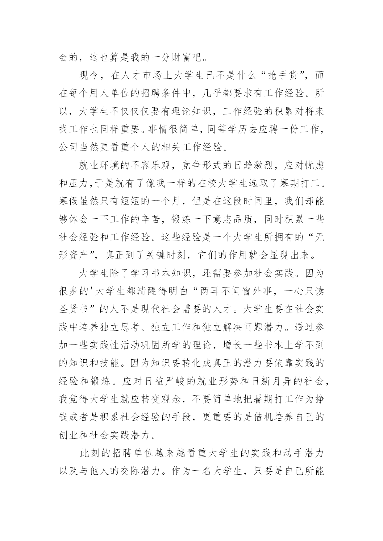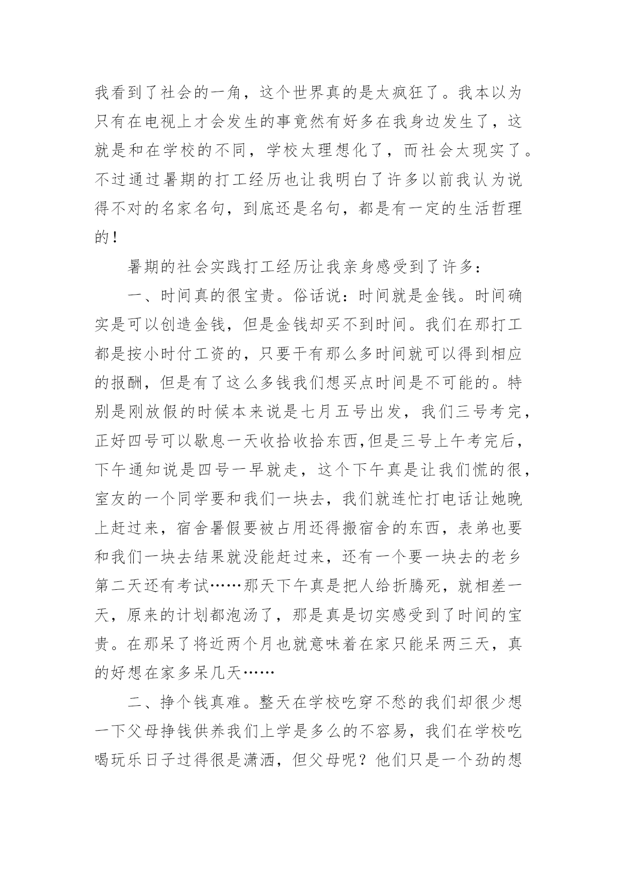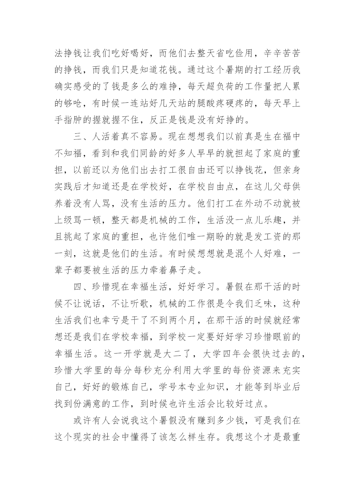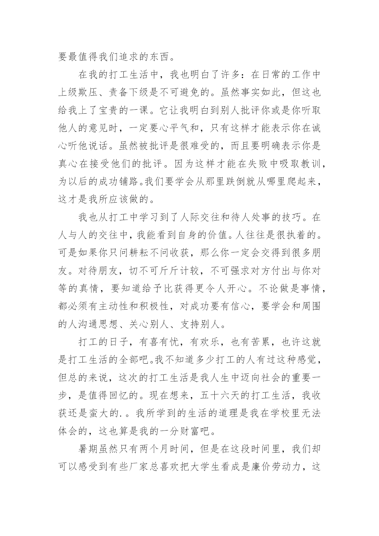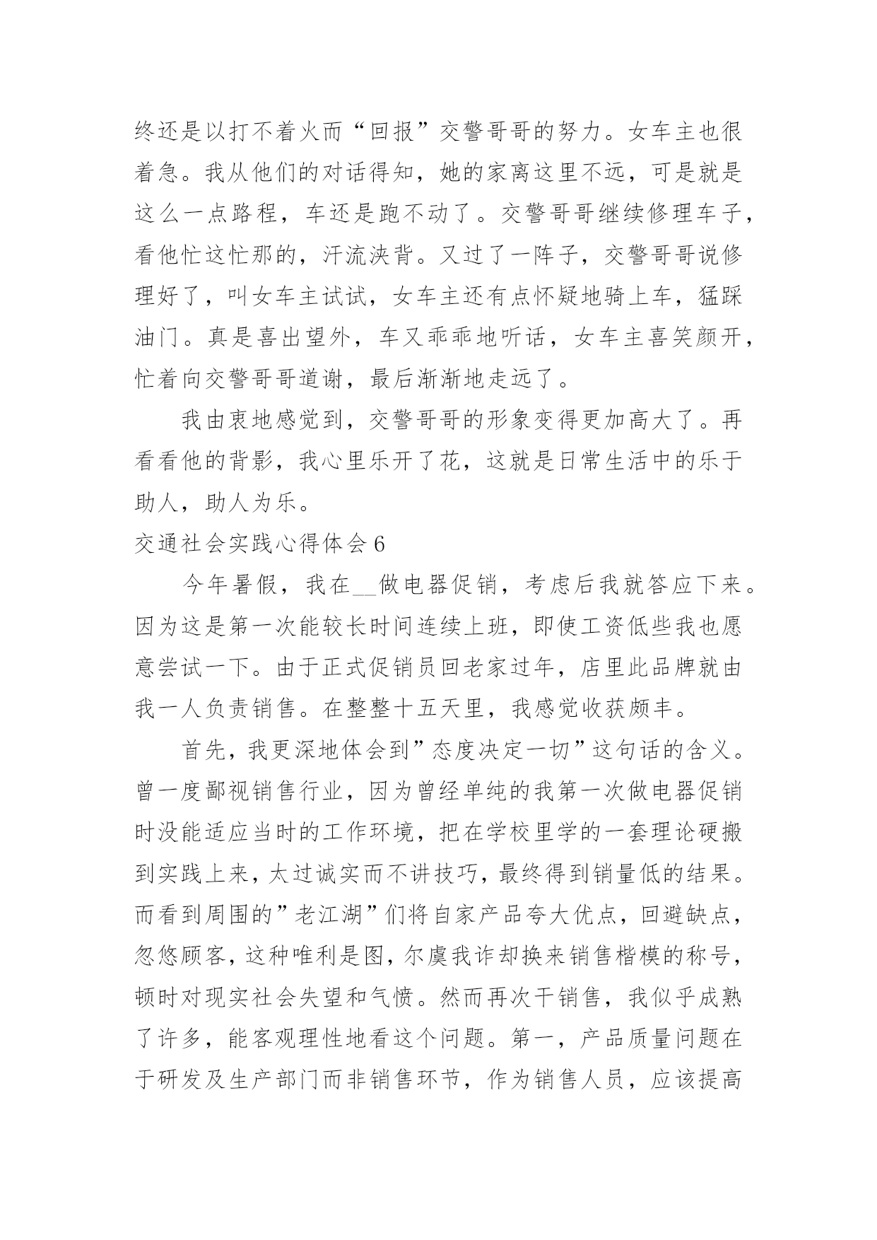 交通社会实践心得体会交通社会实践心得体会有了一些收获以后,应该马上记录下来,写一篇心得体会,这样可以记录我们的思想活动。那么心得体会怎么写才恰当呢?以下是小编精心整理的交通社会实践心得体会,欢迎大家借鉴与参考,希望对大家有所帮助。交通社会实践心得体会1实习是每一个大学毕业生必须拥有的一段经历,它使我们在实践中了解社会、在实践中巩固知识;实习又是对每一位大学毕业生专业知识的一种检验,它让我们学到了很多在课堂上根本就学不到的知识,既开阔了视野,又增长了见识,为我们以后进一步走向社会打下坚实的基础,也是我们走向工作岗位的.第一步。刚开始对于从未接触的岗位,我感到是那么的陌生和惧怕,因为我不想做不好,但是我相信只要有信心,就一定能做好。我被分到自动化事业部研究所工作,最开始跟着师傅学习组态王软件的开发及其应用,发现真正步入一个企业接触到的知识要比学校里深入的多了,所以很多地方需要向师傅请教,经过师傅的耐心培养,每天看软件开发的视频教程,自己可以对组态王软件进行简单的编程。根据师傅给我安排的实习计划,有了亲自去现场观察实践的机会。这四个月不仅仅是去工作,更重要的是学到了一种工作方法,一种应对不同问题的经验,一种面临难题的解决思路,当然也注意到了一些自身的问题,意志不够坚定,中途有退出的想法,遇到问题有畏难情绪,但我最终还是坚持下来了,总的来说实习还是收获不少。我很感谢实习单位给我们实习培养计划安排,让我学到了一些在学校所学不到的东西。让我学会了如何与人相处,学会了面对困难,学会了独立思考问题,从中收获了毅力,收获了一份坚持。交通社会实践心得体会27月炎热的天气让人懒惰。在这个城市里,我想有很多人会晚睡晚起,毕竟这是大多数现代人的生活。可是,每天一到六点四十分,这个时候我都自然地醒了。参加莞城实践分队的交通协管工作已经第三个星期了,慢慢地,很多东西都习惯了。习惯早起、习惯吃早餐、习惯过斑马线、习惯告诉身边的人要注意交通安全。这应当说是很好的习惯,细想,我以前却没有培养到这样的好习惯。如今,每当我经过每一个街道、路口时我会不自觉地记下这附近有什么建筑物或是什么街名,好让路人问路时好解答。说也有趣,做协管的日子里最关注的'是天气,每天望天打卦是阴天,最好吹来一丝丝清风。几次下大雨都是湿透下半身,鞋子成了龙船,有时车子高速过来还请我吃了几口水。一位婆婆曾与我交谈,说现在的孩子怕苦怕累,我说,让孩子多吃点苦吧,好让我们知道父母工作是多么不容易的。而我在这次莞城的暑期实践中得到很多启发。最近我黑了,也长大了。交通社会实践心得体会3在我的打工生活中,我也明白了许多:在日常的工作中上级欺压、责备下级是不可避免的。虽然事实如此,但这也给我上了宝贵的一课。它让我明白到别人批评你或是你听取他人的意见时,必须要心平气和,只有这样才能表示你在诚心听他说话。虽然被批评是很难受的,而且要明确表示你是真心在理解他们的批评。因为这样才能在失败中吸取教训,为以后的成功铺路。我们要学会从那里跌倒就从哪里爬起来,这才是我所就应做的。我也从工作中学习到了人际交往和待人处事的技巧。在人与人的交往中,我能看到自身的价值。人往往是很执着的。但是如果你只问耕耘不问收获,那么你必须会交得到很多朋友。对待朋友,切不可斤斤计较,不可强求对方付出与你对等的真情,要明白给予比获得更令人开心。不论做是事情,都务必有主动性和用心性,对成功要有信心,要学会和周围的人沟通思想、关心别人、支持别人。打工的日子,有喜有忧,有欢乐,也有苦累,也许这就是打工生活的全部吧。我不明白多少打工的人有过这种感觉,但总的来说,这次的打工生活是我人生中迈向社会的重要一步,是值得回忆的。此刻想来,二十四天的打工生活,我收获还是蛮大的。我所学到的生活的道理是我在校园里无法体会的,这也算是我的一分财富吧。现今,在人才市场上大学生已不是什么“抢手货”,而在每个用人单位的招聘条件中,几乎都要求有工作经验。所以,大学生不仅仅仅要有理论知识,工作经验的积累对将来找工作也同样重要。事情很简单,同等学历去应聘一份工作,公司当然更看重个人的相关工作经验。就业环境的不容乐观,竞争形式的日趋激烈,应对忧虑和压力,于是就有了像我一样的在校大学生选取了寒期打工。寒假虽然只有短短的一个月,但是在这段时间里,我们却能够体会一下工作的辛苦,锻炼一下意志品质,同时积累一些社会经验和工作经验。这些经验是一个大学生所拥有的“无形资产”,真正到了关键时刻,它们的作用就会显现出来。大学生除了学习书本知识,还需要参加社会实践。因为很多的'大学生都清醒得明白“两耳不闻窗外事,一心只读圣贤书”的人不是现代社会需要的人才。大学生要在社会实践中培养独立思考、独立工作和独立解决问题潜力。透过参加一些实践性活动巩固所学的理论,增长一些书本上学不到的知识和技能。因为知识要转化成