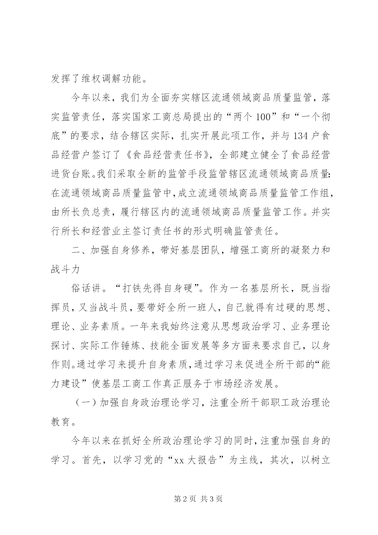 第PAGE\*Arabic\*MERGEFORMAT3页共NUMPAGES\*MERGEFORMAT3页工商所所长年终述职报告一、认真履行各项工作职责,依法进行市场监管(一)强化市场监管。一年来,我所以开展打假、打劣、打击传销为重点,突出食品安全监管,以建设消费维权平台为纽带,除加强日常巡查及春节、“中秋”等重要时节的检查外,结合市场监管动态适时宣传食品安全、消费维权、农资识假等方面的知识,并先后开展了严查无照经营行为、惩治黑网吧、打击传销和变相传销及整治“五小”、校园周边环境、“红盾护农”问题奶粉等专项整治行动,严厉打击各种违法行为,努力营造公平竞争环境。(二)提供优质服务。我所按照上级规定,用好个体工商户登记注册权,依法办理年度验照手续、并继续推行首问负责制、政务公开制、服务承诺制等三项制度。在登记注册窗口,为了方便群众,我们将办事程序、收费标准上墙公开公示,使群众能够多渠道获取所需信息,查询有关业务内容。对前来办照人员实行一次性告知制,除国家规定的前置条件外,其它一律不作为审批条件,对材料齐全手续完备的申请,受理后当日予以颁发营业执照。工作帮手网(三)加强维权工作。我所充分发挥12315平台作用,积极受理群众的消费投诉,努力做到件件有回应,处理率达到100%。既维护了消费者的合法权益也保护了经营者的正当利益,较好地发挥了维权调解功能。今年以来,我们为全面夯实辖区流通领域商品质量监管,落实监管责任,落实国家工商总局提出的“两个100”和“一个彻底”的要求,结合辖区实际,扎实开展此项工作,并与134户食品经营户签订了《食品经营责任书》,全部建立健全了食品经营进货台账。我们采取全新的监管手段监管辖区流通领域商品质量:在流通领域商品质量监管中,成立流通领域商品质量监管工作组,由所长负总责,履行辖区内的流通领域商品质量监管工作。并实行所长和经营业主签订责任书的形式明确监管责任。二、加强自身修养,带好基层团队,增强工商所的凝聚力和战斗力俗话讲。“打铁先得自身硬”。作为一名基层所长,既当指挥员,又当战斗员,要带好全所一班人,自己就得有过硬的思想、理论、业务素质。一年来我始终注意从思想政治学习、业务理论探讨、实际工作锤炼、技能全面发展等多方面来要求自己,以身作则。通过学习来提升自身素质,通过学习来促进全所干部的“能力建设”使基层工商工作真正服务于市场经济发展。(一)加强自身政治理论学习,注重全所干部职工政治理论教育。今年以来在抓好全所政治理论学习的同时,注重加强自身的学习。首先,以学习党的“xx大报告”为主线,其次,以树立马克思主义的世界观为根本,以廉洁奉公为重点,以立党为公、执政为民为目标,认真开展权力观自我教育,增强权为民所用的责任感;再次,以学习系统内外涌现出的先进典型和暴露出的问题吸取深刻教训为内容,对自己进行示范和警示教育,不断警醒自己该干什么和不干什么。通过学习,一是坚定了正确的政治方向。自己在政治思想上和行动上始终与党中央保持一致,能团结全员,保证党的方针政策正确贯彻执行,保证上级的工作安排部署和目标任务全面落实和完成。二是提高了思想政治素质。坚持理论与实践相结合,在实践中学,在实干中用,不断改造自己的主观能动性,从而进一步提高了思想政治觉悟和道德品质修养,做到了与人为善,和睦相处。三是提高了政策理论水平。通过学习,进一步增强了政策观念,能正确理解和掌握党和国家有关政策、法规。通过学习,并带领全所干部职工积极探讨,使自己的政治思想水平有了进一步升华,业务素质有了进一步提升,理论素养有了进一步提高,大家理想信念更加坚定了,服务群众的意识更加强了。