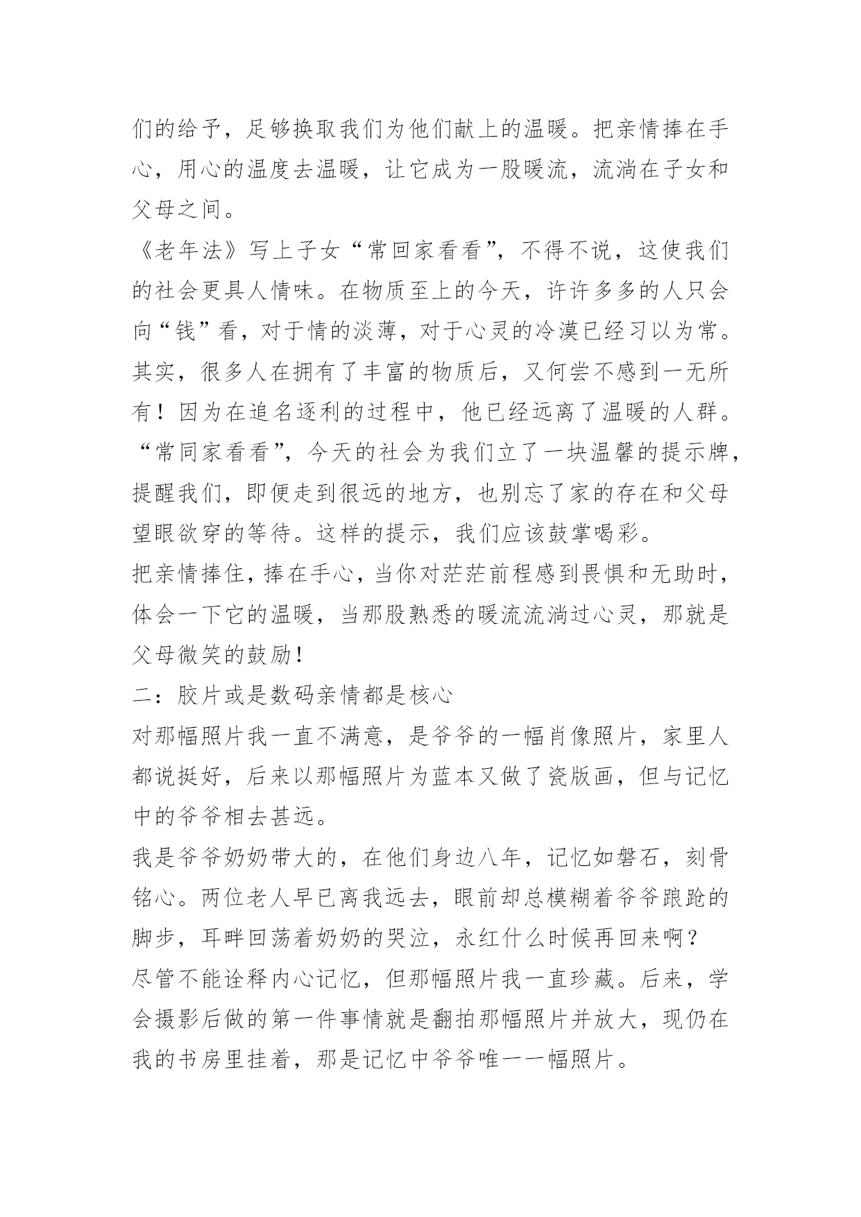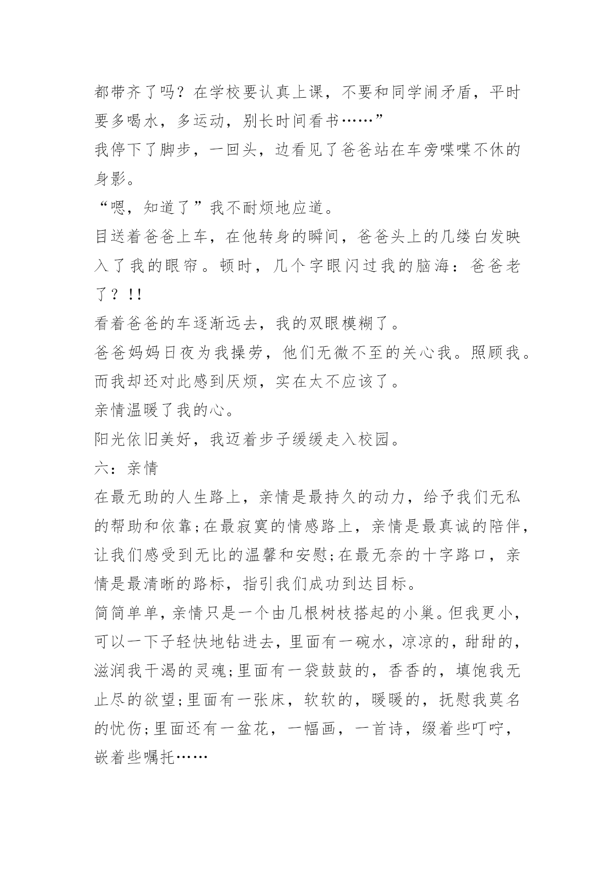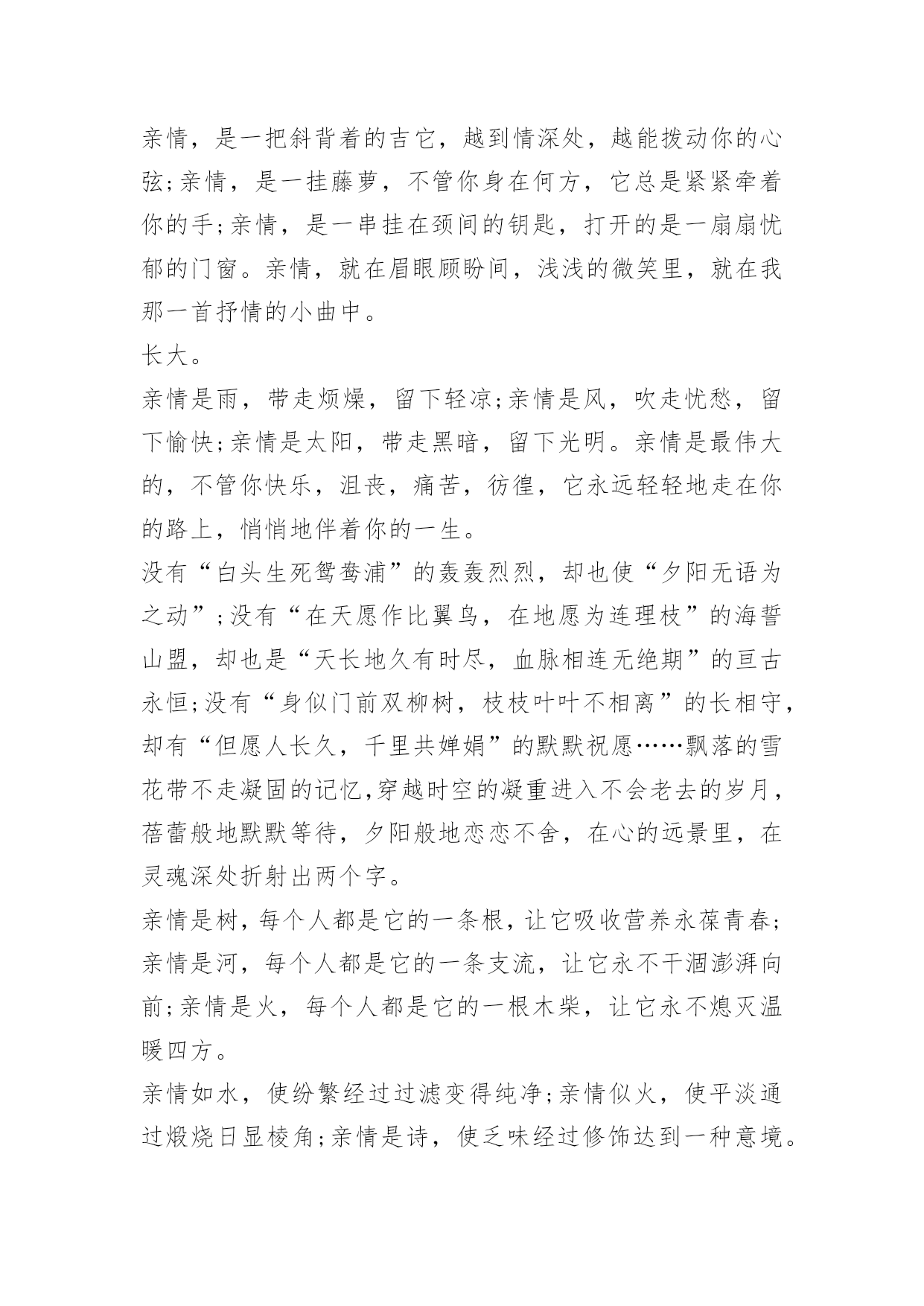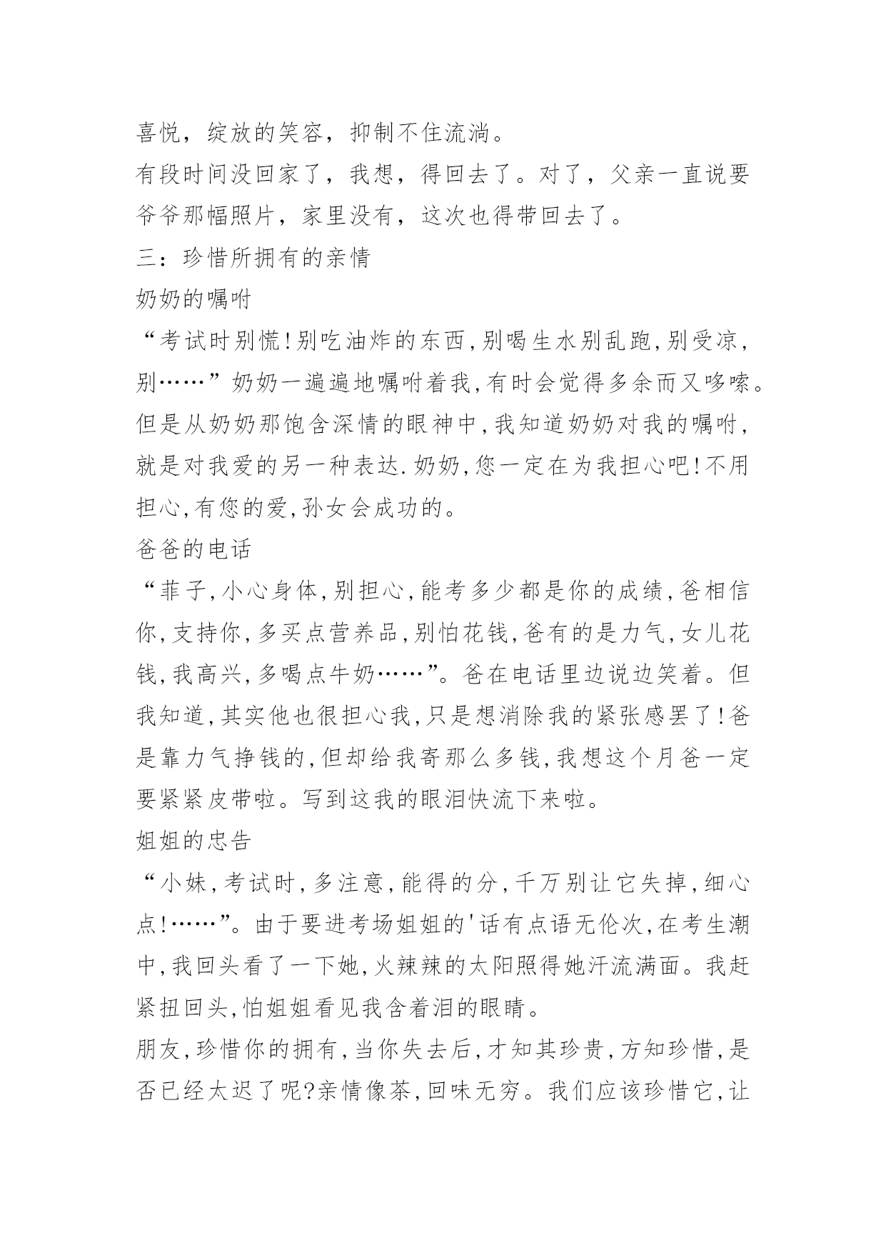 亲情高考满分作文亲情高考满分作文亲情,如一杯浓浓的热奶,捧在手心,让它在寒夜里用醇香的温暖驱赶冰冷的孤寂。“常回家看看”,当它作为一首歌时,红遍了大江南北,而当它作为一条法令时,宣告社会意识已经觉醒。一个人,如一棵树,带着一丝莫名其妙就神奇地来到世界,然后,生根发芽,开花结果。然而人与树又不尽相同,人会漂泊,而树永远扎根。是的,当我们长大了,都要到远方漂泊,如长翅的鸟儿,离巢腾飞。但我们那如树一样的根,却深深地扎在父母给予我们的那片土地上,我们流着他们的血液,呼吸着他们的呼吸,我们是父母用爱筑就的艺术。然而,当我们飞走了,离巢了,那满满的空虚就无情地留给了他们。我们得到了生命,经历了成长,难道就只能给他们留下一个空巢?面对亲情和工作,很多人会毫不犹豫地选择后者,因为亲情可以等待,而成功的机会却稍纵即逝,俗话不也说“好男儿志在四方”吗?可是“树欲静而风不止,子欲养而亲不待”,是否只有失去了才知道珍惜亲情?记得季羡林先生在《永久的悔》中就感慨于自己对母亲的忽视,字字动人肺腑,引人深思。朝如青丝暮成雪,人生有多少个“等待”?我们拥有长长的一生,而给予我们这一生的人难道只能在白发苍苍时站在我们的身后,眺望着我们远去的背影吗?当然不能。他们的给予,足够换取我们为他们献上的温暖。把亲情捧在手心,用心的温度去温暖,让它成为一股暖流,流淌在子女和父母之间。《老年法》写上子女“常回家看看”,不得不说,这使我们的社会更具人情味。在物质至上的今天,许许多多的人只会向“钱”看,对于情的淡薄,对于心灵的冷漠已经习以为常。其实,很多人在拥有了丰富的物质后,又何尝不感到一无所有!因为在追名逐利的过程中,他已经远离了温暖的人群。“常同家看看”,今天的社会为我们立了一块温馨的提示牌,提醒我们,即便走到很远的地方,也别忘了家的存在和父母望眼欲穿的等待。这样的提示,我们应该鼓掌喝彩。把亲情捧住,捧在手心,当你对茫茫前程感到畏惧和无助时,体会一下它的温暖,当那股熟悉的暖流流淌过心灵,那就是父母微笑的鼓励!二:胶片或是数码亲情都是核心对那幅照片我一直不满意,是爷爷的一幅肖像照片,家里人都说挺好,后来以那幅照片为蓝本又做了瓷版画,但与记忆中的爷爷相去甚远。我是爷爷奶奶带大的,在他们身边八年,记忆如磐石,刻骨铭心。两位老人早已离我远去,眼前却总模糊着爷爷踉跄的脚步,耳畔回荡着奶奶的哭泣,永红什么时候再回来啊?尽管不能诠释内心记忆,但那幅照片我一直珍藏。后来,学会摄影后做的第一件事情就是翻拍那幅照片并放大,现仍在我的书房里挂着,那是记忆中爷爷唯一一幅照片。岁月更替,手中有了相机,并从胶片到了数码,科技改变了一切。房间一角堆积的胶片、影集远远不如桌子上那个4t的硬盘所承载丰富,但点滴的记忆,前者所占更为丰满。于是,内心常彷徨:我们少了什么?胶片到数码,科技改变的不仅是摄影方式,更是生活方式。一部手机搞定一切,拍照、上网、购物、缴罚款……不经意间,地铁上人手一份的报纸悄然滑落;机场旅客手中的书籍寥寥无几;亲朋聚餐,开心的是这盘菜又可以发朋友圈。科技是时代发展的产物。1912年,拉蒂格父亲送给他一部小相机的时候,很是稀罕新潮,那时起,他拍摄了他的上流社会家庭亲情。在那个大动荡时代,其行为仅如低头走路一般平凡甚至平庸,几十年后,这些照片成为整个法国社会的时代记忆,入展纽约现代艺术博物馆。说到这里,我感觉,关于“胶片时代与数码技术时代”这个命题实则是个伪命题,最新的科技发明的确取代了旧技术,或许也取代了许多美好,但这些东西,或旧古董或新科技,永远只是一个工具。工具掌握人还是人掌握工具,这是个关键。或者说,这才是命题所指。于是,悄然问自己,我,能做什么?急剧变化的经济社会面前,我们是否眼光放得太远,而无力顾及身边——父母的健康,亲人的需求?前天,在江西老家的三弟,把手机视频聊天功能打开,这是父母第一次使用,看到我在画面里,妈妈兴奋地说:“我看到你了,胡子又没刮。你看到我了吗?”镜头里,父母满面喜悦,绽放的笑容,抑制不住流淌。有段时间没回家了,我想,得回去了。对了,父亲一直说要爷爷那幅照片,家里没有,这次也得带回去了。三:珍惜所拥有的亲情奶奶的嘱咐“考试时别慌!别吃油炸的东西,别喝生水别乱跑,别受凉,别……”奶奶一遍遍地嘱咐着我,有时会觉得多余而又哆嗦。但是从奶奶那饱含深情的眼神中,我知道奶奶对我的嘱咐,就是对我爱的另一种表达.奶奶,您一定在为我担心吧!不用担心,有您的爱,孙女会成功的。爸爸的电话“菲子,小心身体,别担心,能考多少都是你的成绩,爸相信你,支持你,多买点营养品,别怕花钱,爸有的是力气,女儿花钱,我高兴,多喝点牛奶……”。爸在电话里边说边笑着。但我知道,其实他也很担心我,只是想消除我的紧张感罢了!爸是靠力气挣钱的,但却给我寄那么多钱,我想这个月爸一定要紧紧皮带啦。写到这我