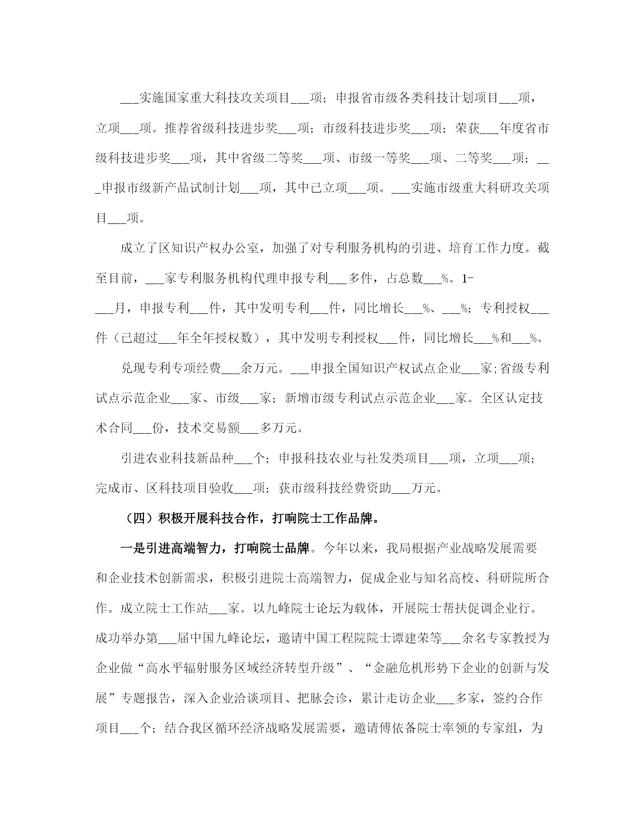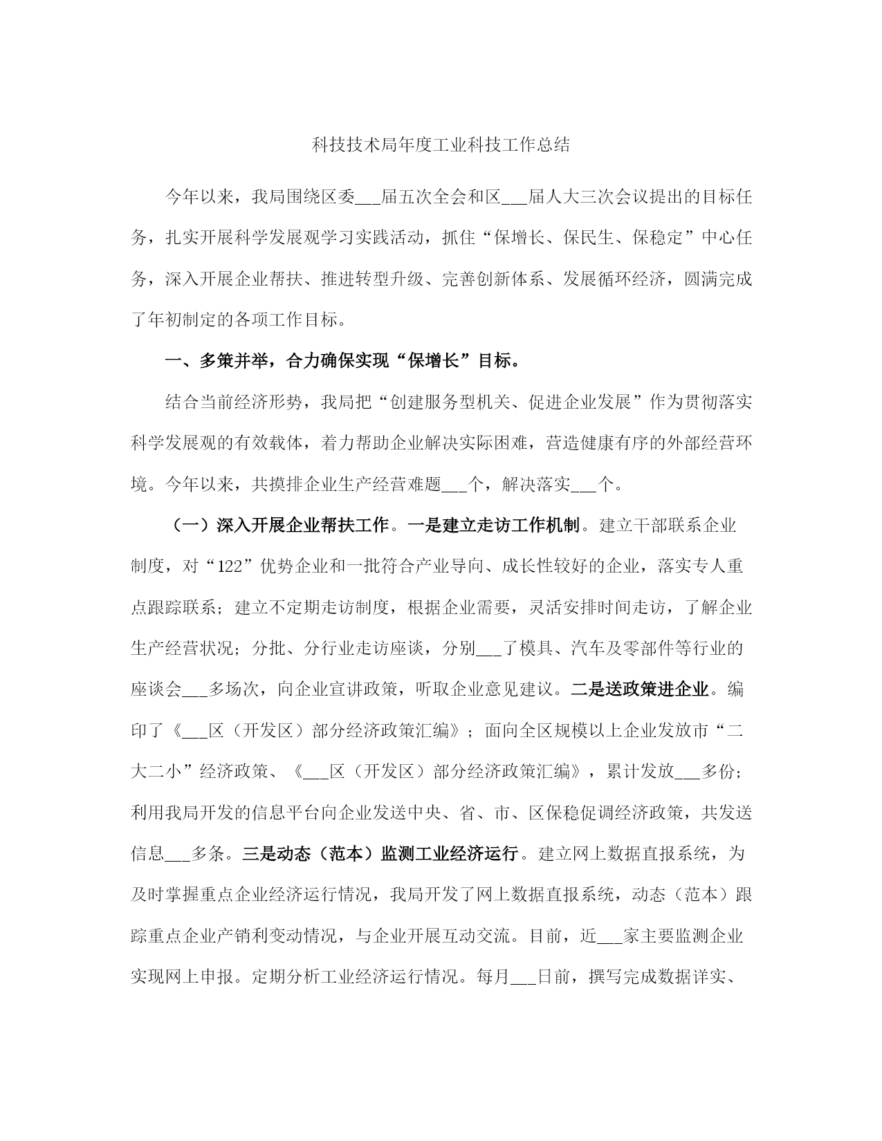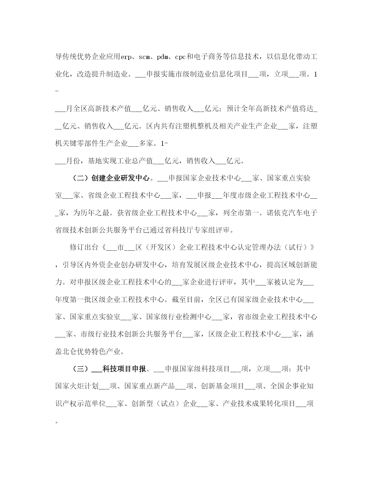 科技技术局年度工业科技工作总结(完整版)文档资料可直接使用,可编辑,欢迎下载科技技术局年度工业科技工作总结今年以来,我局围绕区委___届五次全会和区___届人大三次会议提出的目标任务,扎实开展科学发展观学习实践活动,抓住“保增长、保民生、保稳定”中心任务,深入开展企业帮扶、推进转型升级、完善创新体系、发展循环经济,圆满完成了年初制定的各项工作目标。一、多策并举,合力确保实现“保增长”目标。结合当前经济形势,我局把“创建服务型机关、促进企业发展”作为贯彻落实科学发展观的有效载体,着力帮助企业解决实际困难,营造健康有序的外部经营环境。今年以来,共摸排企业生产经营难题___个,解决落实___个。(一)深入开展企业帮扶工作。一是建立走访工作机制。建立干部联系企业制度,对“122”优势企业和一批符合产业导向、成长性较好的企业,落实专人重点跟踪联系;建立不定期走访制度,根据企业需要,灵活安排时间走访,了解企业生产经营状况;分批、分行业走访座谈,分别___了模具、汽车及零部件等行业的座谈会___多场次,向企业宣讲政策,听取企业意见建议。二是送政策进企业。编印了《___区(开发区)部分经济政策汇编》;面向全区规模以上企业发放市“二大二小”经济政策、《___区(开发区)部分经济政策汇编》,累计发放___多份;利用我局开发的信息平台向企业发送中央、省、市、区保稳促调经济政策,共发送信息___多条。三是动态(范本)监测工业经济运行。建立网上数据直报系统,为及时掌握重点企业经济运行情况,我局开发了网上数据直报系统,动态(范本)跟踪重点企业产销利变动情况,与企业开展互动交流。目前,近___家主要监测企业实现网上申报。定期分析工业经济运行情况。每月___日前,撰写完成数据详实、观点鲜明的经济运行分析报告,分析工业经济运行中的难点、热点,提出应对措施。截至目前,共撰写分析报告___篇。(二)帮助企业拓展市场。一是开展专题调研。向全区___多家规模以上企业发放《企业参展意向调查问卷》,收集企业反馈意向,掌握企业需求,针对性帮助企业拓展市场。二是搭建信息平台。搭建临港工业与本地企业的信息交流平台,帮助本地中小企业获取采购信息。搭建本地企业与网络科技公司的交流互动平台,鼓励企业建立网络直销模式。三是___参加展会。积极做好企业参展的宣传发动、政策宣讲和服务保障工作。先后___企业参加了“能博会”、“模具博览会”、“科技人才周”、“第___届中国国际中小企业博览会”、“服博会”等大型展会___多场次。___企业参加与___、___、___等城市的交流活动,引导___家企业成功进驻___-宁波知名品牌直销中心,销售面积达___余平方米。(三)促进企业转型升级。一是鼓励加大技改力度。通过产业政策引导,提供技术、信息支持等方式鼓励企业加大技术改造力度,积极帮助企业争取各类___。二是加快工业新产品开发步伐。通过宣传发动、___申报,我区共有___项新产品列入___年度市级工业新产品第一、二批试产计划。___个新产品被评为___市重点工业新产品,获奖励资金___万元。三是推进产业基地建设。我区被认定为___市石化、大型成套装备及高档模具___个特色优势产业基地。为推进产业基地建设,我局牵头___编制了产业基地规划及转型升级方案,目前___个《规划》已经通过有关部门论证。(四)加强对中小企业管理人员的培训。为帮助企业正确应对危机,我局邀请国内外知名企业管理专家通过举办培训班,开展论坛、讲座等形式为企业提供培训服务。累计举办培训班___期,培训企业副总以上管理人员___多人次,中层以上人员___多人次。先后举办了“金融危机下如何铸造一支高绩效的管理团队”,“面对严峻形势,企业如何过冬”,中小企业创业辅导“危机管理”、“精益生产特训班”等培训班。推荐了___多位企业董事长、总经理参加了___大学第八、九期___市成长型中小企业高级工商管理研修班(emba)。加强中小企业公共服务平台建设。引导推动区域公共服务平台建设,推荐___家企业上报了市级中小企业公共技术服务平台,推荐___家企业上报市级中小企业创业支持服务平台,共争取到市级补助___万元。二、完善创新体系,为实现“保增长”目标提供强劲动力。自主创新是抵御危机的有效途径。今年以来,我局把提高自主创新能力,发展高新技术产业作为实现“保增长”目标重中之重。全年申报国家级科技项目___项,立项___项;申报省市级科技计划项目___项,立项___项;获国家、省(市)级科技经费___多万元;新增高新技术企业___家,位列全市第二,申报市科技型企业___家。科技综合实力和进步水平进入全省先进行列。通过省___领导目标责任制考核、全国科技进步先进区审核。(一)培育发展高新技术产业。一是创建高新技术企业。分___批对