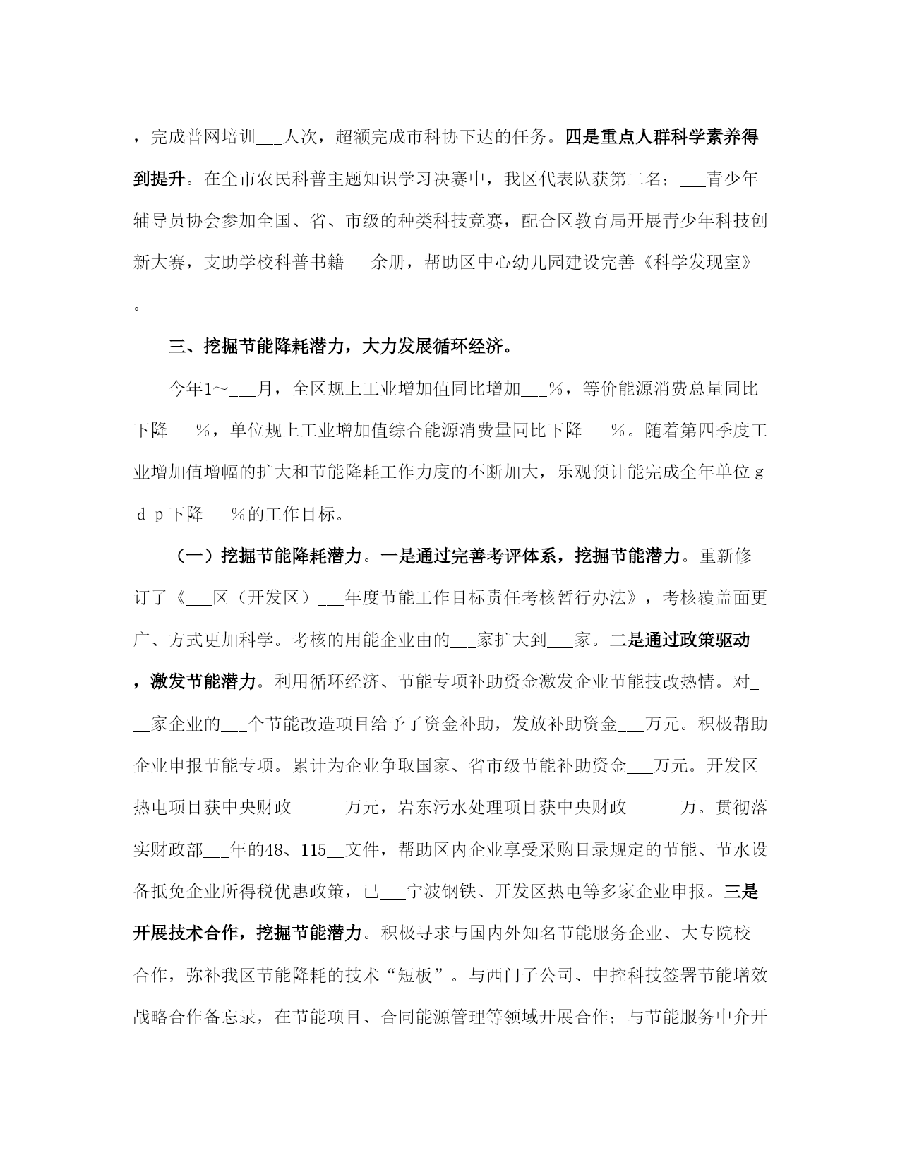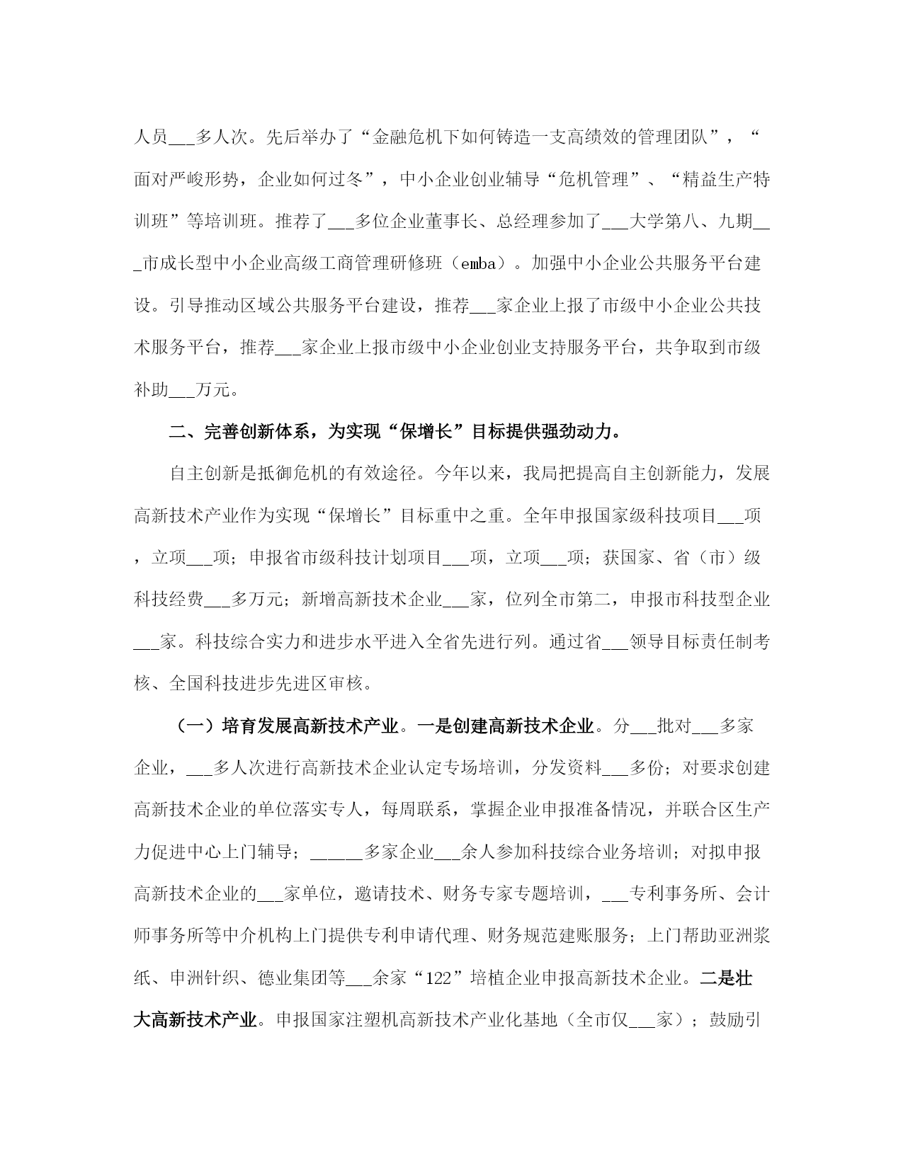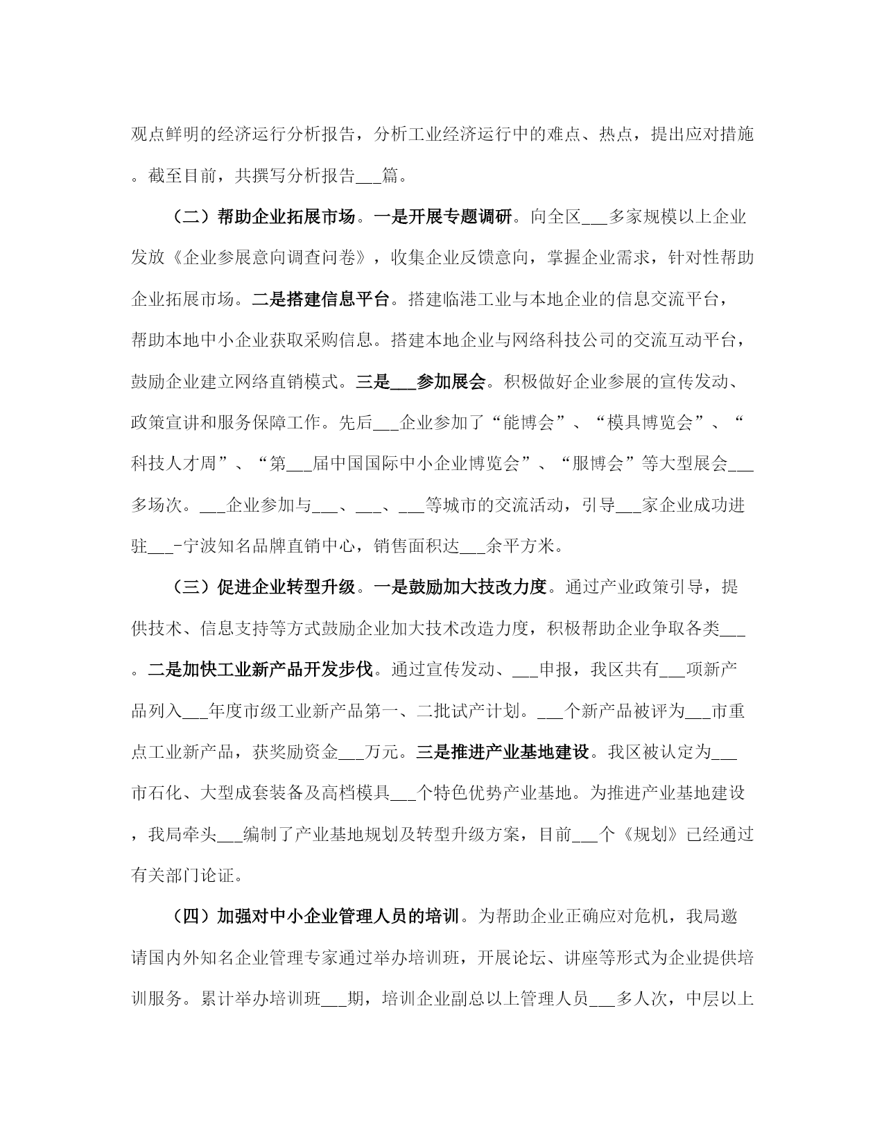 科技技术局年度工业科技工作总结(完整版)文档资料可直接使用,可编辑,欢迎下载科技技术局年度工业科技工作总结今年以来,我局围绕区委___届五次全会和区___届人大三次会议提出的目标任务,扎实开展科学发展观学习实践活动,抓住“保增长、保民生、保稳定”中心任务,深入开展企业帮扶、推进转型升级、完善创新体系、发展循环经济,圆满完成了年初制定的各项工作目标。一、多策并举,合力确保实现“保增长”目标。结合当前经济形势,我局把“创建服务型机关、促进企业发展”作为贯彻落实科学发展观的有效载体,着力帮助企业解决实际困难,营造健康有序的外部经营环境。今年以来,共摸排企业生产经营难题___个,解决落实___个。(一)深入开展企业帮扶工作。一是建立走访工作机制。建立干部联系企业制度,对“122”优势企业和一批符合产业导向、成长性较好的企业,落实专人重点跟踪联系;建立不定期走访制度,根据企业需要,灵活安排时间走访,了解企业生产经营状况;分批、分行业走访座谈,分别___了模具、汽车及零部件等行业的座谈会___多场次,向企业宣讲政策,听取企业意见建议。二是送政策进企业。编印了《___区(开发区)部分经济政策汇编》;面向全区规模以上企业发放市“二大二小”经济政策、《___区(开发区)部分经济政策汇编》,累计发放___多份;利用我局开发的信息平台向企业发送中央、省、市、区保稳促调经济政策,共发送信息___多条。三是动态(范本)监测工业经济运行。建立网上数据直报系统,为及时掌握重点企业经济运行情况,我局开发了网上数据直报系统,动态(范本)跟踪重点企业产销利变动情况,与企业开展互动交流。目前,近___家主要监测企业实现网上申报。定期分析工业经济运行情况。每月___日前,撰写完成数据详实、观点鲜明的经济运行分析报告,分析工业经济运行中的难点、热点,提出应对措施。截至目前,共撰写分析报告___篇。(二)帮助企业拓展市场。一是开展专题调研。向全区___多家规模以上企业发放《企业参展意向调查问卷》,收集企业反馈意向,掌握企业需求,针对性帮助企业拓展市场。二是搭建信息平台。搭建临港工业与本地企业的信息交流平台,帮助本地中小企业获取采购信息。搭建本地企业与网络科技公司的交流互动平台,鼓励企业建立网络直销模式。三是___参加展会。积极做好企业参展的宣传发动、政策宣讲和服务保障工作。先后___企业参加了“能博会”、“模具博览会”、“科技人才周”、“第___届中国国际中小企业博览会”、“服博会”等大型展会___多场次。___企业参加与___、___、___等城市的交流活动,引导___家企业成功进驻___-宁波知名品牌直销中心,销售面积达___余平方米。(三)促进企业转型升级。一是鼓励加大技改力度。通过产业政策引导,提供技术、信息支持等方式鼓励企业加大技术改造力度,积极帮助企业争取各类___。二是加快工业新产品开发步伐。通过宣传发动、___申报,我区共有___项新产品列入___年度市级工业新产品第一、二批试产计划。___个新产品被评为___市重点工业新产品,获奖励资金___万元。三是推进产业基地建设。我区被认定为___市石化、大型成套装备及高档模具___个特色优势产业基地。为推进产业基地建设,我局牵头___编制了产业基地规划及转型升级方案,目前___个《规划》已经通过有关部门论证。(四)加强对中小企业管理人员的培训。为帮助企业正确应对危机,我局邀请国内外知名企业管理专家通过举办培训班,开展论坛、讲座等形式为企业提供培训服务。累计举办培训班___期,培训企业副总以上管理人员___多人次,中层以上人员___多人次。先后举办了“金融危机下如何铸造一支高绩效的管理团队”,“面对严峻形势,企业如何过冬”,中小企业创业辅导“危机管理”、“精益生产特训班”等培训班。推荐了___多位企业董事长、总经理参加了___大学第八、九期___市成长型中小企业高级工商管理研修班(emba)。加强中小企业公共服务平台建设。引导推动区域公共服务平台建设,推荐___家企业上报了市级中小企业公共技术服务平台,推荐___家企业上报市级中小企业创业支持服务平台,共争取到市级补助___万元。二、完善创新体系,为实现“保增长”目标提供强劲动力。自主创新是抵御危机的有效途径。今年以来,我局把提高自主创新能力,发展高新技术产业作为实现“保增长”目标重中之重。全年申报国家级科技项目___项,立项___项;申报省市级科技计划项目___项,立项___项;获国家、省(市)级科技经费___多万元;新增高新技术企业___家,位列全市第二,申报市科技型企业___家。科技综合实力和进步水平进入全省先进行列。通过省___领导目标责任制考核、全国科技进步先进区审核。(一)培育发展高新技术产业。一是创建高新技术企业。分___批对