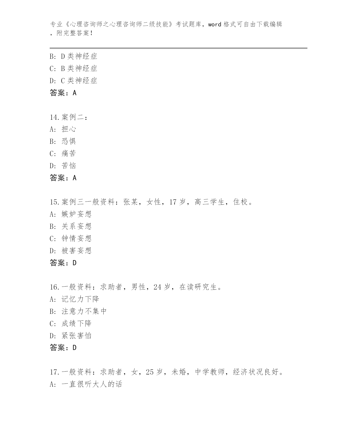 江西省章贡区2024《心理咨询师之心理咨询师二级技能》考试大全(突破训练)