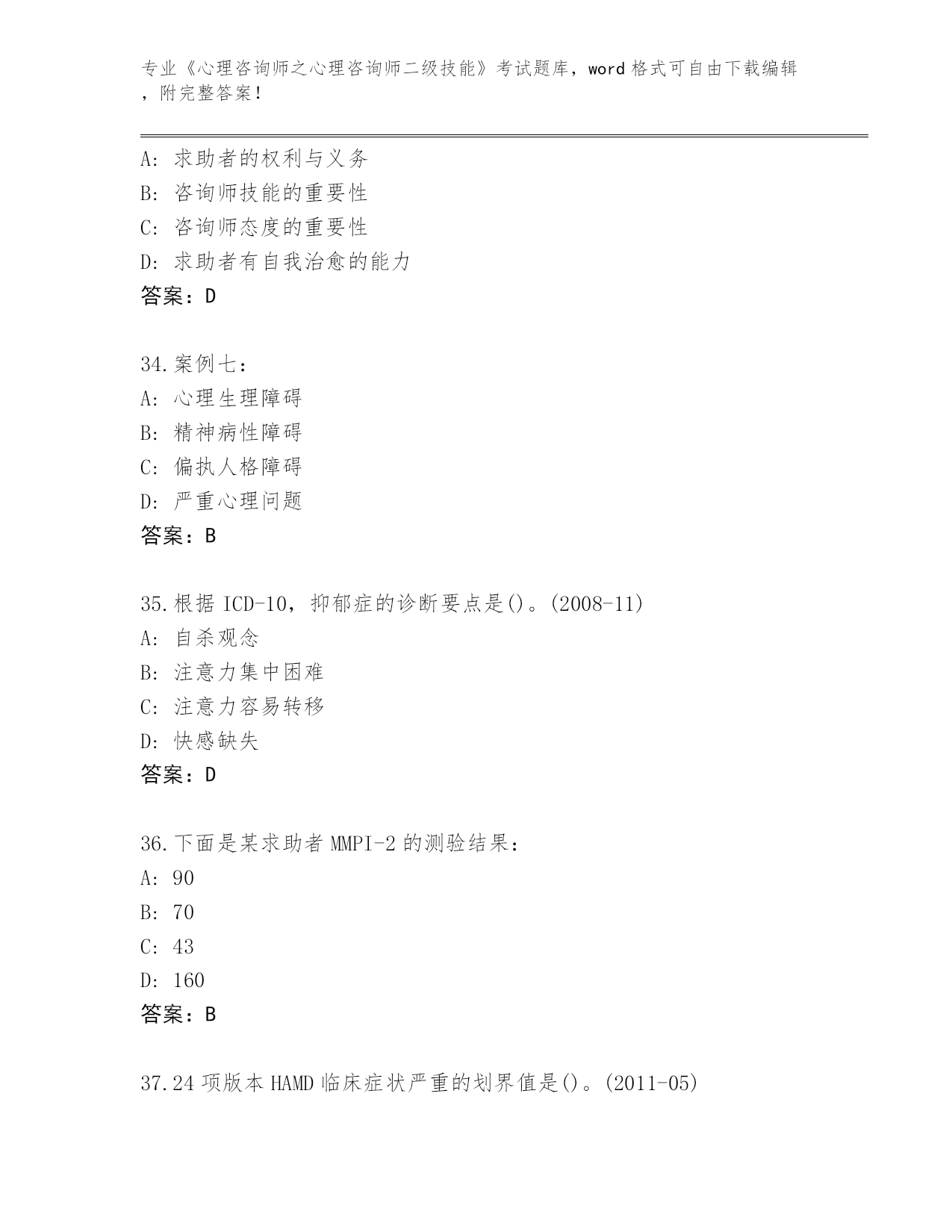 2024四川省《心理咨询师之心理咨询师二级技能》考试【突破训练】