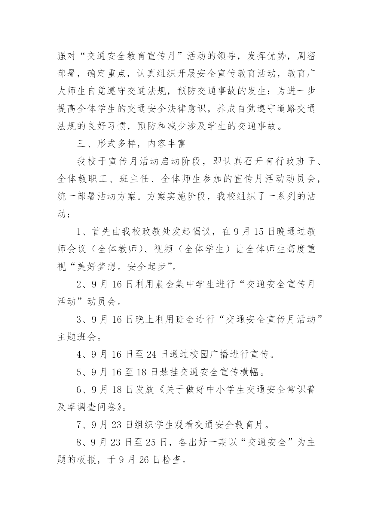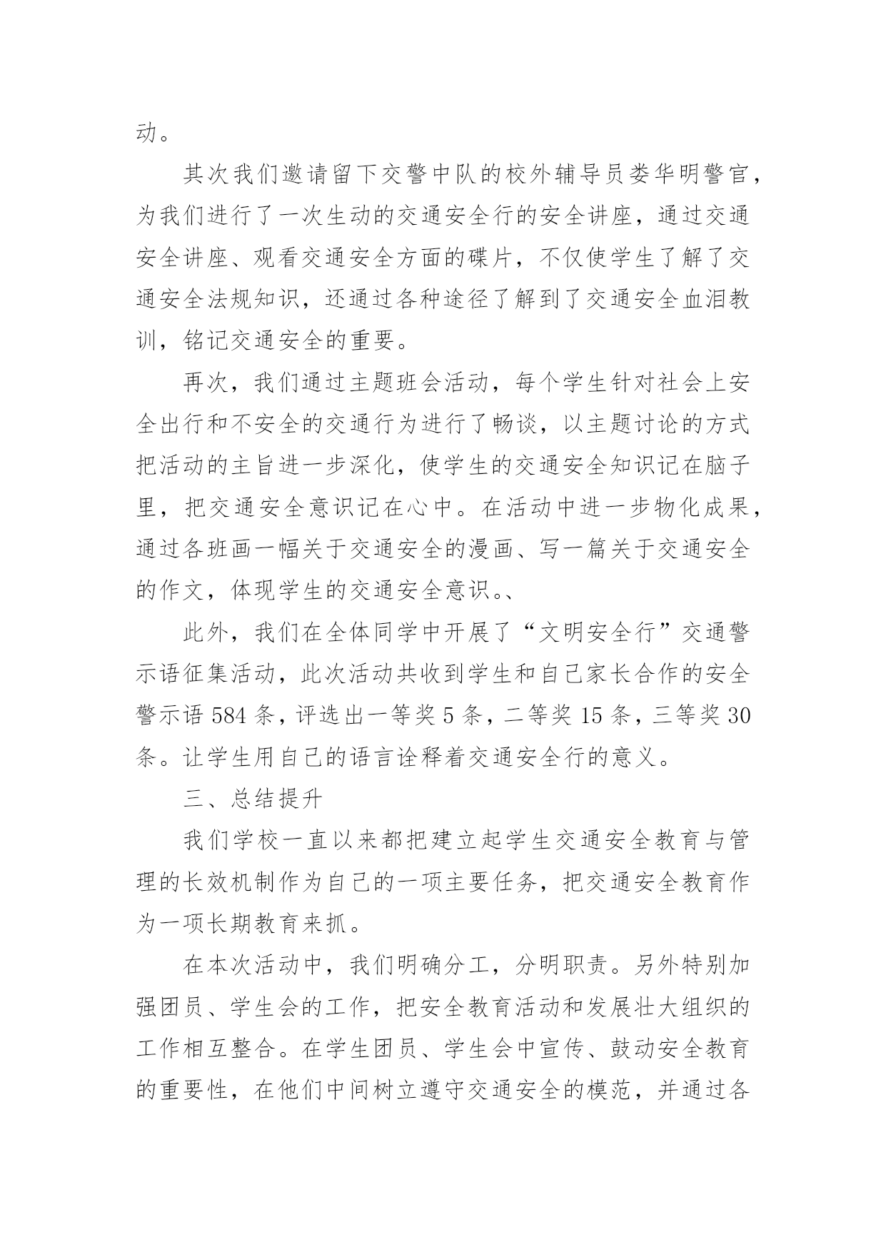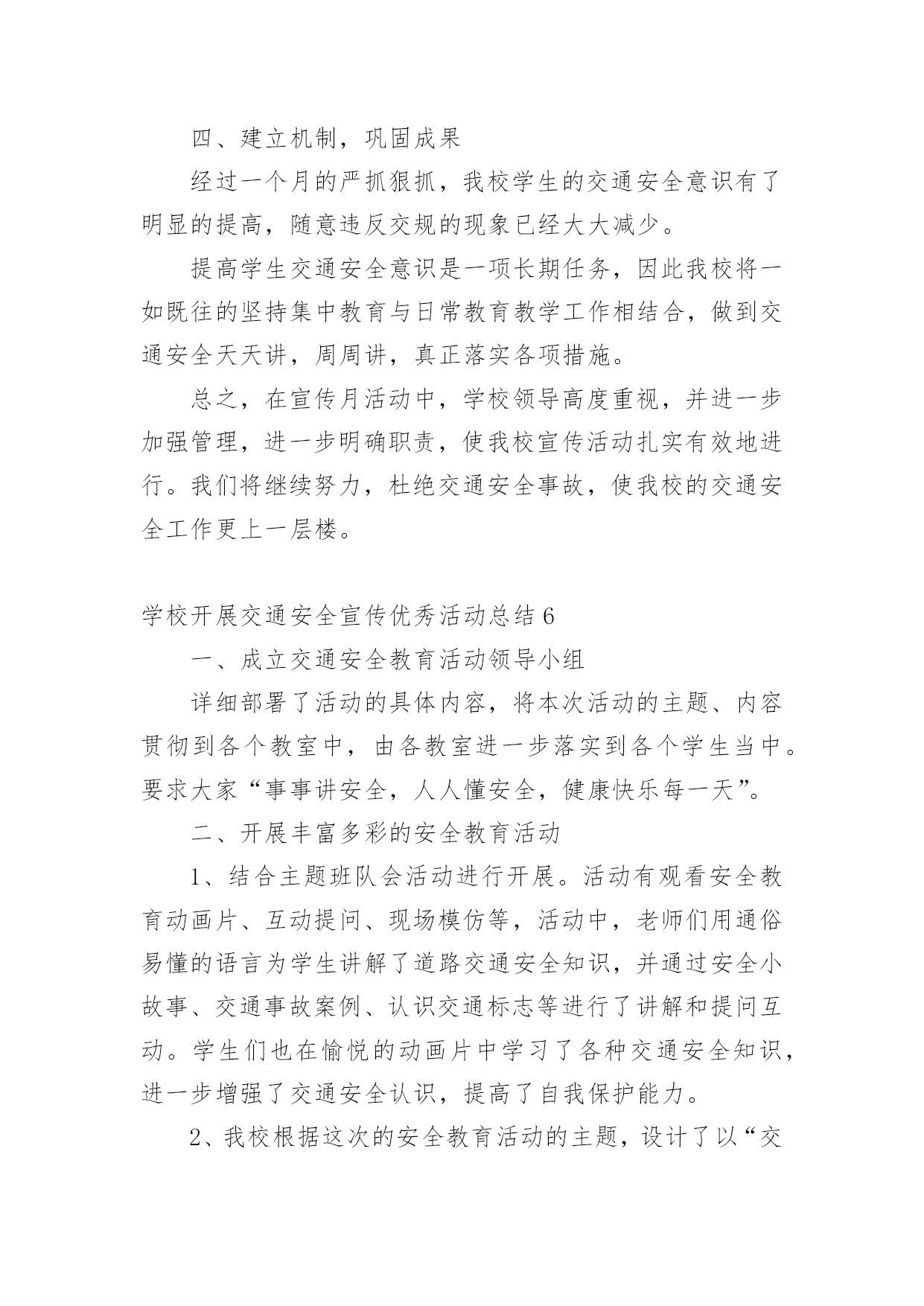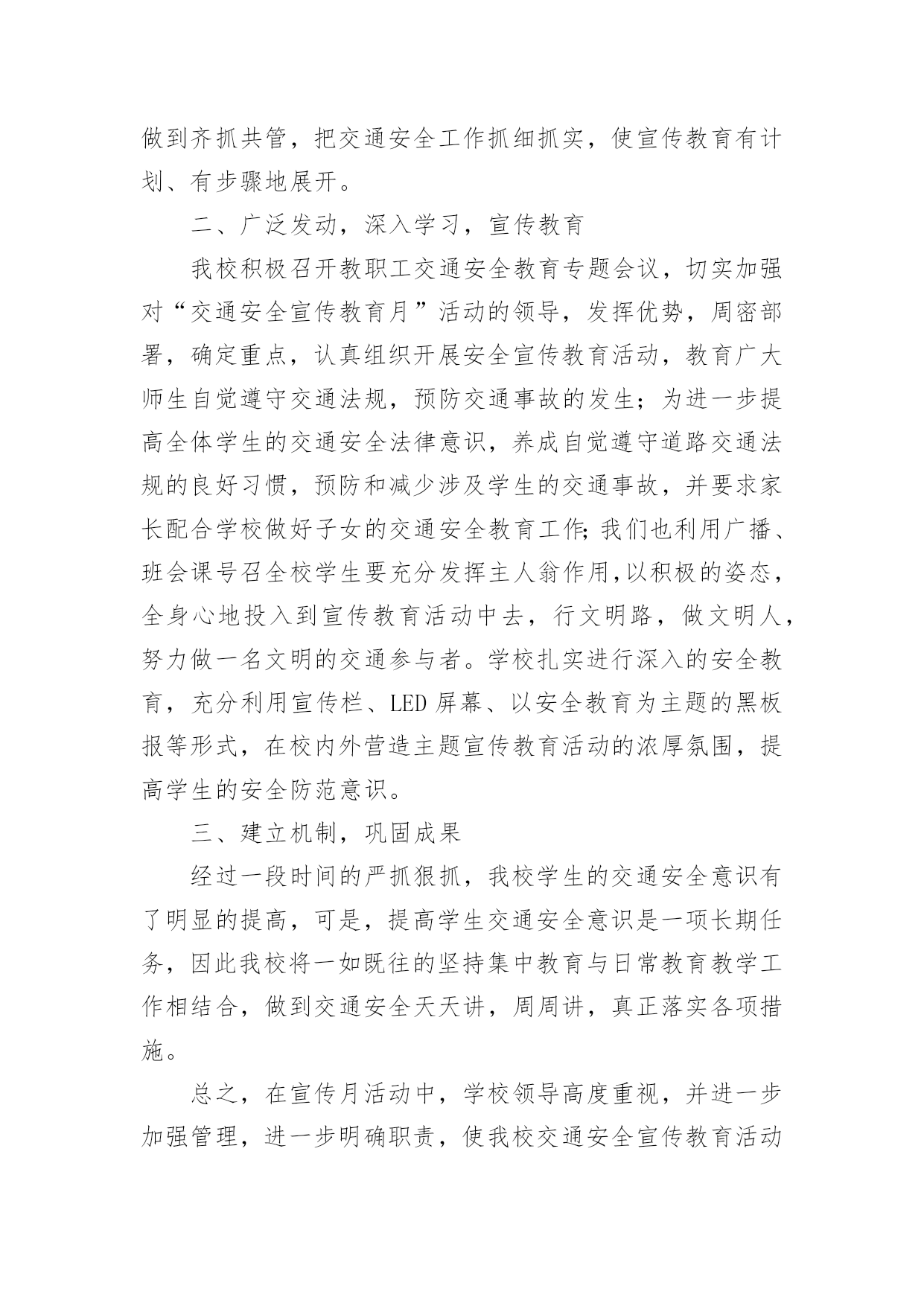 学校开展交通安全宣传优秀活动总结学校开展交通安全宣传优秀活动总结范文(精选12篇)一个精彩的活动已经圆满收官,想必你会开拓了视野,不如让我们总结经验,展望未来。一起来学习活动总结是如何写的吧,下面是小编整理的学校开展交通安全宣传优秀活动总结范文(精选12篇),希望对大家有所帮助。学校开展交通安全宣传优秀活动总结1交通安全教育从小抓起,让幼儿从小懂交通,从小就把安全意识、生存意识放心中。为加强对幼儿的交通安全教育,增强幼儿的交通法律意识,确保幼儿的交通安全,近日,XX幼儿园利用“交通安全教育宣传”活动,请来了交警中队的徐警官为中班组幼儿进行了一次生动而有意义的交通安全教育活动,起到了良好的效果。活动前,各班老师首先通过多媒体播放图片、短片、漫画、游戏等不同形式教孩子们认识交通标志、红绿灯、交通信号、斑马线等知识。引导孩子们感知日常生活中行走、过马路、乘车时如何注意安全。活动中,徐警官教孩子们学习交通指挥手势信号,带孩子们认识交通标志图、亲自指挥孩子们玩交通游戏,孩子们积极性很高,有的学做交警指挥,有的说说我认识的交通标志等,通过做做、学学、玩玩、用情景表演的方式进一步加强幼儿的安全意识,提高了幼儿自我保护的能力,初步养成了自觉遵守交通规则的意识。同时,全园以年级组为单位,开展了形式不同的交通安全教育活动。活动中将一些生硬的交通规则,通过孩子们喜闻乐见的形式融入其中,帮助孩子们切实地了解一些基本的交通安全注意事项,增强了幼儿的交通安全的意识。大班幼儿走出校园,来到社区宣传“关爱生命安全,遵守交通规则”的活动。小班幼儿模拟生活中有关交通安全的场景,在学学玩玩中知道了交通安全的重要性,还请来了交警中队的警官给家长做讲座等。此次宣传活动,使孩子和家长更好的掌握了交通安全常识,增强了自我保护意识,进一步强化交通文明意识,共同营造文明礼让、和谐顺畅的交通环境。学校开展交通安全宣传优秀活动总结2随着经济的日益发展,我们大地球母亲已变得越来越美丽,马路上车辆川流不息的景象随处可见。然而由于有些人交通安全意识的淡薄,在车水马龙的马路上演了一幕幕不可挽回的悲剧。目前全国各地屡屡发生的学生安全事故,让我们痛定思痛,倍感对广大同学进行安全教育的必要性和紧迫性。为了增强学生的交通安全观念,提高学生的交通安全意识,培养学生良好文明的交通行为习惯,根据我校的实际情况,学校决定从交通安全常识方面对同学们进行较为系统的安全教育,让全体同学都树立起安全防范意识。小学特组织各班开展了交通安全教育主题班会活动。班会从学生行走安全、骑车安全、乘车安全等方面对学生进行交通安全教育。老师先组织学生共同观看了中小学生交通安全知识教育宣传片,以直观的手段,让学生懂得了过马路时一定要走人行横道线、要遵守交通信号灯、行人靠右走、千万不能在马路上玩耍……大家都看得非常认真,听得非常仔细。接下来让同学们上台讲述自己搜集到的关于安全事故的一些资料,通过这一件件血的教训,给大家再次敲醒了生命安全的警钟。最后是进行关于交通安全的抢答题比赛,在抢答比赛中,通过同学们的积极思考,强化了同学们的安全意识。主题班会课上,一个个活生生的例子、一桩桩的真实事例和大批图片的展示,使每个学生都感受到交通安全的重要性。这次班会课主题突出,思想教育深入,环节安排丰富且有针对性,学生积极参与、踊跃表现,加深了学生的安全意识,教育效果良好。学生不仅领悟到了道路交通安全教育的重要意义,也懂得了如何预防交通事故的发生,远离危险,健康成长。学校开展交通安全宣传优秀活动总结3一、加强领导,周密部署,精心组织针对交通安全宣传教育周活动的指导思想、工作目标、工作要求等,我校首先研究制定了交通安全教育宣传月活动方案,组建了一个坚强有力的工作领导小组,成员职责明确,做到齐抓共管,把交通安全工作抓细抓实,使宣传教育有计划、有步骤地展开。二、广泛发动,深入学习,宣传教育我校积极召开教职工交通安全教育专题会议,切实加强对“交通安全宣传教育月”活动的领导,发挥优势,周密部署,确定重点,认真组织开展安全宣传教育活动,教育广大师生自觉遵守交通法规,预防交通事故的发生;为进一步提高全体学生的交通安全法律意识,养成自觉遵守道路交通法规的良好习惯,预防和减少涉及学生的交通事故,并要求家长配合学校做好子女的交通安全教育工作;我们也利用广播、班会课号召全校学生要充分发挥主人翁作用,以积极的姿态,全身心地投入到宣传教育活动中去,行文明路,做文明人,努力做一名文明的交通参与者。学校扎实进行深入的安全教育,充分利用宣传栏、LED屏幕、以安全教育为主题的黑板报等形式,在校内外营造主题宣传教育活动的浓厚氛围,提高学生的安全防范意识。三、建立机制,巩固成果经过一段时间的严抓狠抓,我校学生的交通安全意识有了明显的提高,可是,提高学生交通安全意识是一项长期任务,因