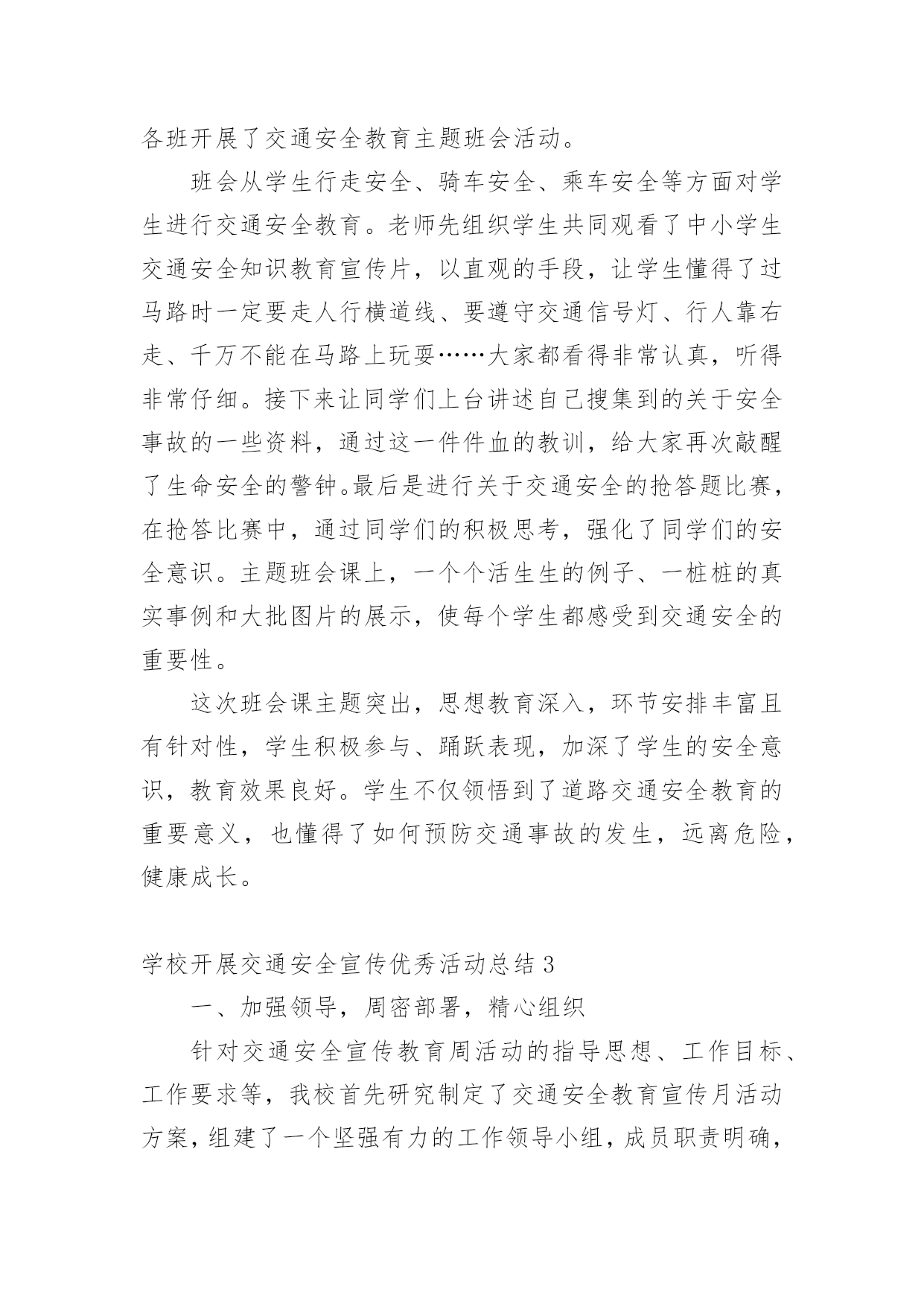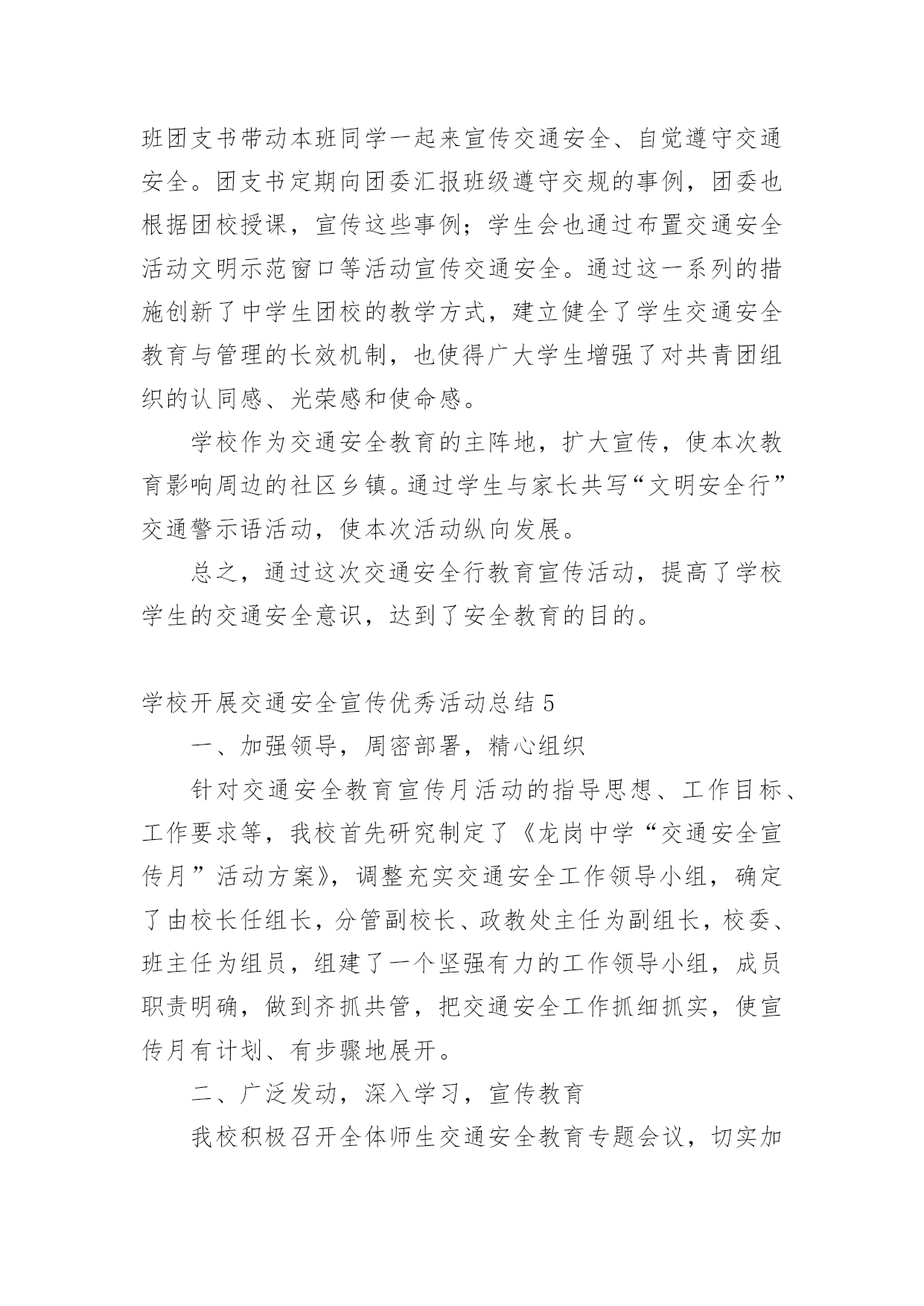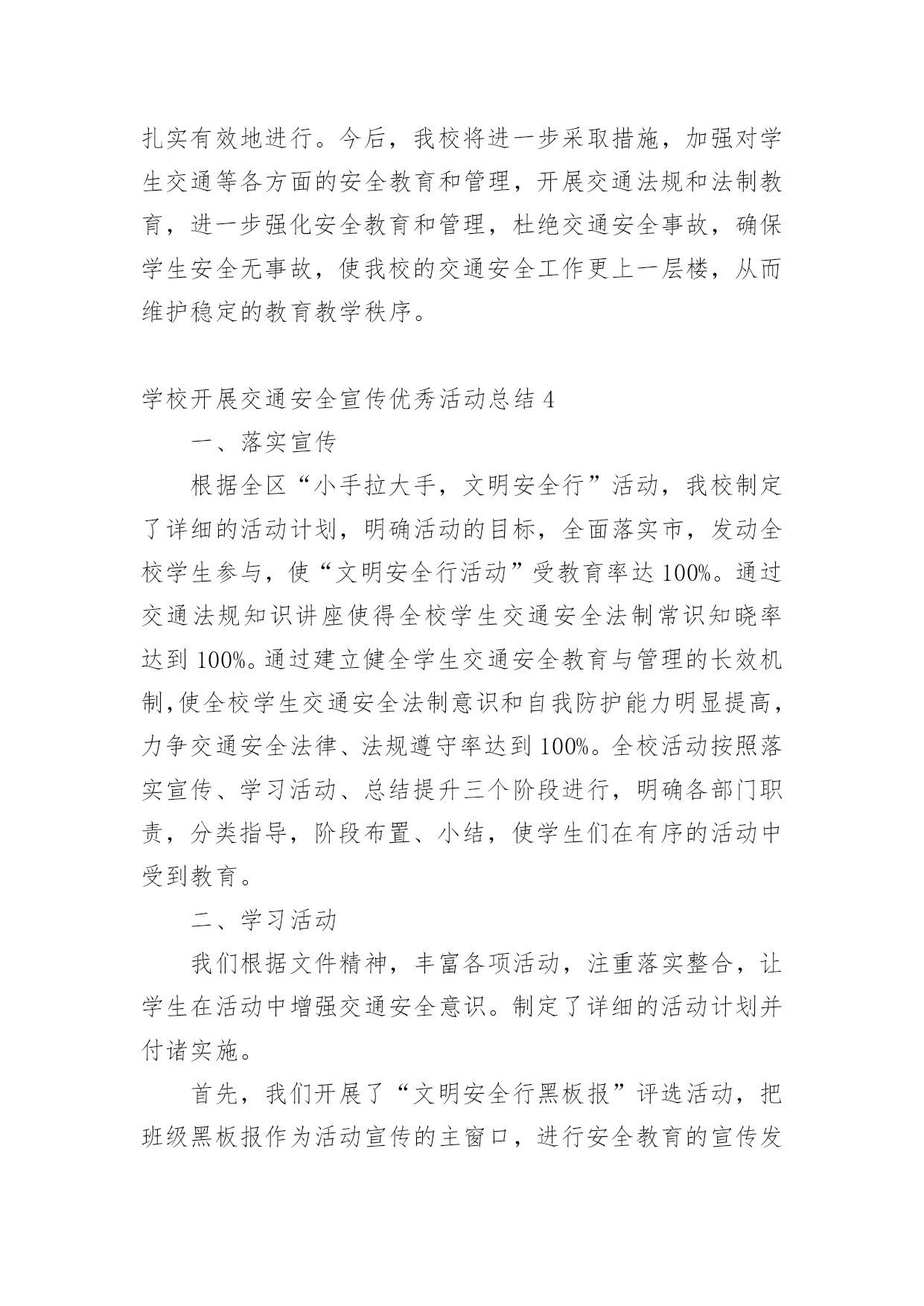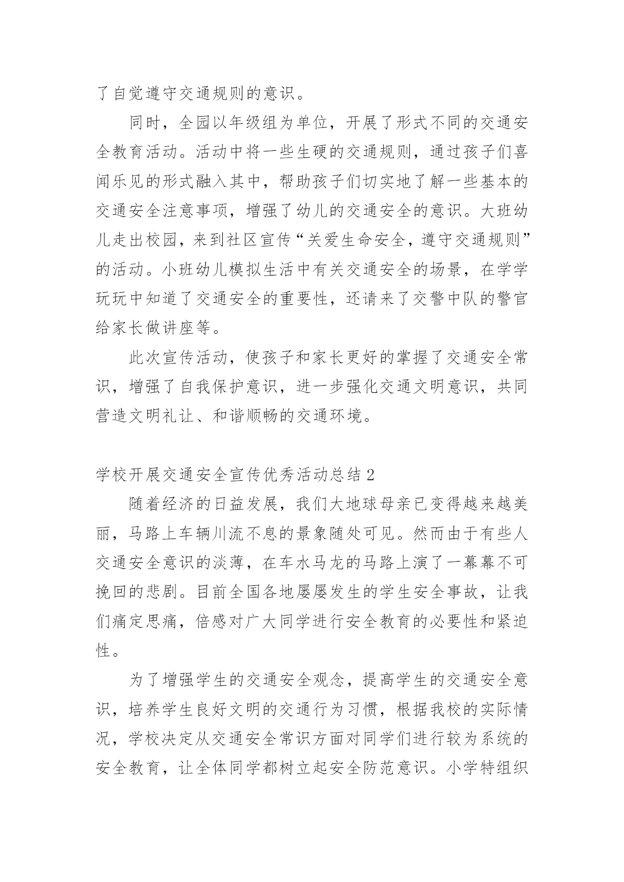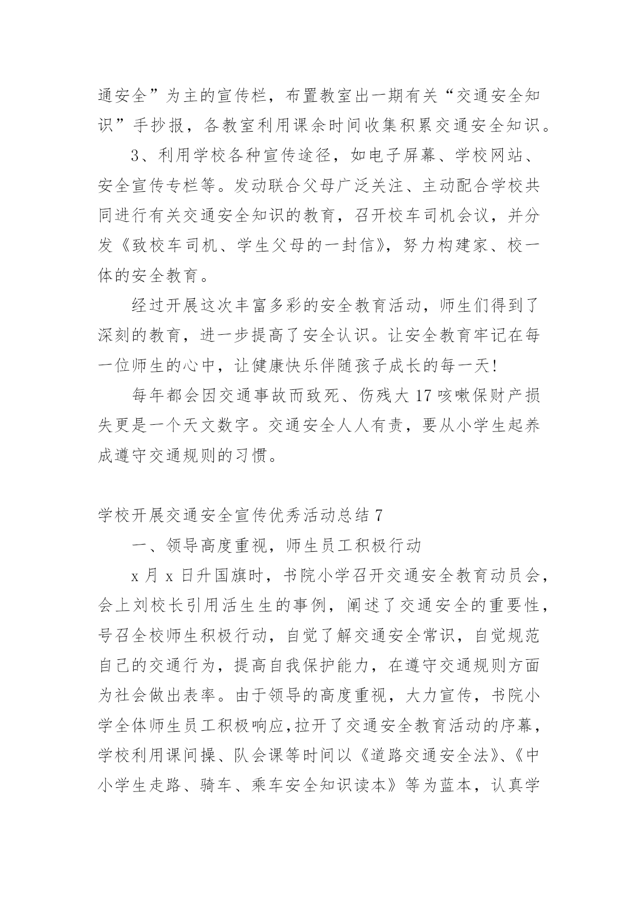 学校开展交通安全宣传优秀活动总结学校开展交通安全宣传优秀活动总结范文(精选12篇)一个精彩的活动已经圆满收官,想必你会开拓了视野,不如让我们总结经验,展望未来。一起来学习活动总结是如何写的吧,下面是小编整理的学校开展交通安全宣传优秀活动总结范文(精选12篇),希望对大家有所帮助。学校开展交通安全宣传优秀活动总结1交通安全教育从小抓起,让幼儿从小懂交通,从小就把安全意识、生存意识放心中。为加强对幼儿的交通安全教育,增强幼儿的交通法律意识,确保幼儿的交通安全,近日,XX幼儿园利用“交通安全教育宣传”活动,请来了交警中队的徐警官为中班组幼儿进行了一次生动而有意义的交通安全教育活动,起到了良好的效果。活动前,各班老师首先通过多媒体播放图片、短片、漫画、游戏等不同形式教孩子们认识交通标志、红绿灯、交通信号、斑马线等知识。引导孩子们感知日常生活中行走、过马路、乘车时如何注意安全。活动中,徐警官教孩子们学习交通指挥手势信号,带孩子们认识交通标志图、亲自指挥孩子们玩交通游戏,孩子们积极性很高,有的学做交警指挥,有的说说我认识的交通标志等,通过做做、学学、玩玩、用情景表演的方式进一步加强幼儿的安全意识,提高了幼儿自我保护的能力,初步养成了自觉遵守交通规则的意识。同时,全园以年级组为单位,开展了形式不同的交通安全教育活动。活动中将一些生硬的交通规则,通过孩子们喜闻乐见的形式融入其中,帮助孩子们切实地了解一些基本的交通安全注意事项,增强了幼儿的交通安全的意识。大班幼儿走出校园,来到社区宣传“关爱生命安全,遵守交通规则”的活动。小班幼儿模拟生活中有关交通安全的场景,在学学玩玩中知道了交通安全的重要性,还请来了交警中队的警官给家长做讲座等。此次宣传活动,使孩子和家长更好的掌握了交通安全常识,增强了自我保护意识,进一步强化交通文明意识,共同营造文明礼让、和谐顺畅的交通环境。学校开展交通安全宣传优秀活动总结2随着经济的日益发展,我们大地球母亲已变得越来越美丽,马路上车辆川流不息的景象随处可见。然而由于有些人交通安全意识的淡薄,在车水马龙的马路上演了一幕幕不可挽回的悲剧。目前全国各地屡屡发生的学生安全事故,让我们痛定思痛,倍感对广大同学进行安全教育的必要性和紧迫性。为了增强学生的交通安全观念,提高学生的交通安全意识,培养学生良好文明的交通行为习惯,根据我校的实际情况,学校决定从交通安全常识方面对同学们进行较为系统的安全教育,让全体同学都树立起安全防范意识。小学特组织各班开展了交通安全教育主题班会活动。班会从学生行走安全、骑车安全、乘车安全等方面对学生进行交通安全教育。老师先组织学生共同观看了中小学生交通安全知识教育宣传片,以直观的手段,让学生懂得了过马路时一定要走人行横道线、要遵守交通信号灯、行人靠右走、千万不能在马路上玩耍……大家都看得非常认真,听得非常仔细。接下来让同学们上台讲述自己搜集到的关于安全事故的一些资料,通过这一件件血的教训,给大家再次敲醒了生命安全的警钟。最后是进行关于交通安全的抢答题比赛,在抢答比赛中,通过同学们的积极思考,强化了同学们的安全意识。主题班会课上,一个个活生生的例子、一桩桩的真实事例和大批图片的展示,使每个学生都感受到交通安全的重要性。这次班会课主题突出,思想教育深入,环节安排丰富且有针对性,学生积极参与、踊跃表现,加深了学生的安全意识,教育效果良好。学生不仅领悟到了道路交通安全教育的重要意义,也懂得了如何预防交通事故的发生,远离危险,健康成长。学校开展交通安全宣传优秀活动总结3一、加强领导,周密部署,精心组织针对交通安全宣传教育周活动的指导思想、工作目标、工作要求等,我校首先研究制定了交通安全教育宣传月活动方案,组建了一个坚强有力的工作领导小组,成员职责明确,做到齐抓共管,把交通安全工作抓细抓实,使宣传教育有计划、有步骤地展开。二、广泛发动,深入学习,宣传教育我校积极召开教职工交通安全教育专题会议,切实加强对“交通安全宣传教育月”活动的领导,发挥优势,周密部署,确定重点,认真组织开展安全宣传教育活动,教育广大师生自觉遵守交通法规,预防交通事故的发生;为进一步提高全体学生的交通安全法律意识,养成自觉遵守道路交通法规的良好习惯,预防和减少涉及学生的交通事故,并要求家长配合学校做好子女的交通安全教育工作;我们也利用广播、班会课号召全校学生要充分发挥主人翁作用,以积极的姿态,全身心地投入到宣传教育活动中去,行文明路,做文明人,努力做一名文明的交通参与者。学校扎实进行深入的安全教育,充分利用宣传栏、LED屏幕、以安全教育为主题的黑板报等形式,在校内外营造主题宣传教育活动的浓厚氛围,提高学生的安全防范意识。三、建立机制,巩固成果经过一段时间的严抓狠抓,我校学生的交通安全意识有了明显的提高,可是,提高学生交通安全意识是一项长期任务,因