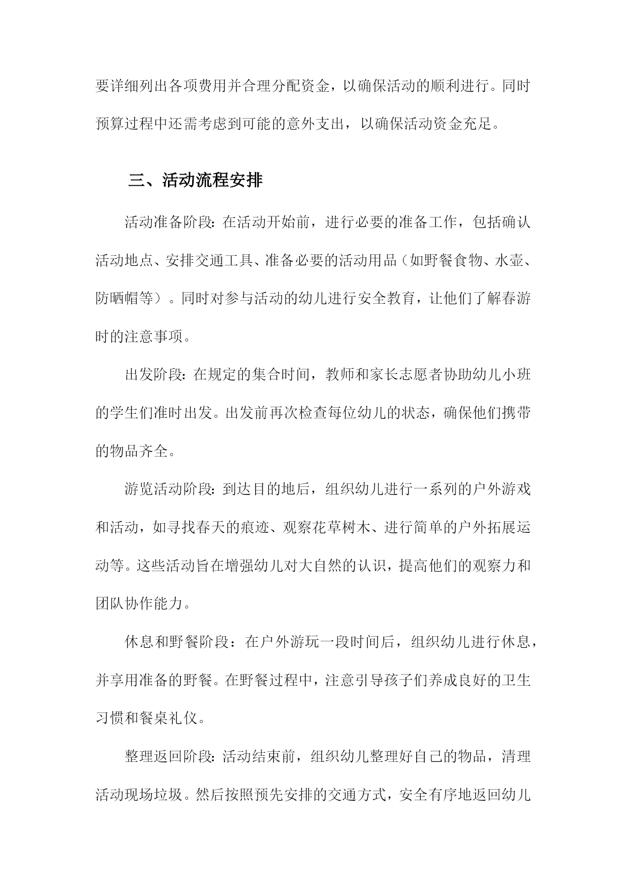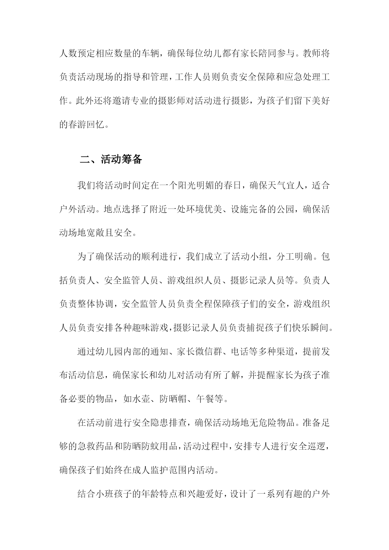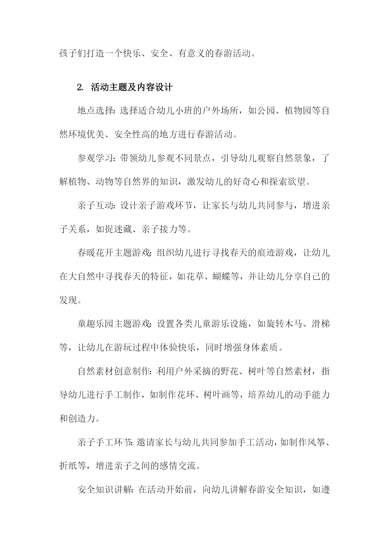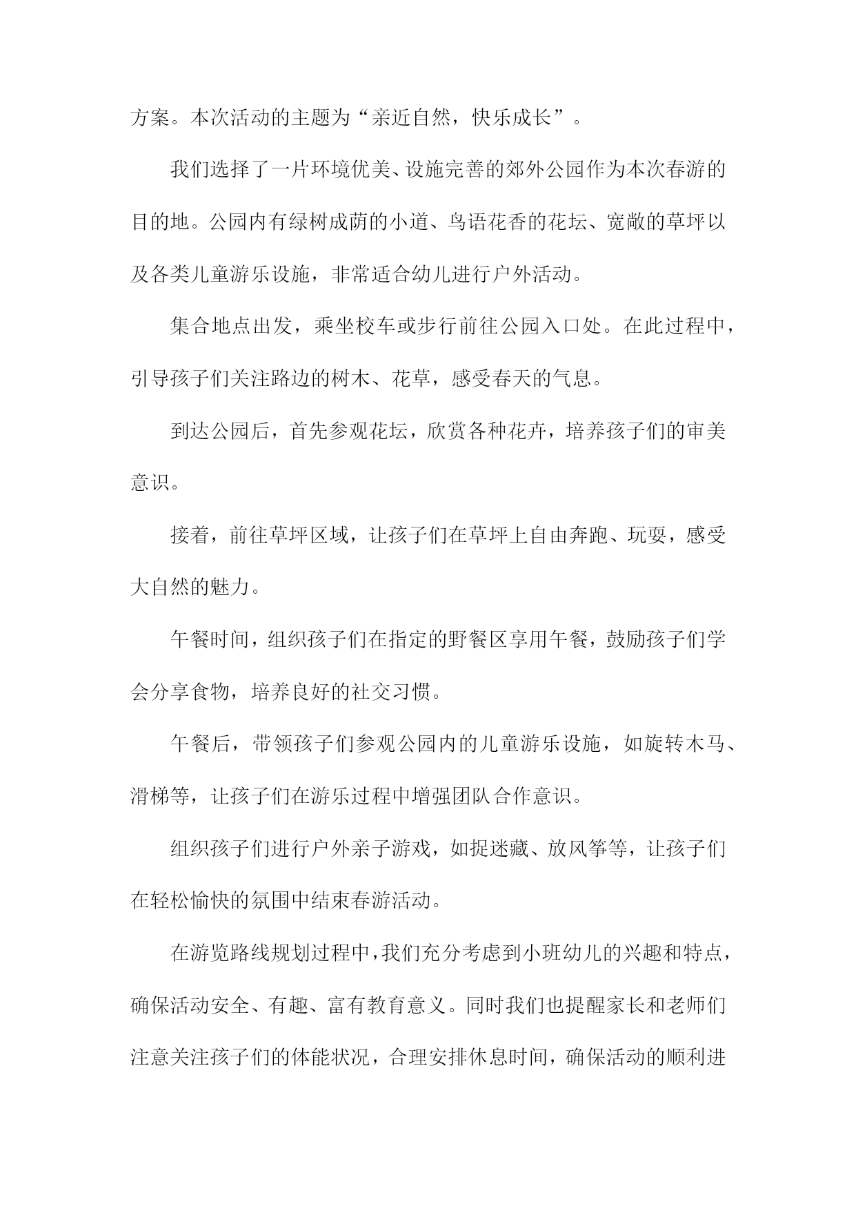 幼儿小班春游活动方案一、内容描述本次幼儿小班春游活动旨在通过户外活动的形式,让孩子们接触大自然,感受春天的美好,增强幼儿对自然环境的兴趣和热爱。活动将围绕“春游赏花,亲近自然”的主题展开。赏花活动:带领孩子们到公园或花园,欣赏各种盛开的花卉,让他们接触自然,感受春天的气息。同时向孩子们介绍不同花卉的名称、颜色、形状等特点,增加他们对植物的认识。亲子互动游戏:组织亲子游戏环节,如捉迷藏、接力比赛等,让家长和孩子们共同参与,增进亲子关系,培养孩子们的团队协作精神和竞争意识。自然探索:引导孩子们进行简单的自然探索活动,如观察昆虫、捡拾落叶、寻找鸟窝等,让他们了解自然环境的奥秘,激发他们对自然科学的兴趣。野餐分享:在户外野餐区准备美味的食物,让孩子们在户外环境下享用午餐,体验集体野餐的乐趣,同时培养他们的分享精神和集体荣誉感。1.活动目的和意义本次幼儿小班春游活动旨在通过户外活动,增强幼儿对自然环境的感知和适应能力,激发幼儿的探索兴趣,丰富幼儿的视野和生活经验。同时通过集体活动,加强幼儿之间的交流和合作能力,培养幼儿的集体荣誉感和团队精神。此外借助春游活动,提升幼儿的身体素质,锻炼幼儿的体能和耐力,为幼儿的全面发展打下坚实的基础。此次春游活动对小班幼儿的发展具有深远的意义,首先通过与大自然的亲近,使幼儿能够更好地了解自然环境,认识季节变化,从而培养幼儿的观察力、感知能力和审美能力。其次通过户外实践活动,增强幼儿的社会交往能力,促进幼儿之间的友谊和合作关系的建立。再者此次活动也是落实幼儿全面发展教育的重要途径之一,通过身体锻炼、知识学习、情感交流等多方面的活动,促进幼儿身心健康发展。同时通过集体春游活动,增强家园共育的效果,加深家长对幼儿园教育工作的理解和支持。2.活动时间、地点及参与人员本次幼儿小班春游活动定于XXXX年XX月XX日(周X)上午XX点至XX点,全程活动时间为两小时。活动地点选在本市著名的XX公园,这里环境优美,空气清新适合幼儿进行户外活动。参与人员主要包括幼儿园全体小班学生及其家长,以及幼儿园的教师和工作人员。其中学生及家长是主要参与群体,我们将根据班级人数预定相应数量的车辆,确保每位幼儿都有家长陪同参与。教师将负责活动现场的指导和管理,工作人员则负责安全保障和应急处理工作。此外还将邀请专业的摄影师对活动进行摄影,为孩子们留下美好的春游回忆。二、活动筹备我们将活动时间定在一个阳光明媚的春日,确保天气宜人,适合户外活动。地点选择了附近一处环境优美、设施完备的公园,确保活动场地宽敞且安全。为了确保活动的顺利进行,我们成立了活动小组,分工明确。包括负责人、安全监管人员、游戏组织人员、摄影记录人员等。负责人负责整体协调,安全监管人员负责全程保障孩子们的安全,游戏组织人员负责安排各种趣味游戏,摄影记录人员负责捕捉孩子们快乐瞬间。通过幼儿园内部的通知、家长微信群、电话等多种渠道,提前发布活动信息,确保家长和幼儿对活动有所了解,并提醒家长为孩子准备必要的物品,如水壶、防晒帽、午餐等。在活动前进行安全隐患排查,确保活动场地无危险物品。准备足够的急救药品和防晒防蚊用品,活动过程中,安排专人进行安全巡逻,确保孩子们始终在成人监护范围内活动。结合小班孩子的年龄特点和兴趣爱好,设计了一系列有趣的户外活动,如踏青赏花、亲子互动游戏、绘画比赛等,旨在让孩子们在玩乐中学习,学习中成长。准备足够的水、零食、纸巾等必需品。同时为了活动的顺利进行,还准备了音响设备、游戏道具、画纸颜料等物品。1.活动策划团队组建在幼儿小班春游活动的策划阶段,首要任务是组建一支专业且富有经验的活动策划团队。团队成员包括园长、教师、家长代表以及相关的后勤工作人员。团队成员应具备丰富的幼儿教育经验,熟悉幼儿身心特点,并能针对小年龄段的孩子制定出符合其身心发展规律的活动方案。团队组建初期,需对每位成员进行明确的任务分配与责任落实。例如园长负责制定活动目标和整体策划方案,确保活动的顺利进行;教师则需负责具体的活动设计,确保幼儿的安全与参与体验;家长代表则负责沟通家校之间的信息,为活动的筹备提供必要的支持与协助;后勤工作人员则需负责场地布置、物资准备等后勤保障工作。此外活动策划团队还需进行充分的前期沟通与研讨,确保活动的主题鲜明、目标明确、流程合理。同时团队还需制定详细的活动预算,确保活动经费的合理使用。在活动筹备过程中,团队成员应密切合作,及时调整策略,确保活动的顺利进行。通过团队合作与共同努力,为孩子们打造一个快乐、安全、有意义的春游活动。2.活动主题及内容设计地点选择:选择适合幼儿小班的户外场所,如公园、植物园等自然环境优美、安全性高的地方进行春游活动。参观学习:带领幼儿参观不同景点,引导幼儿观察自然景象,了解植物、动物等自然