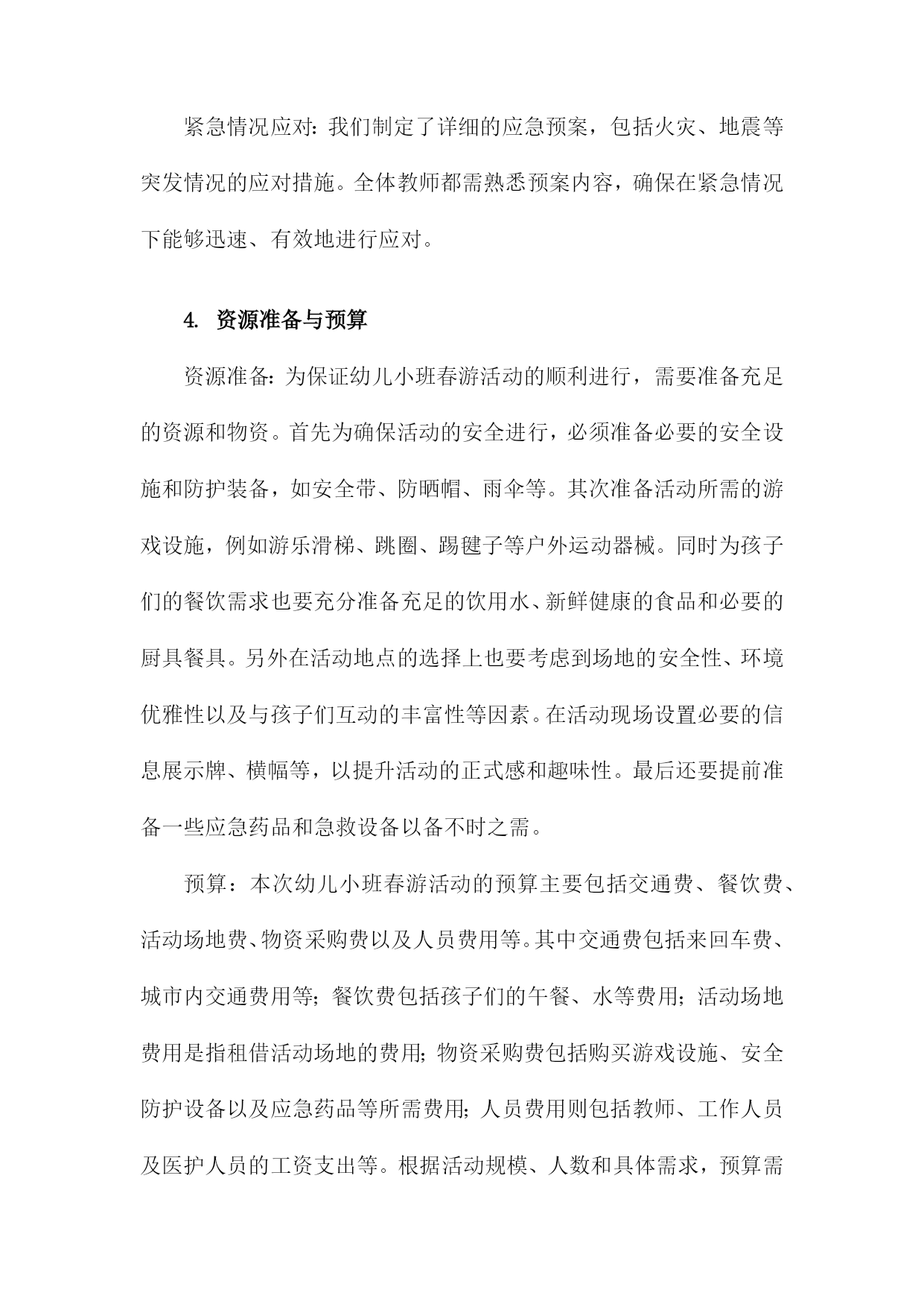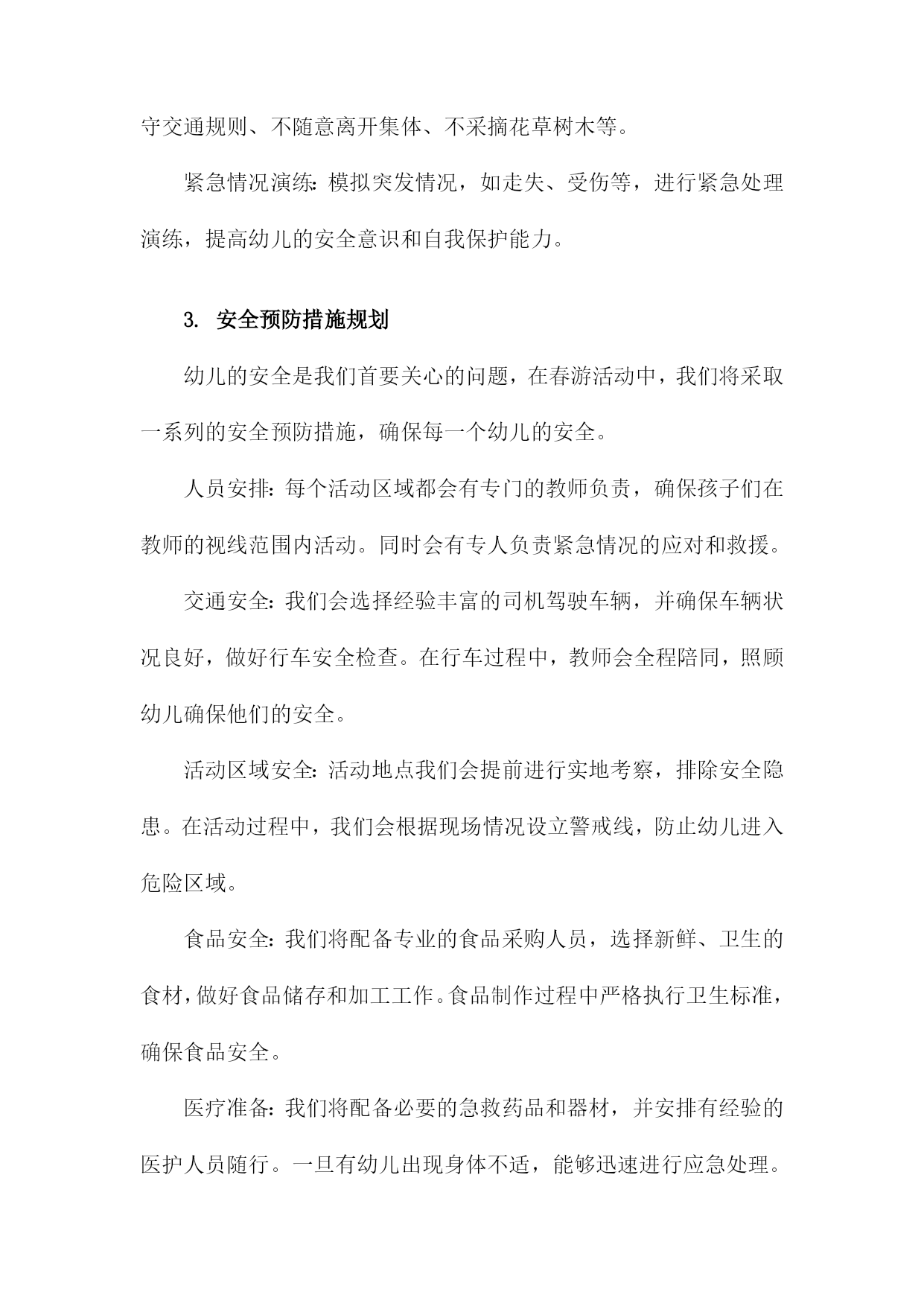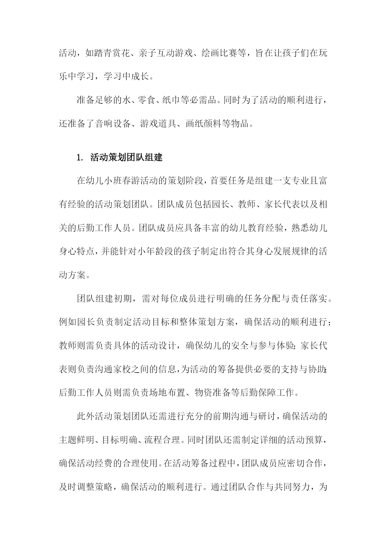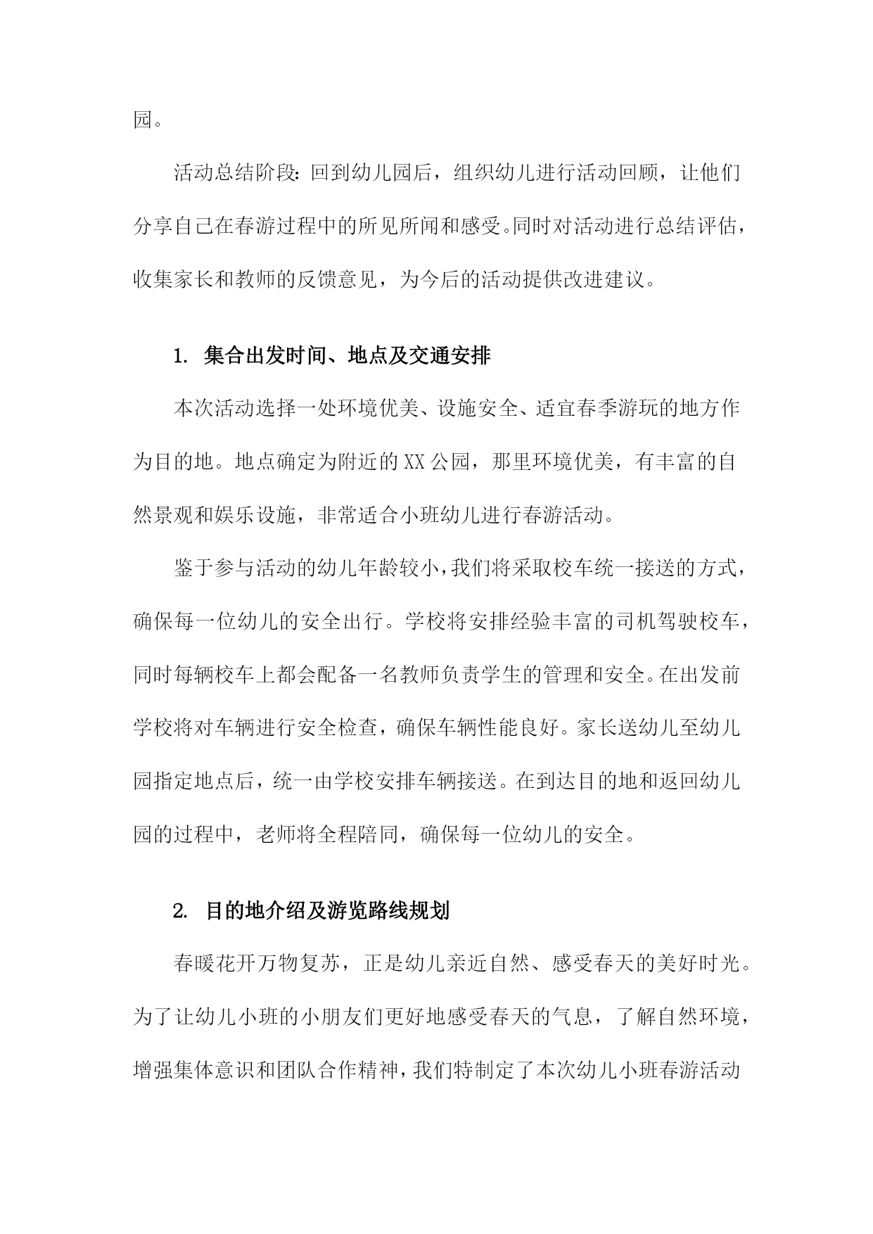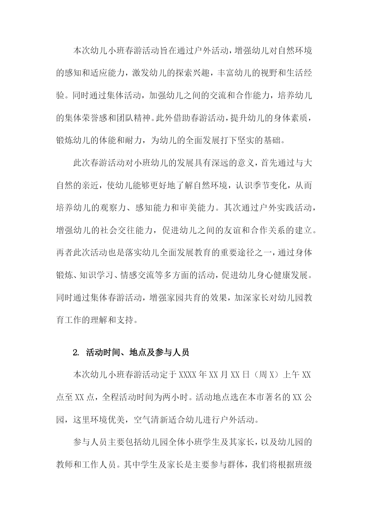 幼儿小班春游活动方案一、内容描述本次幼儿小班春游活动旨在通过户外活动的形式,让孩子们接触大自然,感受春天的美好,增强幼儿对自然环境的兴趣和热爱。活动将围绕“春游赏花,亲近自然”的主题展开。赏花活动:带领孩子们到公园或花园,欣赏各种盛开的花卉,让他们接触自然,感受春天的气息。同时向孩子们介绍不同花卉的名称、颜色、形状等特点,增加他们对植物的认识。亲子互动游戏:组织亲子游戏环节,如捉迷藏、接力比赛等,让家长和孩子们共同参与,增进亲子关系,培养孩子们的团队协作精神和竞争意识。自然探索:引导孩子们进行简单的自然探索活动,如观察昆虫、捡拾落叶、寻找鸟窝等,让他们了解自然环境的奥秘,激发他们对自然科学的兴趣。野餐分享:在户外野餐区准备美味的食物,让孩子们在户外环境下享用午餐,体验集体野餐的乐趣,同时培养他们的分享精神和集体荣誉感。1.活动目的和意义本次幼儿小班春游活动旨在通过户外活动,增强幼儿对自然环境的感知和适应能力,激发幼儿的探索兴趣,丰富幼儿的视野和生活经验。同时通过集体活动,加强幼儿之间的交流和合作能力,培养幼儿的集体荣誉感和团队精神。此外借助春游活动,提升幼儿的身体素质,锻炼幼儿的体能和耐力,为幼儿的全面发展打下坚实的基础。此次春游活动对小班幼儿的发展具有深远的意义,首先通过与大自然的亲近,使幼儿能够更好地了解自然环境,认识季节变化,从而培养幼儿的观察力、感知能力和审美能力。其次通过户外实践活动,增强幼儿的社会交往能力,促进幼儿之间的友谊和合作关系的建立。再者此次活动也是落实幼儿全面发展教育的重要途径之一,通过身体锻炼、知识学习、情感交流等多方面的活动,促进幼儿身心健康发展。同时通过集体春游活动,增强家园共育的效果,加深家长对幼儿园教育工作的理解和支持。2.活动时间、地点及参与人员本次幼儿小班春游活动定于XXXX年XX月XX日(周X)上午XX点至XX点,全程活动时间为两小时。活动地点选在本市著名的XX公园,这里环境优美,空气清新适合幼儿进行户外活动。参与人员主要包括幼儿园全体小班学生及其家长,以及幼儿园的教师和工作人员。其中学生及家长是主要参与群体,我们将根据班级人数预定相应数量的车辆,确保每位幼儿都有家长陪同参与。教师将负责活动现场的指导和管理,工作人员则负责安全保障和应急处理工作。此外还将邀请专业的摄影师对活动进行摄影,为孩子们留下美好的春游回忆。二、活动筹备我们将活动时间定在一个阳光明媚的春日,确保天气宜人,适合户外活动。地点选择了附近一处环境优美、设施完备的公园,确保活动场地宽敞且安全。为了确保活动的顺利进行,我们成立了活动小组,分工明确。包括负责人、安全监管人员、游戏组织人员、摄影记录人员等。负责人负责整体协调,安全监管人员负责全程保障孩子们的安全,游戏组织人员负责安排各种趣味游戏,摄影记录人员负责捕捉孩子们快乐瞬间。通过幼儿园内部的通知、家长微信群、电话等多种渠道,提前发布活动信息,确保家长和幼儿对活动有所了解,并提醒家长为孩子准备必要的物品,如水壶、防晒帽、午餐等。在活动前进行安全隐患排查,确保活动场地无危险物品。准备足够的急救药品和防晒防蚊用品,活动过程中,安排专人进行安全巡逻,确保孩子们始终在成人监护范围内活动。结合小班孩子的年龄特点和兴趣爱好,设计了一系列有趣的户外活动,如踏青赏花、亲子互动游戏、绘画比赛等,旨在让孩子们在玩乐中学习,学习中成长。准备足够的水、零食、纸巾等必需品。同时为了活动的顺利进行,还准备了音响设备、游戏道具、画纸颜料等物品。1.活动策划团队组建在幼儿小班春游活动的策划阶段,首要任务是组建一支专业且富有经验的活动策划团队。团队成员包括园长、教师、家长代表以及相关的后勤工作人员。团队成员应具备丰富的幼儿教育经验,熟悉幼儿身心特点,并能针对小年龄段的孩子制定出符合其身心发展规律的活动方案。团队组建初期,需对每位成员进行明确的任务分配与责任落实。例如园长负责制定活动目标和整体策划方案,确保活动的顺利进行;教师则需负责具体的活动设计,确保幼儿的安全与参与体验;家长代表则负责沟通家校之间的信息,为活动的筹备提供必要的支持与协助;后勤工作人员则需负责场地布置、物资准备等后勤保障工作。此外活动策划团队还需进行充分的前期沟通与研讨,确保活动的主题鲜明、目标明确、流程合理。同时团队还需制定详细的活动预算,确保活动经费的合理使用。在活动筹备过程中,团队成员应密切合作,及时调整策略,确保活动的顺利进行。通过团队合作与共同努力,为孩子们打造一个快乐、安全、有意义的春游活动。2.活动主题及内容设计地点选择:选择适合幼儿小班的户外场所,如公园、植物园等自然环境优美、安全性高的地方进行春游活动。参观学习:带领幼儿参观不同景点,引导幼儿观察自然景象,了解植物、动物等自然