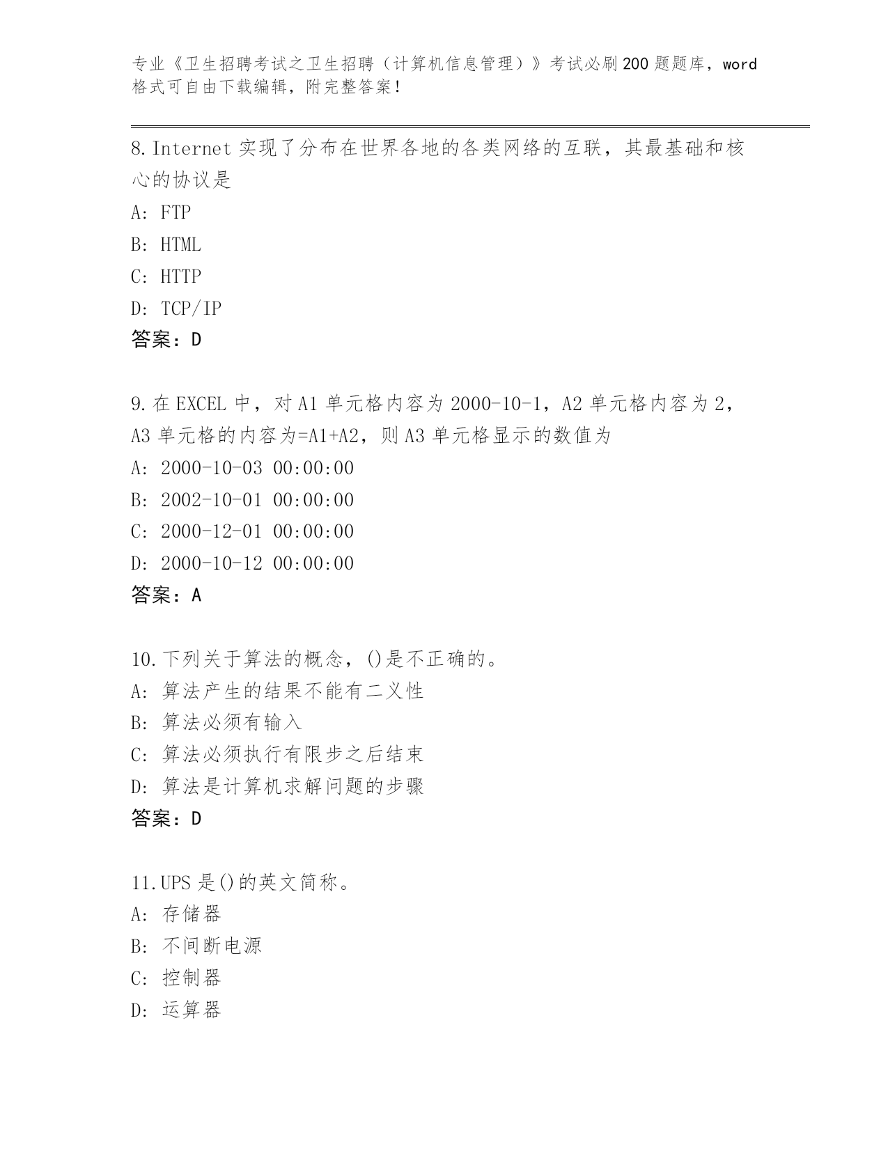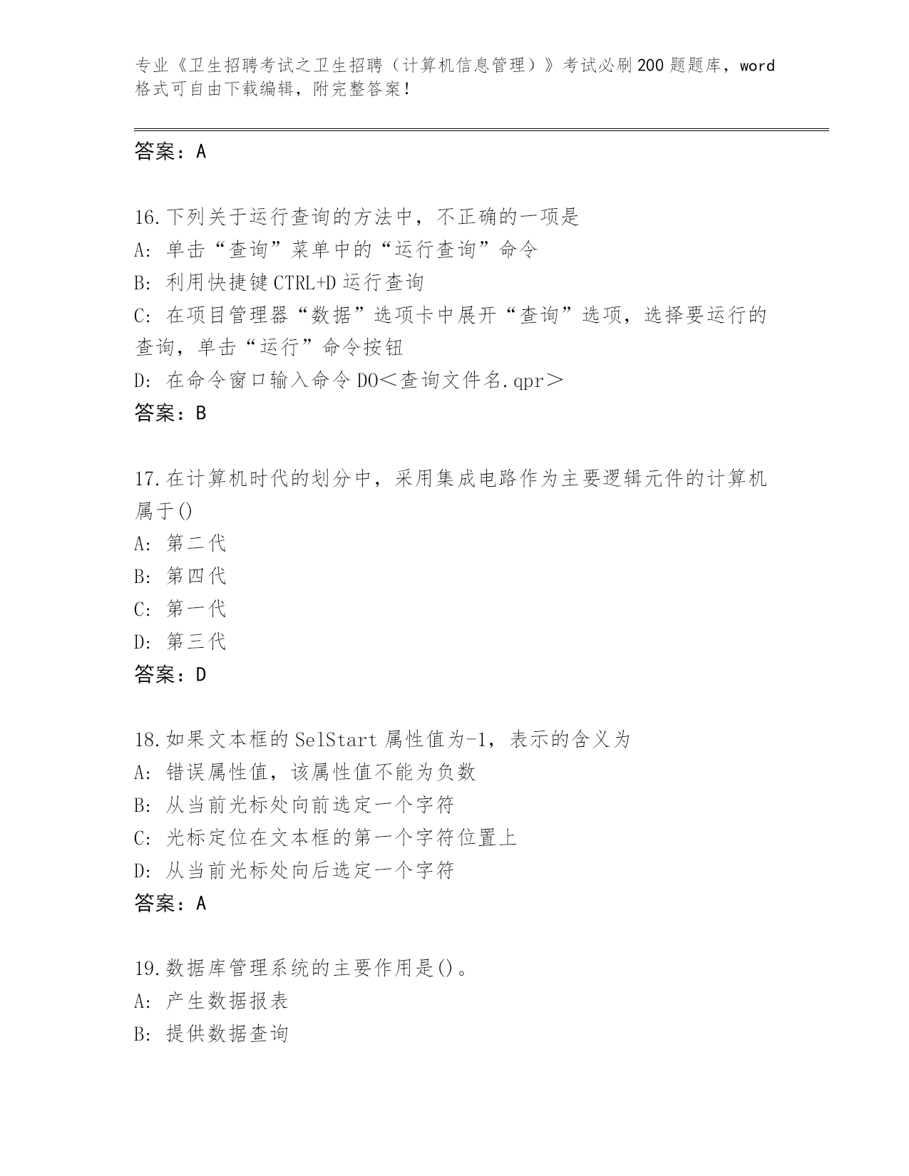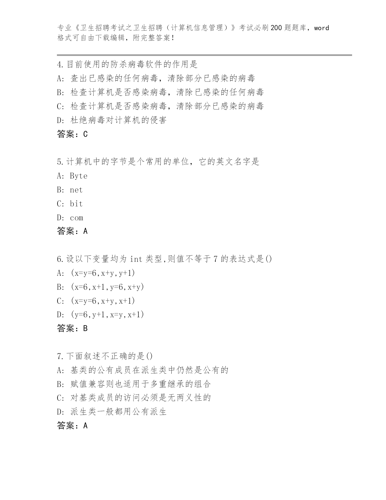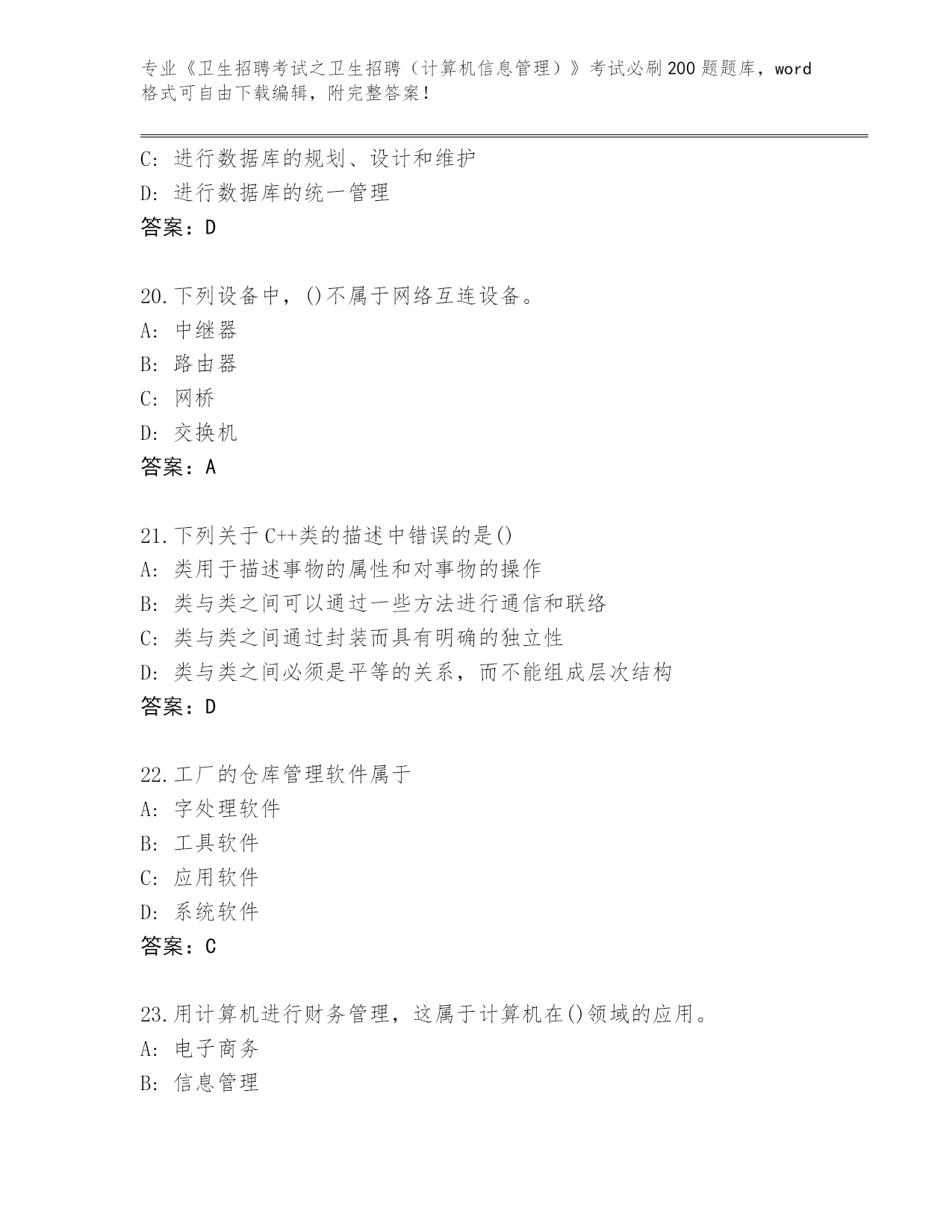 内部使用河南省温县《卫生招聘考试之卫生招聘(计算机信息管理)》资格考试必刷200题题库【培优A卷】