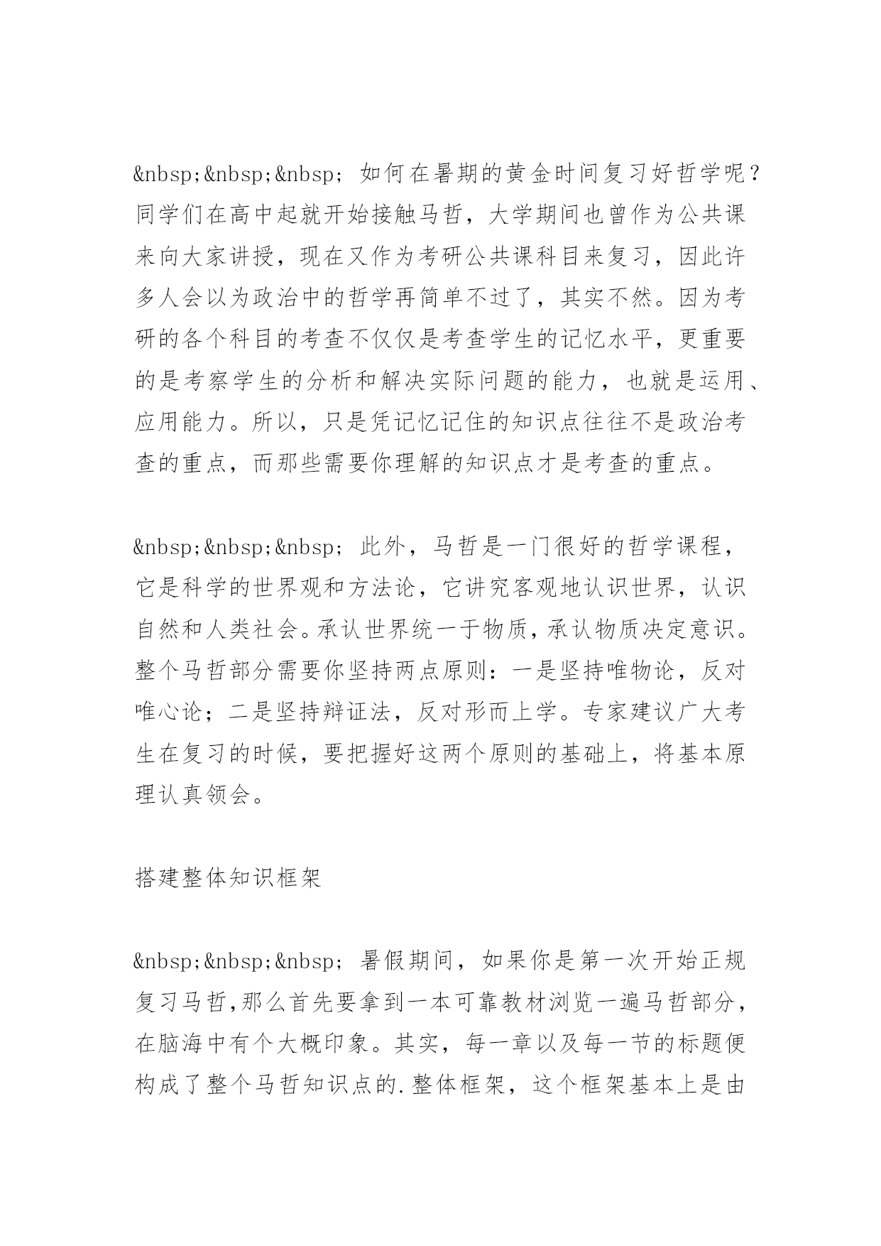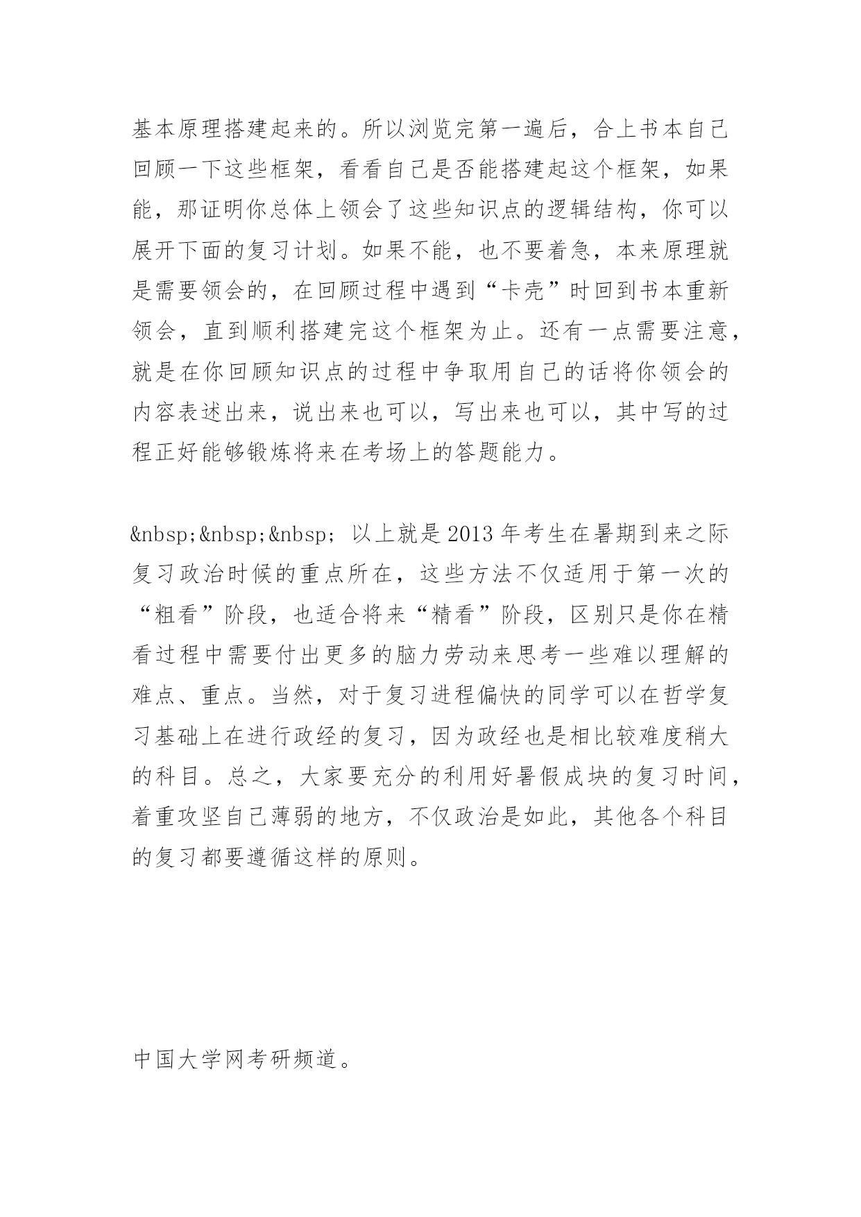 考研暑期政治复习指导哲学是关键考研暑期政治复习指导哲学是关键 眼下已经进入七月份,随着天气逐渐变热,暑期悄然来临。而对于所有考研的学子们来说,暑假并不是一个轻松的时期,辅导专家提醒广大考生要利用好这段时间巩固政治前面的复习内容,尤其是哲学部分的加强,并在此基础上实施下一个阶段的复习任务。下面就为考生们介绍一下暑期政治的复习安排。考纲出来前看哲学 很多考生都有一个观念就是认为暑期应该留出更多的时间准备专业课,政治可以暂时搁置不管,这种做法是错误的。考研政治的几部分内容是一个融会贯通的不可分割的整体。特别是近些年来,考研政治试题越来越注重分析能力、应用能力的考察,这些绝对不是凭借良好的记忆力在短时间内就就能掌握好的,所以对于广大考生,尤其对于理科生而言,就更应该毫不放松暑期政治的复习。暑期复习是考研政治系统正规复习的开始,在这一阶段最重要的是拟定好一个复习计划。新大纲出来前最好先看哲学部分,因为每年这部分的变动都很少。哲学复习坚持两原则 如何在暑期的黄金时间复习好哲学呢?同学们在高中起就开始接触马哲,大学期间也曾作为公共课来向大家讲授,现在又作为考研公共课科目来复习,因此许多人会以为政治中的哲学再简单不过了,其实不然。因为考研的各个科目的考查不仅仅是考查学生的记忆水平,更重要的是考察学生的分析和解决实际问题的能力,也就是运用、应用能力。所以,只是凭记忆记住的知识点往往不是政治考查的重点,而那些需要你理解的知识点才是考查的重点。 此外,马哲是一门很好的哲学课程,它是科学的世界观和方法论,它讲究客观地认识世界,认识自然和人类社会。承认世界统一于物质,承认物质决定意识。整个马哲部分需要你坚持两点原则:一是坚持唯物论,反对唯心论;二是坚持辩证法,反对形而上学。专家建议广大考生在复习的时候,要把握好这两个原则的基础上,将基本原理认真领会。搭建整体知识框架 暑假期间,如果你是第一次开始正规复习马哲,那么首先要拿到一本可靠教材浏览一遍马哲部分,在脑海中有个大概印象。其实,每一章以及每一节的标题便构成了整个马哲知识点的.整体框架,这个框架基本上是由基本原理搭建起来的。所以浏览完第一遍后,合上书本自己回顾一下这些框架,看看自己是否能搭建起这个框架,如果能,那证明你总体上领会了这些知识点的逻辑结构,你可以展开下面的复习计划。如果不能,也不要着急,本来原理就是需要领会的,在回顾过程中遇到“卡壳”时回到书本重新领会,直到顺利搭建完这个框架为止。还有一点需要注意,就是在你回顾知识点的过程中争取用自己的话将你领会的内容表述出来,说出来也可以,写出来也可以,其中写的过程正好能够锻炼将来在考场上的答题能力。 以上就是2013年考生在暑期到来之际复习政治时候的重点所在,这些方法不仅适用于第一次的“粗看”阶段,也适合将来“精看”阶段,区别只是你在精看过程中需要付出更多的脑力劳动来思考一些难以理解的难点、重点。当然,对于复习进程偏快的同学可以在哲学复习基础上在进行政经的复习,因为政经也是相比较难度稍大的科目。总之,大家要充分的利用好暑假成块的复习时间,着重攻坚自己薄弱的地方,不仅政治是如此,其他各个科目的复习都要遵循这样的原则。中国大学网考研频道。