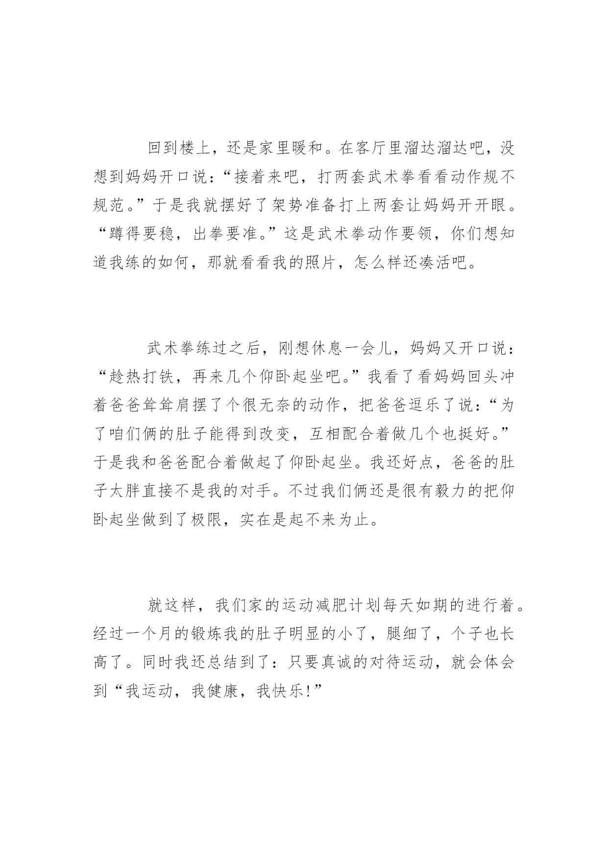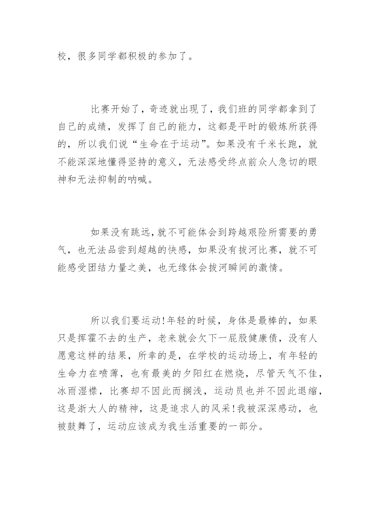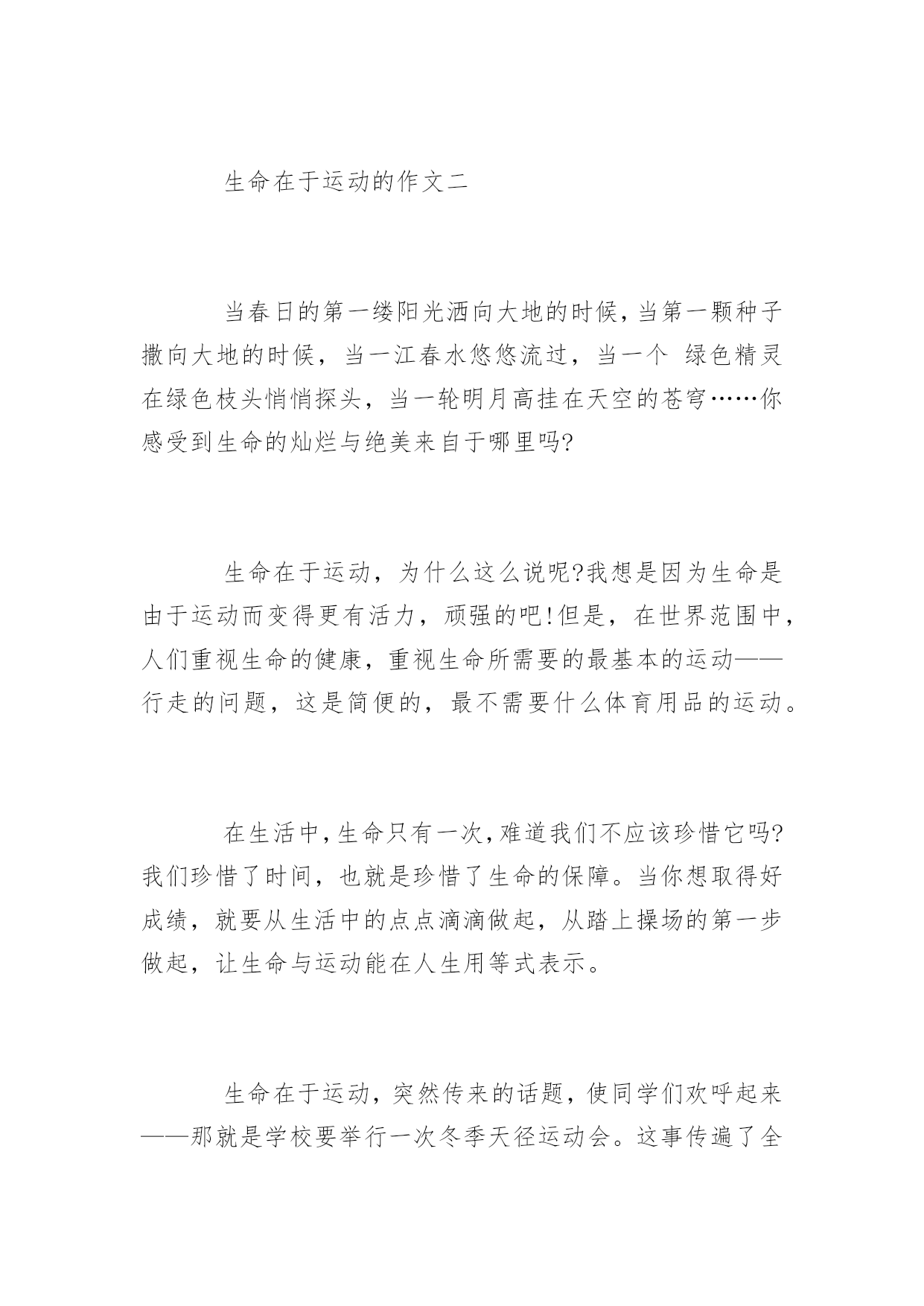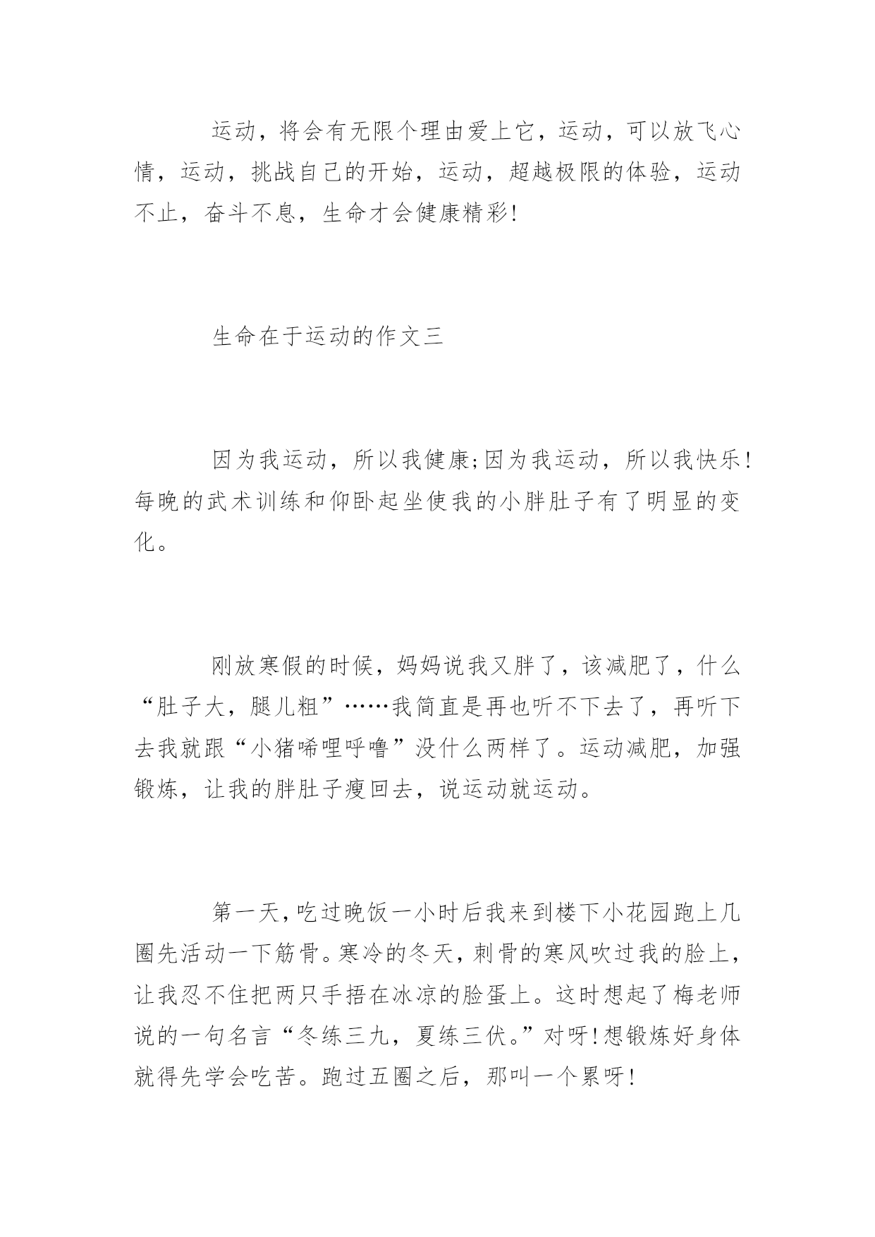 生命在于运动的作文运动,可以放飞心情,运动,挑战自己的开始,运动,超越极限的体验。下面是语文迷网整理提供的生命在于运动的作文,供大家阅读。生命在于运动的作文一生命在于运动,不错的。生命是那样的珍贵,绝不能轻易浪费掉,而虚度光阴。俗话说的好啊,“一寸光阴一寸金,寸金难买寸光阴。”我们样让生命过得有价值有意义不能白白的虚过。我们每天早早的起床洗脸刷牙之后我们吃完了饭,去上学,下课了。我们不要闲着,我们应该去运动运动。这样才有利于身心,对身体好,我们不能总是去学习而不去运动,那样是不好的,我们应该取适量的运动运动。这运动对我们的学习也有好处的。一位名人曾经说过运动也能增强记忆的,所以我们要多运动运动这样我们几锻炼了身体有对学习有好处,这样的好事。何乐而不为呢?我们是学生,但是我们不能老是去学习,我们不能天天不是呆在学校就是呆在家里这样是不好的对我们的身体也不好。我们在放假的时候可以去爬爬山啦,打打羽毛球啊,跳跳绳啊,等等对身体有好处的运动。我们不能总是学习我们要做一些运动,生命在于运动是不错的,只要你去尝试你就会发现运动其实是一件很快乐的事情,运动完了以后,你就会感觉充满活力和精力,那时候再去学习,那是再好不过的了。我尝试过,本来我是一个不爱运动的孩子,我整天就知道读书,但是我的成绩还是一般般,后来我的妈妈说我应该多运动,运动完了以后再去学习,想试一试。就按照我妈妈说的去做后来我,每天坚持,果然,再一次考试后我考了全班第一,我很开心。这都是运动的好处啊!生命在于运动,可别再做懒孩子了!开始运动吧。对你的任何事情都是有好处而没有坏处的!生命在于运动的作文二当春日的第一缕阳光洒向大地的时候,当第一颗种子撒向大地的时候,当一江春水悠悠流过,当一个绿色精灵在绿色枝头悄悄探头,当一轮明月高挂在天空的苍穹……你感受到生命的灿烂与绝美来自于哪里吗?生命在于运动,为什么这么说呢?我想是因为生命是由于运动而变得更有活力,顽强的吧!但是,在世界范围中,人们重视生命的健康,重视生命所需要的最基本的运动——行走的问题,这是简便的,最不需要什么体育用品的运动。在生活中,生命只有一次,难道我们不应该珍惜它吗?我们珍惜了时间,也就是珍惜了生命的保障。当你想取得好成绩,就要从生活中的点点滴滴做起,从踏上操场的第一步做起,让生命与运动能在人生用等式表示。生命在于运动,突然传来的话题,使同学们欢呼起来——那就是学校要举行一次冬季天径运动会。这事传遍了全校,很多同学都积极的参加了。比赛开始了,奇迹就出现了,我们班的同学都拿到了自己的成绩,发挥了自己的能力,这都是平时的锻炼所获得的,所以我们说“生命在于运动”。如果没有千米长跑,就不能深深地懂得坚持的意义,无法感受终点前众人急切的眼神和无法抑制的呐喊。如果没有跳远,就不可能体会到跨越艰险所需要的勇气,也无法品尝到超越的快感,如果没有拔河比赛,就不可能感受团结力量之美,也无缘体会拔河瞬间的激情。所以我们要运动!年轻的时候,身体是最棒的,如果只是挥霍不去的生产,老来就会欠下一屁股健康债,没有人愿意这样的结果,所幸的是,在学校的运动场上,有年轻的生命力在喷薄,也有最美的夕阳红在燃烧,尽管天气不佳,冰雨湿襟,比赛却不因此而搁浅,运动员也并不因此退缩,这是浙大人的精神,这是追求人的风采!我被深深感动,也被鼓舞了,运动应该成为我生活重要的一部分。运动,将会有无限个理由爱上它,运动,可以放飞心情,运动,挑战自己的开始,运动,超越极限的体验,运动不止,奋斗不息,生命才会健康精彩!生命在于运动的作文三因为我运动,所以我健康;因为我运动,所以我快乐!每晚的武术训练和仰卧起坐使我的小胖肚子有了明显的变化。刚放寒假的时候,妈妈说我又胖了,该减肥了,什么“肚子大,腿儿粗”……我简直是再也听不下去了,再听下去我就跟“小猪唏哩呼噜”没什么两样了。运动减肥,加强锻炼,让我的胖肚子瘦回去,说运动就运动。第一天,吃过晚饭一小时后我来到楼下小花园跑上几圈先活动一下筋骨。寒冷的冬天,刺骨的寒风吹过我的脸上,让我忍不住把两只手捂在冰凉的脸蛋上。这时想起了梅老师说的一句名言“冬练三九,夏练三伏。”对呀!想锻炼好身体就得先学会吃苦。跑过五圈之后,那叫一个累呀!回到楼上,还是家里暖和。在客厅里溜达溜达吧,没想到妈妈开口说:“接着来吧,打两套武术拳看看动作规不规范。”于是我就摆好了架势准备打上两套让妈妈开开眼。“蹲得要稳,出拳要准。”这是武术拳动作要领,你们想知道我练的如何,那就看看我的照片,怎么样还凑活吧。武术拳练过之后,刚想休息一会儿,妈妈又开口说:“趁热打铁,再来几个仰卧起坐吧。”我看了看妈妈回头冲着爸爸耸耸肩摆了个很无奈的动作,把爸爸逗乐了说:“为了咱们俩的肚子能得到改变,互相配合着做几个也挺好。”于是我和爸爸配合