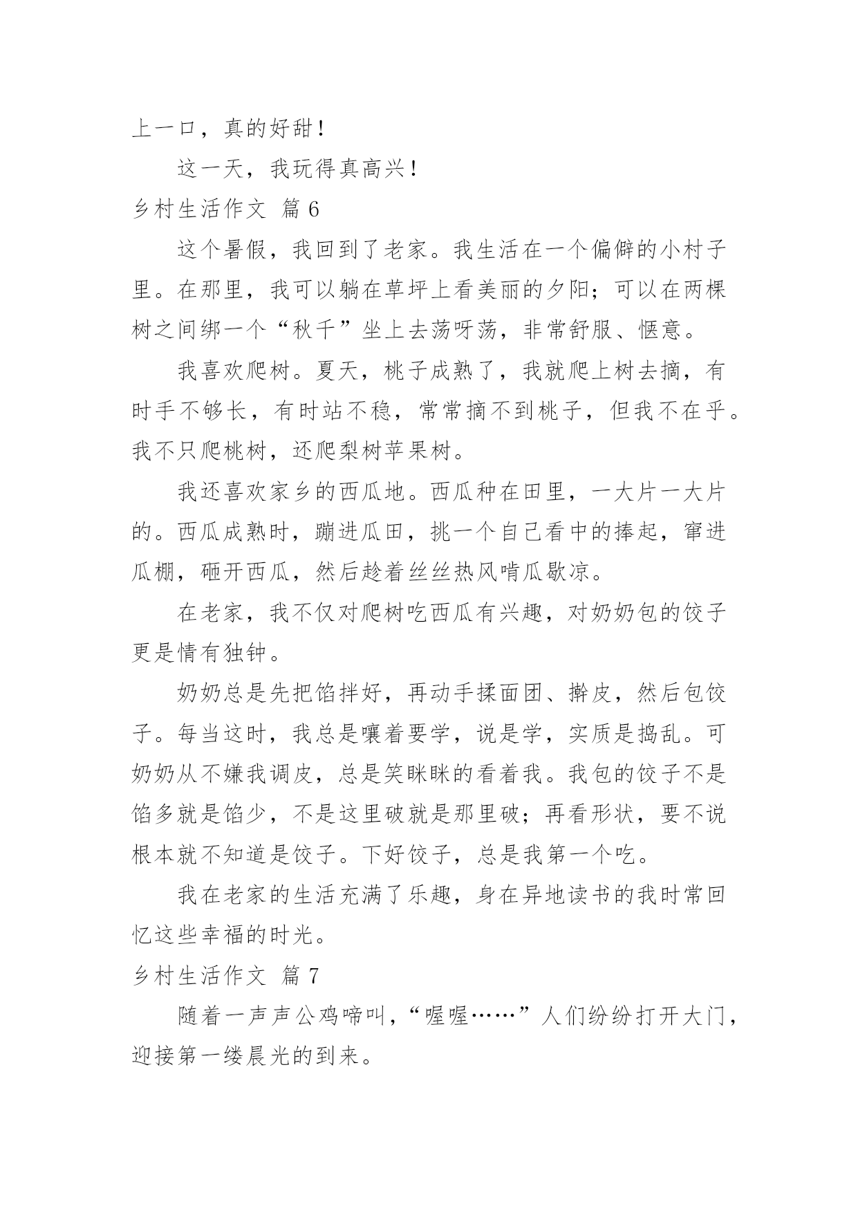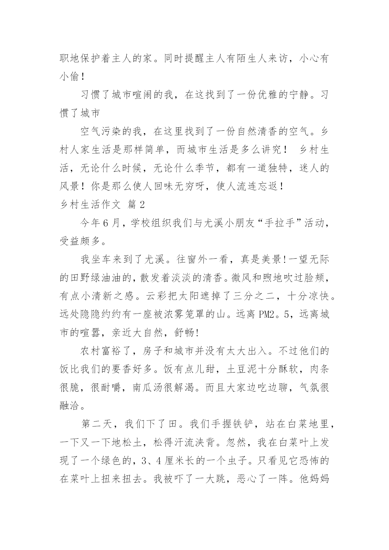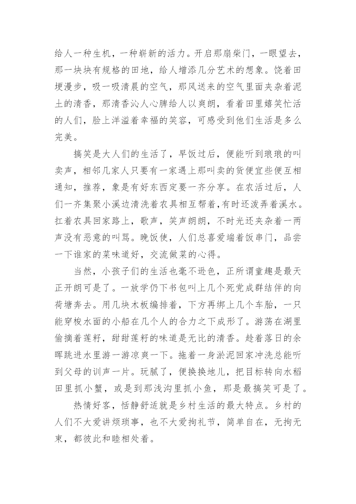 乡村生活作文【必备】乡村生活作文8篇无论是在学校还是在社会中,大家对作文都不陌生吧,作文要求篇章结构完整,一定要避免无结尾作文的出现。你知道作文怎样才能写的好吗?以下是小编帮大家整理的乡村生活作文9篇,希望对大家有所帮助。乡村生活作文篇1每年的暑假,爸爸都会带我们全家人去老家农村看望他外婆,也就是我的外祖奶奶,由于我爷爷奶奶去世太早,祖奶奶成了我爸唯一可以孝敬的亲人。正因为这事也使我有机会去农村玩。了解农村的生活习惯。清早起床,爸爸开车从县城出发,沿着弯延公路前行,公路两旁有金灿灿的稻田,清澈见底的小溪,成群结队的牛羊,啊,景色大美了!小花随处可见,小鸟飞来飞去,叽叽喳喳地叫着,仿佛对我说:“欢迎你们来到农村!”下车后,走在由石头铺成的小道上,凉凉的微风迎面吹来,让我感到无比好兴奋,不知不觉中我们来到了祖奶奶家。农村的人们,早上天刚刚亮就起床,大人出去耕田、锄草,小孩去放羊,九点左右回家吃早饭,吃完早饭又去干农活,忙到中午回家随便吃点东西,休息半个小时又去干活,直到天快黑才往家走。他们已经习惯了日出而作,日落而息的生活。农村人很喜欢养狗,只要你从他们的房前屋后走过,狗都会叫个不停,甚至你从篱笆外走过,它也要叫几声,尽职地保护着主人的家。同时提醒主人有陌生人来访,小心有小偷!习惯了城市喧闹的我,在这找到了一份优雅的宁静。习惯了城市空气污染的我,在这里找到了一份自然清香的空气。乡村人家生活是那样简单,而城市生活是多么讲究!乡村生活,无论什么时候,无论什么季节,都有一道独特,迷人的风景!你是那么使人回味无穷呀,使人流连忘返!乡村生活作文篇2今年6月,学校组织我们与尤溪小朋友“手拉手”活动,受益颇多。我坐车来到了尤溪。往窗外一看,真是美景!一望无际的田野绿油油的,散发着淡淡的清香。微风和煦地吹过脸颊,有点小清新之感。云彩把太阳遮掉了三分之二,十分凉快。远处隐隐约约有一座被浓雾笼罩的山。远离PM2。5,远离城市的喧嚣,亲近大自然,舒畅!农村富裕了,房子和城市并没有太大出入。不过他们的饭比我们的要香好多。饭有点儿甜,土豆泥十分酥软,肉条很脆,很耐嚼,南瓜汤很解渴。而且大家边吃边聊,气氛很融洽。第二天,我们下了田。我们手握铁铲,站在白菜地里,一下又一下地松土,松得汗流浃背。忽然,我在白菜叶上发现了一个绿色的,3、4厘米长的一个虫子。只看见它恐怖的在菜叶上扭来扭去。我被吓了一大跳,恶心了一阵。他妈妈走过来拍拍我的肩,安慰我:“没关系,这个虫子叫做菜青虫,经常在白菜叶上出现,把它拿掉就好了!说着用手把菜青虫拿下来,装在盒子里,”菜青虫喂鸡不错,鸡很爱吃!“我看着也手痒痒了,忍不住也想试试看。在他妈妈的指导下,我小心翼翼地用手碰碰菜青虫,然后用手托着,把它放进盒子里。我认为这是一次不错的尝试。然后,我们走到了一个大棚前。棚里有几条水沟,牛蛙在水沟的底下潜伏着。见有人来,就猛地跳出水面,鼓起腮帮子,”咕呱“”咕呱“地叫起来。这次活动,我领略了乡村的生活,得到了乡村的点点滴滴,令人难忘!乡村生活作文篇3在我小的时候,发生了许许多多有趣的事,其中我记忆最深刻的,就是跟我外婆一起去田里插秧了。还记得那次正是农忙季节,外婆要去田里插秧,年幼的我觉得好玩,囔着也要去。外婆经不住我的软磨硬泡,便带我一起去。来到农田里,大人们都弯腰忙碌着,我学着外婆的样子,挽起裤管,拉起袖子,摆出一副雄赳赳气昂昂的架势,跨着大步来到田边,嘴巴一翘,抱起一大把秧苗,重重地踩进田里。呃……太用力了,脚陷进去了,出师不利呀!我只好放下秧苗,一屁股坐在田边,双手抓住脚在那“拔脚”。呼,出来了。“啪!”脚是出来了,可因为用力过猛,一滩污泥“飞”到了我的脸上。“呀!”我叫起来,不过很快清理掉了。我重新吸了口气,再次踏进了田里。这次,我轻轻地,两只脚都踩进去了。我缓缓地移动,可是不巧的是被里面的石头卡住了。这可怎么办?我把身体往前倾,脸离污泥只有八九厘米,一会儿像做俯卧撑那样,整个身子往上跳,一会儿又像毛毛虫一样,慢慢往上爬。“呼!终于出……”呀,脚是出来了,可我整个人却因为重心不稳而直直地摔进了泥里,更可恨的是——我脸朝下呀!结果我摔了个“狗啃泥”。“哇——”,我爬起来,大哭了起来。身上穿的白体恤变成了黑体恤,我变成了大花猫,眼泪顺着小泥脸滚下来,黑乎乎的脸上出现了两道印子。“哈哈哈!”周围的大人笑得合不拢嘴。我不光没有插到秧,还把身下这一大片秧苗给压扁了。“哈哈,今天我要抱回家一只小花猫喽!”外婆正站在不远处乐呵呵地说。嘻嘻,但我也算是因祸得福吧,外婆为了安慰我、补偿我,特地给我烧了一顿红烧肉。啊呀,真好吃!现在回想起来,这件事还是觉得十分好笑呢。乡村生活作文篇4乡村的中午是孩子们的乐园。孩子们吃完饭,趁着大人午睡,就集结起来,顶着炎炎夏日,去山沟里摸田螺,到山里捉知了,在田野里摔跤