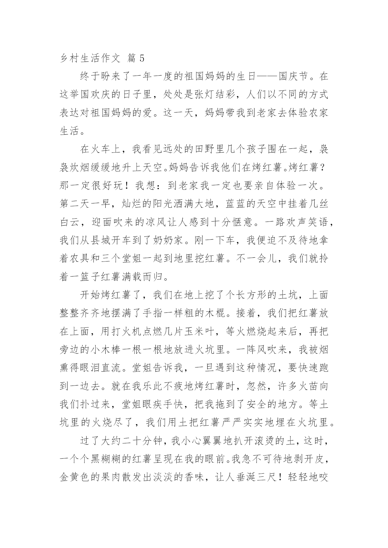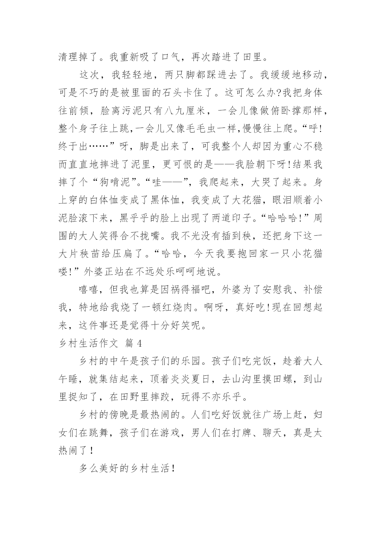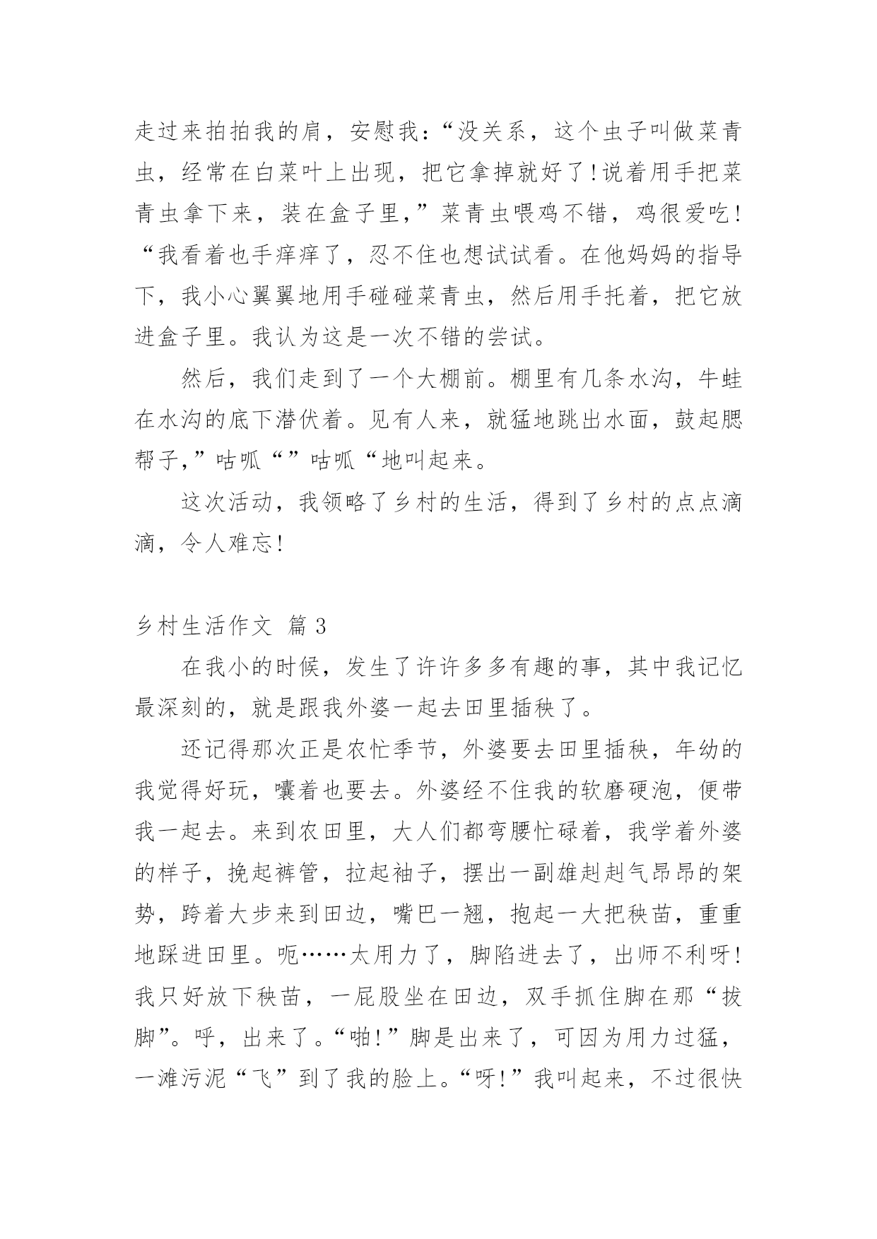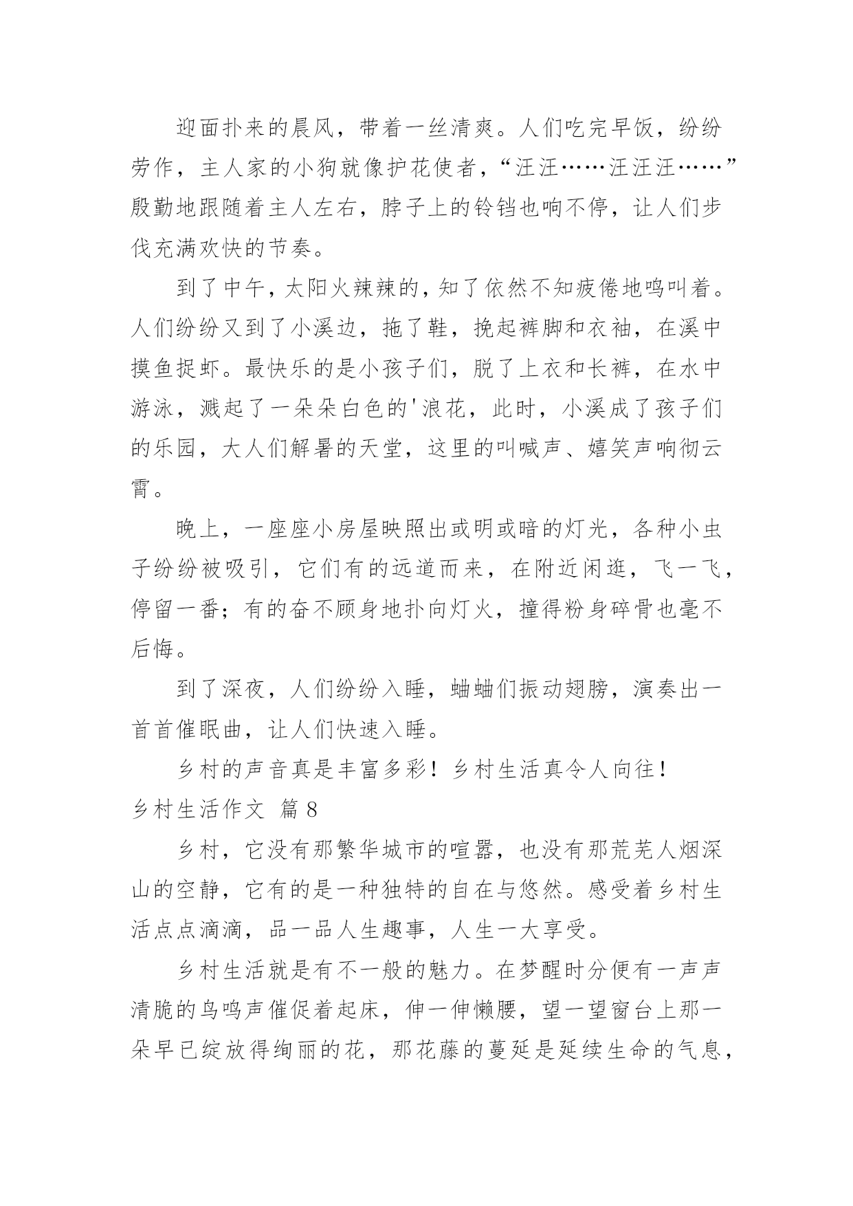 乡村生活作文【必备】乡村生活作文8篇无论是在学校还是在社会中,大家对作文都不陌生吧,作文要求篇章结构完整,一定要避免无结尾作文的出现。你知道作文怎样才能写的好吗?以下是小编帮大家整理的乡村生活作文9篇,希望对大家有所帮助。乡村生活作文篇1每年的暑假,爸爸都会带我们全家人去老家农村看望他外婆,也就是我的外祖奶奶,由于我爷爷奶奶去世太早,祖奶奶成了我爸唯一可以孝敬的亲人。正因为这事也使我有机会去农村玩。了解农村的生活习惯。清早起床,爸爸开车从县城出发,沿着弯延公路前行,公路两旁有金灿灿的稻田,清澈见底的小溪,成群结队的牛羊,啊,景色大美了!小花随处可见,小鸟飞来飞去,叽叽喳喳地叫着,仿佛对我说:“欢迎你们来到农村!”下车后,走在由石头铺成的小道上,凉凉的微风迎面吹来,让我感到无比好兴奋,不知不觉中我们来到了祖奶奶家。农村的人们,早上天刚刚亮就起床,大人出去耕田、锄草,小孩去放羊,九点左右回家吃早饭,吃完早饭又去干农活,忙到中午回家随便吃点东西,休息半个小时又去干活,直到天快黑才往家走。他们已经习惯了日出而作,日落而息的生活。农村人很喜欢养狗,只要你从他们的房前屋后走过,狗都会叫个不停,甚至你从篱笆外走过,它也要叫几声,尽职地保护着主人的家。同时提醒主人有陌生人来访,小心有小偷!习惯了城市喧闹的我,在这找到了一份优雅的宁静。习惯了城市空气污染的我,在这里找到了一份自然清香的空气。乡村人家生活是那样简单,而城市生活是多么讲究!乡村生活,无论什么时候,无论什么季节,都有一道独特,迷人的风景!你是那么使人回味无穷呀,使人流连忘返!乡村生活作文篇2今年6月,学校组织我们与尤溪小朋友“手拉手”活动,受益颇多。我坐车来到了尤溪。往窗外一看,真是美景!一望无际的田野绿油油的,散发着淡淡的清香。微风和煦地吹过脸颊,有点小清新之感。云彩把太阳遮掉了三分之二,十分凉快。远处隐隐约约有一座被浓雾笼罩的山。远离PM2。5,远离城市的喧嚣,亲近大自然,舒畅!农村富裕了,房子和城市并没有太大出入。不过他们的饭比我们的要香好多。饭有点儿甜,土豆泥十分酥软,肉条很脆,很耐嚼,南瓜汤很解渴。而且大家边吃边聊,气氛很融洽。第二天,我们下了田。我们手握铁铲,站在白菜地里,一下又一下地松土,松得汗流浃背。忽然,我在白菜叶上发现了一个绿色的,3、4厘米长的一个虫子。只看见它恐怖的在菜叶上扭来扭去。我被吓了一大跳,恶心了一阵。他妈妈走过来拍拍我的肩,安慰我:“没关系,这个虫子叫做菜青虫,经常在白菜叶上出现,把它拿掉就好了!说着用手把菜青虫拿下来,装在盒子里,”菜青虫喂鸡不错,鸡很爱吃!“我看着也手痒痒了,忍不住也想试试看。在他妈妈的指导下,我小心翼翼地用手碰碰菜青虫,然后用手托着,把它放进盒子里。我认为这是一次不错的尝试。然后,我们走到了一个大棚前。棚里有几条水沟,牛蛙在水沟的底下潜伏着。见有人来,就猛地跳出水面,鼓起腮帮子,”咕呱“”咕呱“地叫起来。这次活动,我领略了乡村的生活,得到了乡村的点点滴滴,令人难忘!乡村生活作文篇3在我小的时候,发生了许许多多有趣的事,其中我记忆最深刻的,就是跟我外婆一起去田里插秧了。还记得那次正是农忙季节,外婆要去田里插秧,年幼的我觉得好玩,囔着也要去。外婆经不住我的软磨硬泡,便带我一起去。来到农田里,大人们都弯腰忙碌着,我学着外婆的样子,挽起裤管,拉起袖子,摆出一副雄赳赳气昂昂的架势,跨着大步来到田边,嘴巴一翘,抱起一大把秧苗,重重地踩进田里。呃……太用力了,脚陷进去了,出师不利呀!我只好放下秧苗,一屁股坐在田边,双手抓住脚在那“拔脚”。呼,出来了。“啪!”脚是出来了,可因为用力过猛,一滩污泥“飞”到了我的脸上。“呀!”我叫起来,不过很快清理掉了。我重新吸了口气,再次踏进了田里。这次,我轻轻地,两只脚都踩进去了。我缓缓地移动,可是不巧的是被里面的石头卡住了。这可怎么办?我把身体往前倾,脸离污泥只有八九厘米,一会儿像做俯卧撑那样,整个身子往上跳,一会儿又像毛毛虫一样,慢慢往上爬。“呼!终于出……”呀,脚是出来了,可我整个人却因为重心不稳而直直地摔进了泥里,更可恨的是——我脸朝下呀!结果我摔了个“狗啃泥”。“哇——”,我爬起来,大哭了起来。身上穿的白体恤变成了黑体恤,我变成了大花猫,眼泪顺着小泥脸滚下来,黑乎乎的脸上出现了两道印子。“哈哈哈!”周围的大人笑得合不拢嘴。我不光没有插到秧,还把身下这一大片秧苗给压扁了。“哈哈,今天我要抱回家一只小花猫喽!”外婆正站在不远处乐呵呵地说。嘻嘻,但我也算是因祸得福吧,外婆为了安慰我、补偿我,特地给我烧了一顿红烧肉。啊呀,真好吃!现在回想起来,这件事还是觉得十分好笑呢。乡村生活作文篇4乡村的中午是孩子们的乐园。孩子们吃完饭,趁着大人午睡,就集结起来,顶着炎炎夏日,去山沟里摸田螺,到山里捉知了,在田野里摔跤