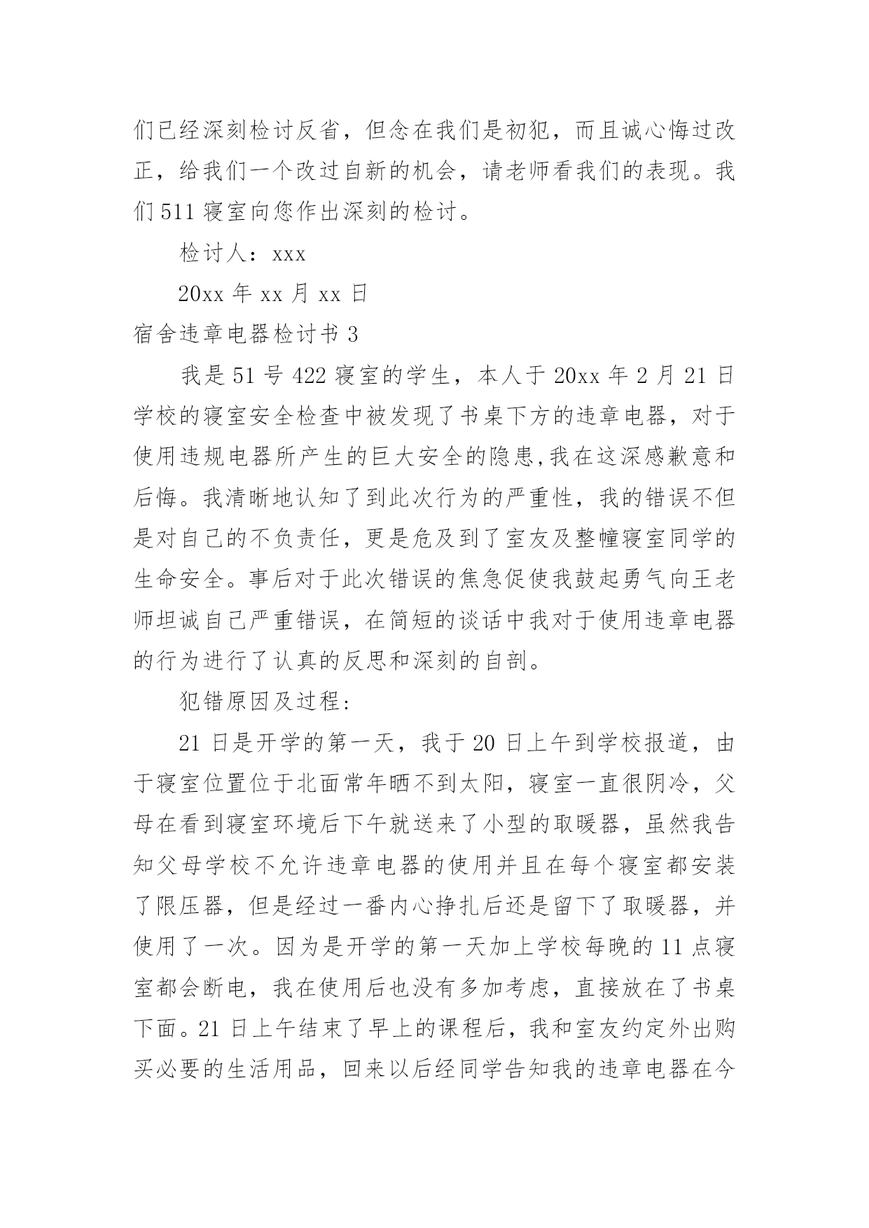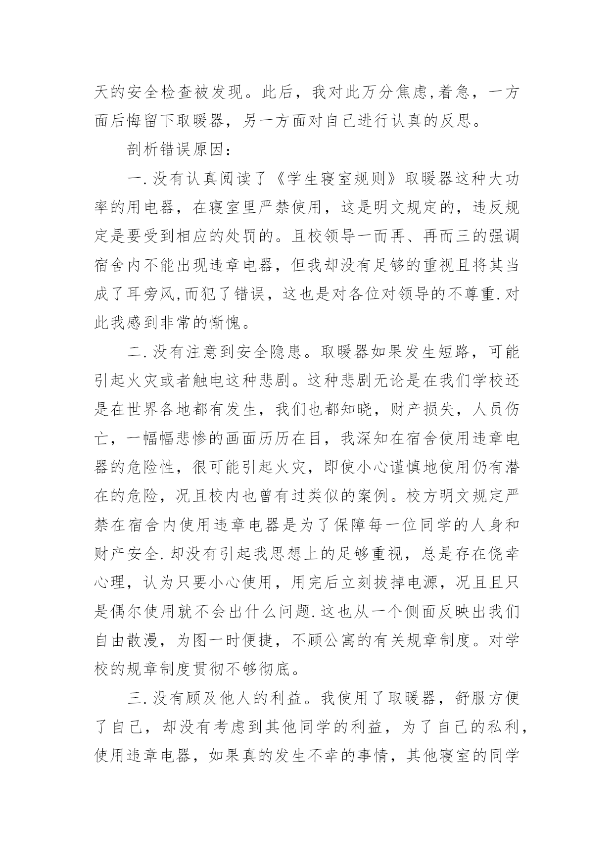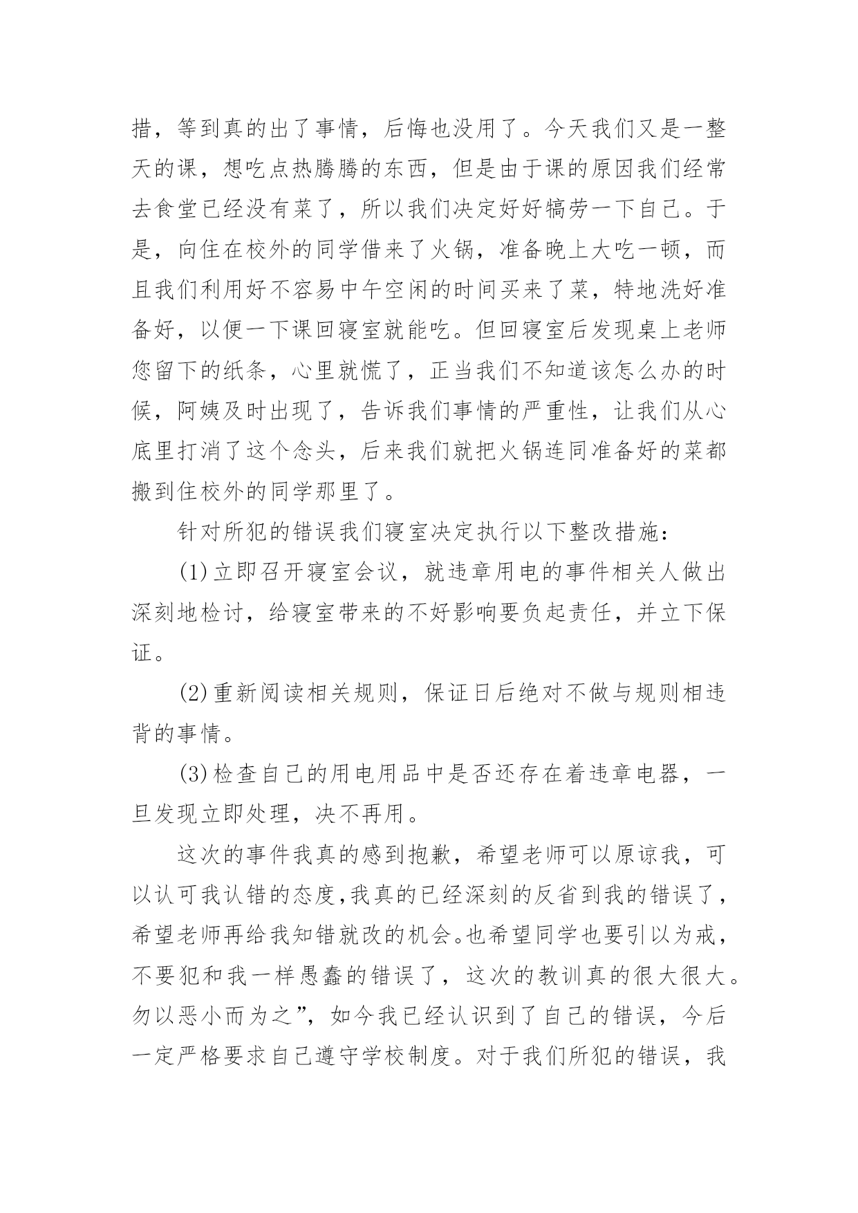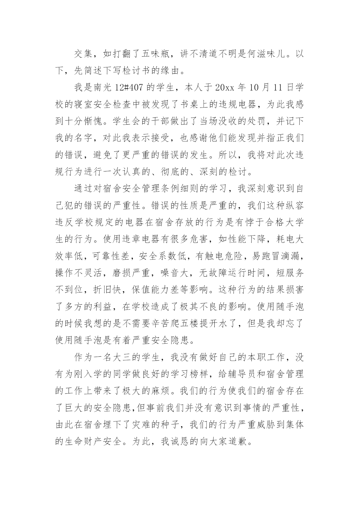 宿舍违章电器检讨书宿舍违章电器检讨书在学习、工作或生活中犯错后,为了避免再犯,往往要写检讨书来自我反思,请注意检讨书里面要交代清楚行为。快来参考检讨书是怎么写的吧,以下是小编精心整理的宿舍违章电器检讨书,仅供参考,大家一起来看看吧。宿舍违章电器检讨书1尊敬的楼长阿姨:今天我们宿舍用热得快,被楼长阿姨及时制止,感谢她能发现并指正我们的错误,避免了更严重的错误的发生。这个热得快是水管爆裂的时候找外面的学姐借的,我们今天想早点复习功课,马上要期末考试了,本想省点时间,早点洗完睡觉,就烧了俩壶水,我们认识到了问题的严重性,并对自己违反校纪校规的行为进行了认真的反思和深刻的自剖。在此,我谨向各位领导、学生会干部做出深刻检讨,并将我这两天来的反思结果汇报如下:第一,我们的行为不符合一个大学生的要求。作为当代大学生,我们应该识大体、顾大局,在校纪校规面前人人平等,我不应该为了一己之便违反校纪校规。况且,我们宿舍楼层不高,下楼打开水是一件很方便的事,控制自己不用类似的大功率用电器并不是一件很困难的事。第二,我们应主动配合学院搞好安全工作,学院老师三令五申、班干也一再强调,要求我们不使用大功率用电器,但这都成了耳旁风,这些都是不应该的。第三,我的行为还在宿舍间造成了极坏的影响。同学之间本应该互相学习,互相促进,而我们的表现给同学们带了一个坏头,不利于校风和院风的建设。我们只有认真反思,寻找极大错误后面的深刻根源,认清问题的本质,才能给集体和自己一个交待,从而得以进步。做为一名学生,我没有做好自己的本职,给学楼长阿姨的工作带来了很大的麻烦。在深刻的自我反思之后,我决定有如下个人整改措施:一,按照要求上交内容深刻的检讨书一份,对自己思想上的错误根源进行深挖细找的整理,并认清其可能造成的严重后果。二,用心克服生活懒散、粗心大意的缺点。三,和楼长阿姨加强沟通。保证今后不再出现违反校纪校规的情况。我非常感谢老师和学生会干部对我所犯错误的及时指正,我们保证今后不会再有类似行为发生在我身上。请关心爱护我们的楼长阿姨继续监督、帮助我们改正缺点,使我取得更大的进步!宿舍违章电器检讨书2尊敬的老师:我们对自己差点违反学校规定在寝室内使用违章电器的行为向您表示歉意和强烈的自责。我们差点犯了使用大功率电器的错误,多亏老师及时发现,阿姨及时制止,才避免了更大的错误的发生,如果那天没有被发现,我们一定会犯措,等到真的出了事情,后悔也没用了。今天我们又是一整天的课,想吃点热腾腾的东西,但是由于课的原因我们经常去食堂已经没有菜了,所以我们决定好好犒劳一下自己。于是,向住在校外的同学借来了火锅,准备晚上大吃一顿,而且我们利用好不容易中午空闲的时间买来了菜,特地洗好准备好,以便一下课回寝室就能吃。但回寝室后发现桌上老师您留下的纸条,心里就慌了,正当我们不知道该怎么办的时候,阿姨及时出现了,告诉我们事情的严重性,让我们从心底里打消了这个念头,后来我们就把火锅连同准备好的菜都搬到住校外的同学那里了。针对所犯的错误我们寝室决定执行以下整改措施:(1)立即召开寝室会议,就违章用电的事件相关人做出深刻地检讨,给寝室带来的不好影响要负起责任,并立下保证。(2)重新阅读相关规则,保证日后绝对不做与规则相违背的事情。(3)检查自己的用电用品中是否还存在着违章电器,一旦发现立即处理,决不再用。这次的事件我真的感到抱歉,希望老师可以原谅我,可以认可我认错的态度,我真的已经深刻的反省到我的错误了,希望老师再给我知错就改的机会。也希望同学也要引以为戒,不要犯和我一样愚蠢的错误了,这次的教训真的很大很大。勿以恶小而为之”,如今我已经认识到了自己的错误,今后一定严格要求自己遵守学校制度。对于我们所犯的错误,我们已经深刻检讨反省,但念在我们是初犯,而且诚心悔过改正,给我们一个改过自新的机会,请老师看我们的表现。我们511寝室向您作出深刻的检讨。检讨人:xxx20xx年xx月xx日宿舍违章电器检讨书3我是51号422寝室的学生,本人于20xx年2月21日学校的寝室安全检查中被发现了书桌下方的违章电器,对于使用违规电器所产生的巨大安全的隐患,我在这深感歉意和后悔。我清晰地认知了到此次行为的严重性,我的错误不但是对自己的不负责任,更是危及到了室友及整幢寝室同学的生命安全。事后对于此次错误的焦急促使我鼓起勇气向王老师坦诚自己严重错误,在简短的谈话中我对于使用违章电器的行为进行了认真的反思和深刻的自剖。犯错原因及过程:21日是开学的第一天,我于20日上午到学校报道,由于寝室位置位于北面常年晒不到太阳,寝室一直很阴冷,父母在看到寝室环境后下午就送来了小型的取暖器,虽然我告知父母学校不允许违章电器的使用并且在每个寝室都安装了限压器,但是经过一番内心挣扎后还是留下了取暖器,并使用了一次。因为是开学的第一天加上学校每晚的1