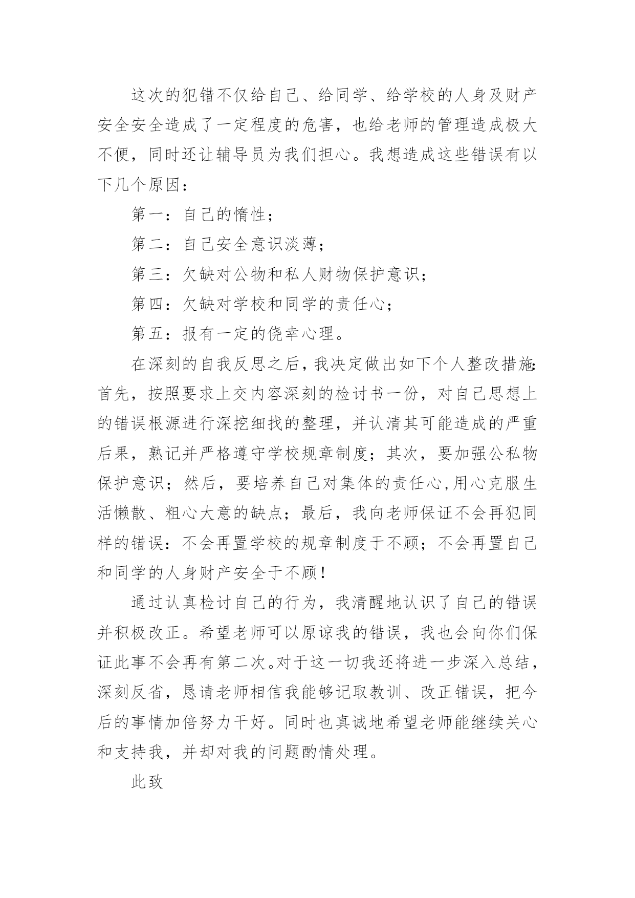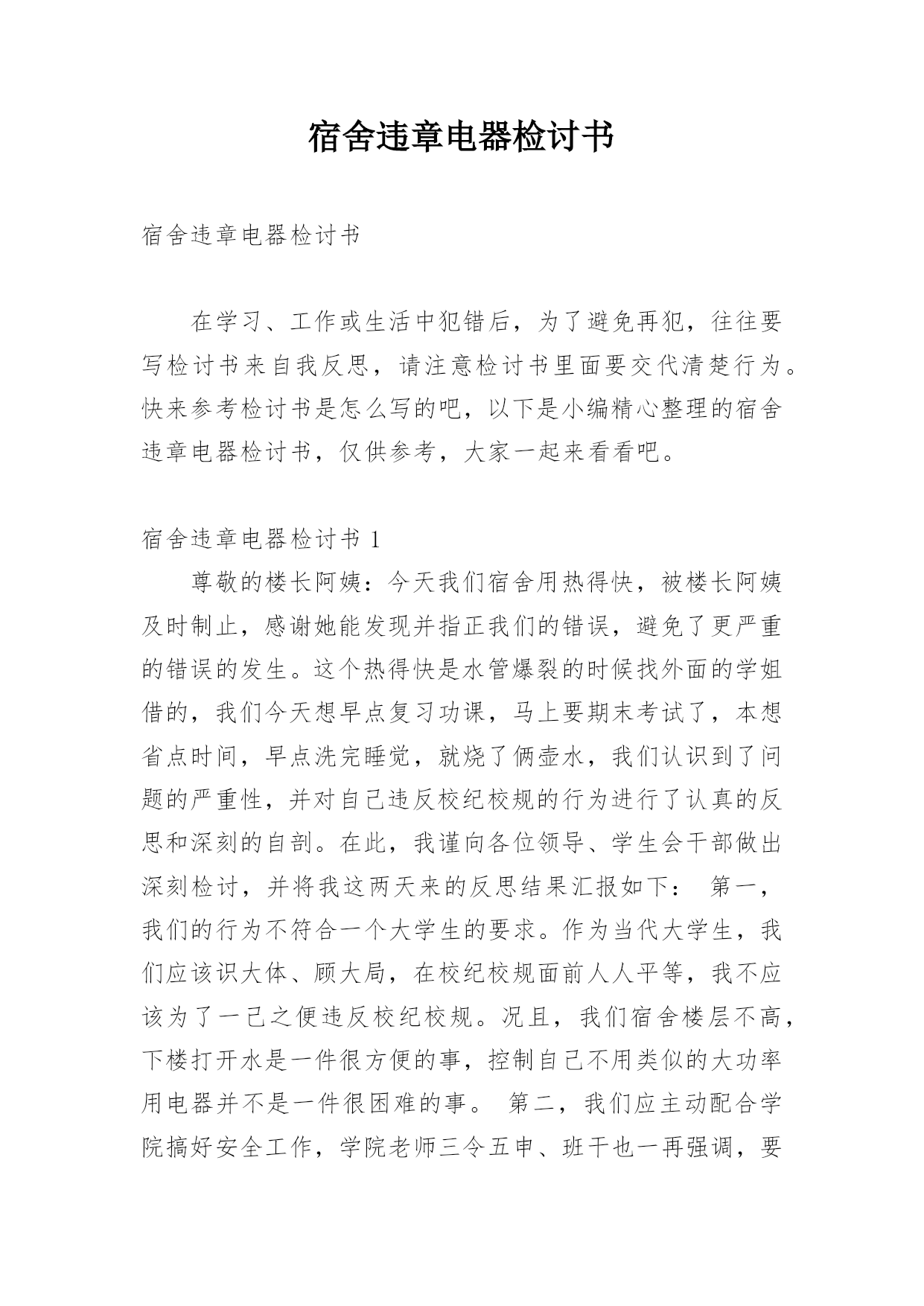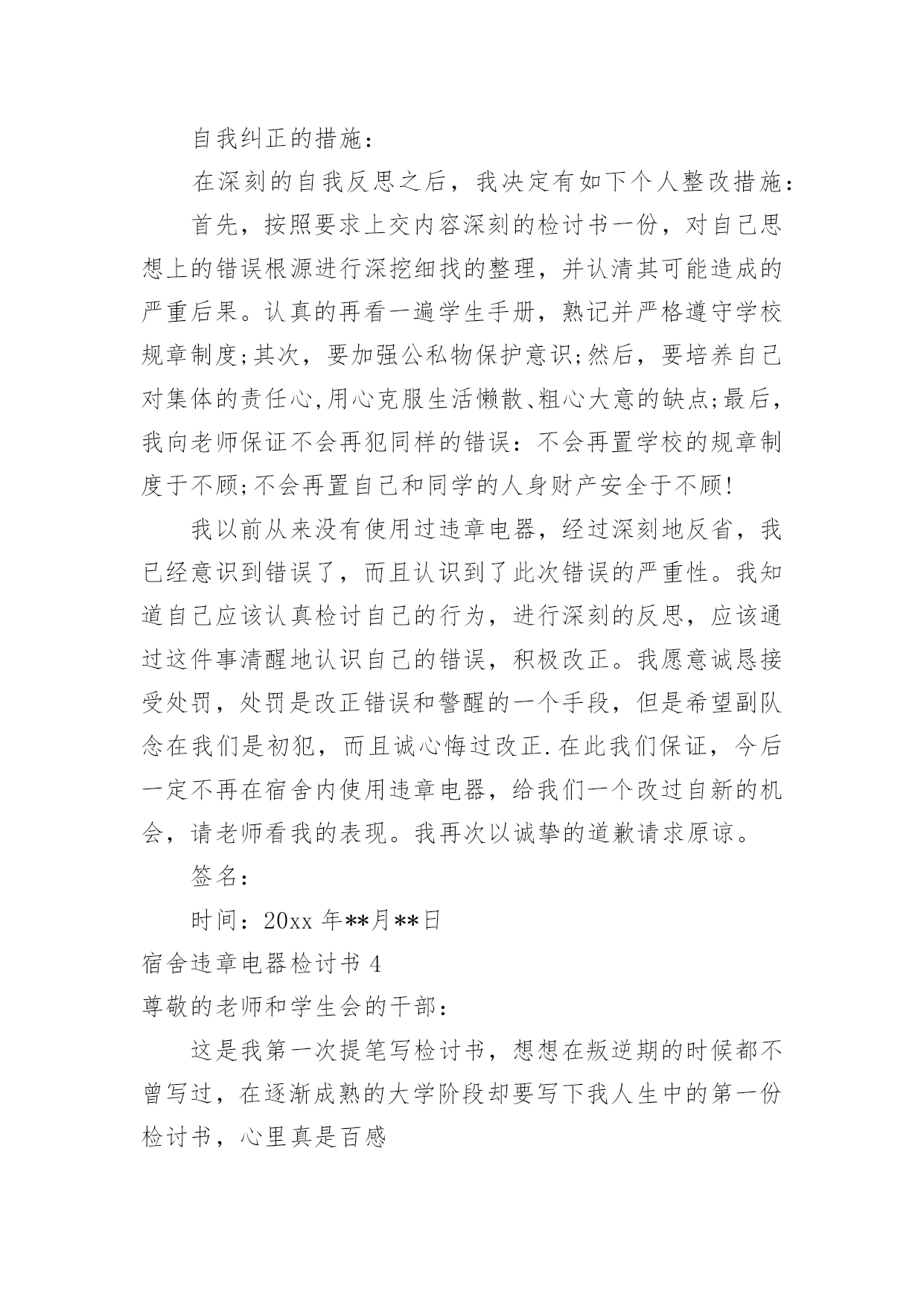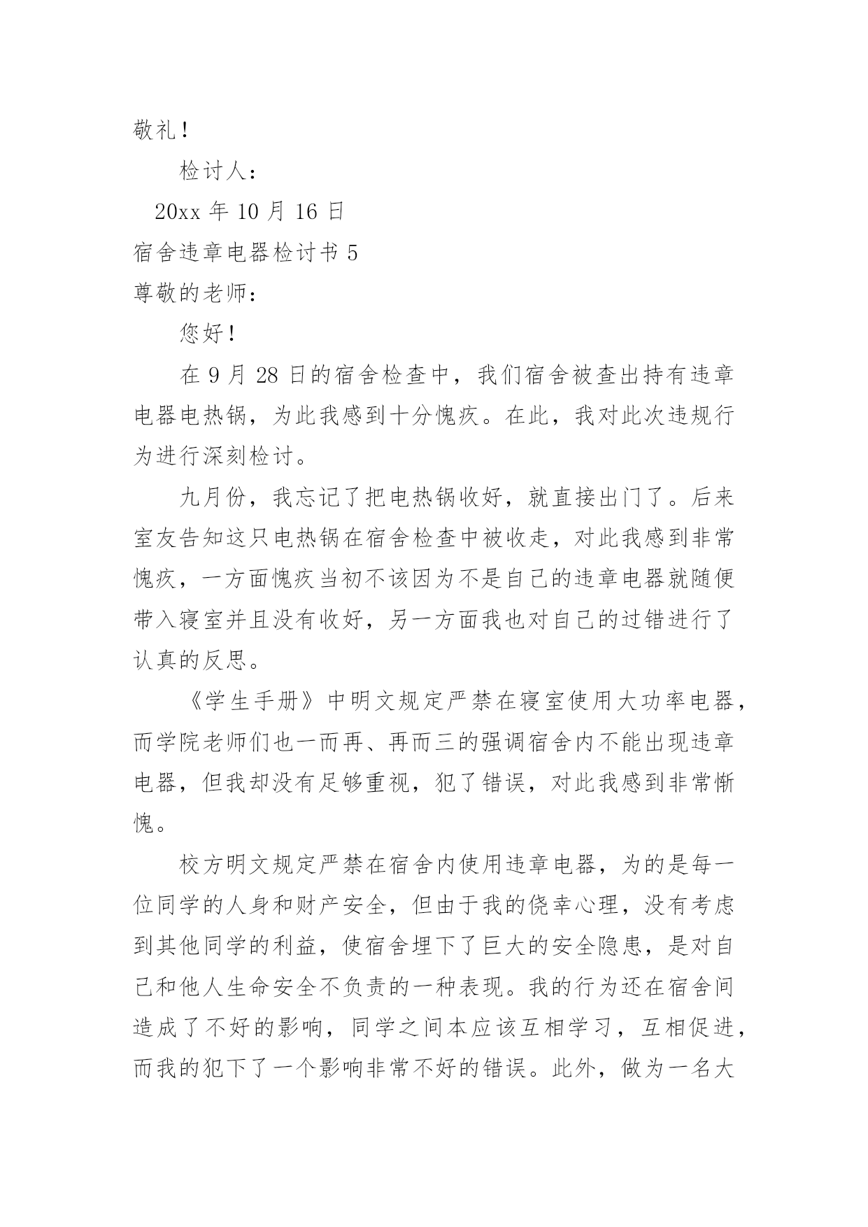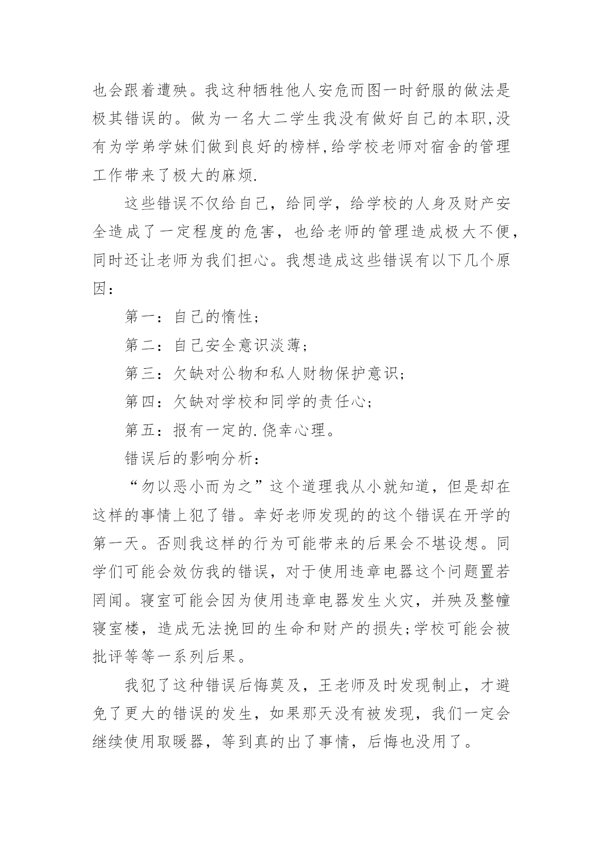 宿舍违章电器检讨书宿舍违章电器检讨书在学习、工作或生活中犯错后,为了避免再犯,往往要写检讨书来自我反思,请注意检讨书里面要交代清楚行为。快来参考检讨书是怎么写的吧,以下是小编精心整理的宿舍违章电器检讨书,仅供参考,大家一起来看看吧。宿舍违章电器检讨书1尊敬的楼长阿姨:今天我们宿舍用热得快,被楼长阿姨及时制止,感谢她能发现并指正我们的错误,避免了更严重的错误的发生。这个热得快是水管爆裂的时候找外面的学姐借的,我们今天想早点复习功课,马上要期末考试了,本想省点时间,早点洗完睡觉,就烧了俩壶水,我们认识到了问题的严重性,并对自己违反校纪校规的行为进行了认真的反思和深刻的自剖。在此,我谨向各位领导、学生会干部做出深刻检讨,并将我这两天来的反思结果汇报如下:第一,我们的行为不符合一个大学生的要求。作为当代大学生,我们应该识大体、顾大局,在校纪校规面前人人平等,我不应该为了一己之便违反校纪校规。况且,我们宿舍楼层不高,下楼打开水是一件很方便的事,控制自己不用类似的大功率用电器并不是一件很困难的事。第二,我们应主动配合学院搞好安全工作,学院老师三令五申、班干也一再强调,要求我们不使用大功率用电器,但这都成了耳旁风,这些都是不应该的。第三,我的行为还在宿舍间造成了极坏的影响。同学之间本应该互相学习,互相促进,而我们的表现给同学们带了一个坏头,不利于校风和院风的建设。我们只有认真反思,寻找极大错误后面的深刻根源,认清问题的本质,才能给集体和自己一个交待,从而得以进步。做为一名学生,我没有做好自己的本职,给学楼长阿姨的工作带来了很大的麻烦。在深刻的自我反思之后,我决定有如下个人整改措施:一,按照要求上交内容深刻的检讨书一份,对自己思想上的错误根源进行深挖细找的整理,并认清其可能造成的严重后果。二,用心克服生活懒散、粗心大意的缺点。三,和楼长阿姨加强沟通。保证今后不再出现违反校纪校规的情况。我非常感谢老师和学生会干部对我所犯错误的及时指正,我们保证今后不会再有类似行为发生在我身上。请关心爱护我们的楼长阿姨继续监督、帮助我们改正缺点,使我取得更大的进步!宿舍违章电器检讨书2尊敬的老师:我们对自己差点违反学校规定在寝室内使用违章电器的行为向您表示歉意和强烈的自责。我们差点犯了使用大功率电器的错误,多亏老师及时发现,阿姨及时制止,才避免了更大的错误的发生,如果那天没有被发现,我们一定会犯措,等到真的出了事情,后悔也没用了。今天我们又是一整天的课,想吃点热腾腾的东西,但是由于课的原因我们经常去食堂已经没有菜了,所以我们决定好好犒劳一下自己。于是,向住在校外的同学借来了火锅,准备晚上大吃一顿,而且我们利用好不容易中午空闲的时间买来了菜,特地洗好准备好,以便一下课回寝室就能吃。但回寝室后发现桌上老师您留下的纸条,心里就慌了,正当我们不知道该怎么办的时候,阿姨及时出现了,告诉我们事情的严重性,让我们从心底里打消了这个念头,后来我们就把火锅连同准备好的菜都搬到住校外的同学那里了。针对所犯的错误我们寝室决定执行以下整改措施:(1)立即召开寝室会议,就违章用电的事件相关人做出深刻地检讨,给寝室带来的不好影响要负起责任,并立下保证。(2)重新阅读相关规则,保证日后绝对不做与规则相违背的事情。(3)检查自己的用电用品中是否还存在着违章电器,一旦发现立即处理,决不再用。这次的事件我真的感到抱歉,希望老师可以原谅我,可以认可我认错的态度,我真的已经深刻的反省到我的错误了,希望老师再给我知错就改的机会。也希望同学也要引以为戒,不要犯和我一样愚蠢的错误了,这次的教训真的很大很大。勿以恶小而为之”,如今我已经认识到了自己的错误,今后一定严格要求自己遵守学校制度。对于我们所犯的错误,我们已经深刻检讨反省,但念在我们是初犯,而且诚心悔过改正,给我们一个改过自新的机会,请老师看我们的表现。我们511寝室向您作出深刻的检讨。检讨人:xxx20xx年xx月xx日宿舍违章电器检讨书3我是51号422寝室的学生,本人于20xx年2月21日学校的寝室安全检查中被发现了书桌下方的违章电器,对于使用违规电器所产生的巨大安全的隐患,我在这深感歉意和后悔。我清晰地认知了到此次行为的严重性,我的错误不但是对自己的不负责任,更是危及到了室友及整幢寝室同学的生命安全。事后对于此次错误的焦急促使我鼓起勇气向王老师坦诚自己严重错误,在简短的谈话中我对于使用违章电器的行为进行了认真的反思和深刻的自剖。犯错原因及过程:21日是开学的第一天,我于20日上午到学校报道,由于寝室位置位于北面常年晒不到太阳,寝室一直很阴冷,父母在看到寝室环境后下午就送来了小型的取暖器,虽然我告知父母学校不允许违章电器的使用并且在每个寝室都安装了限压器,但是经过一番内心挣扎后还是留下了取暖器,并使用了一次。因为是开学的第一天加上学校每晚的1