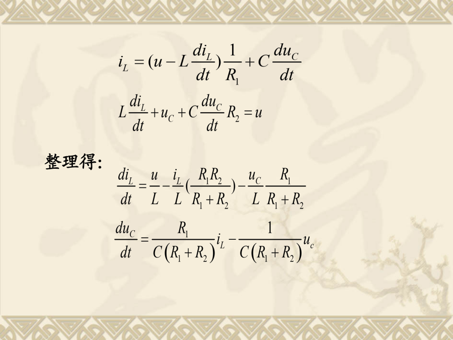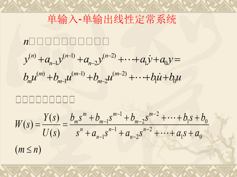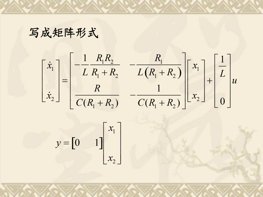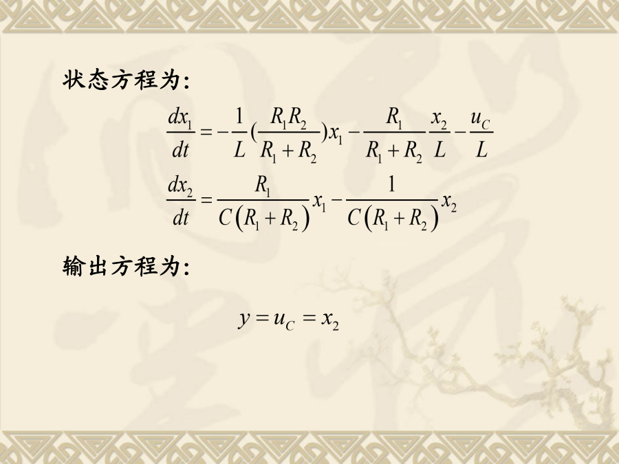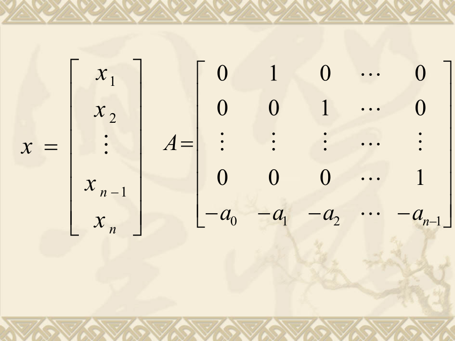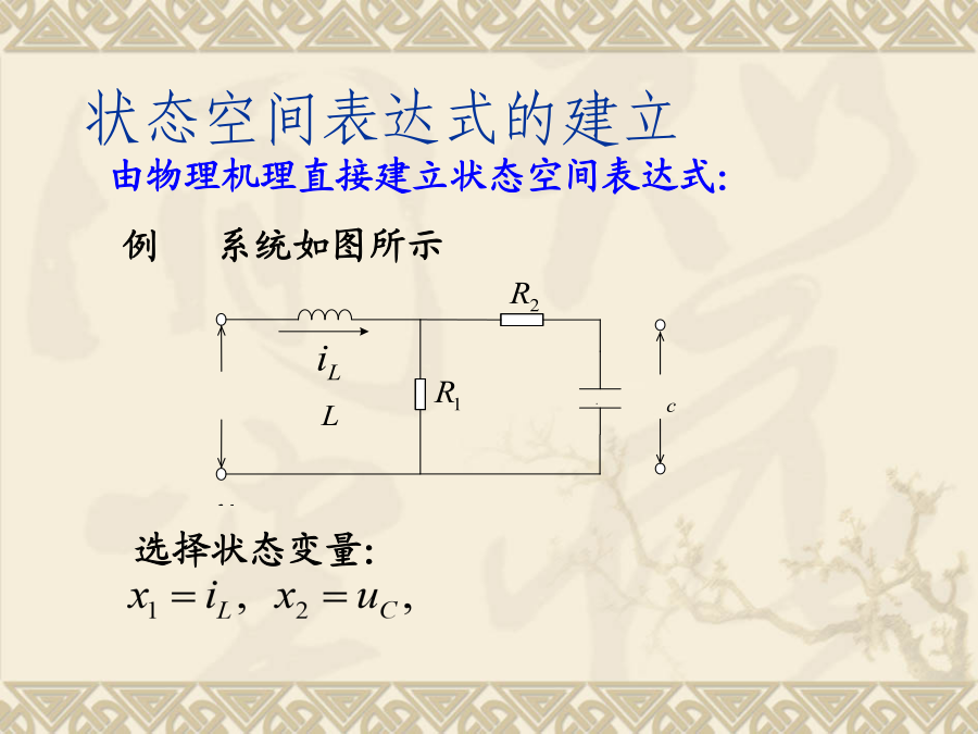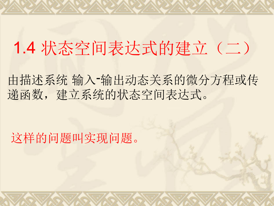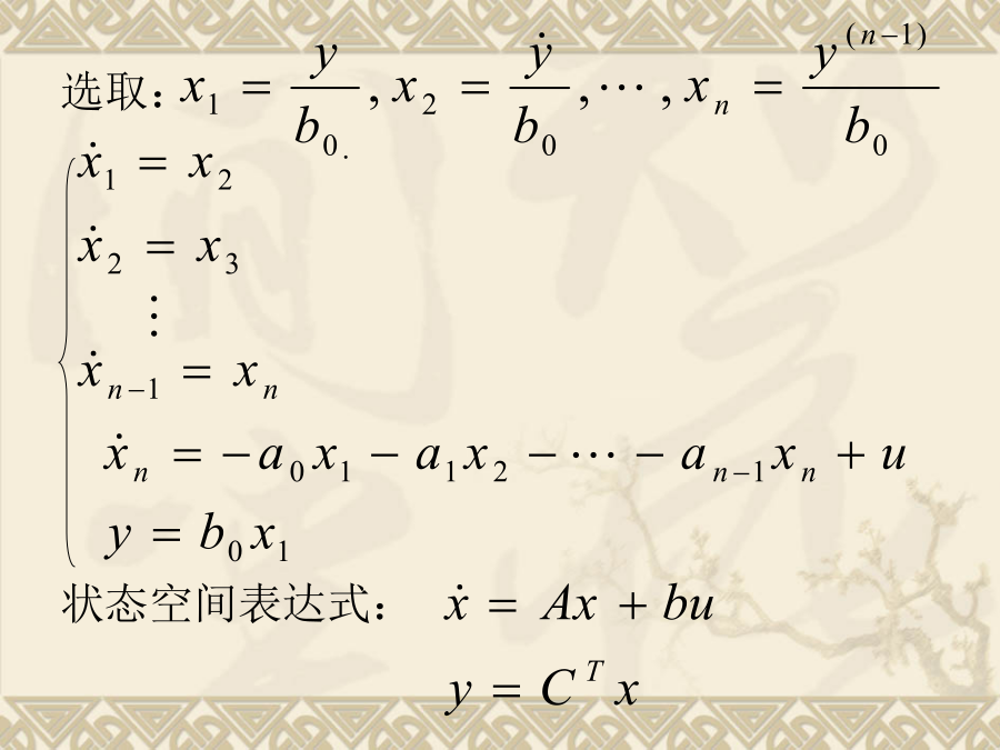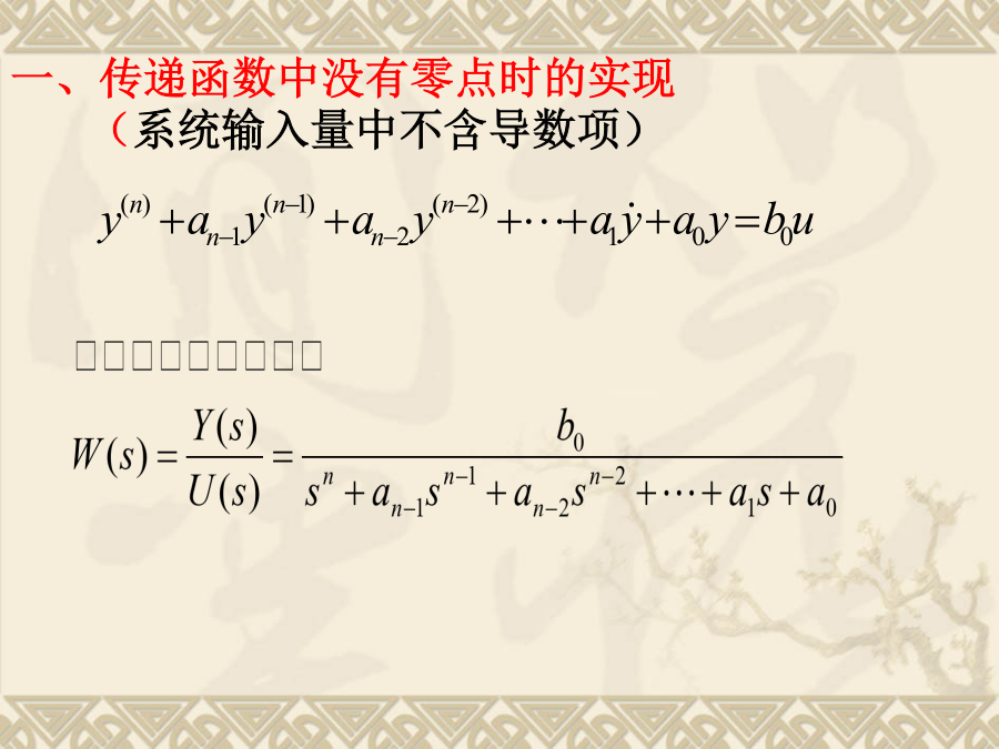 现代控制理论状态空间表达式的建立状态方程为:写成矩阵形式由描述系统输入-输出动态关系的微分方程或传递函数,建立系统的状态空间表达式。这样的问题叫实现问题。单输入-单输出线性定常系统一、传递函数中没有零点时的实现(系统输入量中不含导数项)选取:状态空间表达式:例1设求(A,B,C,D)解:选则:状态空间表达式为2)系统输入量中含有导数项如果单输入—单输出系统的微分方程为:一般输入量中导数项的次数小于或等于系统的次数n。为了避免在状态方程中出现u的导数项,可以选择如下的一组状态变量。系统的状态方程:可写成向量-矩阵的形式:即:例:已知下列传递函数,试用直接分解法建立其状态空间表达式,并画出状态变量图。即:由上式可得状态变量图如下:由状态变量图直接求得能控标准型状态空间表达式(2)解由已知得:得:状态表达式如下:例:已知系统传递函数为(2)可观测标准型例:已知系统传递函数可得约当型动态方程