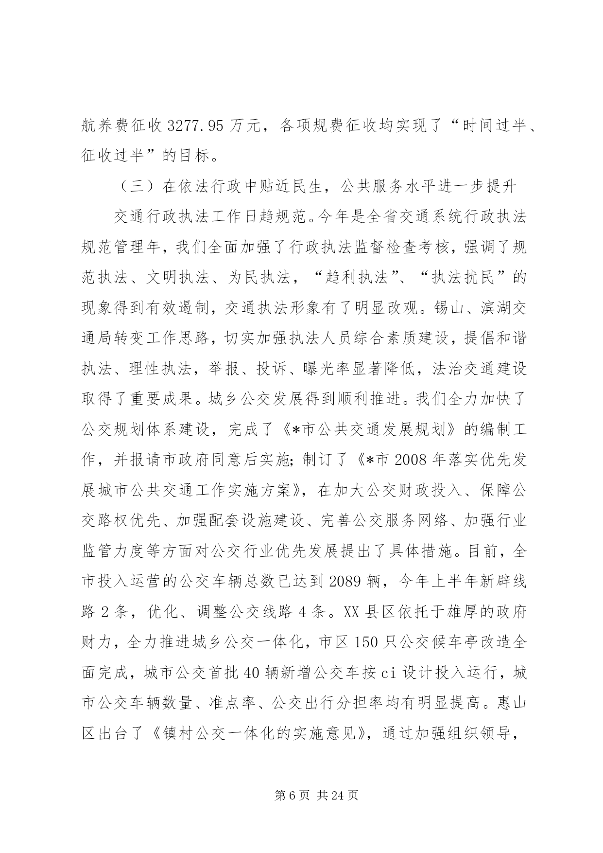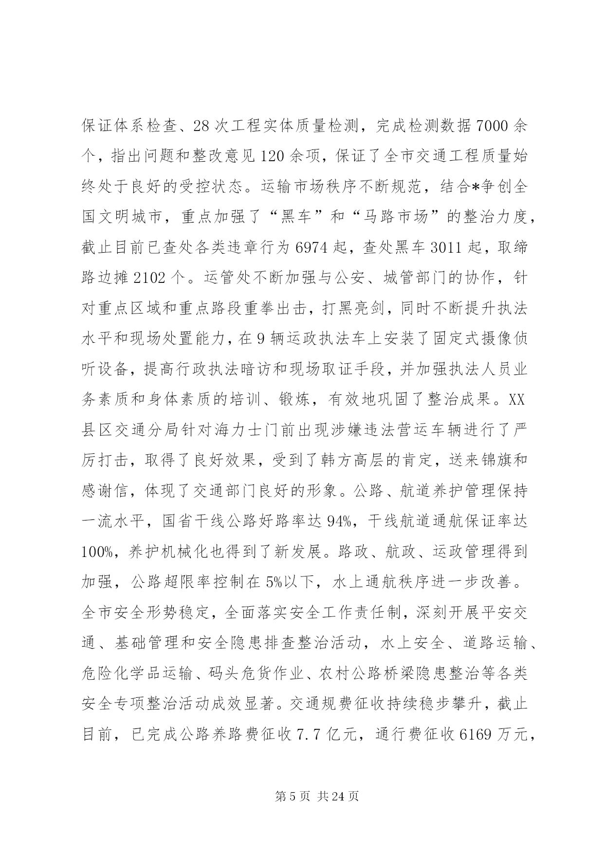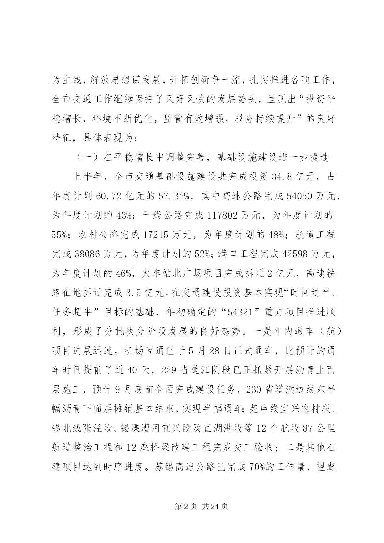 第PAGE\*Arabic\*MERGEFORMAT24页共NUMPAGES\*MERGEFORMAT24页市交通系统半年总结讲话同志们:今天会议的主要任务是。认真贯彻落实市委十一届六次全会精神,科学总结上半年交通工作经验和成绩,准确把握当前发展形势和任务,动员全市交通系统干部职工,深入解放思想,致力创新突破,为又好又快完成年度发展目标,奋力攀登交通率先基本现代化的新高峰而努力奋斗。市委十一届六次全会上,杨卫泽书记要求全市各级领导干部要继续解放思想,大胆突破创新,以高度的政治自觉和果敢的转型决心,以进取的精神状态和务实的具体行动,在科学发展道路上加快跨越步伐,不断增创新时期*发展的新优势。“经济发展,交通先行”,肩负着“在率先中先行”光荣使命的交通人,特别是交通系统各级领导干部必须要始终站在思想解放、创新突破的最前沿,以更大的决心和勇气,着力解决好交通系统干部群众头脑中“不会发展、不善创新”的问题,引导全系统上下打开视野、激活思路、凝聚共识,推动新一轮发展的大跨越。下面结合当前交通事业发展的新形势、新任务、新要求,我着重讲三个方面意见,请大家研究讨论。一、上半年全市交通工作进展情况今年以来,在市委市政府和省交通厅的正确领导下,全市交通系统坚持以科学发展观为指导,以构建现代综合交通运输体系为主线,解放思想谋发展,开拓创新争一流,扎实推进各项工作,全市交通工作继续保持了又好又快的发展势头,呈现出“投资平稳增长,环境不断优化,监管有效增强,服务持续提升”的良好特征,具体表现为:(一)在平稳增长中调整完善,基础设施建设进一步提速上半年,全市交通基础设施建设共完成投资34.8亿元,占年度计划60.72亿元的57.32%,其中高速公路完成54050万元,为年度计划的43%;干线公路完成117802万元,为年度计划的55%;农村公路完成17215万元,为年度计划的48%;航道工程完成38086万元,为年度计划的52%;港口工程完成42598万元,为年度计划的46%,火车站北广场项目完成拆迁2亿元,高速铁路征地拆迁完成3.5亿元。在交通建设投资基本实现“时间过半、任务超半”目标的基础,年初确定的“54321”重点项目推进顺利,形成了分批次分阶段发展的良好态势。一是年内通车(航)项目进展迅速。机场互通已于5月28日正式通车,比预计的通车时间提前了近40天,229省道江阴段已正抓紧开展沥青上面层施工,预计9月底前全面完成建设任务,230省道渎边线东半幅沥青下面层摊铺基本结束,实现半幅通车;芜申线宜兴农村段、锡北线张泾段、锡溧漕河宜兴段及直湖港段等12个航段87公里航道整治工程和12座桥梁改建工程完成交工验收;二是其他在建项目达到时序进度。苏锡高速公路已完成70%的工作量,望虞河大桥6月6日顺利合拢,有望明年6月全面建成通车;锡张高速公路和104国道改造段、340省道江阴西段、232省道江阴段、240省道官林改线段等4个国省干线公路正按计划进度全面开展路基、桥涵施工;苏南运河“四改三”、申张线航道整治工程和江阴港三房巷集团有限公司、申夏港区5号码头、*港XX县区新港多用途码头、*港藕塘作业区等全面启动建设。三是前期工作克服困难加快推进。结合*产业结构调整转移和市域交通的整体布局,我们始终坚持狠抓前期工作,跨太湖高速公路、312国道*机场段改线、锡太高速公路、钱威路等项目多次召开协调会和论证会,前期工作超常规的加速推进。各地、各部门始终着眼于为全市优化发展打造良好的交通支撑保障,加快推进交通基础设施建设,取得了实实在在的成效。XX县区今年建设任务最重,在建公路里程达到159公里,工程项目多,规模大,等级高,工期紧,在XX县区委市政府的大力支持,通过精心组织,强化管理,不断提高工程建设组织化程度,保证了重点工程高效推进。XX县区积极创新观念,在徐霞客大道bt融资管理取得成果基础上,推进了与中交股份有限公司的战略合作,辖区内芙蓉大道西段、长山大道、暨南大道南段等“三路工程”继续实施bt融资模式,突破了资金瓶颈,实现了良好开局,目前已完成投资4亿元。惠山区交通局积极主动服务,积极投身到苏南运河“四改三”、京沪高铁等重点工程征地拆迁工作中去,为重点工程顺利推进作出了重要贡献。公路处切实履行职能,加强国省干线公路建设管理,今年又作为市政府的融资平台,计划融资7.5亿元用于国省干线公路建设。航道处通过积极不懈协调争取,使市政府将运河整治征地拆迁任务书下达到沿线政府,协调建立工程指挥部领导小组例会制度,市领导明确苏南运河*段整治工程协调推进会议原则上每月至少召开一次,吴建选副市长今年以来已深入航道一线主持召开了5次工程推进会,协调解决了大批工程前期难题,强力推进了工程的顺利实施。XX县区港口局狠抓集装箱运输发展,上半年又开辟了至大连方向的