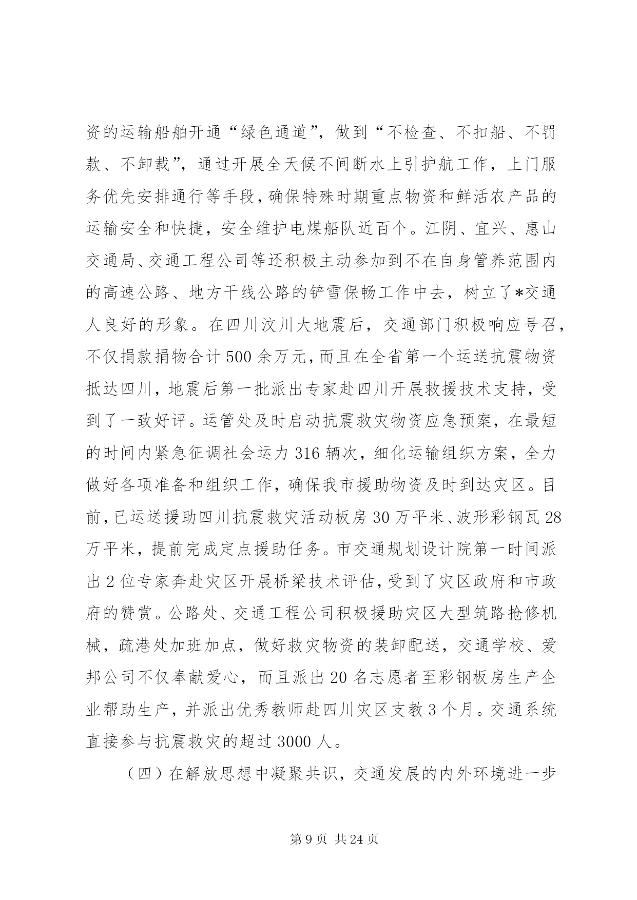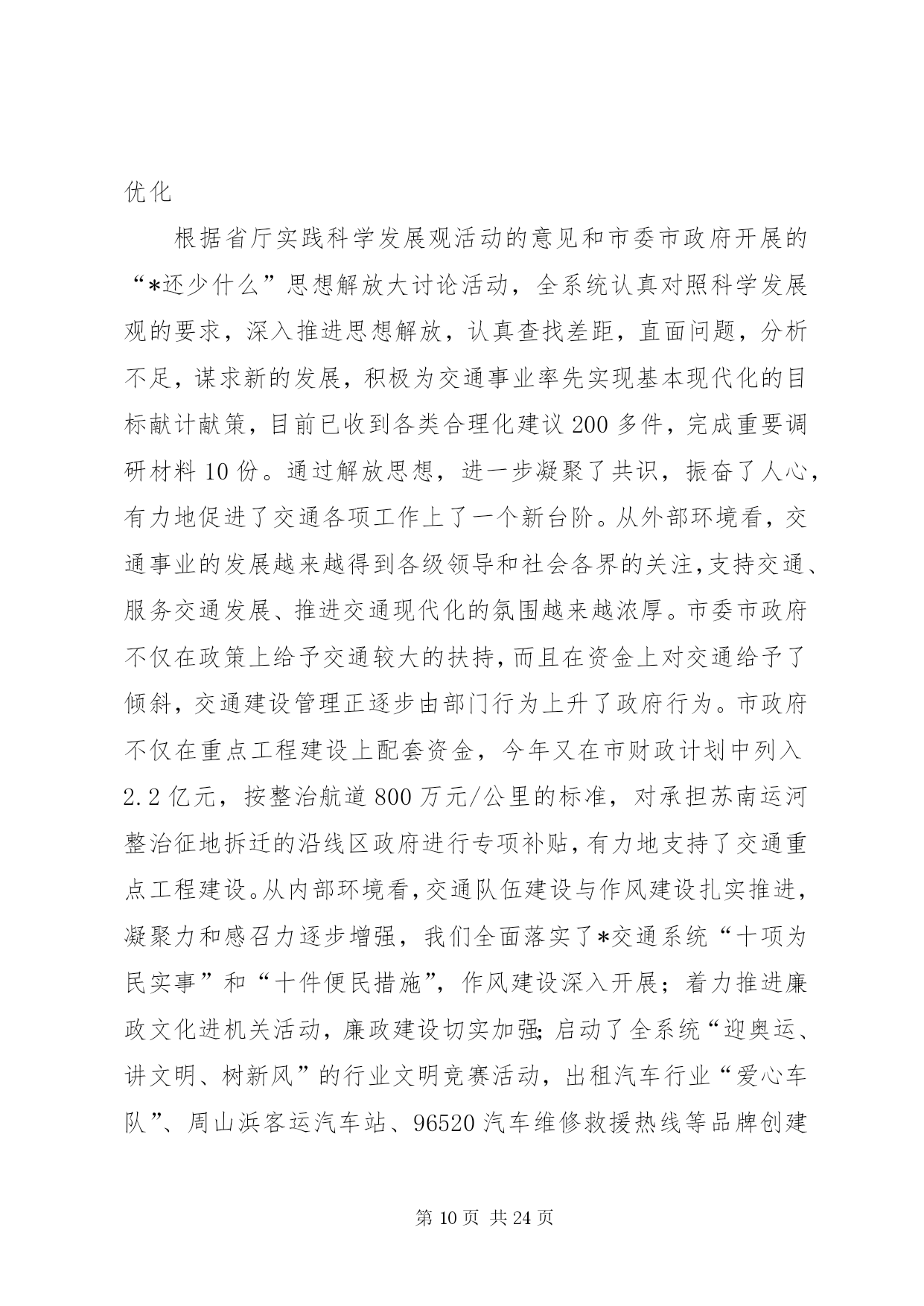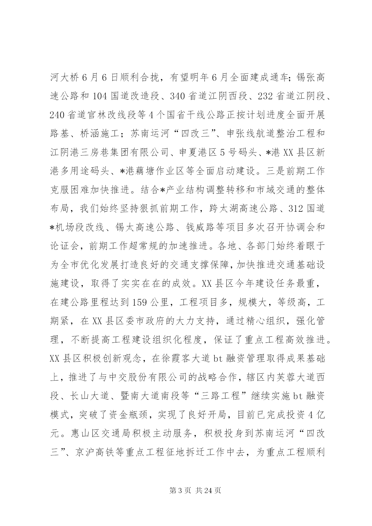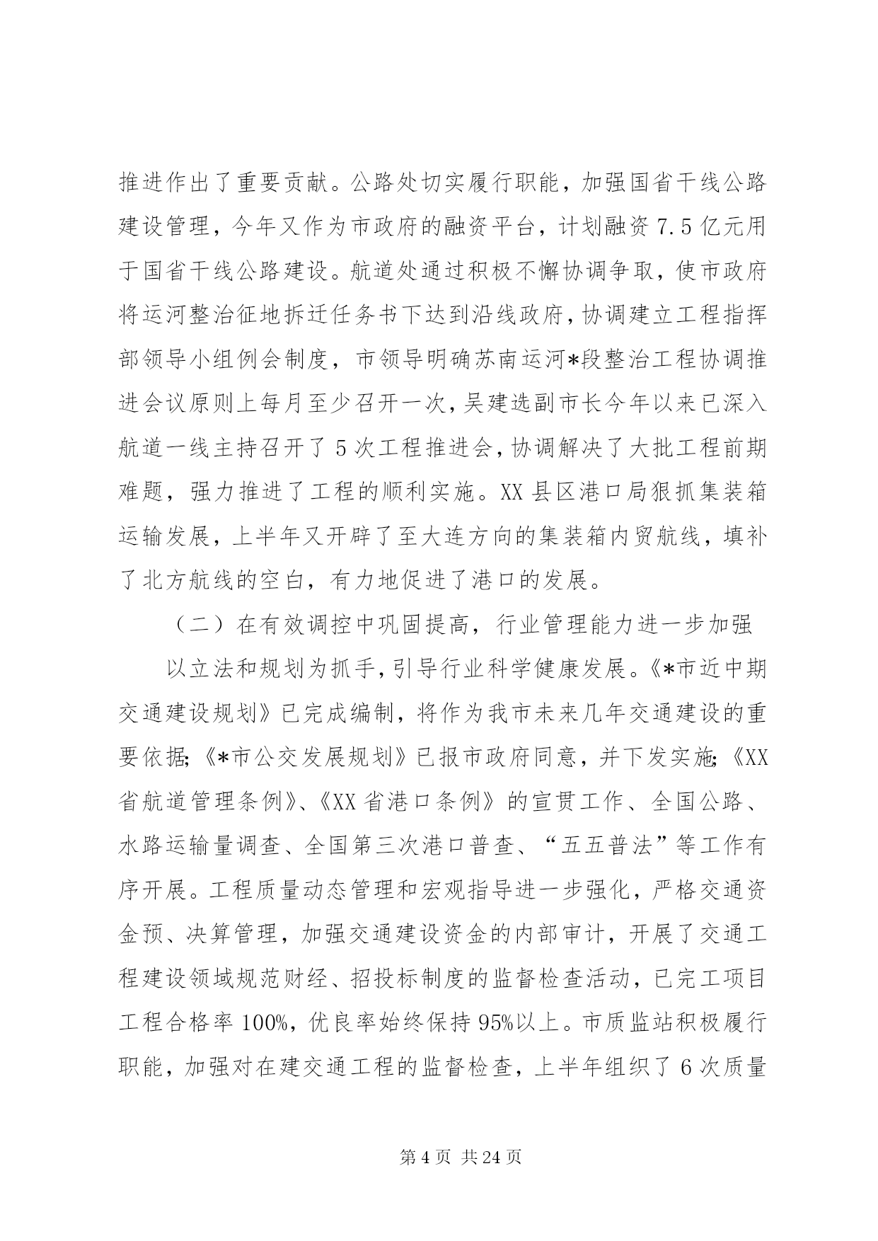 第PAGE\*Arabic\*MERGEFORMAT24页共NUMPAGES\*MERGEFORMAT24页市交通系统半年总结讲话同志们:今天会议的主要任务是。认真贯彻落实市委十一届六次全会精神,科学总结上半年交通工作经验和成绩,准确把握当前发展形势和任务,动员全市交通系统干部职工,深入解放思想,致力创新突破,为又好又快完成年度发展目标,奋力攀登交通率先基本现代化的新高峰而努力奋斗。市委十一届六次全会上,杨卫泽书记要求全市各级领导干部要继续解放思想,大胆突破创新,以高度的政治自觉和果敢的转型决心,以进取的精神状态和务实的具体行动,在科学发展道路上加快跨越步伐,不断增创新时期*发展的新优势。“经济发展,交通先行”,肩负着“在率先中先行”光荣使命的交通人,特别是交通系统各级领导干部必须要始终站在思想解放、创新突破的最前沿,以更大的决心和勇气,着力解决好交通系统干部群众头脑中“不会发展、不善创新”的问题,引导全系统上下打开视野、激活思路、凝聚共识,推动新一轮发展的大跨越。下面结合当前交通事业发展的新形势、新任务、新要求,我着重讲三个方面意见,请大家研究讨论。一、上半年全市交通工作进展情况今年以来,在市委市政府和省交通厅的正确领导下,全市交通系统坚持以科学发展观为指导,以构建现代综合交通运输体系为主线,解放思想谋发展,开拓创新争一流,扎实推进各项工作,全市交通工作继续保持了又好又快的发展势头,呈现出“投资平稳增长,环境不断优化,监管有效增强,服务持续提升”的良好特征,具体表现为:(一)在平稳增长中调整完善,基础设施建设进一步提速上半年,全市交通基础设施建设共完成投资34.8亿元,占年度计划60.72亿元的57.32%,其中高速公路完成54050万元,为年度计划的43%;干线公路完成117802万元,为年度计划的55%;农村公路完成17215万元,为年度计划的48%;航道工程完成38086万元,为年度计划的52%;港口工程完成42598万元,为年度计划的46%,火车站北广场项目完成拆迁2亿元,高速铁路征地拆迁完成3.5亿元。在交通建设投资基本实现“时间过半、任务超半”目标的基础,年初确定的“54321”重点项目推进顺利,形成了分批次分阶段发展的良好态势。一是年内通车(航)项目进展迅速。机场互通已于5月28日正式通车,比预计的通车时间提前了近40天,229省道江阴段已正抓紧开展沥青上面层施工,预计9月底前全面完成建设任务,230省道渎边线东半幅沥青下面层摊铺基本结束,实现半幅通车;芜申线宜兴农村段、锡北线张泾段、锡溧漕河宜兴段及直湖港段等12个航段87公里航道整治工程和12座桥梁改建工程完成交工验收;二是其他在建项目达到时序进度。苏锡高速公路已完成70%的工作量,望虞河大桥6月6日顺利合拢,有望明年6月全面建成通车;锡张高速公路和104国道改造段、340省道江阴西段、232省道江阴段、240省道官林改线段等4个国省干线公路正按计划进度全面开展路基、桥涵施工;苏南运河“四改三”、申张线航道整治工程和江阴港三房巷集团有限公司、申夏港区5号码头、*港XX县区新港多用途码头、*港藕塘作业区等全面启动建设。三是前期工作克服困难加快推进。结合*产业结构调整转移和市域交通的整体布局,我们始终坚持狠抓前期工作,跨太湖高速公路、312国道*机场段改线、锡太高速公路、钱威路等项目多次召开协调会和论证会,前期工作超常规的加速推进。各地、各部门始终着眼于为全市优化发展打造良好的交通支撑保障,加快推进交通基础设施建设,取得了实实在在的成效。XX县区今年建设任务最重,在建公路里程达到159公里,工程项目多,规模大,等级高,工期紧,在XX县区委市政府的大力支持,通过精心组织,强化管理,不断提高工程建设组织化程度,保证了重点工程高效推进。XX县区积极创新观念,在徐霞客大道bt融资管理取得成果基础上,推进了与中交股份有限公司的战略合作,辖区内芙蓉大道西段、长山大道、暨南大道南段等“三路工程”继续实施bt融资模式,突破了资金瓶颈,实现了良好开局,目前已完成投资4亿元。惠山区交通局积极主动服务,积极投身到苏南运河“四改三”、京沪高铁等重点工程征地拆迁工作中去,为重点工程顺利推进作出了重要贡献。公路处切实履行职能,加强国省干线公路建设管理,今年又作为市政府的融资平台,计划融资7.5亿元用于国省干线公路建设。航道处通过积极不懈协调争取,使市政府将运河整治征地拆迁任务书下达到沿线政府,协调建立工程指挥部领导小组例会制度,市领导明确苏南运河*段整治工程协调推进会议原则上每月至少召开一次,吴建选副市长今年以来已深入航道一线主持召开了5次工程推进会,协调解决了大批工程前期难题,强力推进了工程的顺利实施。XX县区港口局狠抓集装箱运输发展,上半年又开辟了至大连方向的