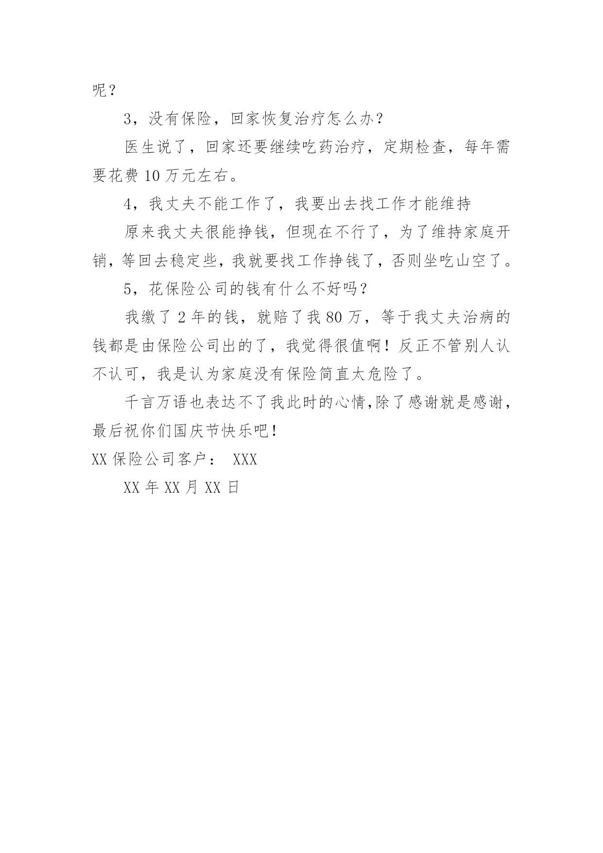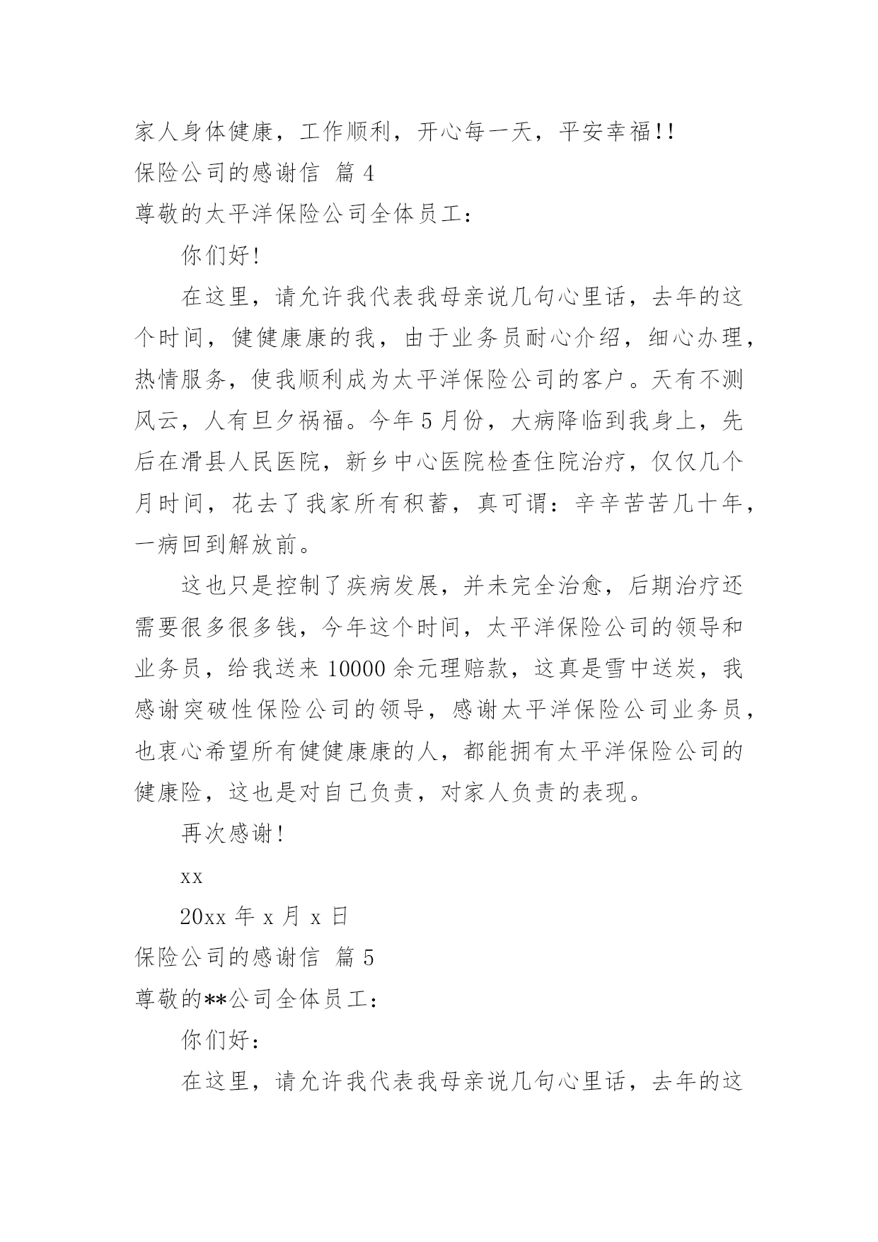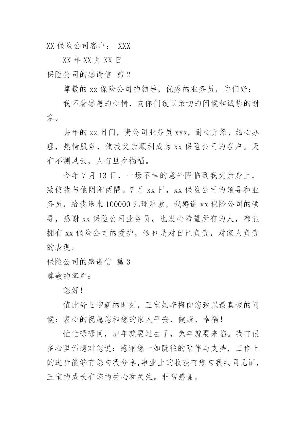 保险公司的感谢信保险公司的感谢信合集六篇在人们素养不断提高的今天,我们都可能会用到感谢信,写感谢信比口头感谢更加真挚。那么感谢信有什么格式呢?下面是小编为大家整理的保险公司的感谢信6篇,欢迎大家分享。保险公司的感谢信篇1尊敬的太平洋保险公司全体员工:你们好:在这里,请允许我代表我母亲说几句心里话,去年的这个时间,健健康康的我,由于业务员耐心介绍,细心办理,热情服务,使我顺利成为太平洋保险公司的客户。天有不测风云,人有旦夕祸福。今年5月份,大病降临到我身上,先后在滑县人民医院,新乡中心医院检查住院治疗,仅仅几个月时间,花去了我家所有积蓄,真可谓:辛辛苦苦几十年,一病回到解放前。这也只是控制了疾病发展,并未完全治愈,后期治疗还需要很多很多钱,今年这个时间,太平洋保险公司的领导和业务员,给我送来10000余元理赔款,这真是雪中送炭,我感谢突破性保险公司的领导,感谢太平洋保险公司业务员,也衷心希望所有健健康康的人,都能拥有太平洋保险公司的健康险,这也是对自己负责,对家人负责的表现。再次感谢!XX保险公司客户:XXXXX年XX月XX日保险公司的感谢信篇2尊敬的xx保险公司的领导,优秀的业务员,你们好:我怀着感恩的心情,向你们致以亲切的问候和诚挚的谢意。去年的xx时间,贵公司业务员xxx,耐心介绍,细心办理,热情服务,使我父亲顺利成为xx保险公司的客户。天有不测风云,人有旦夕祸福。今年7月13日,一场不幸的意外降临到我父亲身上,致使我与他阴阳两隔。7月xx日,xx保险公司的领导和业务员,给我送来100000元理赔款,我感谢xx保险公司的领导,感谢xx保险公司业务员,也衷心希望所有的人,都能拥有xx保险公司的爱护,这也是对自己负责,对家人负责的表现。保险公司的感谢信篇3尊敬的客户:您好!值此辞旧迎新的时刻,三宝妈李梅向您致以最真诚的问候:衷心的祝愿您和您的家人平安、健康、幸福!忙忙碌碌间,虎年就要过去了,兔年就要来临。我有很多心里话想对您说:感谢您一如既往的陪伴与支持,工作上的进步能够有您与我分享,事业上的收获有您与我共同见证,三宝的成长有您的关心和关注。非常感谢。我在年的工作中取得了很多成绩:首先通过不断地学习与努力,我已从一名普通的寿险代理人晋升为“综合客户经理人”,并借助平安以保险为核心,集证券、银行等综合金融业务为一体的服务平台,为您提供了寿险、银行、健康、财险、车险等全方面的服务;其次我已成为平安荣誉组织“钻石俱乐部”的连续30个月的钻石会员;并迈向了平安讲师发展的道路,成为真正的讲师。在今年年初2月份又通过近3个月的学习取得了rfc国际理财规划师的资格证书。年全年达成国际华人ida寿险龙奖。这些都离不开您的厚爱与帮助。从您选择我来为您提供服务的那一刻起,我就说过:“我为您的提供的服务才刚刚开始,我要为您提供专属的个性化的服务”,我也一直在为此而努力奋斗。作为一名客户经理人,为您提供专业的寿险及理财服务是基础,很希望通过用心的服务可以成为您的朋友,成为您的“准家人”,成为您的好帮手,有事情了您会第一时间想到我,有荣誉了我也可以有机会分享您的喜悦。我做到了,慢慢会成为更多家庭的“贴心人”。很憧憬十年二十年后,我们聚在一起共同回忆最初相识的场面,那该是多么温馨的一个场景!中国的寿险市场已进入黄金发展的十年,很荣幸能够在这样的一个朝阳行业发展。天时、地利、人和,我相信我必将在寿险舞台上获得属于我的'成功,而我的成功也必将成为您的荣耀,请您来见证我的成长与发展,并帮助我加快走向成功的步伐。新一年的临近,对于年,我树立了更为明确的目标,还请您来监督:一、在稳定发展业务,帮助更多家庭拥有保障,建立理财体系的同时,全力地帮助客户做到很好的消费、投保、储蓄、规划、理财是我的工作使命。希望您能将我推荐给您身边的亲人和朋友,让她们(他们)同享我的优质服务。二、继续追逐我的国际龙奖ida,以更高的身份为您提供与您匹配且更优质的服务;三、成为平安正式的星级讲师,将更多的经验和方法与新人分享,更多地为新人扫除在成长道路上的荆棘。对于新的一年,如果您有什么新的目标,也请告诉我,我们互相鼓励,携手前行,,共同成长!最后告诉您一个确切的消息:年平安的业绩稳居市场第一,所占北京寿险市场份额近50%,为了缓解市场竞争压力,保监会强令平安于年2月28日前正式停售目前所有存期五年以下的人民币理财产品,为避免您的权益受损失,请您关注!举例如下:宝宝0岁,年存5万,存期5年;拥有如下利益:1、从储蓄的第二年起每隔一年返还1万元,直至59岁;60岁以后每年返6千元;同时平均每年还有一笔约7千元的分红,直至终身;这两笔分红如不领取,将会额外获得3.5%的复利计息。此产品是做为子女教育金、养老金、解冻家庭冰山储蓄最好的工具,最低总额10万元起存,分三、五年存入。如果您或您的朋