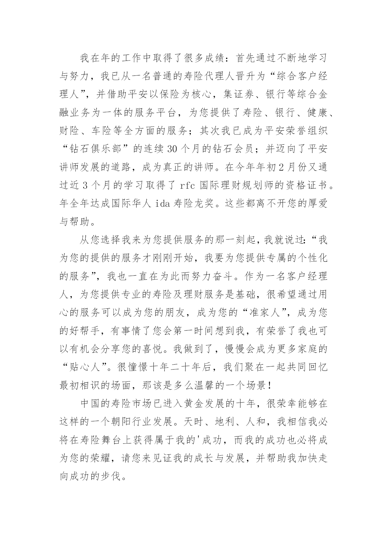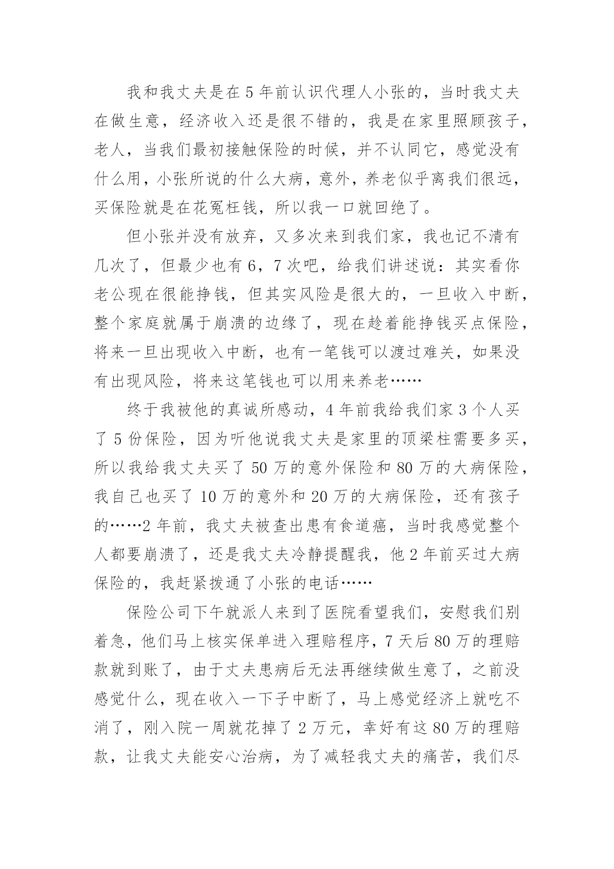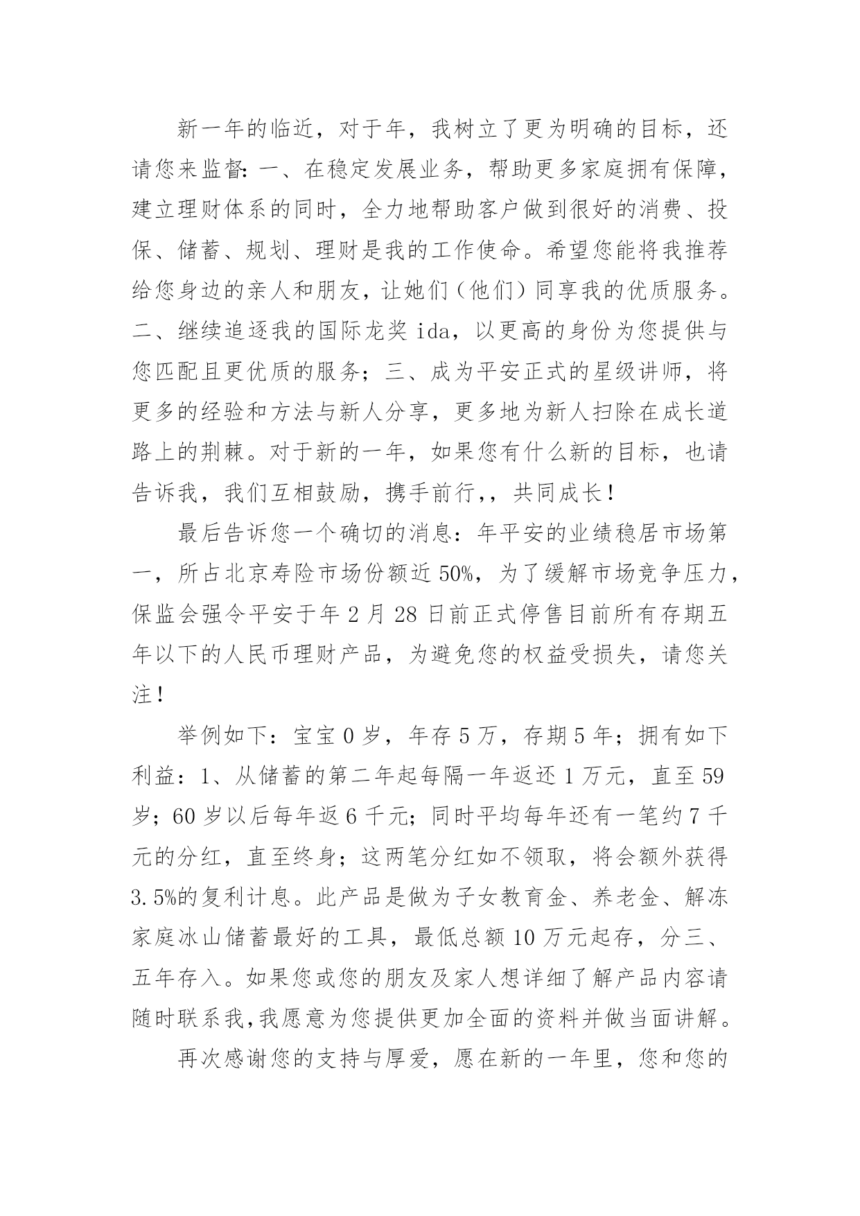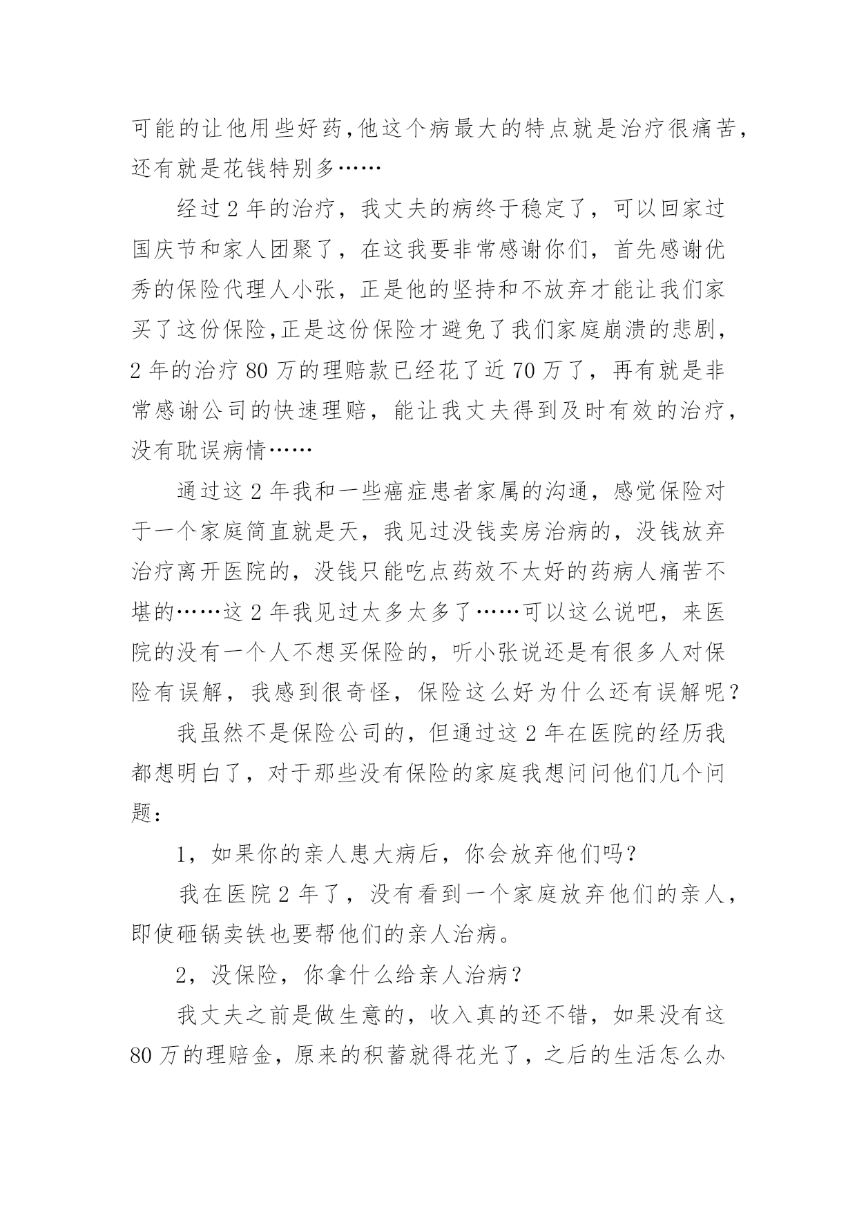 保险公司的感谢信保险公司的感谢信合集六篇在人们素养不断提高的今天,我们都可能会用到感谢信,写感谢信比口头感谢更加真挚。那么感谢信有什么格式呢?下面是小编为大家整理的保险公司的感谢信6篇,欢迎大家分享。保险公司的感谢信篇1尊敬的太平洋保险公司全体员工:你们好:在这里,请允许我代表我母亲说几句心里话,去年的这个时间,健健康康的我,由于业务员耐心介绍,细心办理,热情服务,使我顺利成为太平洋保险公司的客户。天有不测风云,人有旦夕祸福。今年5月份,大病降临到我身上,先后在滑县人民医院,新乡中心医院检查住院治疗,仅仅几个月时间,花去了我家所有积蓄,真可谓:辛辛苦苦几十年,一病回到解放前。这也只是控制了疾病发展,并未完全治愈,后期治疗还需要很多很多钱,今年这个时间,太平洋保险公司的领导和业务员,给我送来10000余元理赔款,这真是雪中送炭,我感谢突破性保险公司的领导,感谢太平洋保险公司业务员,也衷心希望所有健健康康的人,都能拥有太平洋保险公司的健康险,这也是对自己负责,对家人负责的表现。再次感谢!XX保险公司客户:XXXXX年XX月XX日保险公司的感谢信篇2尊敬的xx保险公司的领导,优秀的业务员,你们好:我怀着感恩的心情,向你们致以亲切的问候和诚挚的谢意。去年的xx时间,贵公司业务员xxx,耐心介绍,细心办理,热情服务,使我父亲顺利成为xx保险公司的客户。天有不测风云,人有旦夕祸福。今年7月13日,一场不幸的意外降临到我父亲身上,致使我与他阴阳两隔。7月xx日,xx保险公司的领导和业务员,给我送来100000元理赔款,我感谢xx保险公司的领导,感谢xx保险公司业务员,也衷心希望所有的人,都能拥有xx保险公司的爱护,这也是对自己负责,对家人负责的表现。保险公司的感谢信篇3尊敬的客户:您好!值此辞旧迎新的时刻,三宝妈李梅向您致以最真诚的问候:衷心的祝愿您和您的家人平安、健康、幸福!忙忙碌碌间,虎年就要过去了,兔年就要来临。我有很多心里话想对您说:感谢您一如既往的陪伴与支持,工作上的进步能够有您与我分享,事业上的收获有您与我共同见证,三宝的成长有您的关心和关注。非常感谢。我在年的工作中取得了很多成绩:首先通过不断地学习与努力,我已从一名普通的寿险代理人晋升为“综合客户经理人”,并借助平安以保险为核心,集证券、银行等综合金融业务为一体的服务平台,为您提供了寿险、银行、健康、财险、车险等全方面的服务;其次我已成为平安荣誉组织“钻石俱乐部”的连续30个月的钻石会员;并迈向了平安讲师发展的道路,成为真正的讲师。在今年年初2月份又通过近3个月的学习取得了rfc国际理财规划师的资格证书。年全年达成国际华人ida寿险龙奖。这些都离不开您的厚爱与帮助。从您选择我来为您提供服务的那一刻起,我就说过:“我为您的提供的服务才刚刚开始,我要为您提供专属的个性化的服务”,我也一直在为此而努力奋斗。作为一名客户经理人,为您提供专业的寿险及理财服务是基础,很希望通过用心的服务可以成为您的朋友,成为您的“准家人”,成为您的好帮手,有事情了您会第一时间想到我,有荣誉了我也可以有机会分享您的喜悦。我做到了,慢慢会成为更多家庭的“贴心人”。很憧憬十年二十年后,我们聚在一起共同回忆最初相识的场面,那该是多么温馨的一个场景!中国的寿险市场已进入黄金发展的十年,很荣幸能够在这样的一个朝阳行业发展。天时、地利、人和,我相信我必将在寿险舞台上获得属于我的'成功,而我的成功也必将成为您的荣耀,请您来见证我的成长与发展,并帮助我加快走向成功的步伐。新一年的临近,对于年,我树立了更为明确的目标,还请您来监督:一、在稳定发展业务,帮助更多家庭拥有保障,建立理财体系的同时,全力地帮助客户做到很好的消费、投保、储蓄、规划、理财是我的工作使命。希望您能将我推荐给您身边的亲人和朋友,让她们(他们)同享我的优质服务。二、继续追逐我的国际龙奖ida,以更高的身份为您提供与您匹配且更优质的服务;三、成为平安正式的星级讲师,将更多的经验和方法与新人分享,更多地为新人扫除在成长道路上的荆棘。对于新的一年,如果您有什么新的目标,也请告诉我,我们互相鼓励,携手前行,,共同成长!最后告诉您一个确切的消息:年平安的业绩稳居市场第一,所占北京寿险市场份额近50%,为了缓解市场竞争压力,保监会强令平安于年2月28日前正式停售目前所有存期五年以下的人民币理财产品,为避免您的权益受损失,请您关注!举例如下:宝宝0岁,年存5万,存期5年;拥有如下利益:1、从储蓄的第二年起每隔一年返还1万元,直至59岁;60岁以后每年返6千元;同时平均每年还有一笔约7千元的分红,直至终身;这两笔分红如不领取,将会额外获得3.5%的复利计息。此产品是做为子女教育金、养老金、解冻家庭冰山储蓄最好的工具,最低总额10万元起存,分三、五年存入。如果您或您的朋