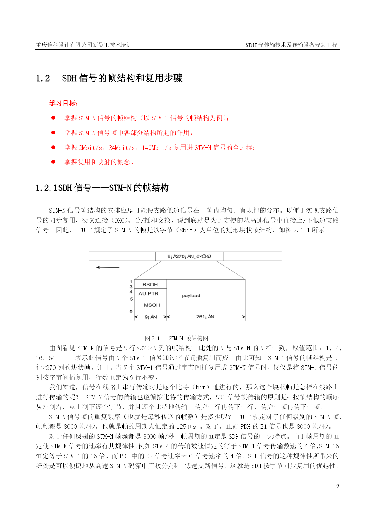 第五章SDH网络结构和网络保护机理重庆信科设计有限公司新员工技术培训SDH光传输技术及传输设备安装工程PAGEPAGE50重庆信科设计有限公司新员工技术培训——SDH光传输技术及传输设备安装工程授课人:殷茜2004-7-8TOC\o"1-3"\h\zHYPERLINK\l"_Toc76987325"第一章SDH传输技术理论基础PAGEREF_Toc76987325\h4HYPERLINK\l"_Toc76987326"1.1SDH概述PAGEREF_Toc76987326\h4HYPERLINK\l"_Toc76987327"1.1.1SDH产生的技术背景——为什么会产生SDH传输体制PAGEREF_Toc76987327\h4HYPERLINK\l"_Toc76987328"1.1.2与PDH相比SDH有哪些优势PAGEREF_Toc76987328\h6HYPERLINK\l"_Toc76987329"1.1.3SDH的缺陷所在PAGEREF_Toc76987329\h8HYPERLINK\l"_Toc76987330"1.2SDH信号的帧结构和复用步骤PAGEREF_Toc76987330\h9HYPERLINK\l"_Toc76987331"1.2.1SDH信号——STM-N的帧结构PAGEREF_Toc76987331\h9HYPERLINK\l"_Toc76987332"1.2.2SDH的复用结构和步骤PAGEREF_Toc76987332\h10HYPERLINK\l"_Toc76987333"1.1.1140Mbit/s复用进STM-N信号PAGEREF_Toc76987333\h12HYPERLINK\l"_Toc76987334"1.1.234Mbit/s复用进STM-N信号PAGEREF_Toc76987334\h15HYPERLINK\l"_Toc76987335"1.1.32Mbit/s复用进STM-N信号PAGEREF_Toc76987335\h16HYPERLINK\l"_Toc76987336"1.2.3映射、定位和复用的概念PAGEREF_Toc76987336\h18HYPERLINK\l"_Toc76987337"1.1.4异步映射PAGEREF_Toc76987337\h19HYPERLINK\l"_Toc76987338"1.1.5比特同步映射PAGEREF_Toc76987338\h19HYPERLINK\l"_Toc76987339"1.1.6字节同步映射PAGEREF_Toc76987339\h19HYPERLINK\l"_Toc76987340"1.1.7浮动VC模式PAGEREF_Toc76987340\h19HYPERLINK\l"_Toc76987341"1.3SDH的开销PAGEREF_Toc76987341\h22HYPERLINK\l"_Toc76987342"1.3.1开销PAGEREF_Toc76987342\h22HYPERLINK\l"_Toc76987343"1.3.2指针PAGEREF_Toc76987343\h32HYPERLINK\l"_Toc76987344"1.4SDH网络结构和网络保护机理PAGEREF_Toc76987344\h36HYPERLINK\l"_Toc76987345"1.4.1基本的网络拓扑结构PAGEREF_Toc76987345\h36HYPERLINK\l"_Toc76987346"1.4.2链网和自愈环PAGEREF_Toc76987346\h38HYPERLINK\l"_Toc76987347"1.4.3复杂网络的拓扑结构及特点PAGEREF_Toc76987347\h46HYPERLINK\l"_Toc76987348"1.4.4SDH网络的整体层次结构PAGEREF_Toc76987348\h48HYPERLINK\l"_Toc76987349"1.5光接口类型和参数PAGEREF_Toc76987349\h51HYPERLINK\l"_Toc76987350"1.5.1光纤的种类PAGER