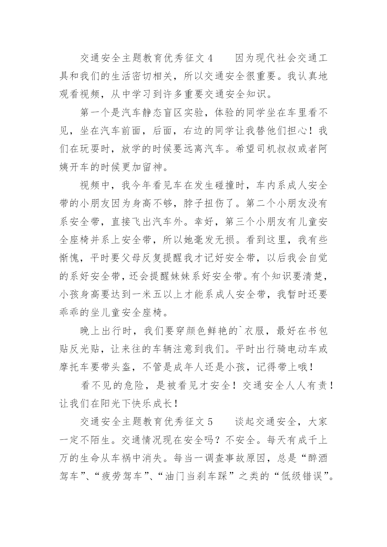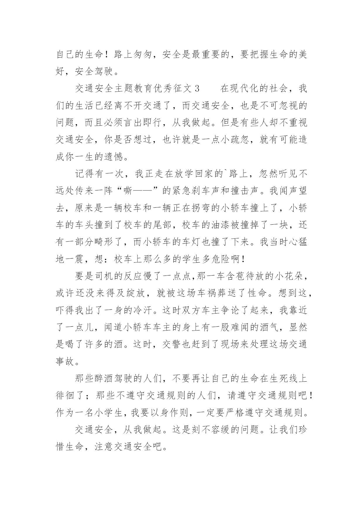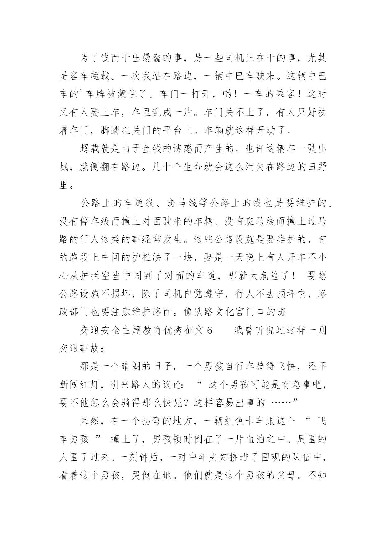 交通安全主题教育优秀征文交通安全主题教育优秀征文范文400字(通用7篇)在平时的学习、工作或生活中,大家都经常看到征文的身影吧,征文一般都具有精彩的开头,给人耳目一新的感觉。那么你知道一篇好的征文该怎么写吗?以下是小编为大家收集的交通安全主题教育优秀征文范文400字(通用7篇),仅供参考,希望能够帮助到大家。交通安全主题教育优秀征文1交通安全从我做起人生中最宝贵的是生命,然而有些人交通安全的意识淡薄,导致生命就像那薄薄的蝉翼一样脆弱,每当我们看到那触目惊心的车祸惨景时,能不感到痛心疾首吗?在此,我要告诉朋友们,为了您和他人的生命安全,请自觉遵守交通法规,注意道路安全。我曾从电视新闻上听到这样一个故事:一个五岁的小男孩在路边玩皮球,一不留神,球滚到了马路上,小男孩连忙跑到马路上去捡球,突然一辆满载货物的大卡车飞奔而来,还没等男孩反应过来,已经被沉重的车轮压倒在地……一个可爱的生命顿时凋零了,他的家人陷入了无尽的'悲痛之中,可那个曾经天真可爱的小男孩永远也不可能回来了……同学们,蔚蓝的大海里鱼儿自由自在的游玩,碧蓝的天空中,鸟儿欢快的歌唱。我们是祖国的花朵,明天的接班人,这个世界最生机盎然的就是生命,作为小学生,我们应当学会保护自己,养成文明行走的良好习惯。让我们从现在做起,从我做起,从每一件小事做起,维护交通安全,远离伤痛和哭泣,平平安安的生活,快快乐乐的学习,共同撑起生命的蓝天。交通安全主题教育优秀征文2就在道路交通事业飞黄腾达的今天,曾经叹而观止,而今天却不值得一提的私家车,电动车已成为了主宰这整个交通道路的工具。然而,在这些表面华丽的背后,隐藏着多少交通隐患啊?曾经看到这样一则公益广告:“爸爸,红灯亮着,为什么这些人还在行驶呢?”“这些都是坏毛病,得慢慢改。”“可是,连我们小朋友都知道‘红灯停,绿灯行’难道你们不知道吗?”这时,会有一句响亮的旁白:“为了言传身教,请注意交通安全!”这则广告也许说不上经典,谈不上特殊,可就是这么普通的一句话,有几个人放在心上?又有几个人注意到交通安全的重要呢?赶时间,往往是出现事故的主要原因之一。有人为了争时间,拼命地向前冲,当黄灯在眨眼时,人已在马路中央了,真是进退两难!事故就这样无情的发生了。所谓“能等三分,不急一秒”也有人缺乏耐心或因为急事,看周围没有人就放心地前行,有谁能料到事故会不会发生呢?人的生命只有一次,有什么比生命还重要的呢?何必要拿生命做赌注呢?还有酒后驾车,不系安全带也是发生事故的'原因。经常和马路,交通打交道的朋友们,注意脚下,珍惜好自己的生命!路上匆匆,安全是最重要的,要把握生命的美好,安全驾驶。交通安全主题教育优秀征文3在现代化的社会,我们的生活已经离不开交通了,而交通安全,也是不可忽视的问题,而且必须言出即行,从我做起。但是有些人却不重视交通安全,你是否想过,也许就是一点小疏忽,就有可能造成你一生的遗憾。记得有一次,我正走在放学回家的`路上,忽然听见不远处传来一阵“嘶——”的紧急刹车声和撞击声。我闻声望去,原来是一辆校车和一辆正在拐弯的小轿车撞上了,小轿车的车头撞到了校车的尾部,校车的油漆被撞掉了一块,还有一部分畸形了,而小轿车的车灯也撞了下来。我当时心猛地一震,想:校车上那么多的学生多危险啊!要是司机的反应慢了一点点,那一车含苞待放的小花朵,或许还没来得及绽放,就被这场车祸葬送了性命。想到这,吓得我出了一身的冷汗。这时双方车主争论了起来,我靠近了一点儿,闻道小轿车车主的身上有一股难闻的酒气,显然是喝了许多的酒。这时,交警也赶到了现场来处理这场交通事故。那些醉酒驾驶的人们,不要再让自己的生命在生死线上徘徊了;那些不遵守交通规则的人们,请遵守交通规则吧!作为一名小学生,我要以身作则,一定要严格遵守交通规则。交通安全,从我做起。这是刻不容缓的问题。让我们珍惜生命,注意交通安全吧。交通安全主题教育优秀征文4因为现代社会交通工具和我们的生活密切相关,所以交通安全很重要。我认真地观看视频,从中学习到许多重要交通安全知识。第一个是汽车静态盲区实验,体验的同学坐在车里看不见,坐在汽车前面,后面,右边的同学让我替他们担心!我们在玩耍时,放学的时候要远离汽车。希望司机叔叔或者阿姨开车的时候更加留神。视频中,我今年看见车在发生碰撞时,车内系成人安全带的小朋友因为身高不够,脖子扭伤了。第二个小朋友没有系安全带,直接飞出汽车外。幸好,第三个小朋友有儿童安全座椅并系上安全带,所以她毫发无损。看到这里,我有些惭愧,平时要父母反复提醒我才记好安全带,以后我会自觉的系好安全带,还会提醒妹妹系好安全带。有个知识要清楚,小孩身高要达到一米五以上才能系成人安全带,我暂时还要乖乖的坐儿童安全座椅。晚上出行时,我们要穿颜色鲜艳的`衣服,最好在书包贴反光贴,让来往的车辆注意到我们。平时出行骑电动车或摩托