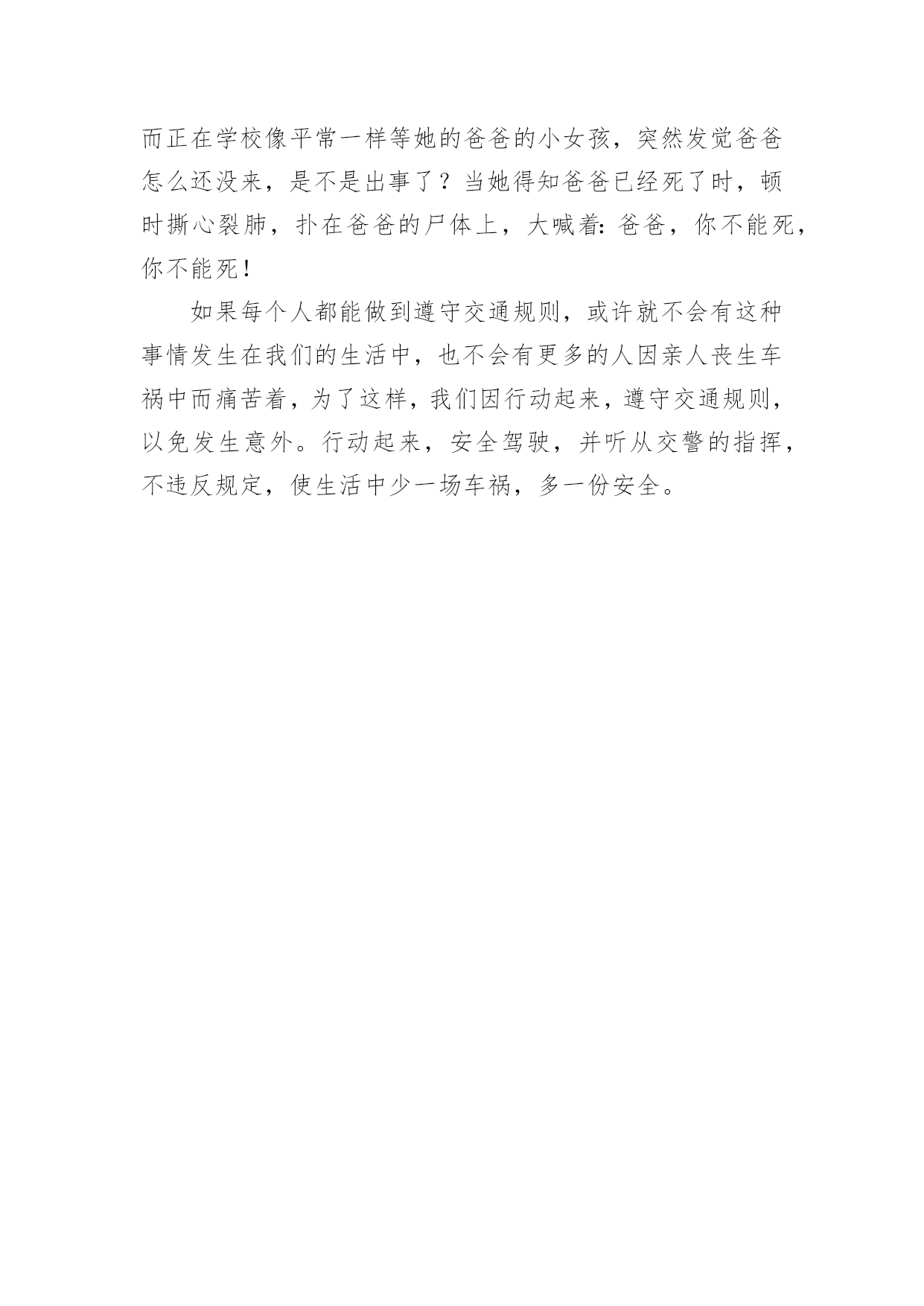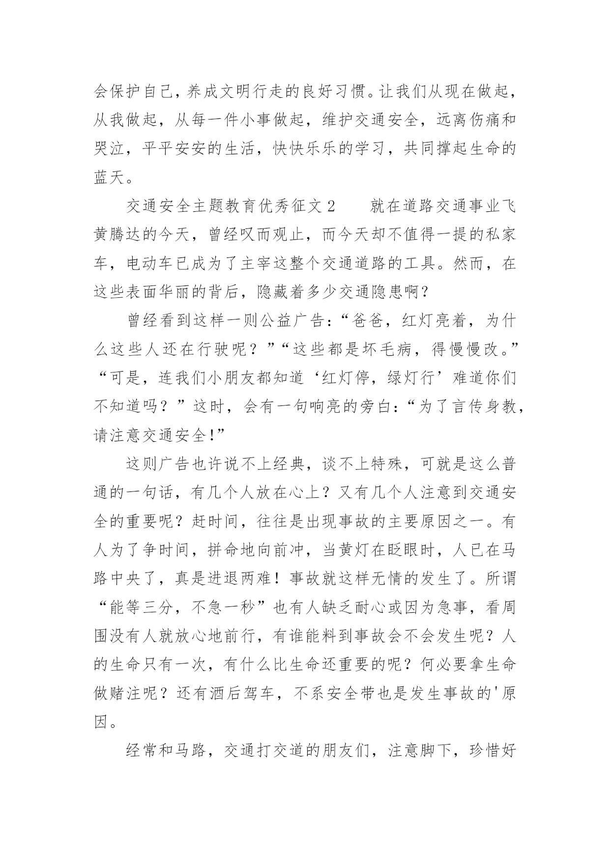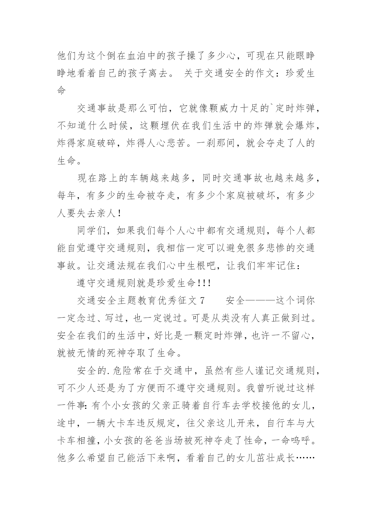 交通安全主题教育优秀征文交通安全主题教育优秀征文范文400字(通用7篇)在平时的学习、工作或生活中,大家都经常看到征文的身影吧,征文一般都具有精彩的开头,给人耳目一新的感觉。那么你知道一篇好的征文该怎么写吗?以下是小编为大家收集的交通安全主题教育优秀征文范文400字(通用7篇),仅供参考,希望能够帮助到大家。交通安全主题教育优秀征文1交通安全从我做起人生中最宝贵的是生命,然而有些人交通安全的意识淡薄,导致生命就像那薄薄的蝉翼一样脆弱,每当我们看到那触目惊心的车祸惨景时,能不感到痛心疾首吗?在此,我要告诉朋友们,为了您和他人的生命安全,请自觉遵守交通法规,注意道路安全。我曾从电视新闻上听到这样一个故事:一个五岁的小男孩在路边玩皮球,一不留神,球滚到了马路上,小男孩连忙跑到马路上去捡球,突然一辆满载货物的大卡车飞奔而来,还没等男孩反应过来,已经被沉重的车轮压倒在地……一个可爱的生命顿时凋零了,他的家人陷入了无尽的'悲痛之中,可那个曾经天真可爱的小男孩永远也不可能回来了……同学们,蔚蓝的大海里鱼儿自由自在的游玩,碧蓝的天空中,鸟儿欢快的歌唱。我们是祖国的花朵,明天的接班人,这个世界最生机盎然的就是生命,作为小学生,我们应当学会保护自己,养成文明行走的良好习惯。让我们从现在做起,从我做起,从每一件小事做起,维护交通安全,远离伤痛和哭泣,平平安安的生活,快快乐乐的学习,共同撑起生命的蓝天。交通安全主题教育优秀征文2就在道路交通事业飞黄腾达的今天,曾经叹而观止,而今天却不值得一提的私家车,电动车已成为了主宰这整个交通道路的工具。然而,在这些表面华丽的背后,隐藏着多少交通隐患啊?曾经看到这样一则公益广告:“爸爸,红灯亮着,为什么这些人还在行驶呢?”“这些都是坏毛病,得慢慢改。”“可是,连我们小朋友都知道‘红灯停,绿灯行’难道你们不知道吗?”这时,会有一句响亮的旁白:“为了言传身教,请注意交通安全!”这则广告也许说不上经典,谈不上特殊,可就是这么普通的一句话,有几个人放在心上?又有几个人注意到交通安全的重要呢?赶时间,往往是出现事故的主要原因之一。有人为了争时间,拼命地向前冲,当黄灯在眨眼时,人已在马路中央了,真是进退两难!事故就这样无情的发生了。所谓“能等三分,不急一秒”也有人缺乏耐心或因为急事,看周围没有人就放心地前行,有谁能料到事故会不会发生呢?人的生命只有一次,有什么比生命还重要的呢?何必要拿生命做赌注呢?还有酒后驾车,不系安全带也是发生事故的'原因。经常和马路,交通打交道的朋友们,注意脚下,珍惜好自己的生命!路上匆匆,安全是最重要的,要把握生命的美好,安全驾驶。交通安全主题教育优秀征文3在现代化的社会,我们的生活已经离不开交通了,而交通安全,也是不可忽视的问题,而且必须言出即行,从我做起。但是有些人却不重视交通安全,你是否想过,也许就是一点小疏忽,就有可能造成你一生的遗憾。记得有一次,我正走在放学回家的`路上,忽然听见不远处传来一阵“嘶——”的紧急刹车声和撞击声。我闻声望去,原来是一辆校车和一辆正在拐弯的小轿车撞上了,小轿车的车头撞到了校车的尾部,校车的油漆被撞掉了一块,还有一部分畸形了,而小轿车的车灯也撞了下来。我当时心猛地一震,想:校车上那么多的学生多危险啊!要是司机的反应慢了一点点,那一车含苞待放的小花朵,或许还没来得及绽放,就被这场车祸葬送了性命。想到这,吓得我出了一身的冷汗。这时双方车主争论了起来,我靠近了一点儿,闻道小轿车车主的身上有一股难闻的酒气,显然是喝了许多的酒。这时,交警也赶到了现场来处理这场交通事故。那些醉酒驾驶的人们,不要再让自己的生命在生死线上徘徊了;那些不遵守交通规则的人们,请遵守交通规则吧!作为一名小学生,我要以身作则,一定要严格遵守交通规则。交通安全,从我做起。这是刻不容缓的问题。让我们珍惜生命,注意交通安全吧。交通安全主题教育优秀征文4因为现代社会交通工具和我们的生活密切相关,所以交通安全很重要。我认真地观看视频,从中学习到许多重要交通安全知识。第一个是汽车静态盲区实验,体验的同学坐在车里看不见,坐在汽车前面,后面,右边的同学让我替他们担心!我们在玩耍时,放学的时候要远离汽车。希望司机叔叔或者阿姨开车的时候更加留神。视频中,我今年看见车在发生碰撞时,车内系成人安全带的小朋友因为身高不够,脖子扭伤了。第二个小朋友没有系安全带,直接飞出汽车外。幸好,第三个小朋友有儿童安全座椅并系上安全带,所以她毫发无损。看到这里,我有些惭愧,平时要父母反复提醒我才记好安全带,以后我会自觉的系好安全带,还会提醒妹妹系好安全带。有个知识要清楚,小孩身高要达到一米五以上才能系成人安全带,我暂时还要乖乖的坐儿童安全座椅。晚上出行时,我们要穿颜色鲜艳的`衣服,最好在书包贴反光贴,让来往的车辆注意到我们。平时出行骑电动车或摩托