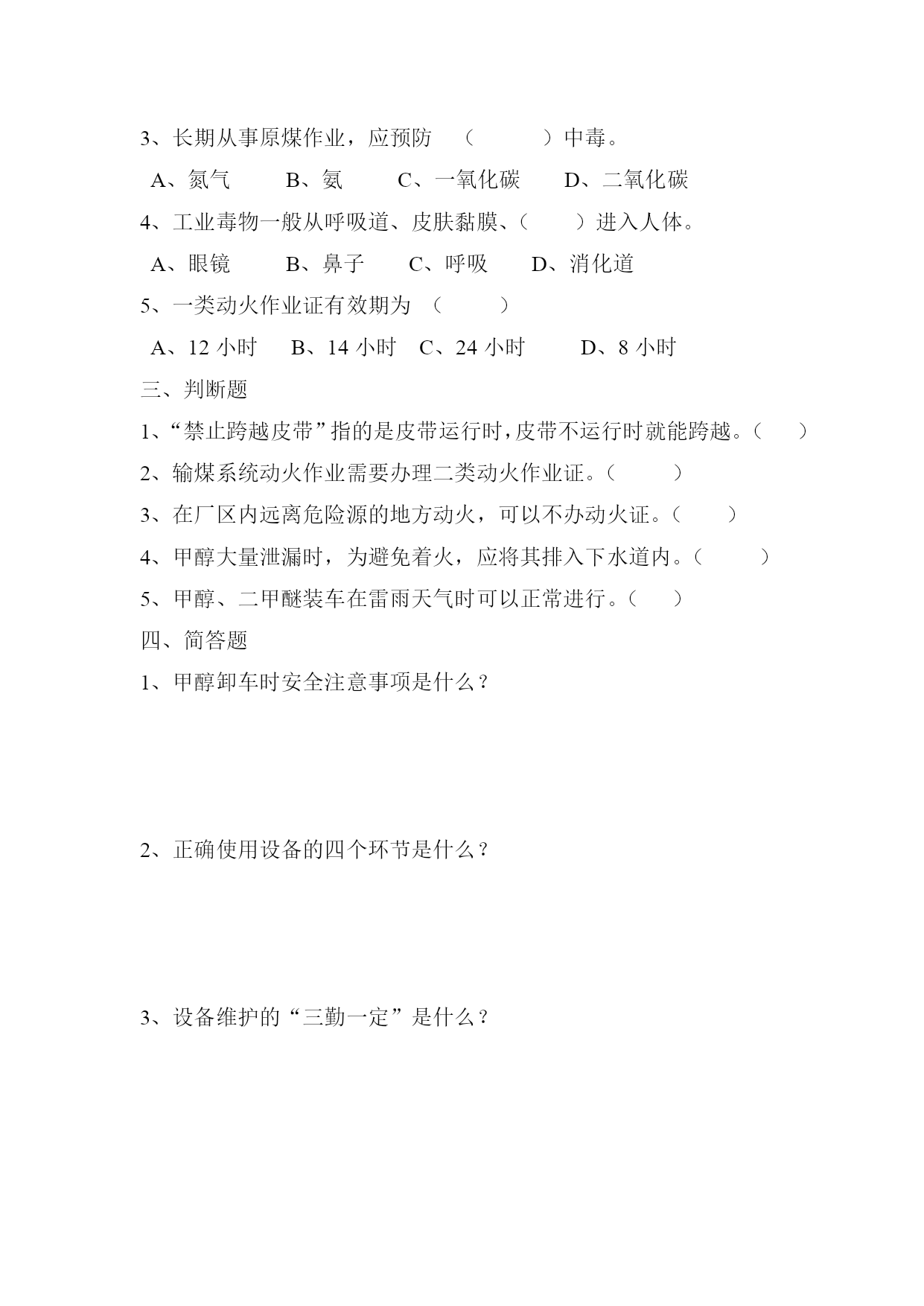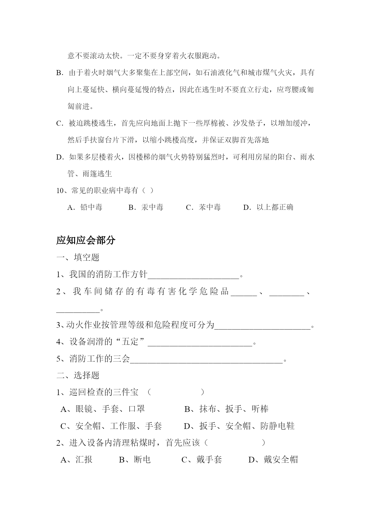上岗理论考试试题判断题在劳动过程中,长期吸入较高浓度的某些生产性粉尘所引起的以肺组织纤维化为主的全身性疾病称为尘肺。()特种作业是指容易发生人员伤亡事故,对操作者本人、他人及周围设施的安全有重大危险的作业。()泡沫灭火剂对可燃性液体的火灾最适用。()救护触电者时,可以站在干燥的木板上,或穿上不带钉子的胶底鞋,用一只手去拉触电者的干燥衣服,使触电者脱离电源。()湿法除尘是利用某些粉尘有较好的亲水性这一特性来达到防尘的方法。()生产性噪声对人体的危害首先是对听觉器官的损害,我国已将噪声聋列为职业病。噪声还可对神经系统、心血管系统及全身其他器官功能产生不同程序的危害。()粉尘对人体健康的影响尤为严重,它是引起尘肺病的根源。()置换动火常用的的惰性介质有氮气和水蒸气。()易燃、易爆、危险物品可以起重吊运。()分散度越高的粉尘,沉降速度愈慢,稳定程度越高,被机体吸入的机会也就越多,危害就愈大。()不定项选择题1、“安全第一、预防为主、综合治理”是我国()的方针。()A.劳动保护B.职业安全健康C.安全生产D.安全生产管理2、不属于职业病诊断要考虑的因素是()A.病人的职业史B.病人的从业时间C.职业病危害接触只和现场危害调查与评价D.临床表现以及辅助检查3、危险是指()A.系统中存在导致发生不期望后果的可能性超过了人们的承受程度B.危险环境、危险条件、危险状态、危险场所、危险人员、危险因素C.人员伤亡、伤害、职业病、财产损失或者其他损失的事件D.危险是人们对事物的具体认识4、安全生产管理工作应该做到(),通过有效的管理和技术手段,减少和防止人的不安全行为和物的不安全状态。()A.管理为主B.以人为主C.预防为主D.采取措施为主5、下列不属于从业人员的义务的一项是()A.遵章守规,服从管理的义务B.接受安全生产教育和培训的义务C.监督安全作业的义务D.发现不安全因素报告的义务6、安全检查是指()A.安全管理工作的重要内容,是消除隐患,防止事故发生,改善劳动条件的重要手段B.一般是通过有计划、有组织、有目的的形式来实现的C.对生产过程及安全管理中可能存在的隐患,有害与危害因素,缺陷等进行查证,以确定隐患或有害与危险因素、缺陷的存在状态,以及它们转化为事故的条件,以便制定整改措施,消除隐患和有害与危险因素,确保生产安全D.由各级生产单位根据季节变化,按事故发生的规律对易发的潜在危险,突出重点进行季节检查7、防止管道等设备静电危害的主要措施是()A.绝缘B.接地C.保持设备清洁D.加强监测8、()是目前我国工业生产中最为严重的职业危害之一。()A.炭黑尘肺B.滑石尘肺C.尘肺D.电焊工尘肺9、下列关于火场逃生方法说法不正确的是()A.身上的衣物着火时,应迅速将衣服脱下或撕下,或就地滚翻将火压灭,但注意不要滚动太快。一定不要身穿着火衣服跑动。B.由于着火时烟气大多聚集在上部空间,如石油液化气和城市煤气火灾,具有向上蔓延快、横向蔓延慢的特点,因此在逃生时不要直立行走,应弯腰或匍匐前进。C.被迫跳楼逃生,首先应向地面上抛下一些厚棉被、沙发垫子,以增加缓冲,然后手扶窗台片下滑,以缩小跳楼高度,并保证双脚首先落地D.如果多层楼着火,因楼梯的烟气火势特别猛烈时,可利用房屋的阳台、雨水管、雨篷逃生10、常见的职业病中毒有()A.铅中毒B.汞中毒C.苯中毒D.以上都正确应知应会部分一、填空题1、我国的消防工作方针_____________________。2、我车间储存的有毒有害化学危险品______、________、__________。3、动火作业按管理等级和危险程度可分为______________________。4、设备润滑的“五定”________________________。5、消防工作的三会___________________________________。二、选择题1、巡回检查的三件宝()A、眼镜、手套、口罩B、抹布、扳手、听棒C、安全帽、工作服、手套D、扳手、安全帽、防静电鞋2、进入设备内清理粘煤时,首先应该()A、汇报B、断电C、戴手套D、戴安全帽3、长期从事原煤作业,应预防()中毒。A、氮气B、氨C、一氧化碳D、二氧化碳4、工业毒物一般从呼吸道、皮肤黏膜、()进入人体。A、眼镜B、鼻子C、呼吸D、消化道5、一类动火作业证有效期为()A、12小时B、14小时C、24小时D、8小时三、判断题1、“禁止跨越皮带”指的是皮带运行时,皮带不运行时就能跨越。()2、输煤系统动火作业需要办理二类动火作业证。()3、在厂区内远离危险源的地方动火,可以不办动火证。(