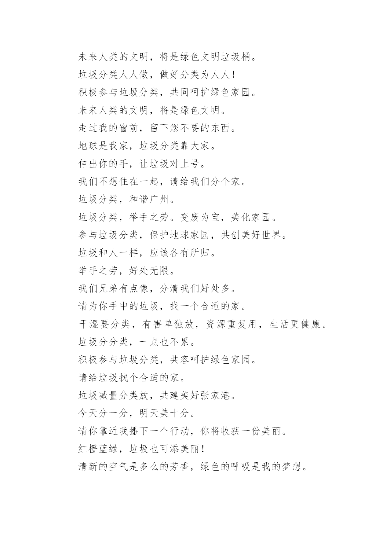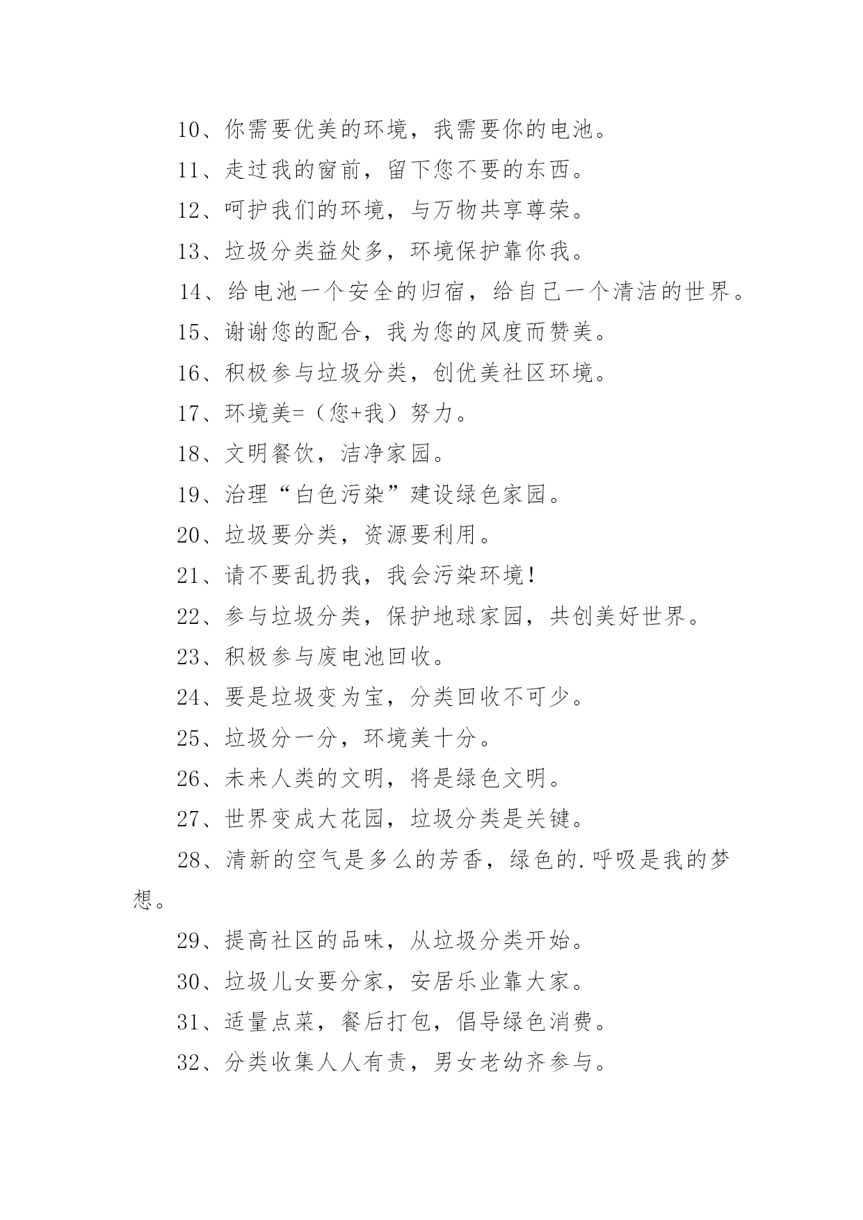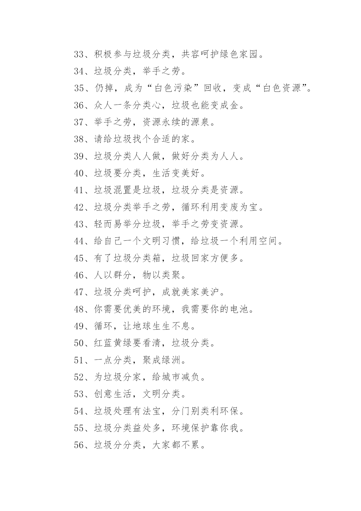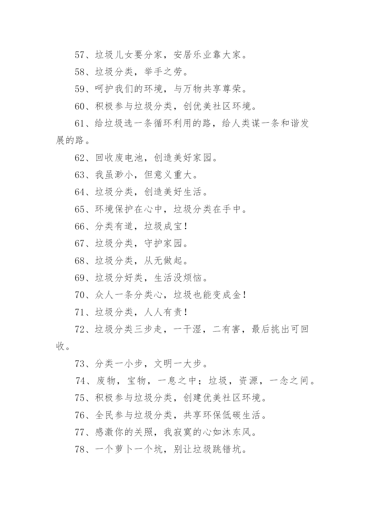 环保垃圾分类宣传标语环保垃圾分类宣传标语9篇在平时的学习、工作或生活中,大家都听说过或者使用过一些比较经典的标语吧,标语起着警示人们的作用。其实很多朋友都不太清楚什么样的标语才是好的标语,下面是小编为大家收集的环保垃圾分类宣传标语,欢迎大家借鉴与参考,希望对大家有所帮助。环保垃圾分类宣传标语11、垃圾交给我,美丽还给你。2、垃圾拾起来,分类更精彩!3、垃圾不落地,校园更美丽。4、垃圾也有它的家,垃圾分类靠大家。5、风险废物监控全方位,美好家园建设零距离。6、垃圾分类益处多,环境保护靠你我。7、文明餐饮,洁净家园。8、合法处置风险废物,社会责任心中永驻。9、全民防治风险废物,共享美好生态家园。10、村容环境管理,完善乡村垃圾无害化处置体系。11、风险废物危害大,迷信处置利环保。12、未来人类的.礼貌,将是绿色礼貌垃圾桶。13、推进农村生活垃圾无害化处理工作向纵深发展。14、适量点菜,餐后打包,倡导绿色消费。15、你扔掉的,我都需要。16、回收废电池,创造完美家园。17、播种礼貌,收获温馨。18、垃圾分类人人做,做好分类为人人。19、你给我的不是施舍,而是一份爱心。20、垃圾随人走,到“家”才分手。21、有害废物不乱倒,环保生活更美妙。22、世界变成大花园,垃圾分类是关键。23、参与垃圾分类,保护地球家园,共创完美世界。25、未来人类的文明,将是绿色文明。环保垃圾分类宣传标语21、保护生态环境,就是爱护自已。2、依法管水,科学用水,自觉节水。3、保障饮水安全,维护生命健康。4、环境与人类共存,开发与保护同步。5、你听:花儿,草儿和蜂蝶在说悄悄话呢。6、阳光灿烂请千万忘记我,光线暗淡你才能拥有我。7、垃圾混置是垃圾,垃圾分类是资源。8、垃圾分类,循环回收。9、带走的花儿生命短暂,留下的美丽才是永远。10、节能减排时时刻刻,绿色城市岁岁年年。11、你会摧残生命吗?我想肯定不会的.。12、破坏了环境,人类就等于**。13、你捡一垃圾,我栽一树苗,世界顷刻变美好。14、当你不要我时,请把我送回家。15、绿色是我们的家园。16、放下千斤斧,快去勤植树。17、拯救地球就是拯救未来。18、让我们为地球妈妈共同撑起一把绿伞。19、保护生态环境,就是爱护自己。20、给我一份爱,送你一片绿。21、为了美丽家园,请从小事做起。22、环境保护从我身边做起。23、保护自然平衡,拯救绿色环境。24、保护环境,从我做起。25、让白色染污永远消失。环保垃圾分类宣传标语31、配合垃圾分类,争做文明市民。2、播下一个行动,你将收获一份美丽。3、环境是大事,扔垃圾是小事,大事要从小事做起。4、回收废弃电池,创造美好家园。5、垃圾分类,举手之劳。变废为宝,美化家园。6、养成文明餐饮习惯,减少餐厨垃圾。7、你们的舍弃却是我的最爱,它们在这里找到了归宿。8、我虽渺小,但意义重大。9、今天分一分,明天美十分。10、你需要优美的环境,我需要你的电池。11、走过我的窗前,留下您不要的东西。12、呵护我们的环境,与万物共享尊荣。13、垃圾分类益处多,环境保护靠你我。14、给电池一个安全的归宿,给自己一个清洁的世界。15、谢谢您的配合,我为您的风度而赞美。16、积极参与垃圾分类,创优美社区环境。17、环境美=(您+我)努力。18、文明餐饮,洁净家园。19、治理“白色污染”建设绿色家园。20、垃圾要分类,资源要利用。21、请不要乱扔我,我会污染环境!22、参与垃圾分类,保护地球家园,共创美好世界。23、积极参与废电池回收。24、要是垃圾变为宝,分类回收不可少。25、垃圾分一分,环境美十分。26、未来人类的文明,将是绿色文明。27、世界变成大花园,垃圾分类是关键。28、清新的空气是多么的芳香,绿色的.呼吸是我的梦想。29、提高社区的品味,从垃圾分类开始。30、垃圾儿女要分家,安居乐业靠大家。31、适量点菜,餐后打包,倡导绿色消费。32、分类收集人人有责,男女老幼齐参与。33、积极参与垃圾分类,共容呵护绿色家园。34、垃圾分类,举手之劳。35、仍掉,成为“白色污染”回收,变成“白色资源”。36、众人一条分类心,垃圾也能变成金。37、举手之劳,资源永续的源泉。38、请给垃圾找个合适的家。39、垃圾分类人人做,做好分类为人人。40、垃圾要分类,生活变美好。41、垃圾混置是垃圾,垃圾分类是资源。42、垃圾分类举手之劳,循环利用变废为宝。43、轻而易举分垃圾,举手之劳变资源。44、给自己一个文明习惯,给垃圾一个利用空间。45、有了垃圾分类箱,垃圾回家方便多。46、人以群分,物以类聚。47、垃圾分类呵护,成就美家美沪。48、你需要优美的环境,我需要你的电池。49、循环,让地球生生不息。50、红蓝黄绿要看清,垃圾分类。51、一点分类,聚成绿洲。52、为垃圾分家,给城市减负。53、创意生活,文明分类