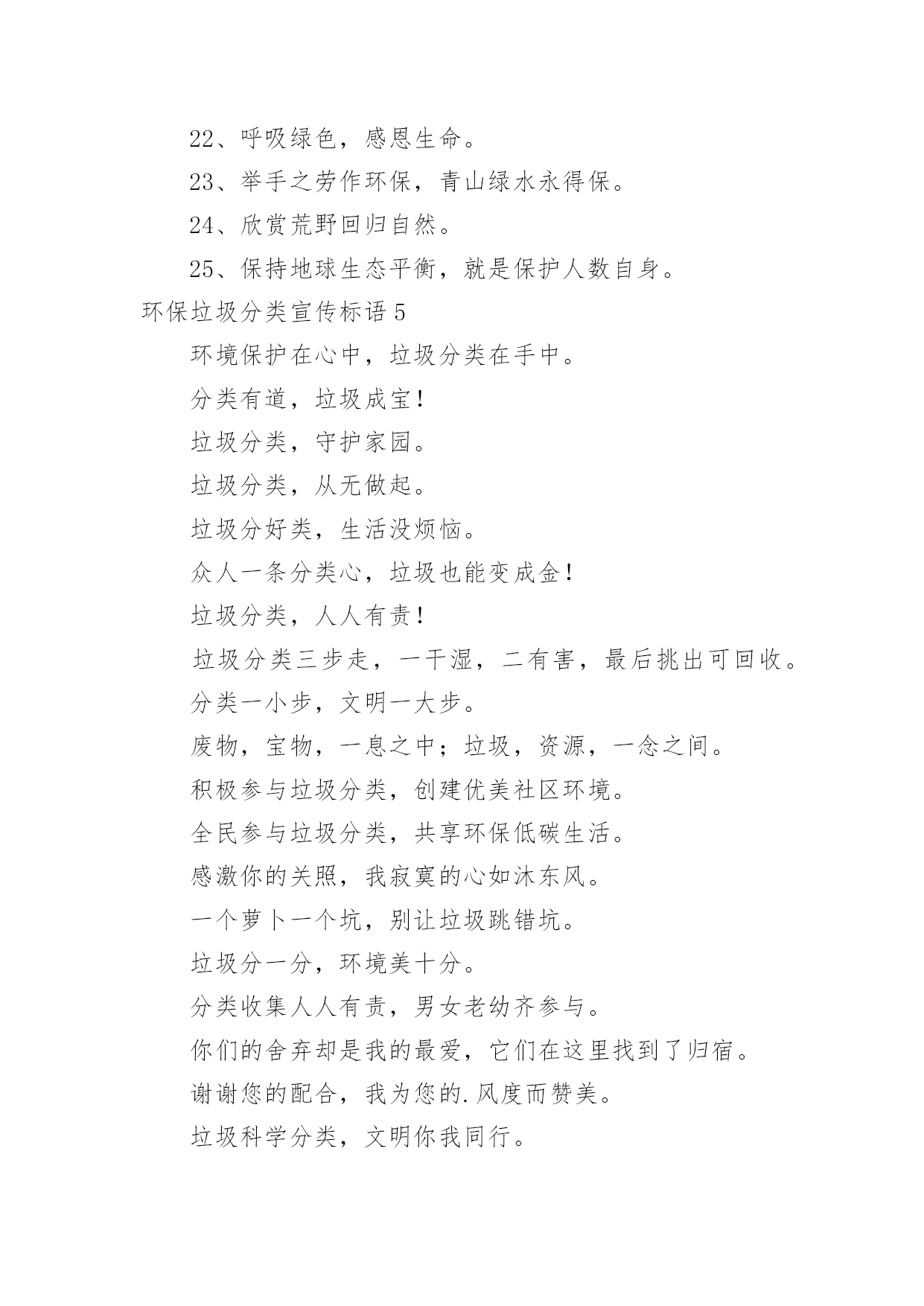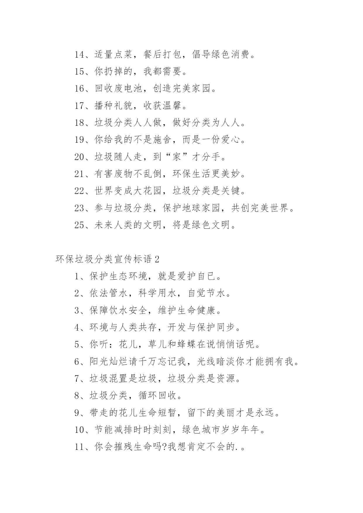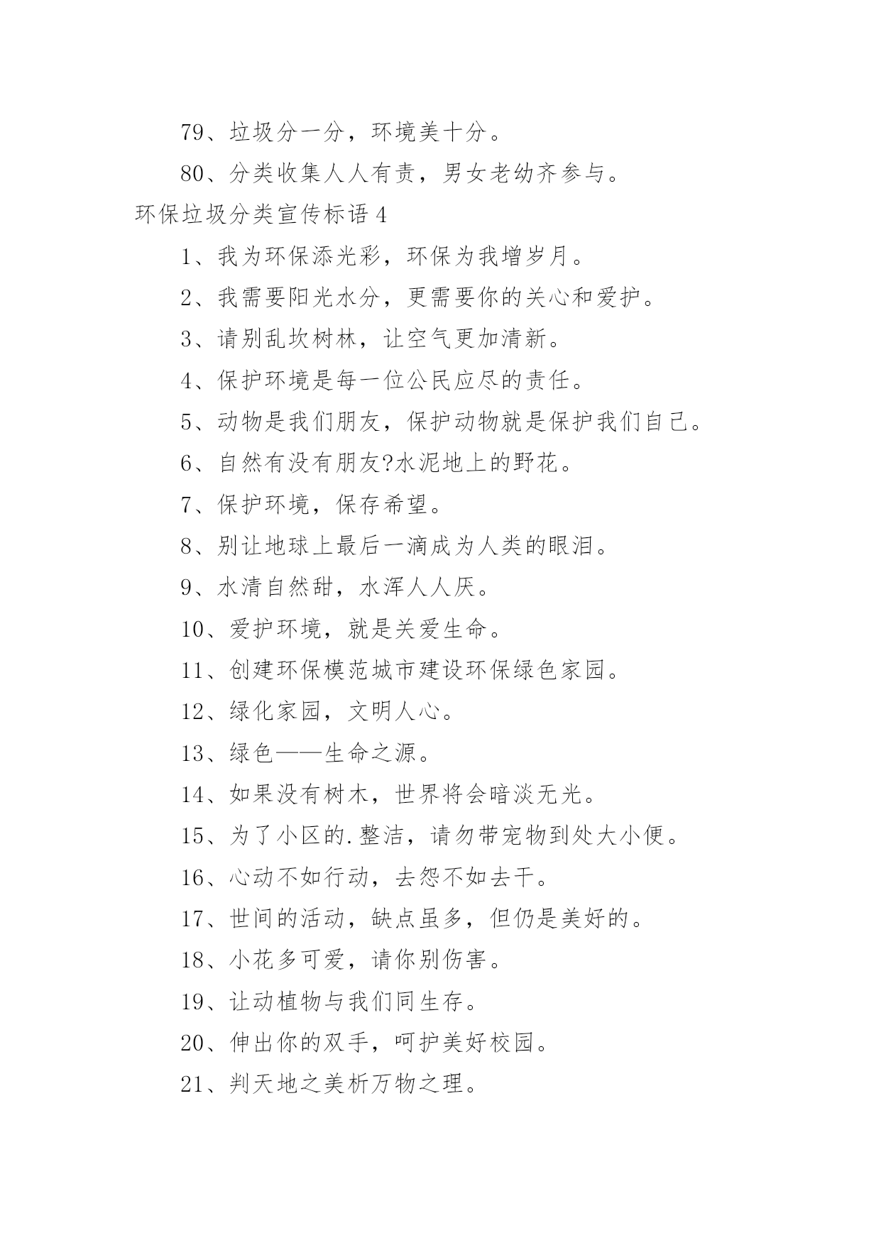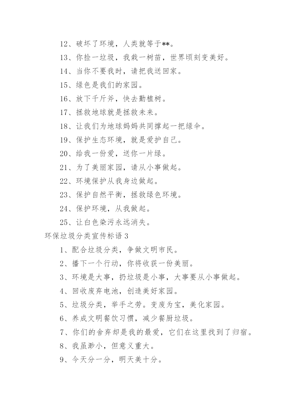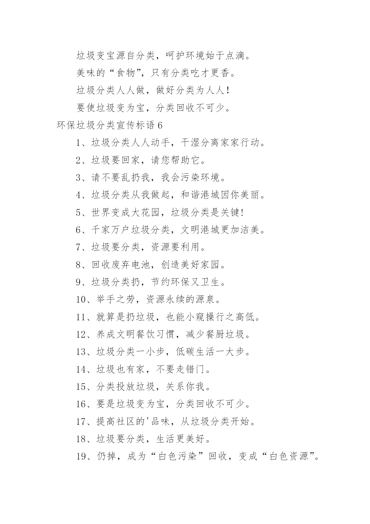 环保垃圾分类宣传标语环保垃圾分类宣传标语9篇在平时的学习、工作或生活中,大家都听说过或者使用过一些比较经典的标语吧,标语起着警示人们的作用。其实很多朋友都不太清楚什么样的标语才是好的标语,下面是小编为大家收集的环保垃圾分类宣传标语,欢迎大家借鉴与参考,希望对大家有所帮助。环保垃圾分类宣传标语11、垃圾交给我,美丽还给你。2、垃圾拾起来,分类更精彩!3、垃圾不落地,校园更美丽。4、垃圾也有它的家,垃圾分类靠大家。5、风险废物监控全方位,美好家园建设零距离。6、垃圾分类益处多,环境保护靠你我。7、文明餐饮,洁净家园。8、合法处置风险废物,社会责任心中永驻。9、全民防治风险废物,共享美好生态家园。10、村容环境管理,完善乡村垃圾无害化处置体系。11、风险废物危害大,迷信处置利环保。12、未来人类的.礼貌,将是绿色礼貌垃圾桶。13、推进农村生活垃圾无害化处理工作向纵深发展。14、适量点菜,餐后打包,倡导绿色消费。15、你扔掉的,我都需要。16、回收废电池,创造完美家园。17、播种礼貌,收获温馨。18、垃圾分类人人做,做好分类为人人。19、你给我的不是施舍,而是一份爱心。20、垃圾随人走,到“家”才分手。21、有害废物不乱倒,环保生活更美妙。22、世界变成大花园,垃圾分类是关键。23、参与垃圾分类,保护地球家园,共创完美世界。25、未来人类的文明,将是绿色文明。环保垃圾分类宣传标语21、保护生态环境,就是爱护自已。2、依法管水,科学用水,自觉节水。3、保障饮水安全,维护生命健康。4、环境与人类共存,开发与保护同步。5、你听:花儿,草儿和蜂蝶在说悄悄话呢。6、阳光灿烂请千万忘记我,光线暗淡你才能拥有我。7、垃圾混置是垃圾,垃圾分类是资源。8、垃圾分类,循环回收。9、带走的花儿生命短暂,留下的美丽才是永远。10、节能减排时时刻刻,绿色城市岁岁年年。11、你会摧残生命吗?我想肯定不会的.。12、破坏了环境,人类就等于**。13、你捡一垃圾,我栽一树苗,世界顷刻变美好。14、当你不要我时,请把我送回家。15、绿色是我们的家园。16、放下千斤斧,快去勤植树。17、拯救地球就是拯救未来。18、让我们为地球妈妈共同撑起一把绿伞。19、保护生态环境,就是爱护自己。20、给我一份爱,送你一片绿。21、为了美丽家园,请从小事做起。22、环境保护从我身边做起。23、保护自然平衡,拯救绿色环境。24、保护环境,从我做起。25、让白色染污永远消失。环保垃圾分类宣传标语31、配合垃圾分类,争做文明市民。2、播下一个行动,你将收获一份美丽。3、环境是大事,扔垃圾是小事,大事要从小事做起。4、回收废弃电池,创造美好家园。5、垃圾分类,举手之劳。变废为宝,美化家园。6、养成文明餐饮习惯,减少餐厨垃圾。7、你们的舍弃却是我的最爱,它们在这里找到了归宿。8、我虽渺小,但意义重大。9、今天分一分,明天美十分。10、你需要优美的环境,我需要你的电池。11、走过我的窗前,留下您不要的东西。12、呵护我们的环境,与万物共享尊荣。13、垃圾分类益处多,环境保护靠你我。14、给电池一个安全的归宿,给自己一个清洁的世界。15、谢谢您的配合,我为您的风度而赞美。16、积极参与垃圾分类,创优美社区环境。17、环境美=(您+我)努力。18、文明餐饮,洁净家园。19、治理“白色污染”建设绿色家园。20、垃圾要分类,资源要利用。21、请不要乱扔我,我会污染环境!22、参与垃圾分类,保护地球家园,共创美好世界。23、积极参与废电池回收。24、要是垃圾变为宝,分类回收不可少。25、垃圾分一分,环境美十分。26、未来人类的文明,将是绿色文明。27、世界变成大花园,垃圾分类是关键。28、清新的空气是多么的芳香,绿色的.呼吸是我的梦想。29、提高社区的品味,从垃圾分类开始。30、垃圾儿女要分家,安居乐业靠大家。31、适量点菜,餐后打包,倡导绿色消费。32、分类收集人人有责,男女老幼齐参与。33、积极参与垃圾分类,共容呵护绿色家园。34、垃圾分类,举手之劳。35、仍掉,成为“白色污染”回收,变成“白色资源”。36、众人一条分类心,垃圾也能变成金。37、举手之劳,资源永续的源泉。38、请给垃圾找个合适的家。39、垃圾分类人人做,做好分类为人人。40、垃圾要分类,生活变美好。41、垃圾混置是垃圾,垃圾分类是资源。42、垃圾分类举手之劳,循环利用变废为宝。43、轻而易举分垃圾,举手之劳变资源。44、给自己一个文明习惯,给垃圾一个利用空间。45、有了垃圾分类箱,垃圾回家方便多。46、人以群分,物以类聚。47、垃圾分类呵护,成就美家美沪。48、你需要优美的环境,我需要你的电池。49、循环,让地球生生不息。50、红蓝黄绿要看清,垃圾分类。51、一点分类,聚成绿洲。52、为垃圾分家,给城市减负。53、创意生活,文明分类
