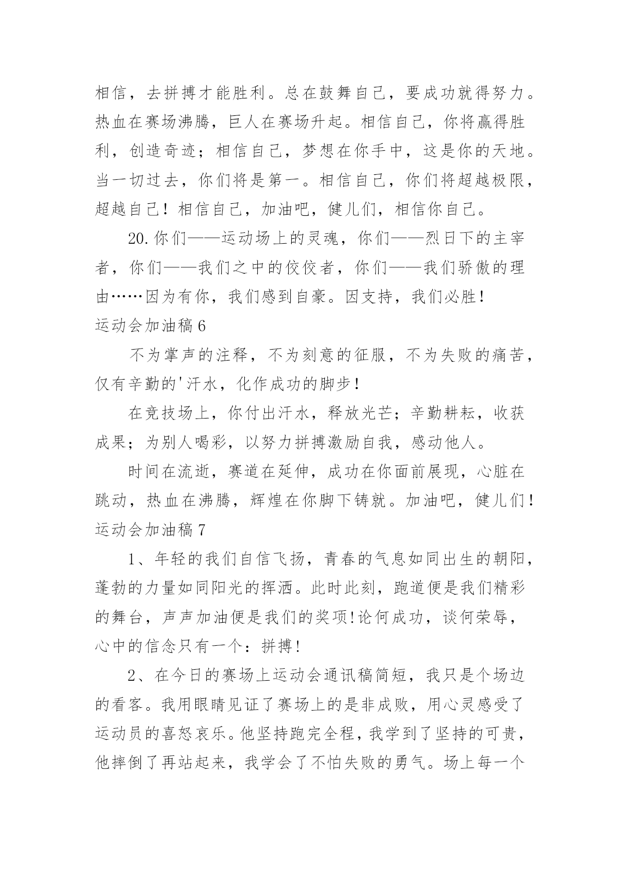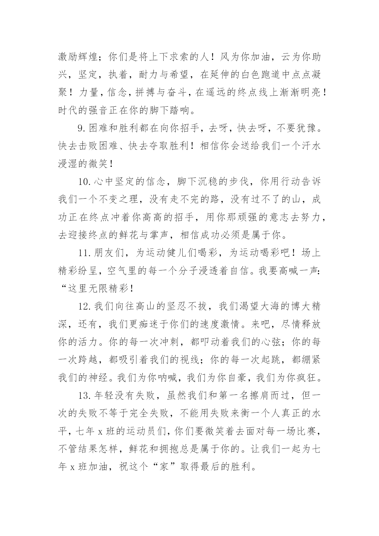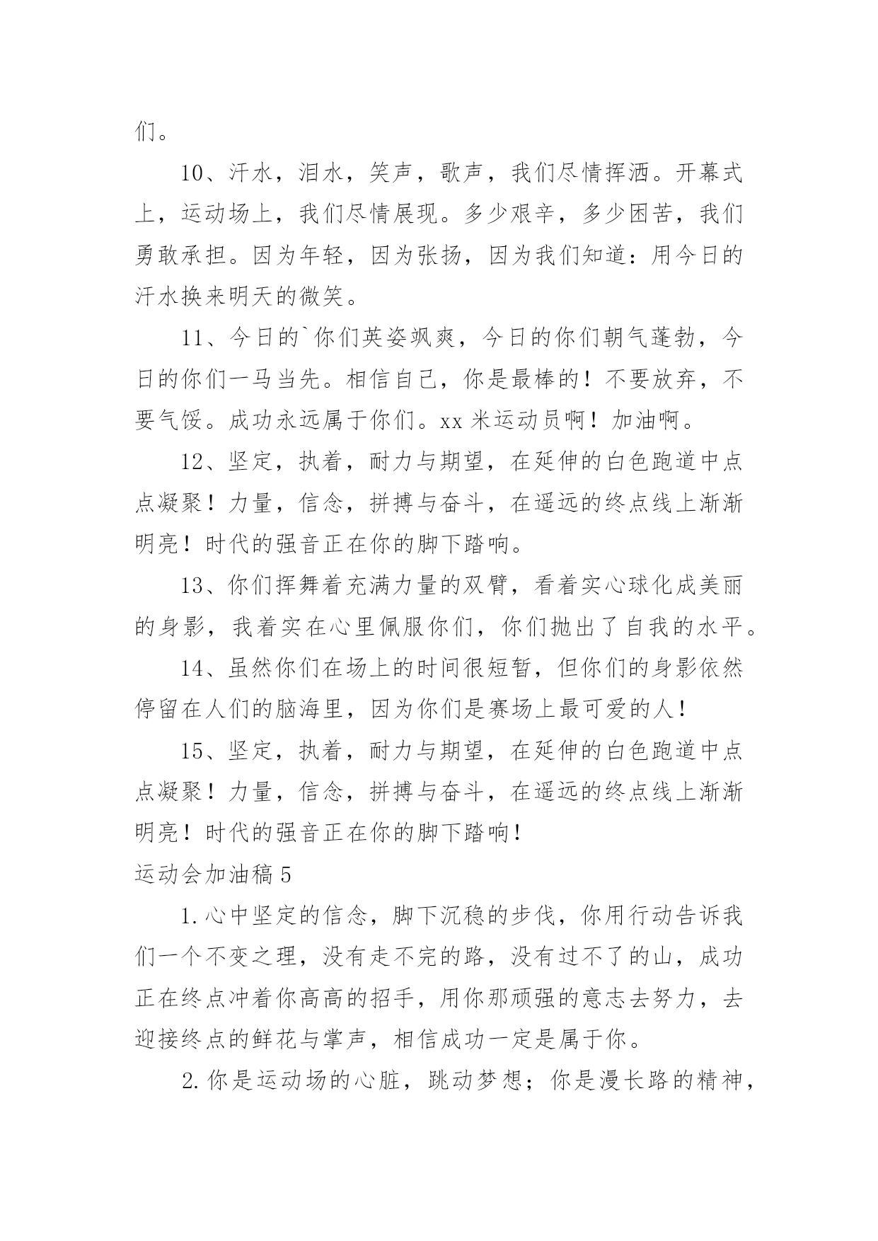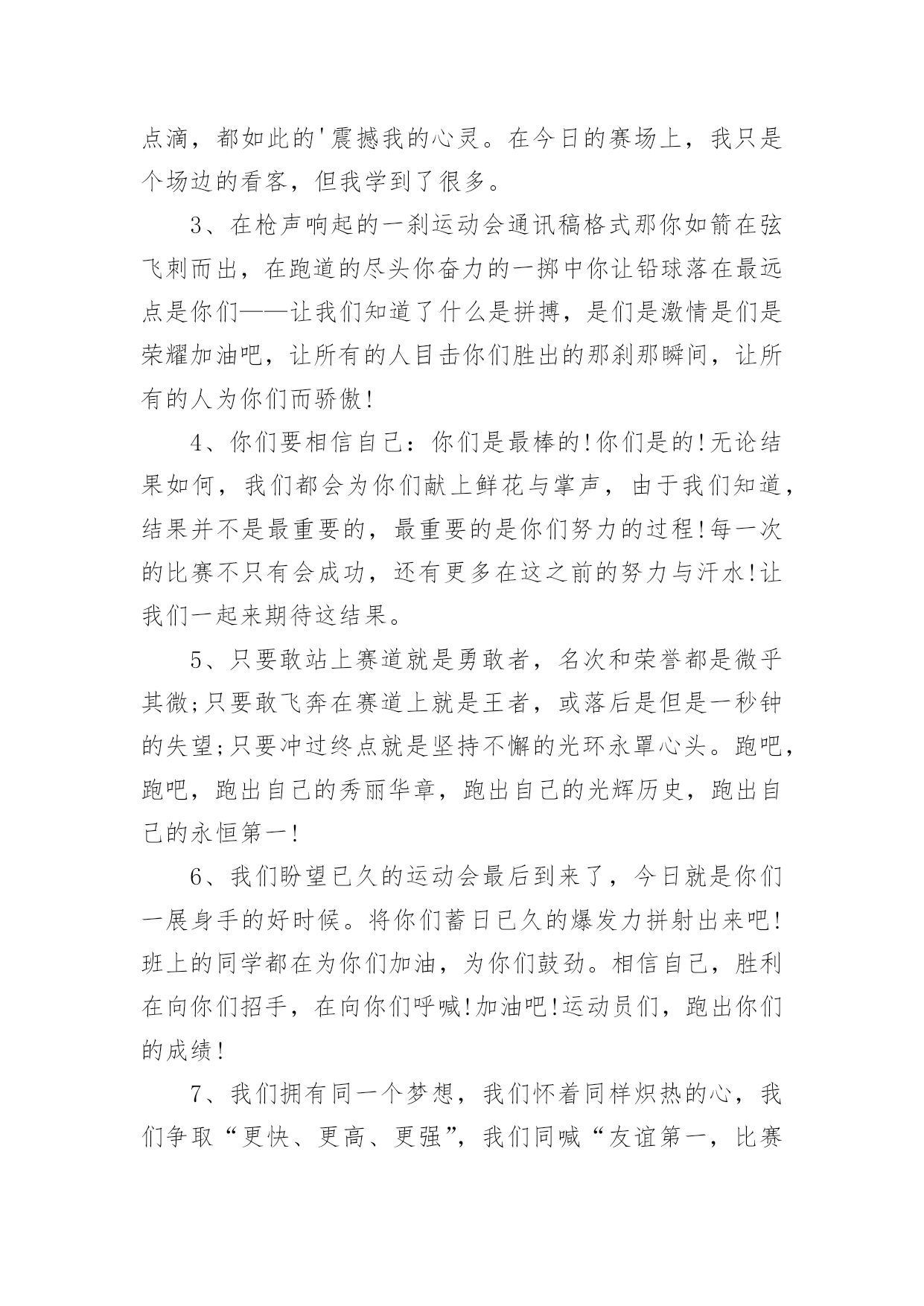 运动会加油稿运动会加油稿(经典)在生活中,我们使用上加油稿的情况与日俱增,加油稿可以促进对方完成目标的进程。为了让您在写加油稿时更加简单方便,下面是小编收集整理的运动会加油稿,希望能够帮助到大家。运动会加油稿1350米的跑道上,你正在飞驰,头一百米:你可能心急如焚,可心知落后就要挨打。次一百米:你也许有点心神不定,我是不是该安静的退开?再一百米:你正在进行着心理斗争,“生存”还“死亡”?末一百米:你仿佛心有余而力不足,其实“冲刺”不容易。但面对如此遥远的路途,如此激烈的竞争,你也许腿脚发麻,你也许有些茫然。但你可知道,在你身后,有同学们一双双期待的眼睛;在你身后,是你日日辛勤苦练流下的`汗水。鼓起勇气,奋勇向前吧!为了集体的荣誉,为了祖国的明天!运动会加油稿2成功了!最后成功了!我们为你喝彩我们为你欢呼!你是最棒的因为你相信自我你是最厉害的因为你有实力。你也是最可爱的因为你展现着自我的风采。你梁青青自动化的自豪,你为自动化拉开夺分的'序幕也为运动员们拉开了竞争的氛围。GO!向前冲!你站着是一座丰碑向前跑起更是一面旗帜。向前冲!胜利属于你。Becausewebelieveyou!运动会加油稿3体育健儿们,我们知道你们的辛勤,我们了解你们的辛苦,加油吧!不论你是成功还是失败,我们都是你们坚强的后盾,胜也爱你,败也爱你,我们永远支持你,你们永远是“最特别的'存在”。踏着春天的气息,迈着轻盈的脚步,我们迎来了心仪已久的运动会。这里就是展示自我的舞台。我们向往高山的坚忍不拔,我们渴望大海的博大精深,还有,我们更痴迷于你们的速度激情。来吧,尽情释放你的活力。你的每一次冲刺,都叩动着我们的心弦;你的每一次跨越,都吸引着我们的视线;你的每一次起跳,都绷紧我们的神经。我们为你们呐喊,我们为你们自豪,我们为你疯狂。运动会加油稿41、阳光不会永远灿烂,没有一成不变的幸福,磨难或许是上苍赐予我们的礼物,用来考验我们的意志,如果是这样,就让我们微笑着应对生活。2、相信你会送给我们一个汗水浸湿的微笑!3、人生的路,有坦途,也有坎坷;走过的岁月,有欢笑,也有苦涩,泪水告诉我一个跌倒的故事,汗水使我多了一份沉重,几多成熟。4、顽强拼搏,超越自我,不鸣则已,一鸣惊人5、今日的你们英姿飒爽,今日的你们一马当先。不要放下,不要气馁。相信自己,你是最棒的!6、时值秋暮冬初,虽然已过了金秋十月,然而初冬依然暖阳高照,校运动会在这样风和日丽的天气里如期举行了。7、是体育场上游走的火焰,是来去不息的脚步,是风中飞舞的树叶折射的金色光芒,藉此,能够诠释运动员兴奋的脸庞。那轻盈的步伐似飞鸟的翅膀,那清脆的枪声响彻天际,它粲然升起那跃动的渴望,起跑加速超越冲刺,一步一步延向胜利的曙光。那是力的比拼,素质的较量,是石榴树上,跃动的心脏。8、广阔的绿茵场,是为你们搭建的舞台。张扬吧,年轻的心,我们将为你永远喝彩!9、时间在流逝,赛道在延伸,成功在你面前展现。心脏在跳动,热血在沸腾,辉煌在你脚下铸就。加油吧,健儿们。10、汗水,泪水,笑声,歌声,我们尽情挥洒。开幕式上,运动场上,我们尽情展现。多少艰辛,多少困苦,我们勇敢承担。因为年轻,因为张扬,因为我们知道:用今日的汗水换来明天的微笑。11、今日的`你们英姿飒爽,今日的你们朝气蓬勃,今日的你们一马当先。相信自己,你是最棒的!不要放弃,不要气馁。成功永远属于你们。xx米运动员啊!加油啊。12、坚定,执着,耐力与期望,在延伸的白色跑道中点点凝聚!力量,信念,拼搏与奋斗,在遥远的终点线上渐渐明亮!时代的强音正在你的脚下踏响。13、你们挥舞着充满力量的双臂,看着实心球化成美丽的身影,我着实在心里佩服你们,你们抛出了自我的水平。14、虽然你们在场上的时间很短暂,但你们的身影依然停留在人们的脑海里,因为你们是赛场上最可爱的人!15、坚定,执着,耐力与期望,在延伸的白色跑道中点点凝聚!力量,信念,拼搏与奋斗,在遥远的终点线上渐渐明亮!时代的强音正在你的脚下踏响!运动会加油稿51.心中坚定的信念,脚下沉稳的步伐,你用行动告诉我们一个不变之理,没有走不完的路,没有过不了的山,成功正在终点冲着你高高的招手,用你那顽强的意志去努力,去迎接终点的鲜花与掌声,相信成功一定是属于你。2.你是运动场的心脏,跳动梦想;你是漫长路的精神,激励辉煌;你们是将上下求索的人!3.不为掌声的注释不为刻意的征服不为失败的痛苦只有辛勤的汗水化作成功的脚步。4.汗水,泪水;笑声,歌声;我们尽情挥洒。开幕式上,运动场上,我们尽情展现,多少艰辛,多少困苦,我们勇敢承担。因为年轻,因为张扬,因为我们知道:用今天的汗水换来明天的微笑。5.年轻的我们自信飞扬,青春的气息如同出生的朝阳,蓬勃的力量如同阳光的挥洒。此时此刻,跑道便是我们精彩的舞台,声声加油便是我们最高的奖项!论何成功,谈何