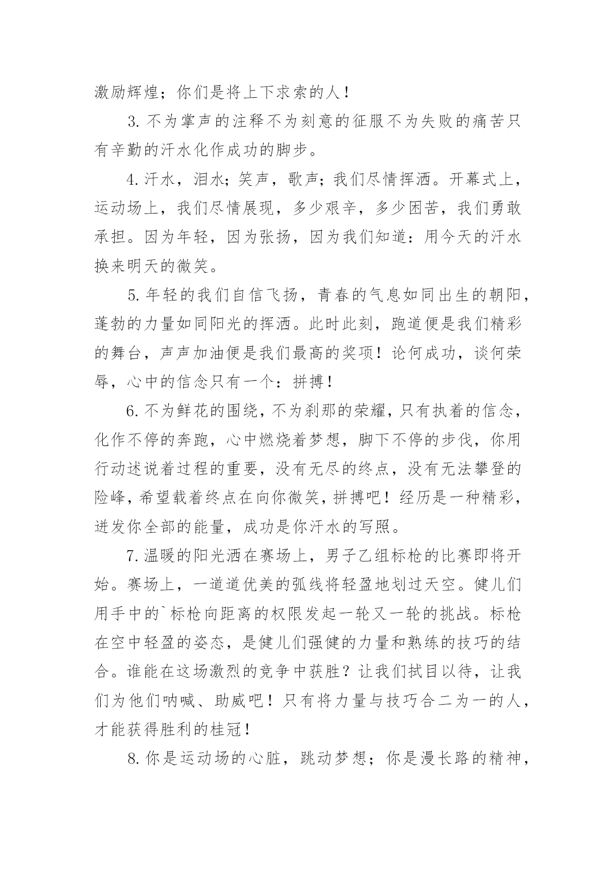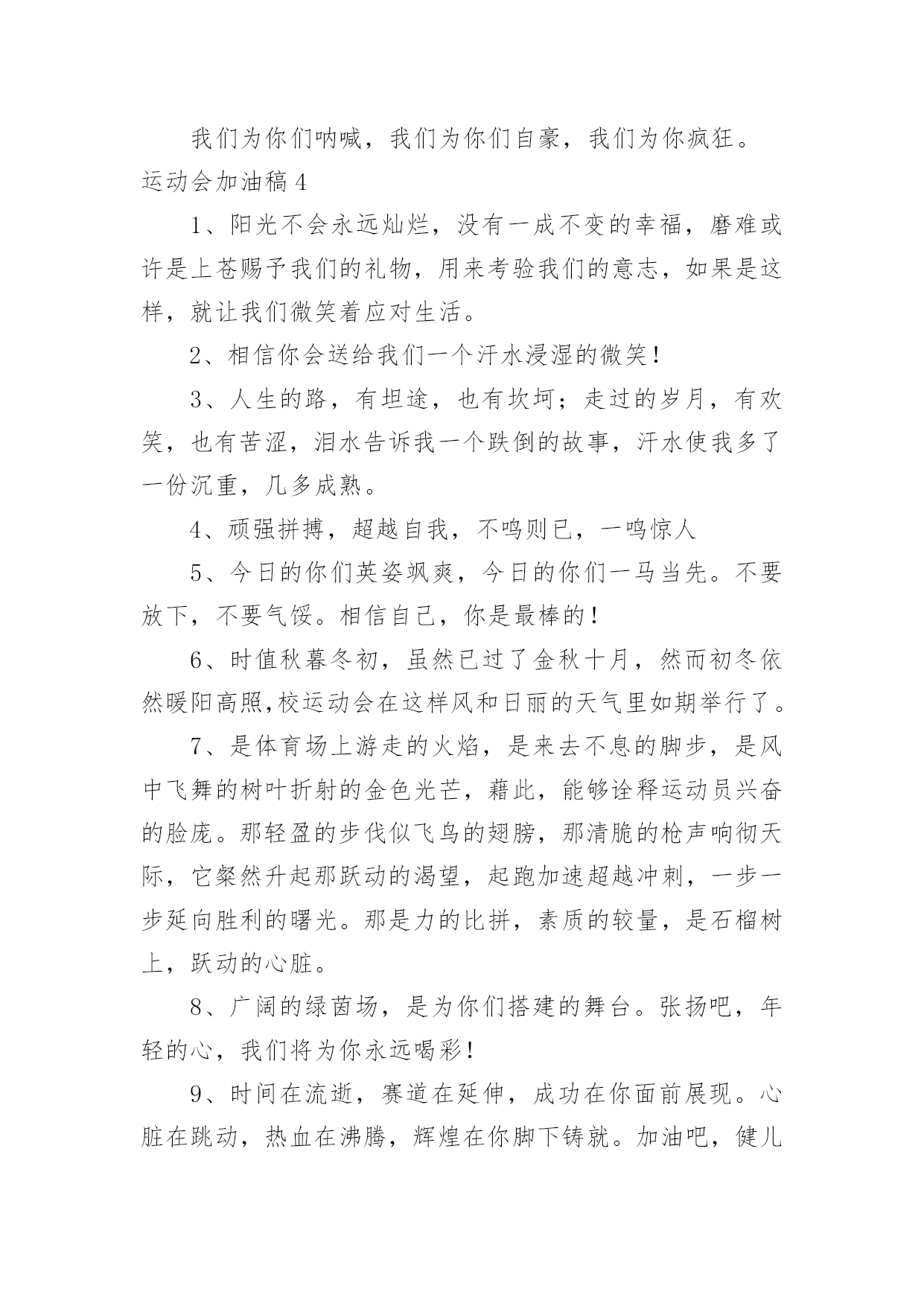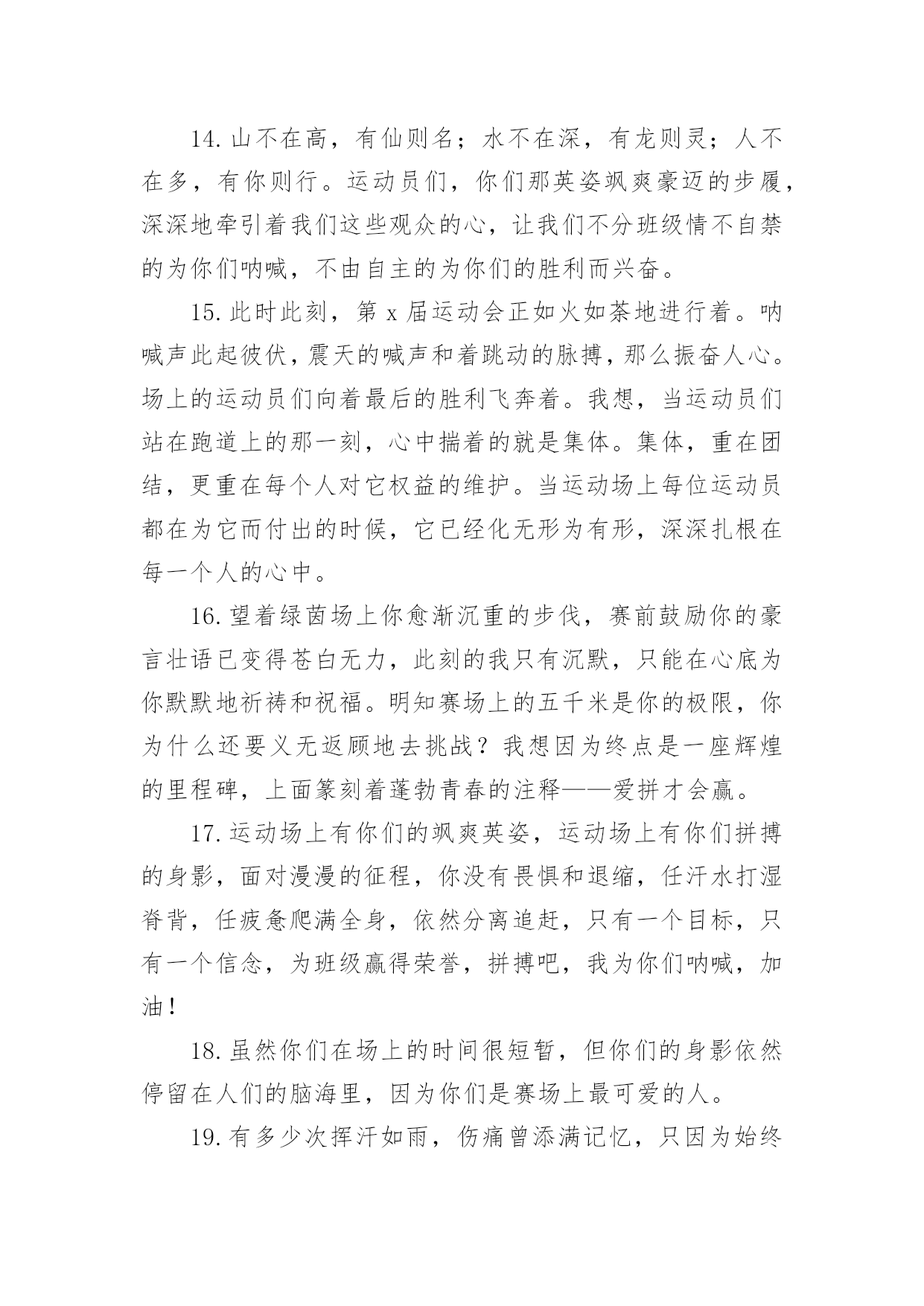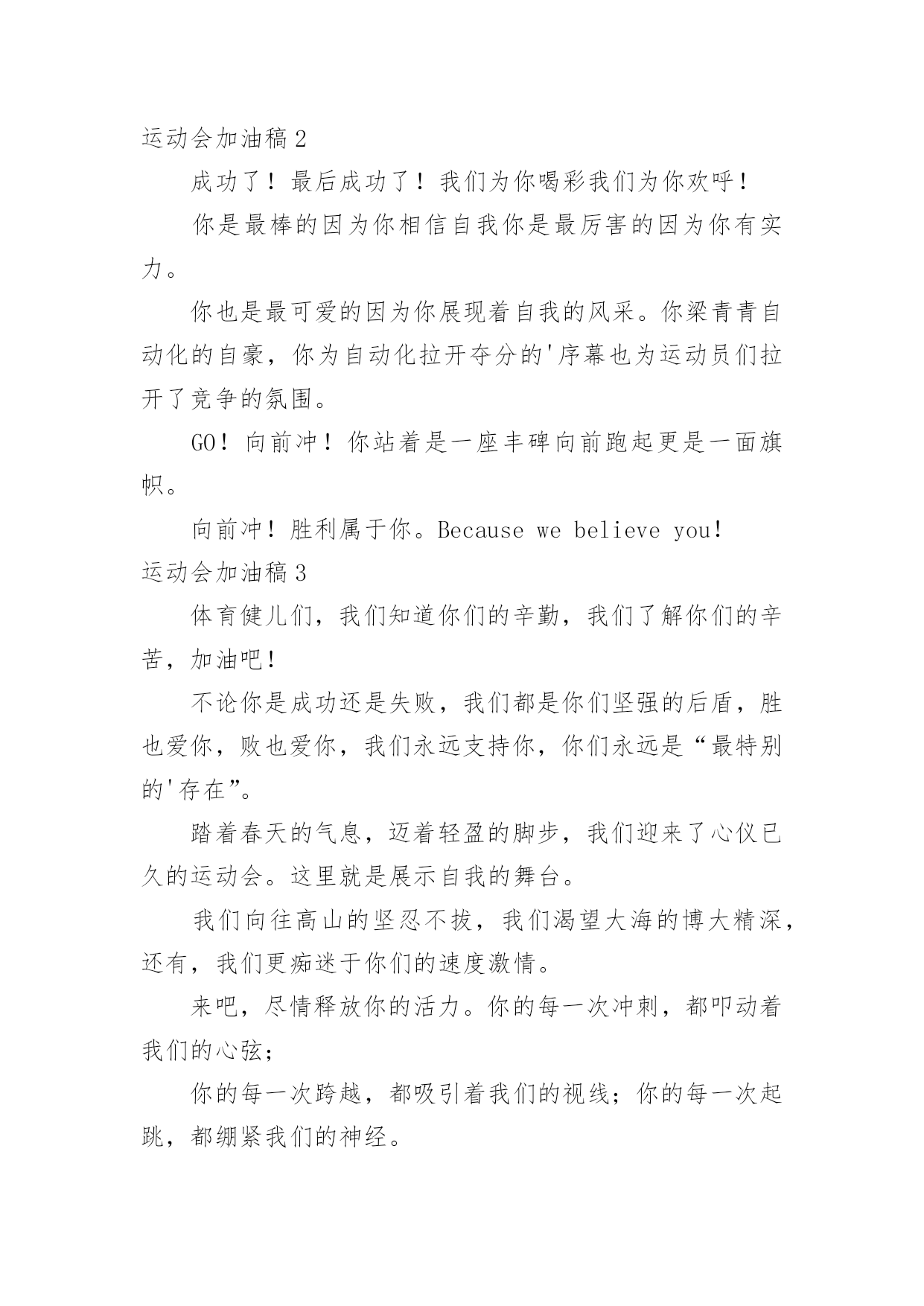 运动会加油稿运动会加油稿(经典)在生活中,我们使用上加油稿的情况与日俱增,加油稿可以促进对方完成目标的进程。为了让您在写加油稿时更加简单方便,下面是小编收集整理的运动会加油稿,希望能够帮助到大家。运动会加油稿1350米的跑道上,你正在飞驰,头一百米:你可能心急如焚,可心知落后就要挨打。次一百米:你也许有点心神不定,我是不是该安静的退开?再一百米:你正在进行着心理斗争,“生存”还“死亡”?末一百米:你仿佛心有余而力不足,其实“冲刺”不容易。但面对如此遥远的路途,如此激烈的竞争,你也许腿脚发麻,你也许有些茫然。但你可知道,在你身后,有同学们一双双期待的眼睛;在你身后,是你日日辛勤苦练流下的`汗水。鼓起勇气,奋勇向前吧!为了集体的荣誉,为了祖国的明天!运动会加油稿2成功了!最后成功了!我们为你喝彩我们为你欢呼!你是最棒的因为你相信自我你是最厉害的因为你有实力。你也是最可爱的因为你展现着自我的风采。你梁青青自动化的自豪,你为自动化拉开夺分的'序幕也为运动员们拉开了竞争的氛围。GO!向前冲!你站着是一座丰碑向前跑起更是一面旗帜。向前冲!胜利属于你。Becausewebelieveyou!运动会加油稿3体育健儿们,我们知道你们的辛勤,我们了解你们的辛苦,加油吧!不论你是成功还是失败,我们都是你们坚强的后盾,胜也爱你,败也爱你,我们永远支持你,你们永远是“最特别的'存在”。踏着春天的气息,迈着轻盈的脚步,我们迎来了心仪已久的运动会。这里就是展示自我的舞台。我们向往高山的坚忍不拔,我们渴望大海的博大精深,还有,我们更痴迷于你们的速度激情。来吧,尽情释放你的活力。你的每一次冲刺,都叩动着我们的心弦;你的每一次跨越,都吸引着我们的视线;你的每一次起跳,都绷紧我们的神经。我们为你们呐喊,我们为你们自豪,我们为你疯狂。运动会加油稿41、阳光不会永远灿烂,没有一成不变的幸福,磨难或许是上苍赐予我们的礼物,用来考验我们的意志,如果是这样,就让我们微笑着应对生活。2、相信你会送给我们一个汗水浸湿的微笑!3、人生的路,有坦途,也有坎坷;走过的岁月,有欢笑,也有苦涩,泪水告诉我一个跌倒的故事,汗水使我多了一份沉重,几多成熟。4、顽强拼搏,超越自我,不鸣则已,一鸣惊人5、今日的你们英姿飒爽,今日的你们一马当先。不要放下,不要气馁。相信自己,你是最棒的!6、时值秋暮冬初,虽然已过了金秋十月,然而初冬依然暖阳高照,校运动会在这样风和日丽的天气里如期举行了。7、是体育场上游走的火焰,是来去不息的脚步,是风中飞舞的树叶折射的金色光芒,藉此,能够诠释运动员兴奋的脸庞。那轻盈的步伐似飞鸟的翅膀,那清脆的枪声响彻天际,它粲然升起那跃动的渴望,起跑加速超越冲刺,一步一步延向胜利的曙光。那是力的比拼,素质的较量,是石榴树上,跃动的心脏。8、广阔的绿茵场,是为你们搭建的舞台。张扬吧,年轻的心,我们将为你永远喝彩!9、时间在流逝,赛道在延伸,成功在你面前展现。心脏在跳动,热血在沸腾,辉煌在你脚下铸就。加油吧,健儿们。10、汗水,泪水,笑声,歌声,我们尽情挥洒。开幕式上,运动场上,我们尽情展现。多少艰辛,多少困苦,我们勇敢承担。因为年轻,因为张扬,因为我们知道:用今日的汗水换来明天的微笑。11、今日的`你们英姿飒爽,今日的你们朝气蓬勃,今日的你们一马当先。相信自己,你是最棒的!不要放弃,不要气馁。成功永远属于你们。xx米运动员啊!加油啊。12、坚定,执着,耐力与期望,在延伸的白色跑道中点点凝聚!力量,信念,拼搏与奋斗,在遥远的终点线上渐渐明亮!时代的强音正在你的脚下踏响。13、你们挥舞着充满力量的双臂,看着实心球化成美丽的身影,我着实在心里佩服你们,你们抛出了自我的水平。14、虽然你们在场上的时间很短暂,但你们的身影依然停留在人们的脑海里,因为你们是赛场上最可爱的人!15、坚定,执着,耐力与期望,在延伸的白色跑道中点点凝聚!力量,信念,拼搏与奋斗,在遥远的终点线上渐渐明亮!时代的强音正在你的脚下踏响!运动会加油稿51.心中坚定的信念,脚下沉稳的步伐,你用行动告诉我们一个不变之理,没有走不完的路,没有过不了的山,成功正在终点冲着你高高的招手,用你那顽强的意志去努力,去迎接终点的鲜花与掌声,相信成功一定是属于你。2.你是运动场的心脏,跳动梦想;你是漫长路的精神,激励辉煌;你们是将上下求索的人!3.不为掌声的注释不为刻意的征服不为失败的痛苦只有辛勤的汗水化作成功的脚步。4.汗水,泪水;笑声,歌声;我们尽情挥洒。开幕式上,运动场上,我们尽情展现,多少艰辛,多少困苦,我们勇敢承担。因为年轻,因为张扬,因为我们知道:用今天的汗水换来明天的微笑。5.年轻的我们自信飞扬,青春的气息如同出生的朝阳,蓬勃的力量如同阳光的挥洒。此时此刻,跑道便是我们精彩的舞台,声声加油便是我们最高的奖项!论何成功,谈何