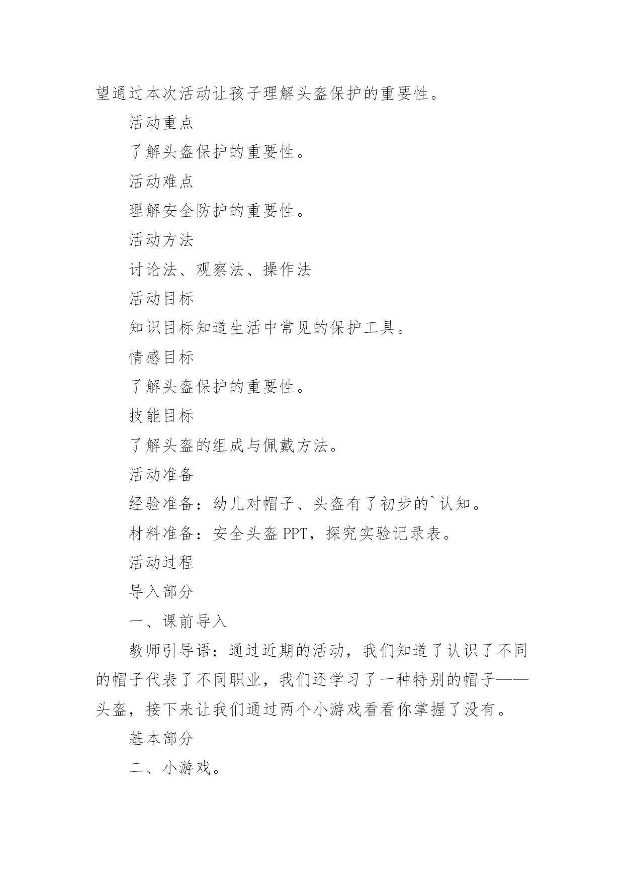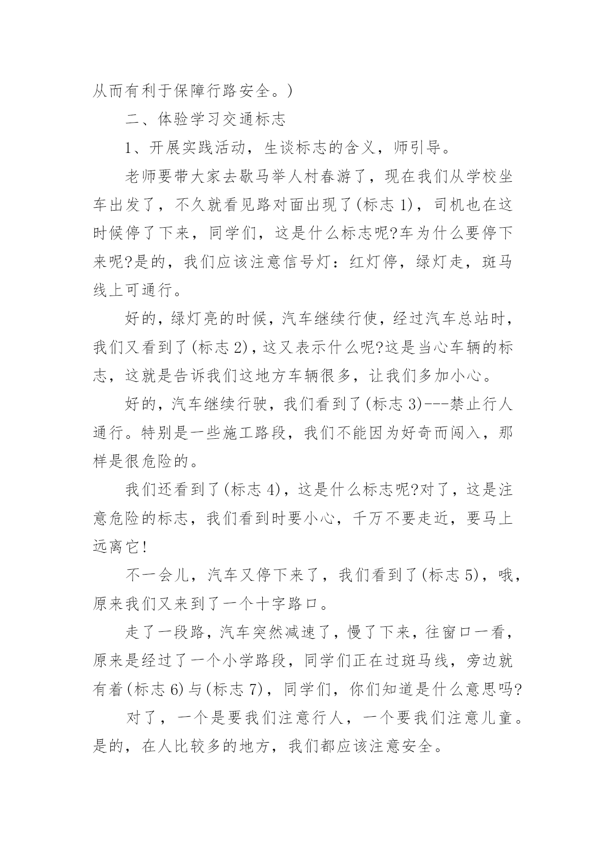 一盔一带交通安全教案一盔一带交通安全教案(合集)作为一名为他人授业解惑的教育工作者,通常需要用到教案来辅助教学,教案是保证教学取得成功、提高教学质量的基本条件。优秀的教案都具备一些什么特点呢?以下是小编收集整理的一盔一带交通安全教案,欢迎大家分享。一盔一带交通安全教案1教学目标1、认知:让学生了解一些常见的交通标志,提高学生注意交通安全的自觉性。2、情感:培养学生树立交通安全的意识,自觉遵守交通法规。3、行为:初步养成遵守交通规则的好习惯。教学重难点认识常见的安全和交通标志,树立交通安全意识。教具准备小黄帽、课件、交通标志卡片、信号灯卡教学过程一、导入,了解小黄帽的作用。同学们,你们看老师为你们带来了什么?谁知道安全小黄帽有什么作用?(黄色比较醒目,容易引起驾驶员的注意,从而有利于保障行路安全。)二、体验学习交通标志1、开展实践活动,生谈标志的含义,师引导。老师要带大家去歇马举人村春游了,现在我们从学校坐车出发了,不久就看见路对面出现了(标志1),司机也在这时候停了下来,同学们,这是什么标志呢?车为什么要停下来呢?是的,我们应该注意信号灯:红灯停,绿灯走,斑马线上可通行。好的,绿灯亮的时候,汽车继续行使,经过汽车总站时,我们又看到了(标志2),这又表示什么呢?这是当心车辆的标志,这就是告诉我们这地方车辆很多,让我们多加小心。好的,汽车继续行驶,我们看到了(标志3)---禁止行人通行。特别是一些施工路段,我们不能因为好奇而闯入,那样是很危险的。我们还看到了(标志4),这是什么标志呢?对了,这是注意危险的标志,我们看到时要小心,千万不要走近,要马上远离它!不一会儿,汽车又停下来了,我们看到了(标志5),哦,原来我们又来到了一个十字路口。走了一段路,汽车突然减速了,慢了下来,往窗口一看,原来是经过了一个小学路段,同学们正在过斑马线,旁边就有着(标志6)与(标志7),同学们,你们知道是什么意思吗?对了,一个是要我们注意行人,一个要我们注意儿童。是的,在人比较多的地方,我们都应该注意安全。司机把车开到了加油站准备加油,这时,司机刚拿起一根烟,加油站的工作人员马上喊住了他,给他指了指(标志8),司机立刻收起了烟。这是什么标志呢?是的,在加油站这地方是绝对要禁止烟火的'。太好了,我们快要到达目的地了,本来还有一段路程的,可司机说接下来这段路不能把车开进去,因为遇到了(标志9),谁能说说这是为什么呢?这是非机动车道,自行车和行人可以通行。我们下车步行了一会,最后发现了(标志10),同学们知道表示什么意思吗?这是村庄的标志。同学们真棒!一下子就认识了这么多交通标志。2、找朋友:把交通标志与相应的含义贴在一起3、除了以上所学的交通标志,你还认识其他的交通标志吗?三、我是小小安全员1、(让学生戴上“小黄帽”)戴上了小黄帽,你就是小小安全员了,你想对这些小朋友说些什么?(课本20页的图)图1:追赶公共汽车。(要是司机紧急刹车的话会很危险。)图2:在公路溜冰。(危险,因为公路上车辆很多。)图3:在电房附近玩耍。(高压电,很危险。)图4:爬高速公路护栏。(危险,因为车速很快。高速公路上禁止非机动车和行人进入。)2、先在小组内说说,再请学生汇报。3、总结:是啊!这些小朋友的行为多么危险啊!我们要(出示:看清标志,严守规则,别把生命当儿戏。)四、游乐场规则我会守我们在游乐场玩时要注意什么呢?以下的小朋友在游乐场玩时遇到了一点困难,你能帮他想想办法吗?五、参加安全之旅1、大家已认识了一些交通标志。现在,老师和大家一起去参加安全之旅。谁来当小导游?谁来当小游客?小导游:小朋友们,请注意!我们要出发了。(举马路牌)我们现在来到马路上,行人应靠哪边走?(靠右边1米内)继续走,(举禁止行人通行的标志)前面是禁止行人通行的标志,我们不能再往前走了,从这边绕过去。继续走,(举人行横道牌)我们来到人行横道,行人该怎样走?(走人行横道)继续走,(举注意危险的标志)大家请注意,前面有注意危险的标志,我们千万不要走近。继续走,(举注意信号灯的标志)前面有红绿灯,(一学生举起红灯)红灯亮了,我们应该—(齐答:停);(红灯换绿灯)绿灯亮了,我们应该—(齐答:走)。继续走,小朋友们,我们的安全之旅结束了。2、大家做得很好,过马路要做到一站二看三通过。这一次我们顺利地完成了安全之旅。以后,大家出门在外一定要注意安全。齐读:遵守交通规则,高高兴兴出门去,平平安安回家来!六、总结:小朋友们,这节课我们认识了很多交通标志,知道了怎样安全过马路,平安回家。以后,小朋友们过马路要遵守交通规则,这样,我们每天上学、放学爸爸妈妈就会很放心,我们每一天都会过得很开心。七、唱儿歌。让我们快乐地唱起《上学歌》吧!(自编上学歌:我去上学校,带着小黄帽,过马路,不乱跑,交通安全最呀最重要!)一盔一带交通安全