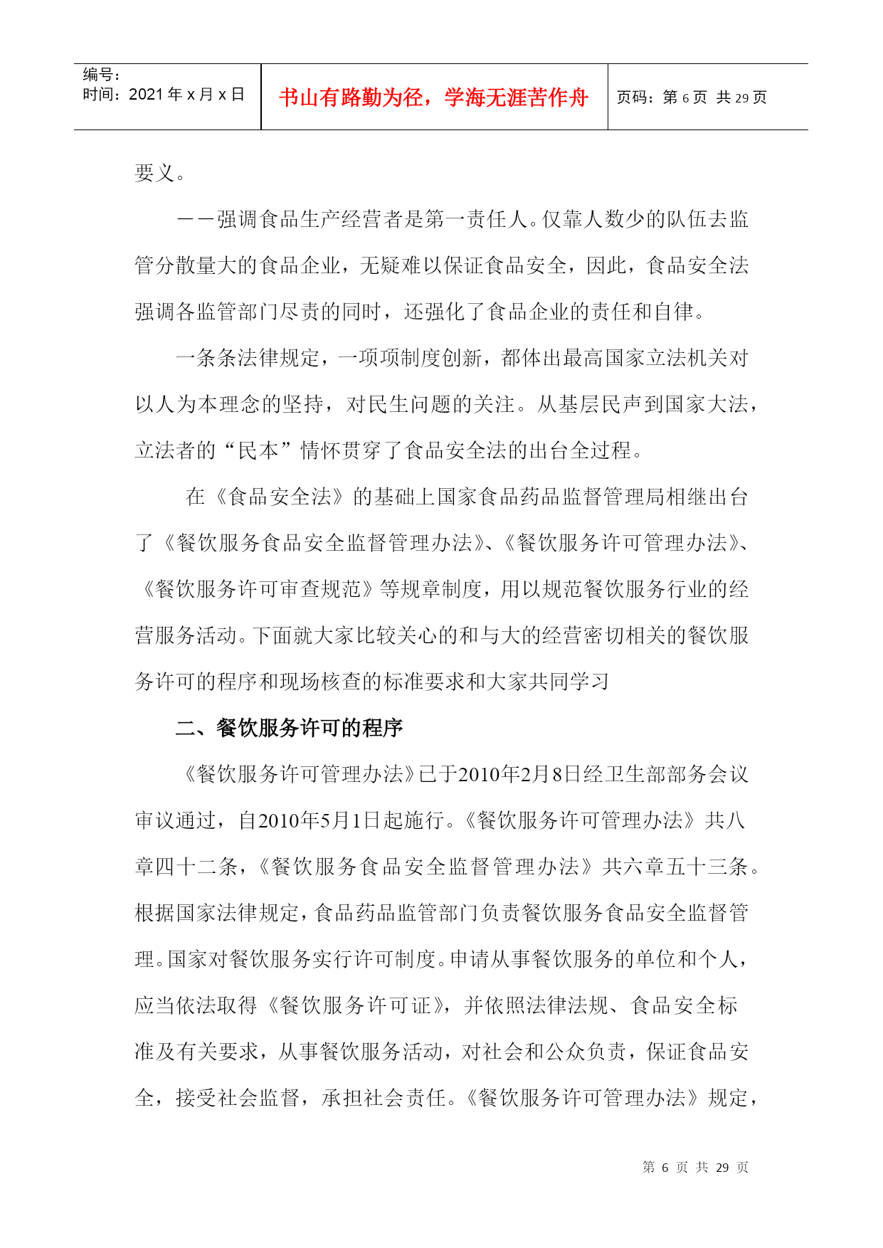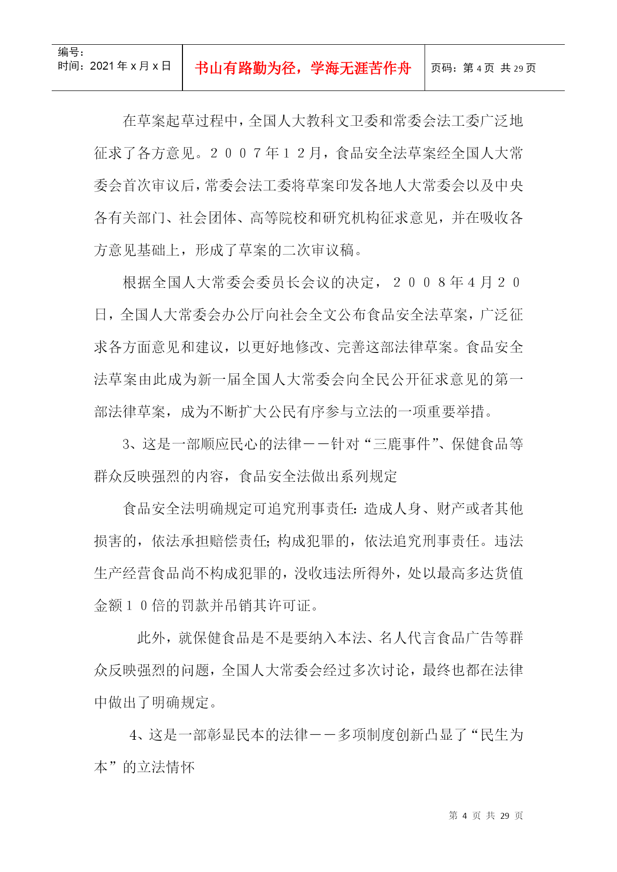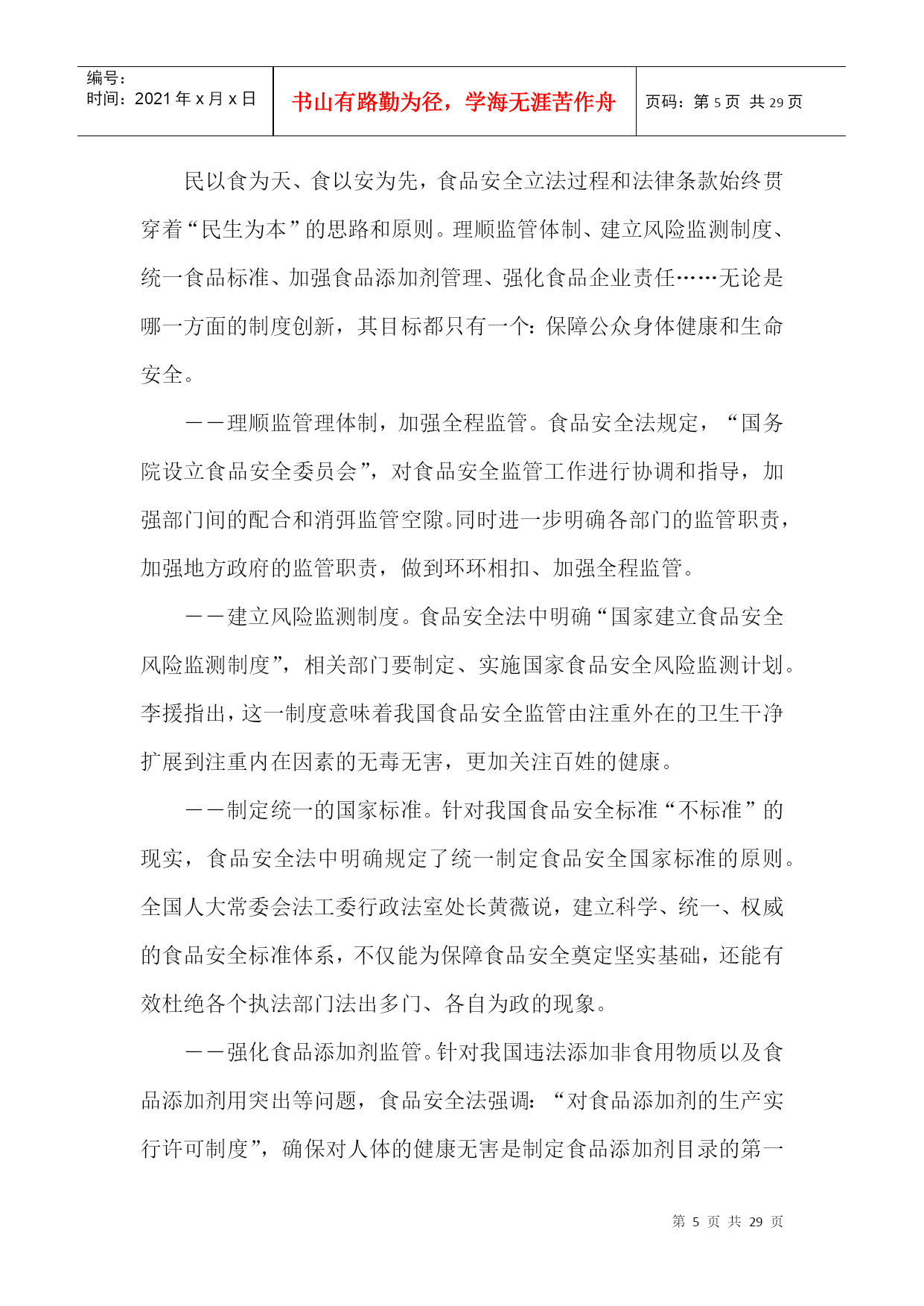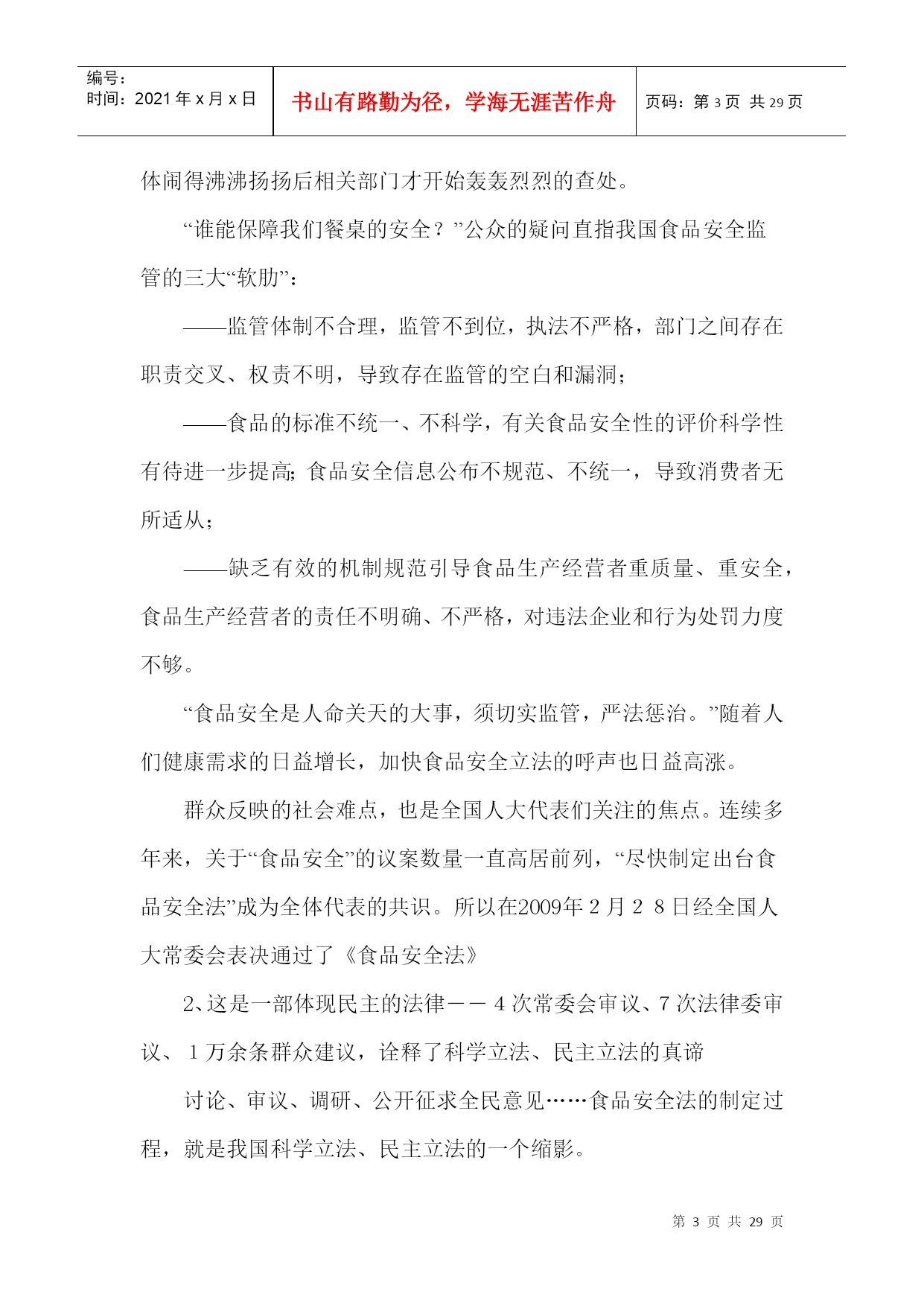 编号:时间:2021年x月x日书山有路勤为径,学海无涯苦作舟页码:第PAGE29页共NUMPAGES29页第PAGE\*MERGEFORMAT29页共NUMPAGES\*MERGEFORMAT29页餐饮服务行业食品安全培训讲义中共中央总书记胡锦涛和国务院总理温家宝,在最近的讲话中,均公开提到一些地方发生的重大生产安全事故和食品安全事故,要求各级党委和政府牢牢记取其中惨痛教训,并强化行政问责制。2010年9月19日,全党深入学习实践科学发展观活动动员大会暨省部级主要领导干部专题研讨班开班式在中央党校举行。中共中央总书记胡锦涛发表重要讲话,其中提到,今年以来,一些地方发生重大生产安全事故和食品安全事故,给人民群众生命财产造成重大损失。2010年9月20日上午,中共中央政治局常委、国务院总理温家宝在全党深入学习实践科学发展观活动动员大会暨省部级主要领导干部专题研讨班上作了“关于深入贯彻落实科学发展观若干重大问题”的专题报告。其中也谈到,最近一个时期,一些地方连续发生食品安全事件和生产安全事故,严重损害人民生命健康,造成了极其恶劣的社会影响,教训十分深刻。2011年4月18日在公开发表的讲话中,温家宝总理痛斥近年来祸害百姓的毒奶粉、瘦肉精、地沟油、染色馒头,指出“这些恶性的食品安全事件足以表明,诚信的缺失、道德的滑坡已经到了何等严重的地步”,强调要注重对社会转型期道德文化建设的研究,启人深思。“吃肉怕激素、吃菜怕毒素、喝HYPERLINK"http://www.21food.cn/trade/search--p1.html"饮料怕HYPERLINK"http://www.21food.cn/trade/search-?-p1.html"色素……”恶性食品安全事件不止一起,为什么迄今为止不见有收敛迹象,反而却一而再再而三地发生?对于我们在座的餐饮单位的负责同志来说,是一个值得大家深思的问题,这就需要在座的各位和我们监管部门通力合作,在保利益的基础上不丧失道德,为我们旬邑县经济发展做自己应尽的力量,为了是我县广大人民群众吃得放心,食品安全,我们食品药品监督管理局在全县范围内,分乡镇就食品安全法关于餐饮业食品安全问题集中时间,召集各位餐饮业食品安全质量负责人员进行专门的食品安全知识培训,根据培训安排,围绕食品安全法的规定和大家共同学习,下面要说的主要有以下四个方面内容食品安全法的立法概况大家都知道,过去在餐饮行业执行的法律叫做《食品卫生法》,2009年2月28日经全国人大常委会表决,以158票赞成、3票反对、4票弃权获得高票通过的《食品安全法》,已于2009年6月1日开始施行,食品卫生法将同时废止。从“卫生”到“安全”,食品安全立法不仅是法律名称的变化,更是监管理念的提升,是适应社会新形势、顺应群众新要求的切实之举。食品安全法的制定,为我国进一步加强食品安全监管奠定了坚实的法律制度基础。《食品安全法》与《食品卫生法》相比有以下几个比较鲜明的特点:1、这是一部回应民声的法律――倾听社会民众呼声,采纳代表的建议,最高国家立法机关加快立法进程“红心咸鸭蛋”“致病的福寿螺”“三鹿婴幼儿奶粉事件”……近年来,几乎每年都会发生影响较大的食品安全事件,几乎每次事件都是在媒体闹得沸沸扬扬后相关部门才开始轰轰烈烈的查处。“谁能保障我们餐桌的安全?”公众的疑问直指我国食品安全监管的三大“软肋”:——监管体制不合理,监管不到位,执法不严格,部门之间存在职责交叉、权责不明,导致存在监管的空白和漏洞;——食品的标准不统一、不科学,有关食品安全性的评价科学性有待进一步提高;食品安全信息公布不规范、不统一,导致消费者无所适从;——缺乏有效的机制规范引导食品生产经营者重质量、重安全,食品生产经营者的责任不明确、不严格,对违法企业和行为处罚力度不够。“食品安全是人命关天的大事,须切实监管,严法惩治。”随着人们健康需求的日益增长,加快食品安全立法的呼声也日益高涨。群众反映的社会难点,也是全国人大代表们关注的焦点。连续多年来,关于“食品安全”的议案数量一直高居前列,“尽快制定出台食品安全法”成为全体代表的共识。所以在2009年2月28日经全国人大常委会表决通过了《食品安全法》2、这是一部体现民主的法律――4次常委会审议、7次法律委审议、1万余条群众建议,诠释了科学立法、民主立法的真谛讨论、审议、调研、公开征求全民意见……食品安全法的制定过程,就是我国科学立法、民主立法的一个缩影。在草案起草过程中,全国人大教科文卫委和常委会法工委广泛地征求了各方意见。2007年12月,食品安全法草案经全国人大常委会首次审议后,常委会法工委将草案印发各地人大常委会以及中央各有关部门、社会团体、高等院校和研究机构征求意见