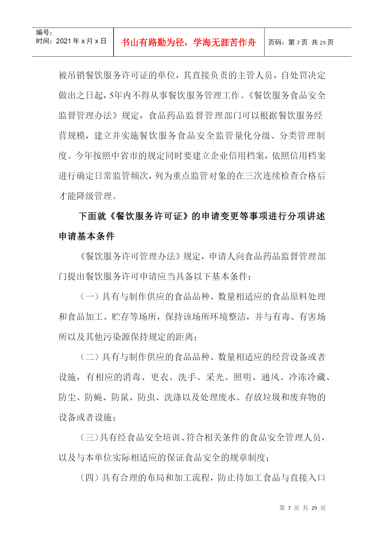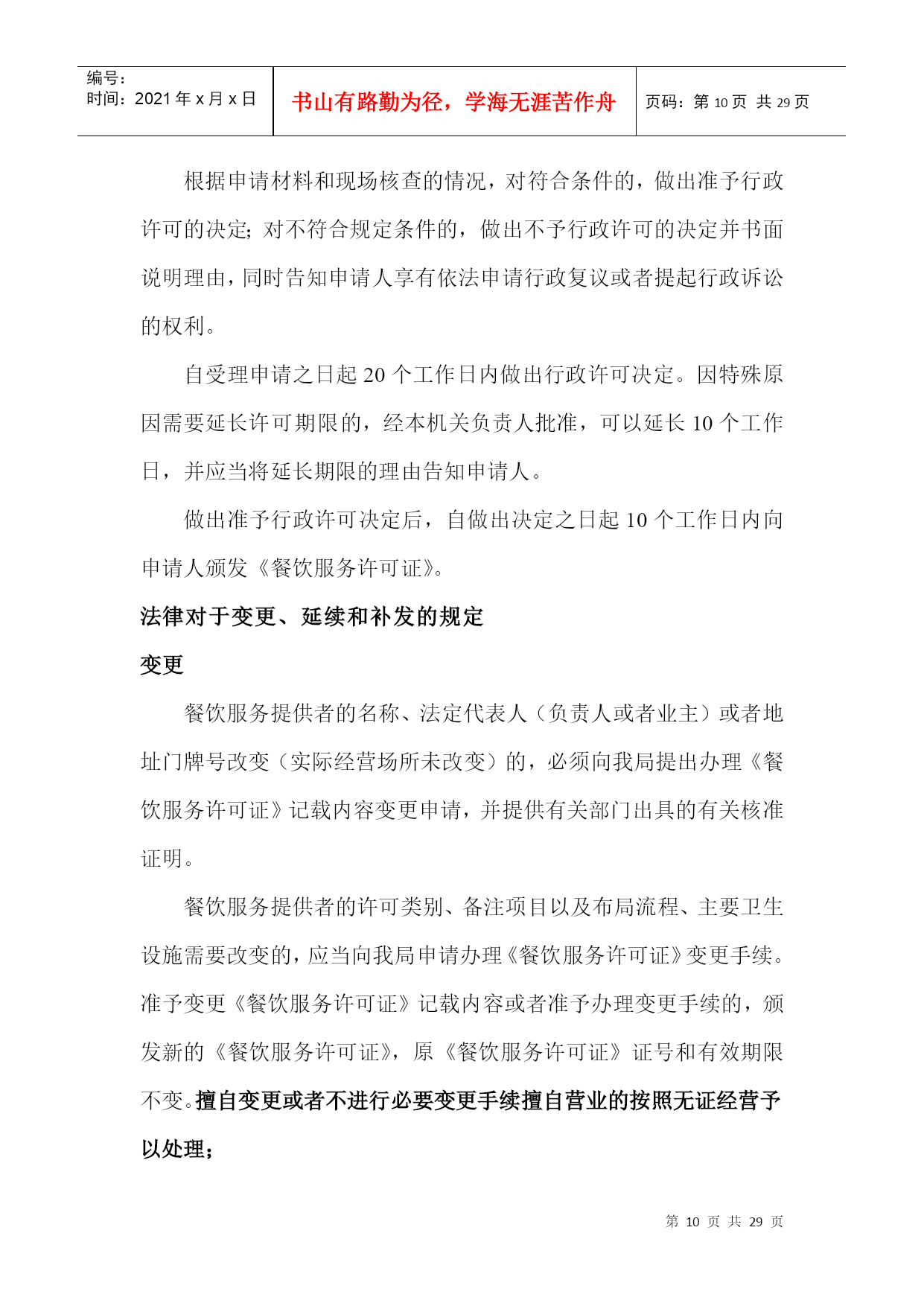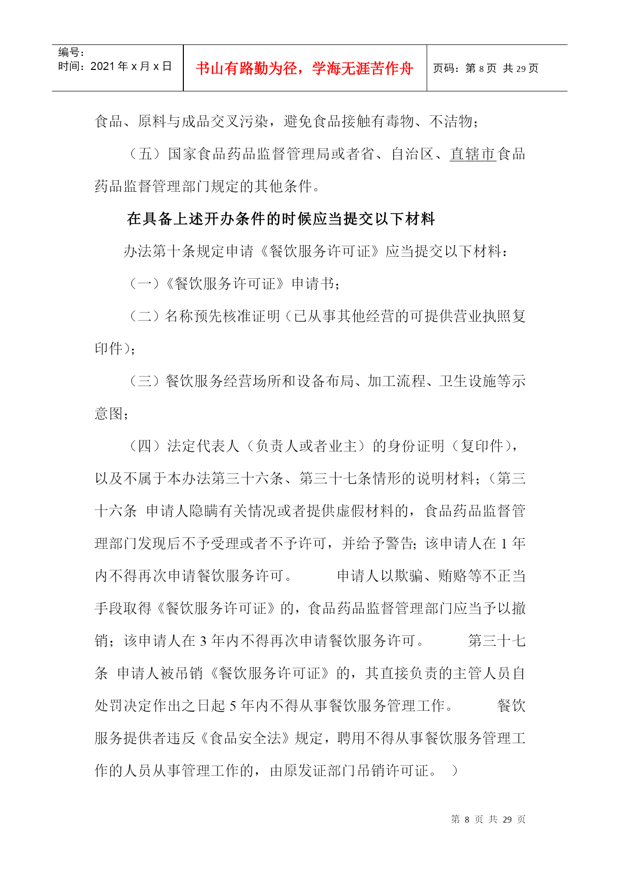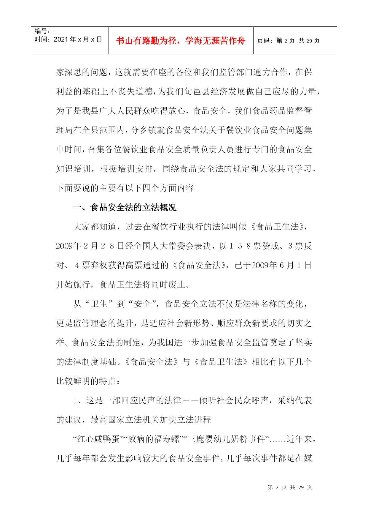 编号:时间:2021年x月x日书山有路勤为径,学海无涯苦作舟页码:第PAGE29页共NUMPAGES29页第PAGE\*MERGEFORMAT29页共NUMPAGES\*MERGEFORMAT29页餐饮服务行业食品安全培训讲义中共中央总书记胡锦涛和国务院总理温家宝,在最近的讲话中,均公开提到一些地方发生的重大生产安全事故和食品安全事故,要求各级党委和政府牢牢记取其中惨痛教训,并强化行政问责制。2010年9月19日,全党深入学习实践科学发展观活动动员大会暨省部级主要领导干部专题研讨班开班式在中央党校举行。中共中央总书记胡锦涛发表重要讲话,其中提到,今年以来,一些地方发生重大生产安全事故和食品安全事故,给人民群众生命财产造成重大损失。2010年9月20日上午,中共中央政治局常委、国务院总理温家宝在全党深入学习实践科学发展观活动动员大会暨省部级主要领导干部专题研讨班上作了“关于深入贯彻落实科学发展观若干重大问题”的专题报告。其中也谈到,最近一个时期,一些地方连续发生食品安全事件和生产安全事故,严重损害人民生命健康,造成了极其恶劣的社会影响,教训十分深刻。2011年4月18日在公开发表的讲话中,温家宝总理痛斥近年来祸害百姓的毒奶粉、瘦肉精、地沟油、染色馒头,指出“这些恶性的食品安全事件足以表明,诚信的缺失、道德的滑坡已经到了何等严重的地步”,强调要注重对社会转型期道德文化建设的研究,启人深思。“吃肉怕激素、吃菜怕毒素、喝HYPERLINK"http://www.21food.cn/trade/search--p1.html"饮料怕HYPERLINK"http://www.21food.cn/trade/search-?-p1.html"色素……”恶性食品安全事件不止一起,为什么迄今为止不见有收敛迹象,反而却一而再再而三地发生?对于我们在座的餐饮单位的负责同志来说,是一个值得大家深思的问题,这就需要在座的各位和我们监管部门通力合作,在保利益的基础上不丧失道德,为我们旬邑县经济发展做自己应尽的力量,为了是我县广大人民群众吃得放心,食品安全,我们食品药品监督管理局在全县范围内,分乡镇就食品安全法关于餐饮业食品安全问题集中时间,召集各位餐饮业食品安全质量负责人员进行专门的食品安全知识培训,根据培训安排,围绕食品安全法的规定和大家共同学习,下面要说的主要有以下四个方面内容食品安全法的立法概况大家都知道,过去在餐饮行业执行的法律叫做《食品卫生法》,2009年2月28日经全国人大常委会表决,以158票赞成、3票反对、4票弃权获得高票通过的《食品安全法》,已于2009年6月1日开始施行,食品卫生法将同时废止。从“卫生”到“安全”,食品安全立法不仅是法律名称的变化,更是监管理念的提升,是适应社会新形势、顺应群众新要求的切实之举。食品安全法的制定,为我国进一步加强食品安全监管奠定了坚实的法律制度基础。《食品安全法》与《食品卫生法》相比有以下几个比较鲜明的特点:1、这是一部回应民声的法律――倾听社会民众呼声,采纳代表的建议,最高国家立法机关加快立法进程“红心咸鸭蛋”“致病的福寿螺”“三鹿婴幼儿奶粉事件”……近年来,几乎每年都会发生影响较大的食品安全事件,几乎每次事件都是在媒体闹得沸沸扬扬后相关部门才开始轰轰烈烈的查处。“谁能保障我们餐桌的安全?”公众的疑问直指我国食品安全监管的三大“软肋”:——监管体制不合理,监管不到位,执法不严格,部门之间存在职责交叉、权责不明,导致存在监管的空白和漏洞;——食品的标准不统一、不科学,有关食品安全性的评价科学性有待进一步提高;食品安全信息公布不规范、不统一,导致消费者无所适从;——缺乏有效的机制规范引导食品生产经营者重质量、重安全,食品生产经营者的责任不明确、不严格,对违法企业和行为处罚力度不够。“食品安全是人命关天的大事,须切实监管,严法惩治。”随着人们健康需求的日益增长,加快食品安全立法的呼声也日益高涨。群众反映的社会难点,也是全国人大代表们关注的焦点。连续多年来,关于“食品安全”的议案数量一直高居前列,“尽快制定出台食品安全法”成为全体代表的共识。所以在2009年2月28日经全国人大常委会表决通过了《食品安全法》2、这是一部体现民主的法律――4次常委会审议、7次法律委审议、1万余条群众建议,诠释了科学立法、民主立法的真谛讨论、审议、调研、公开征求全民意见……食品安全法的制定过程,就是我国科学立法、民主立法的一个缩影。在草案起草过程中,全国人大教科文卫委和常委会法工委广泛地征求了各方意见。2007年12月,食品安全法草案经全国人大常委会首次审议后,常委会法工委将草案印发各地人大常委会以及中央各有关部门、社会团体、高等院校和研究机构征求意见