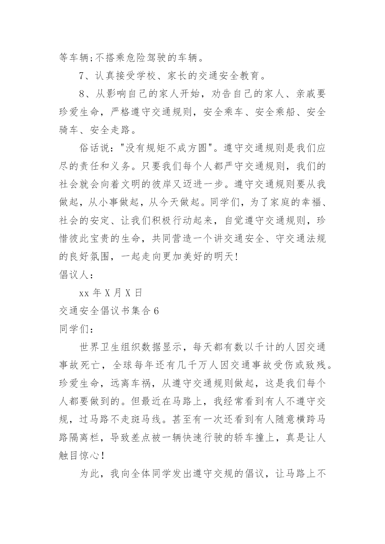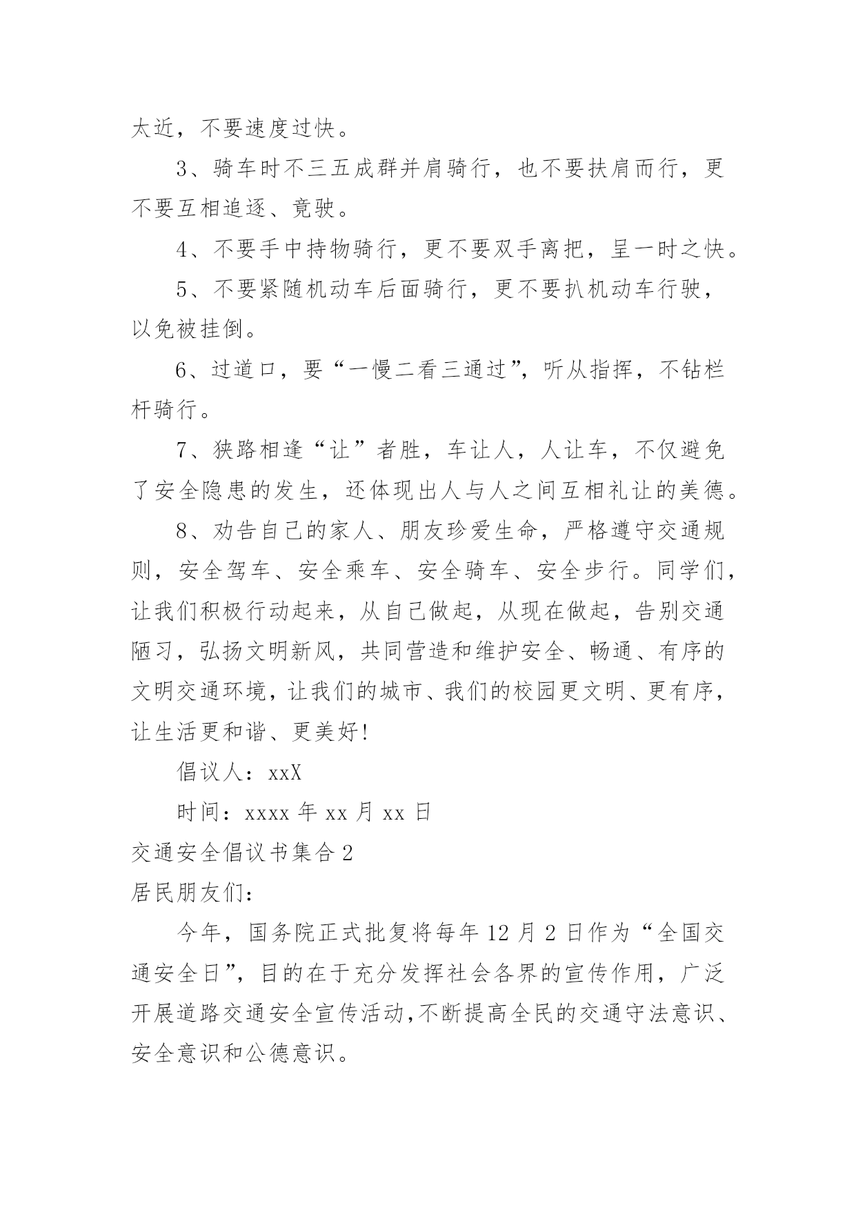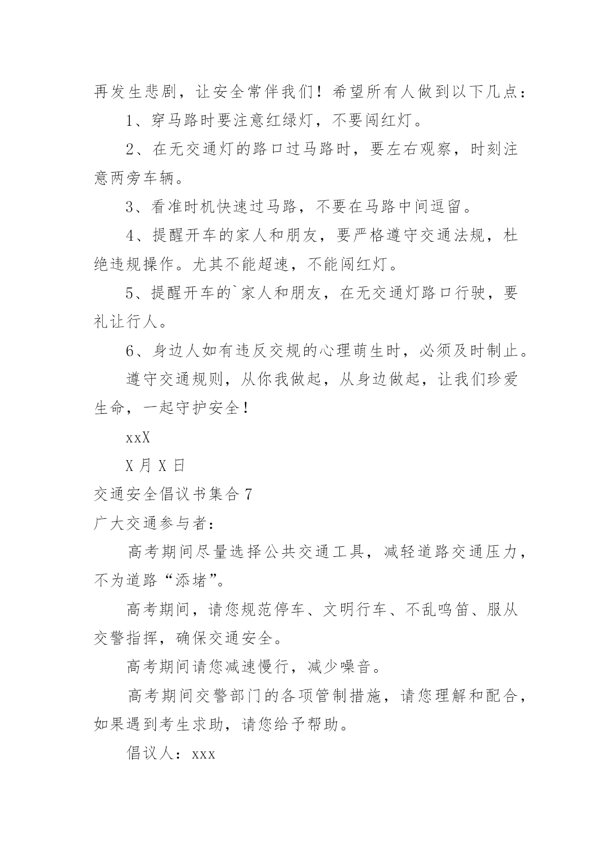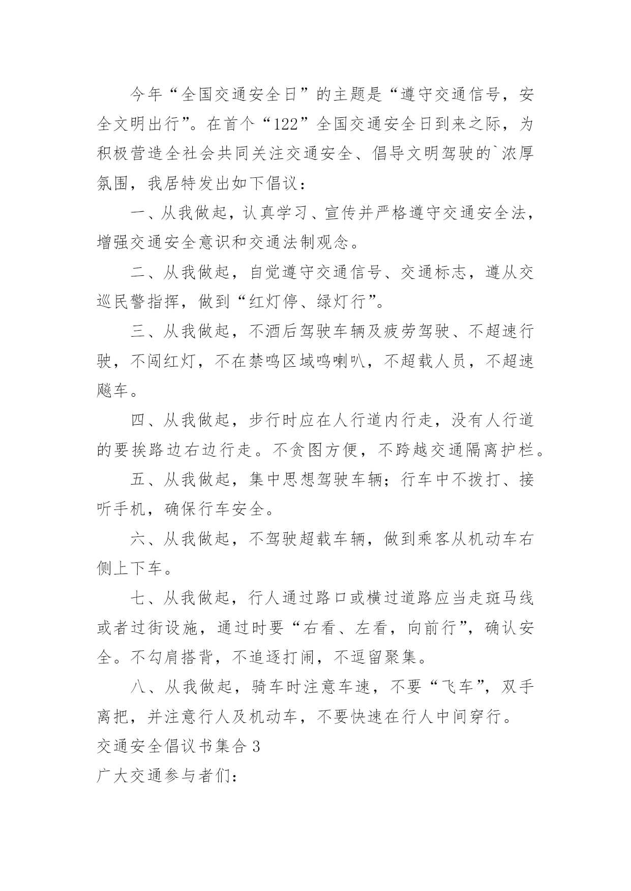 交通安全倡议书交通安全倡议书集合在快速变化和不断变革的新时代,我们使用上倡议书的情况与日俱增,倡议书是日常应用写作中的一种常用文体。来参考自己需要的倡议书吧!以下是小编为大家整理的交通安全倡议书集合,欢迎阅读,希望大家能够喜欢。交通安全倡议书集合1亲爱的同学们:大家好!衣食住行,是我们每一个人的生活基本需求,而其中的行意味着我们每天的生活都离不开交通。拥有一个文明和谐的道路交通环境是大家共同的愿望。但在我们身边,还有一些不文明的交通行为,它不仅影响了正常的交通秩序,还对我们的生命造成了威胁。营造一个良好的道路交通环境,需要全社会包括我们全体同学的共同努力。为积极响应上级号召,进一步巩固我校交通安全教育的成果,不断增强大家的交通文明意识,营造文明、和谐的交通环境,特向同学们提出以下倡议:一、行走安全:1、在公路上行走要走人行道,没有人行道的要靠路边行走。2、通过道路交叉口或横穿公路时,要走人行横道,通过路口时,要左右观察,确定安全时再通过。3、行路时,要注意各种信号灯的指示和车辆转向灯的变化,不抢红灯。4、不攀爬或跨越交通隔离栏。5、不在道路、桥梁、隧道或交通安全设施等地方逗留。6、集体外出时,要有组织有秩序的`列队行走,结伴外出时不要相互追逐、打闹,行走要专一,不要东张西望、边走边看书、看报或做其他事情。7、校园内行走应遵循靠右原则,有人行道的路段应在人行道内行走。不得在道路上嬉戏、踢球或进行其他有碍交通秩序的活动。上下楼梯精力要集中,一律靠楼梯的右边行走,前后要保持一定的距离,避免多人并排,跑跳,追逐打闹和前推后拥;发现拥挤现象不要慌乱,要靠墙或扶楼梯扶手止步;不要将身体探过楼梯扶手,更不要从栏杆上往下滑。8、在楼道走廊上行走时,要轻声慢步,不要大声喧哗,不要打闹追逐。不要借助栏杆做健身动作,更不要用身体、四肢冲撞栏杆。不向楼下扔任何东西。9、课间活动时不可在教室内跑、追逐打闹和恶作剧。10、在校园内活动时不得急跑,不得追逐打闹,不得做恶作剧。在人少的地方活动或游戏,且不要危及他人安全。不要做有危险的活动和游戏。二、骑车安全:1、骑自行车转弯时要提前减速慢行向后观望并招手示意,不要突然猛拐。2、不能逞能飞车穿行,超越前方自行车时,不要靠的太近,不要速度过快。3、骑车时不三五成群并肩骑行,也不要扶肩而行,更不要互相追逐、竟驶。4、不要手中持物骑行,更不要双手离把,呈一时之快。5、不要紧随机动车后面骑行,更不要扒机动车行驶,以免被挂倒。6、过道口,要“一慢二看三通过”,听从指挥,不钻栏杆骑行。7、狭路相逢“让”者胜,车让人,人让车,不仅避免了安全隐患的发生,还体现出人与人之间互相礼让的美德。8、劝告自己的家人、朋友珍爱生命,严格遵守交通规则,安全驾车、安全乘车、安全骑车、安全步行。同学们,让我们积极行动起来,从自己做起,从现在做起,告别交通陋习,弘扬文明新风,共同营造和维护安全、畅通、有序的文明交通环境,让我们的城市、我们的校园更文明、更有序,让生活更和谐、更美好!倡议人:xxX时间:xxxx年xx月xx日交通安全倡议书集合2居民朋友们:今年,国务院正式批复将每年12月2日作为“全国交通安全日”,目的在于充分发挥社会各界的宣传作用,广泛开展道路交通安全宣传活动,不断提高全民的交通守法意识、安全意识和公德意识。今年“全国交通安全日”的主题是“遵守交通信号,安全文明出行”。在首个“122”全国交通安全日到来之际,为积极营造全社会共同关注交通安全、倡导文明驾驶的`浓厚氛围,我居特发出如下倡议:一、从我做起,认真学习、宣传并严格遵守交通安全法,增强交通安全意识和交通法制观念。二、从我做起,自觉遵守交通信号、交通标志,遵从交巡民警指挥,做到“红灯停、绿灯行”。三、从我做起,不酒后驾驶车辆及疲劳驾驶、不超速行驶,不闯红灯,不在禁鸣区域鸣喇叭,不超载人员,不超速飚车。四、从我做起,步行时应在人行道内行走,没有人行道的要挨路边右边行走。不贪图方便,不跨越交通隔离护栏。五、从我做起,集中思想驾驶车辆;行车中不拨打、接听手机,确保行车安全。六、从我做起,不驾驶超载车辆,做到乘客从机动车右侧上下车。七、从我做起,行人通过路口或横过道路应当走斑马线或者过街设施,通过时要“右看、左看,向前行”,确认安全。不勾肩搭背,不追逐打闹,不逗留聚集。八、从我做起,骑车时注意车速,不要“飞车”,双手离把,并注意行人及机动车,不要快速在行人中间穿行。交通安全倡议书集合3广大交通参与者们:寒窗苦读十余载金榜题名望今朝,一年一度的高考即将来临。寒窗苦读多年的莘莘学子将迈出人生至关重要的一步,去绘制未来美好的人生蓝图。高考,牵动着无数的家庭、牵动着无数人的心,也改变了众多人的人生轨迹,为考生助一臂之力,已经成为社会共同的愿望。全国统一高考将于6月7、8日举行,册亨县设册